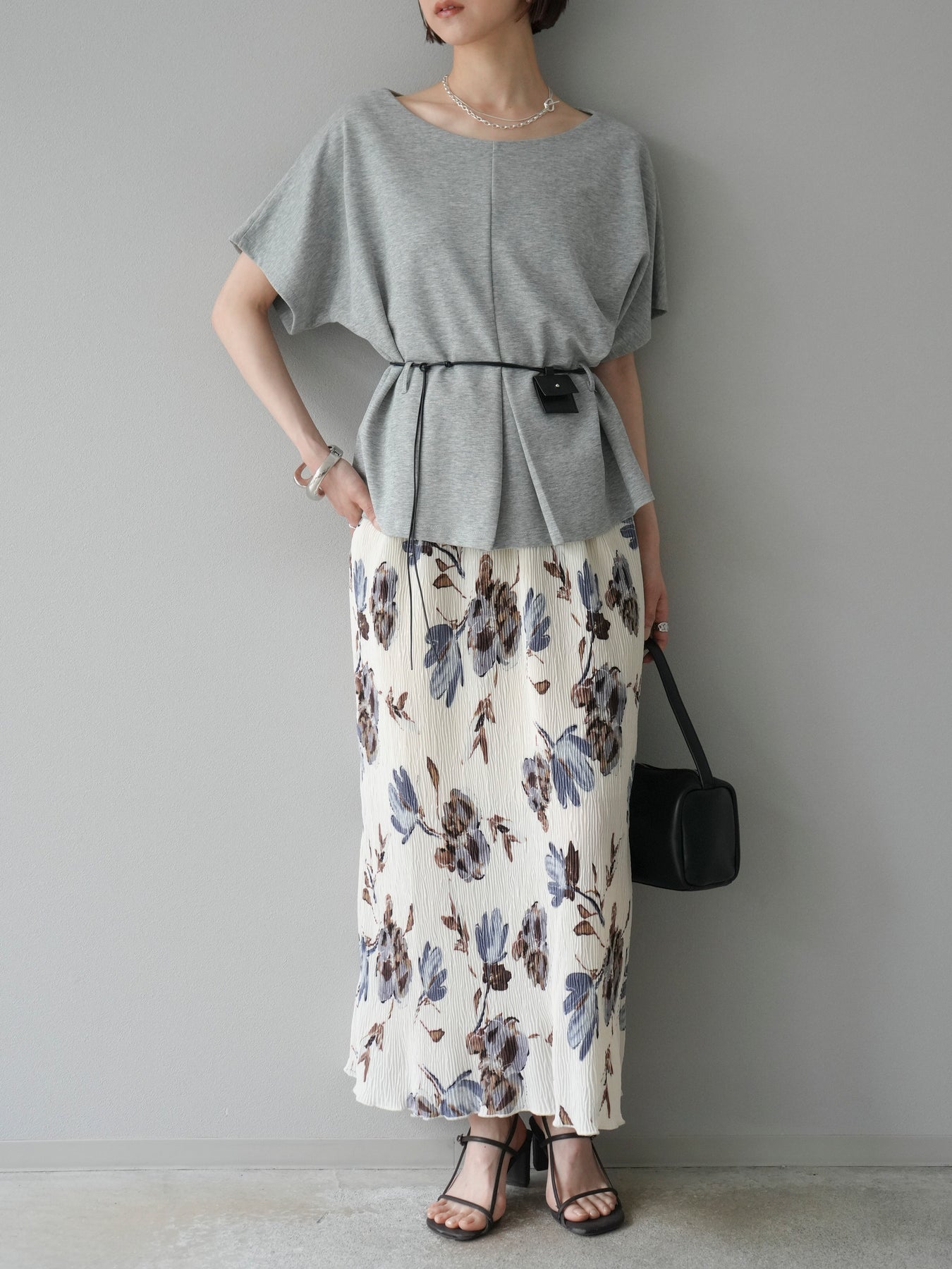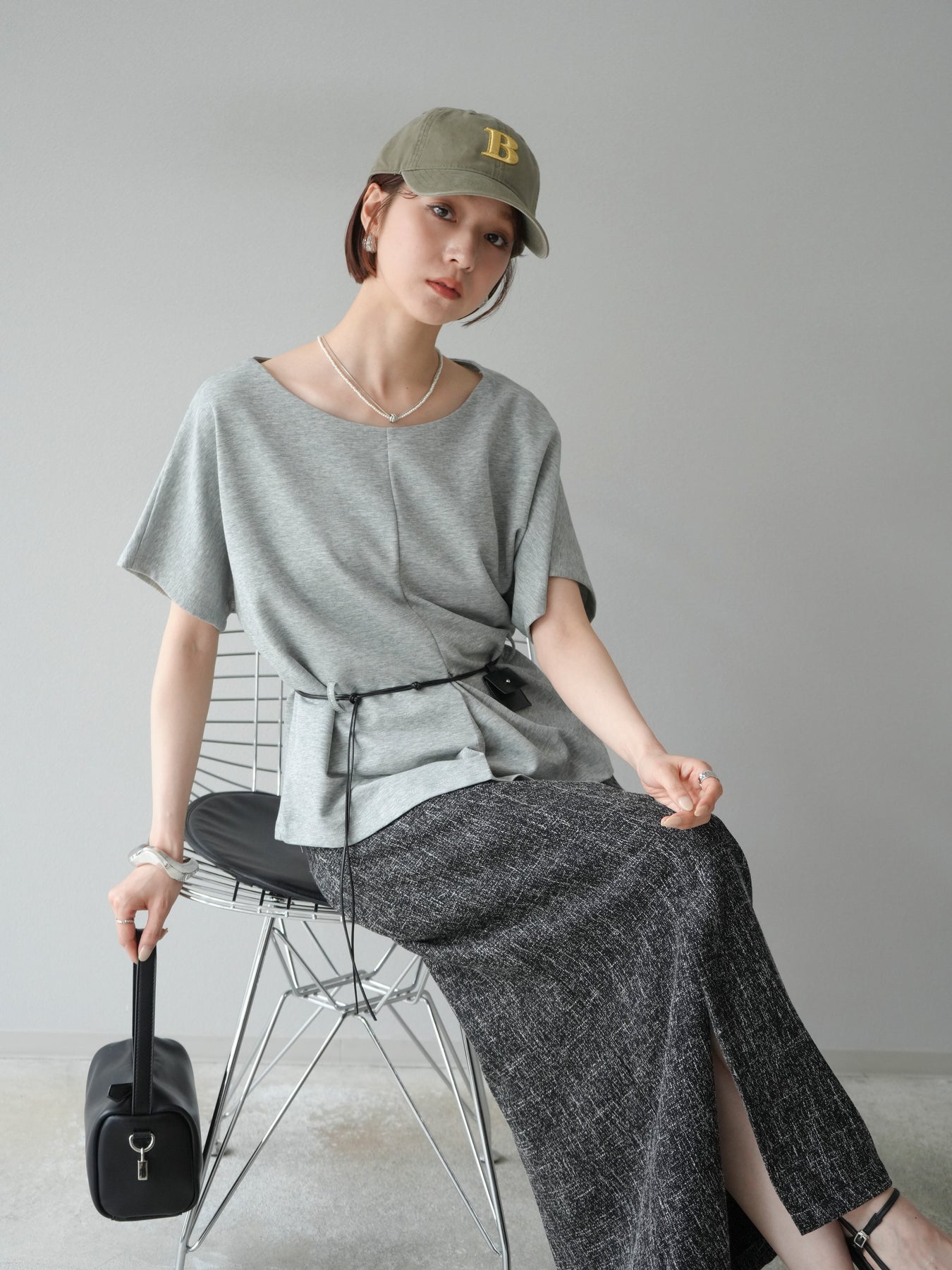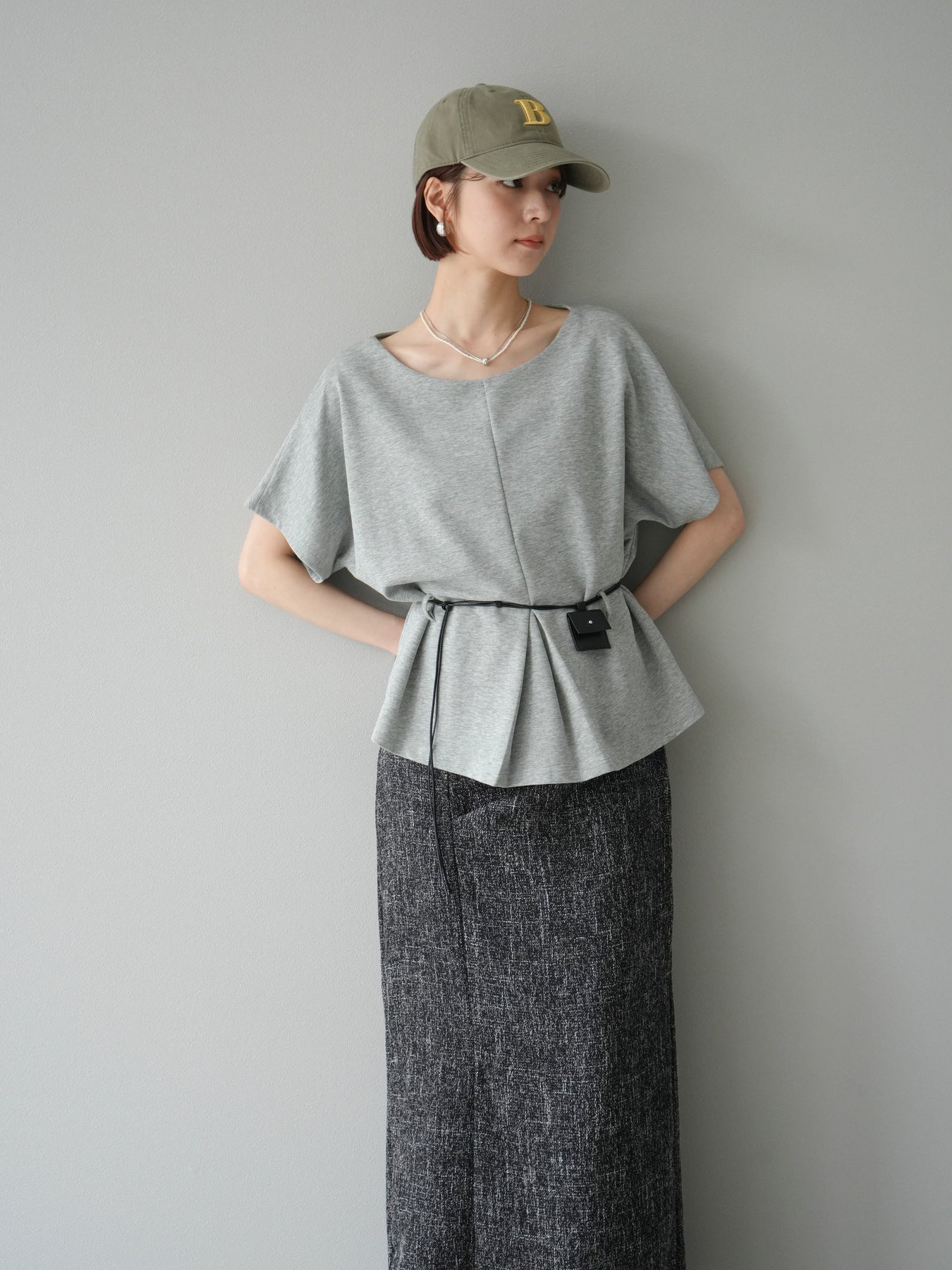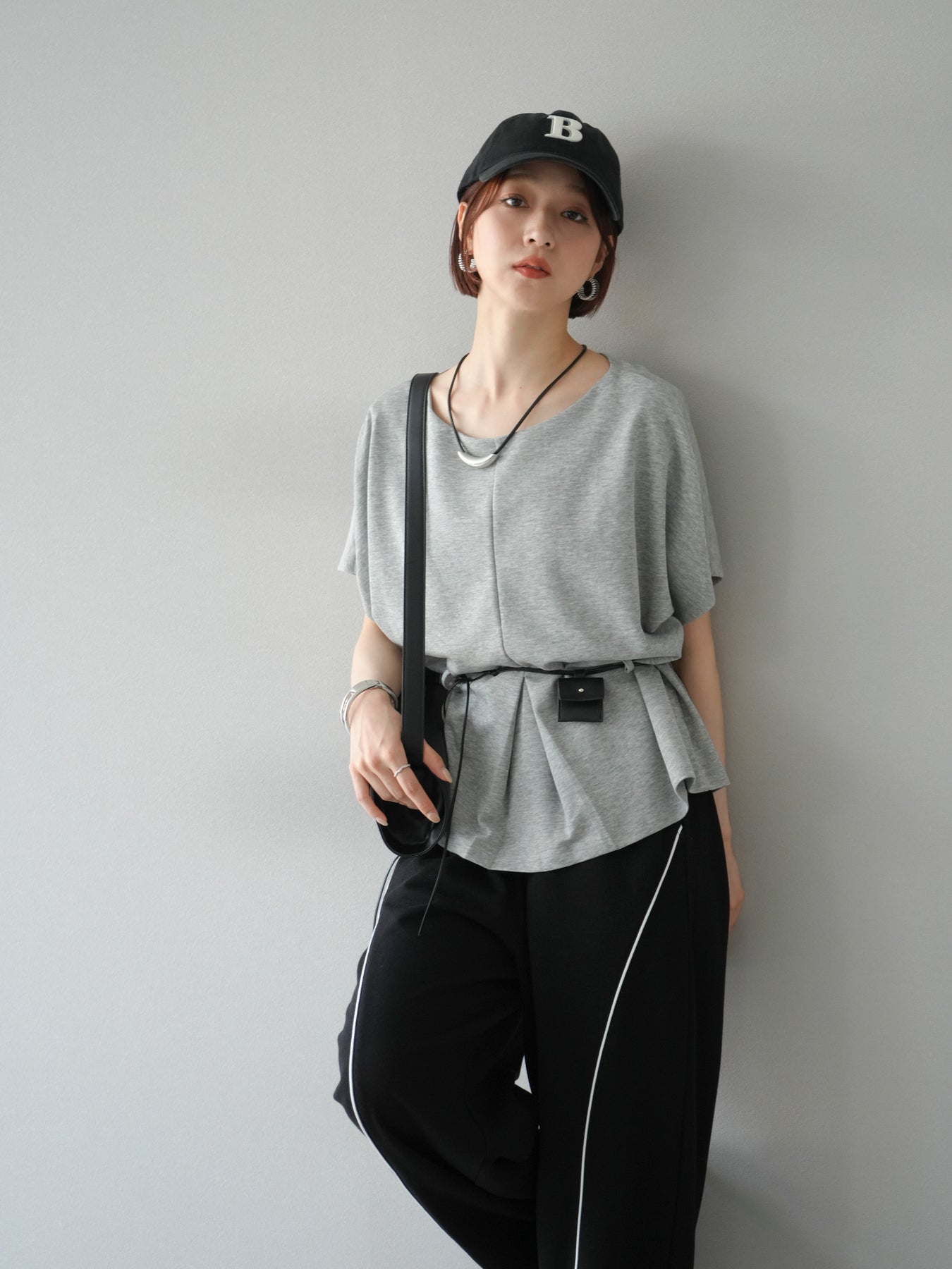 [予約]レザーアクセサリー付フロントスリットTシャツ/グレー