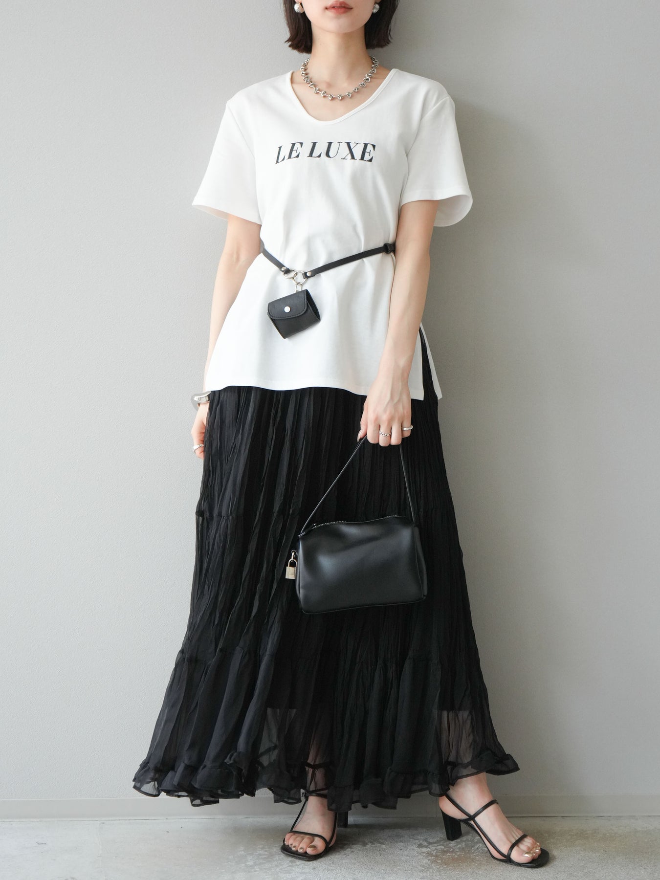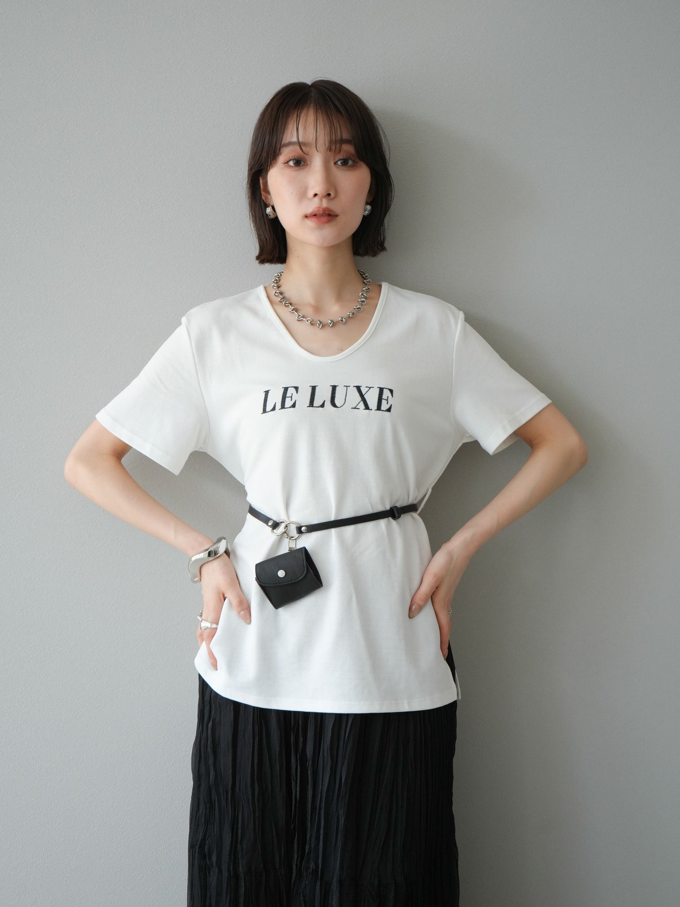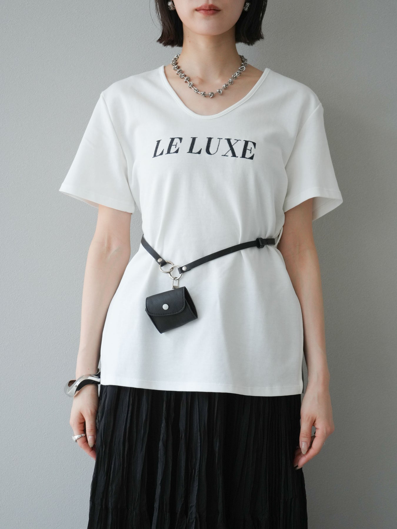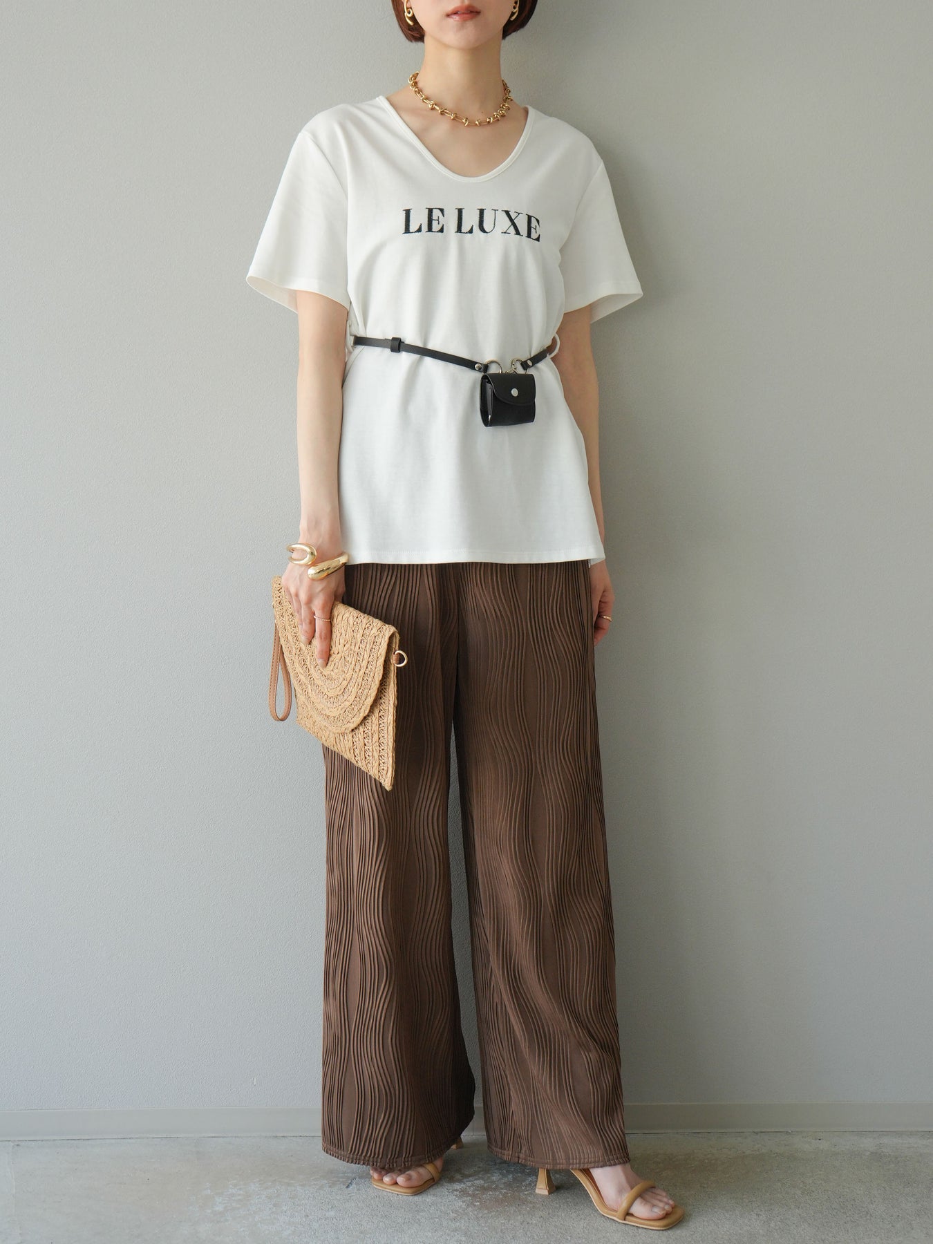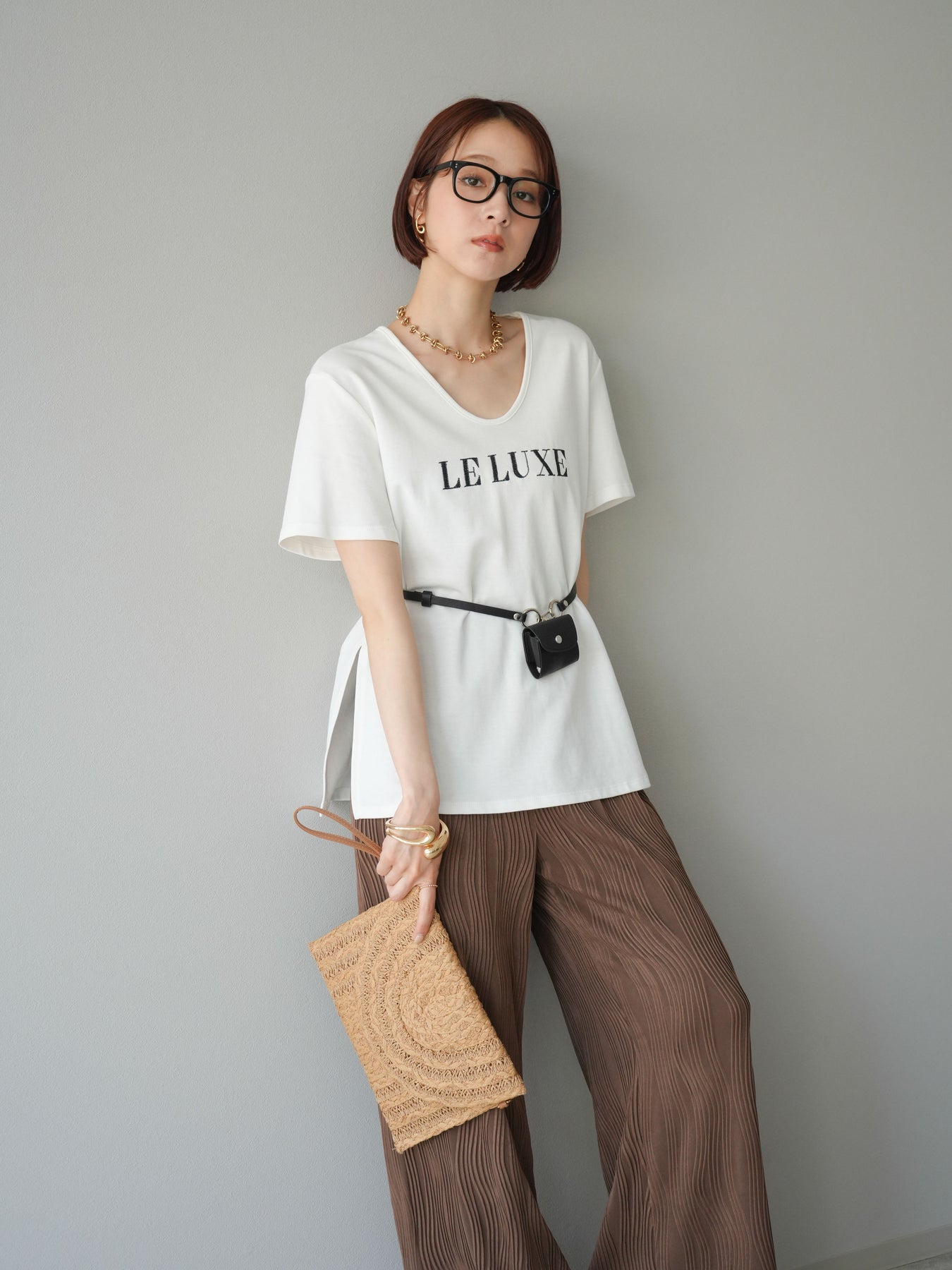 繊細な刺繍ロゴとレザー風アクセサリーがアクセントになった、レザーアクセサリー付Vネック刺繍ロゴTシャツ。デコルテを美しく見せる緩やかなVネックラインと、柔らかく肌触りの良いカットソー素材が大人のカジュアルスタイルにぴったり。付属のミニポーチ付きベルトはウエストマークとしても使え、スタイリングに立体感とメリハリをプラスしてくれます。パンツにもスカートにも合わせやすく、1枚で着映えする万能アイテムです。 ※ボトムス、キャミソール(インナー)以外の商品は一律でインナーは付属していません。