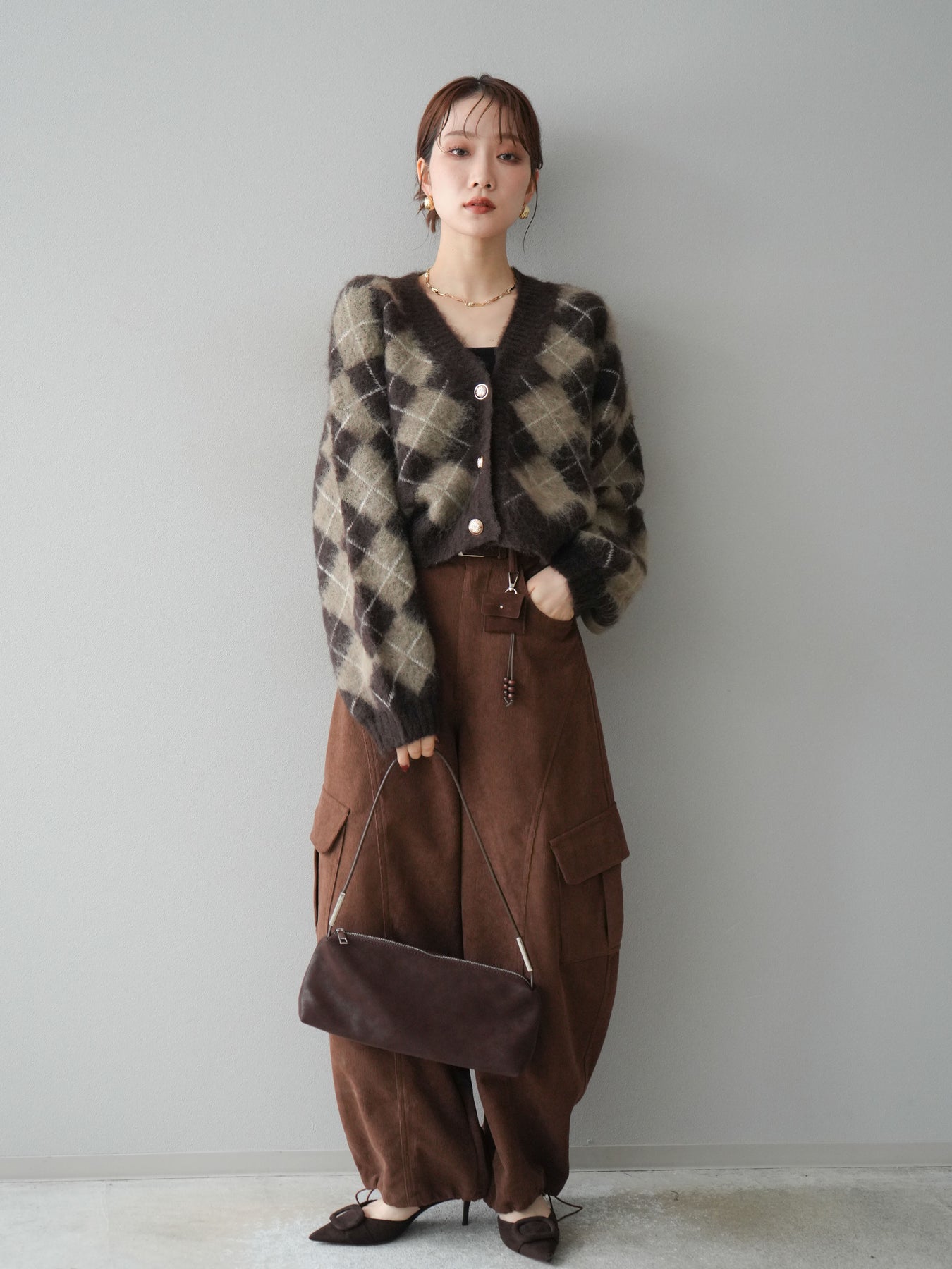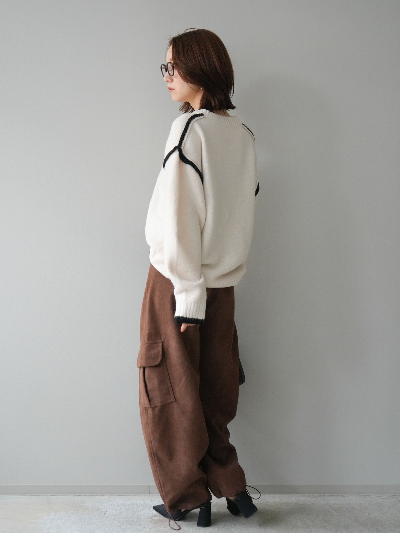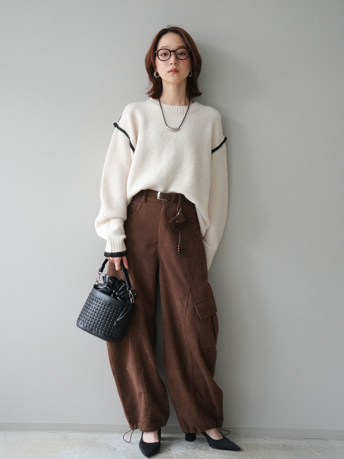 柔らかな風合いのコーデュロイ素材で仕立てたベルト付きカーゴパンツ。 シーズンムードを高める温かみのある質感で、カジュアルながらも上品に着こなせる1本です。 ウエストのベルトとミニポーチがアクセントとなり、スタイリングに遊び心をプラス。 裾にはドローストリングを施し、シルエットのアレンジも楽しめます。 スウェットやニットと合わせて、抜け感のあるリラックススタイルが完成する万能ボトムです。