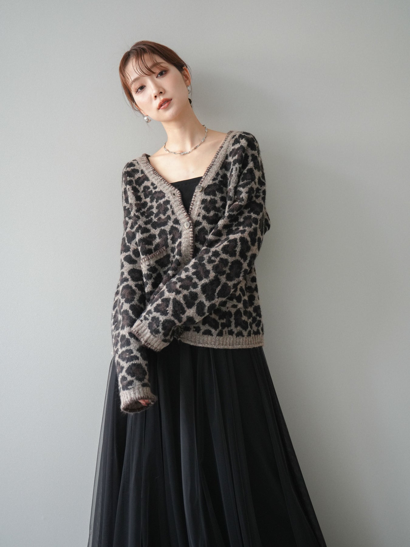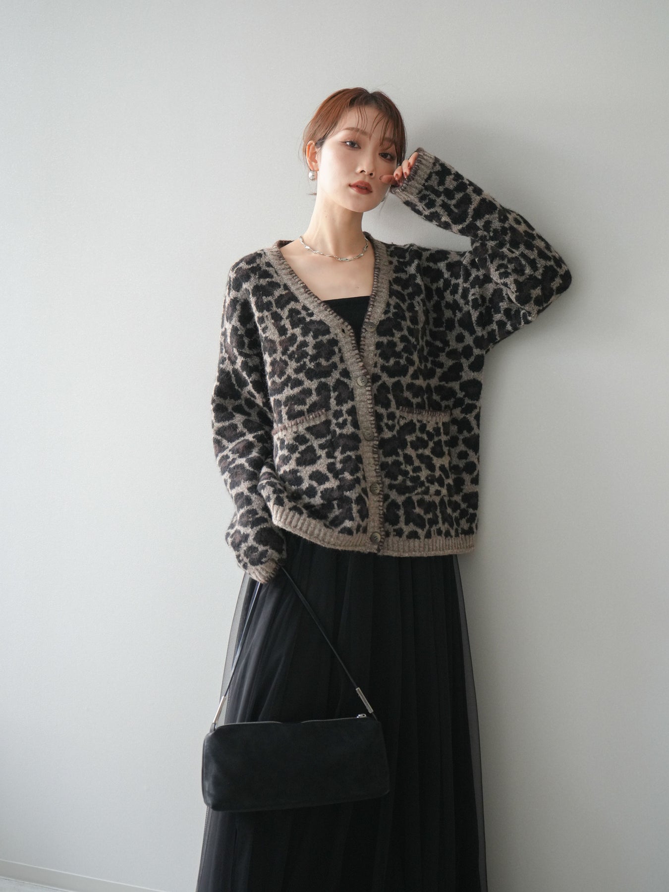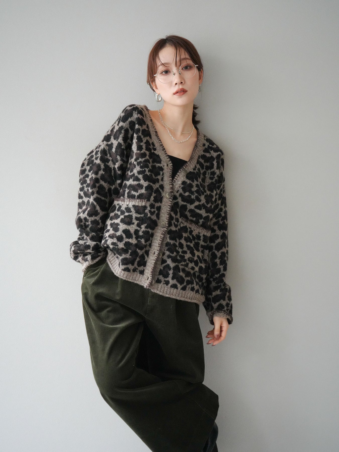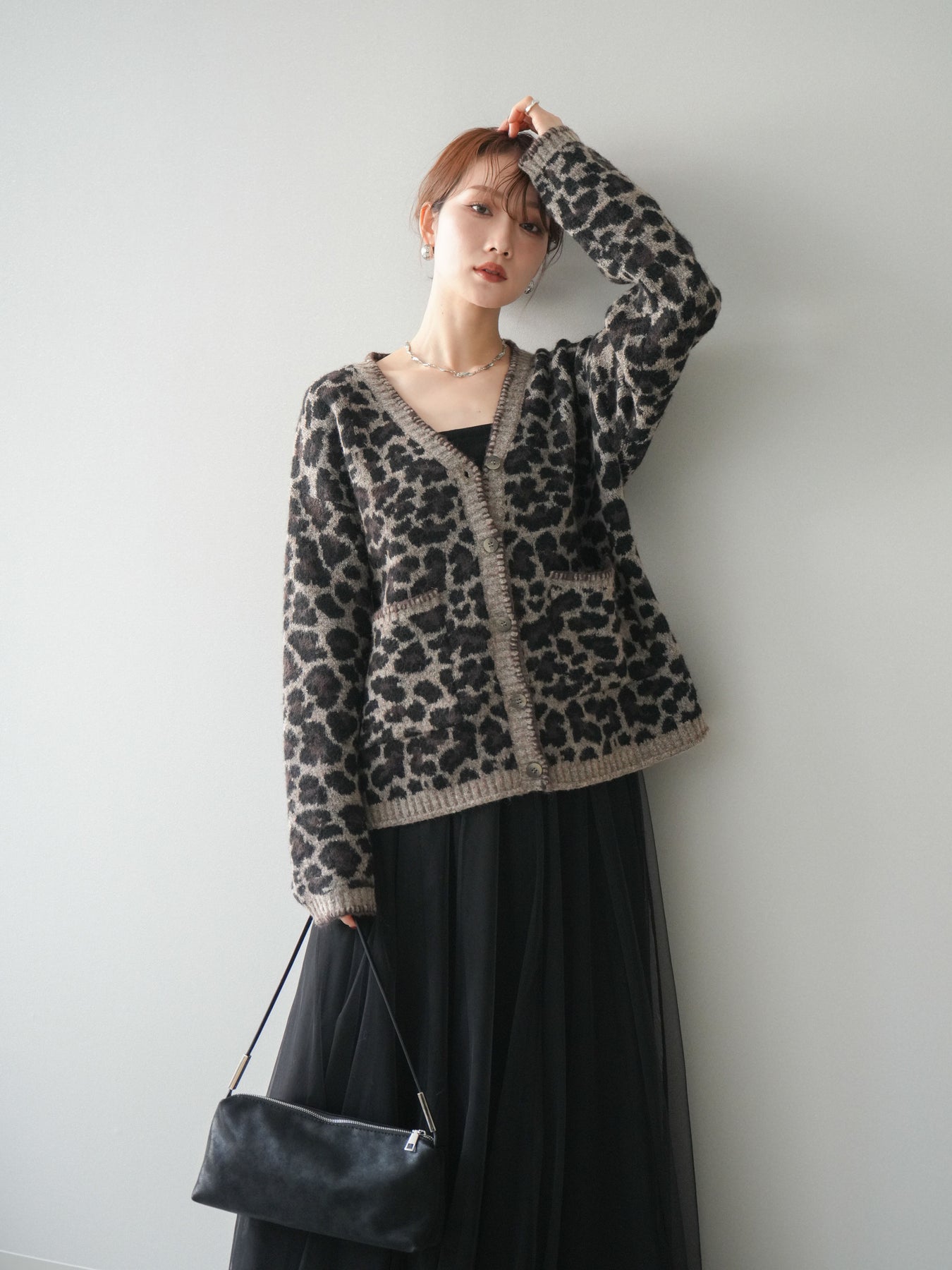 シーズンムード漂うアニマル柄が印象的なニットカーディガン。 ふんわりとした素材感と程よい厚みで、羽織るだけでこなれた印象を与えます。 フロントや袖口のステッチデザインがアクセントとなり、カジュアルさの中にさりげない上品さをプラス。 ゆとりのあるシルエットが抜け感を演出し、デイリーにもお出かけにも活躍します。 シンプルなインナーやボトムに合わせるだけで、トレンド感のあるスタイルが完成する一枚です。 ※ボトムス、キャミソール(インナー)以外の商品は一律でインナーは付属していません。