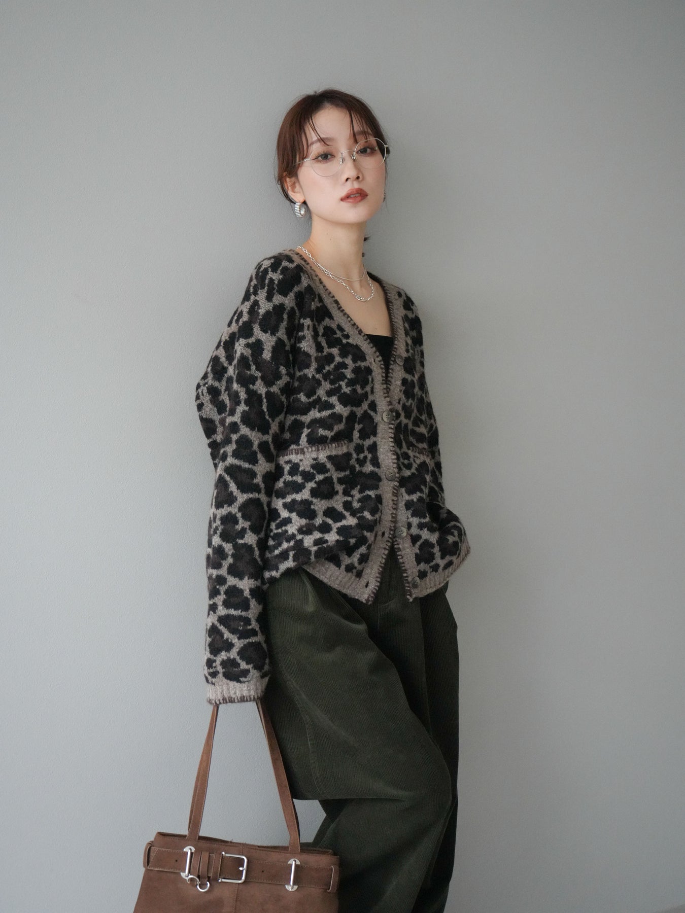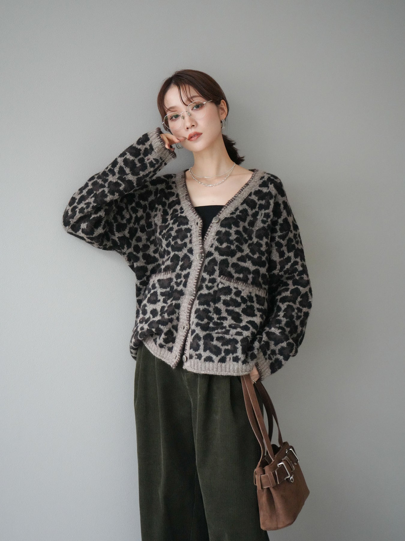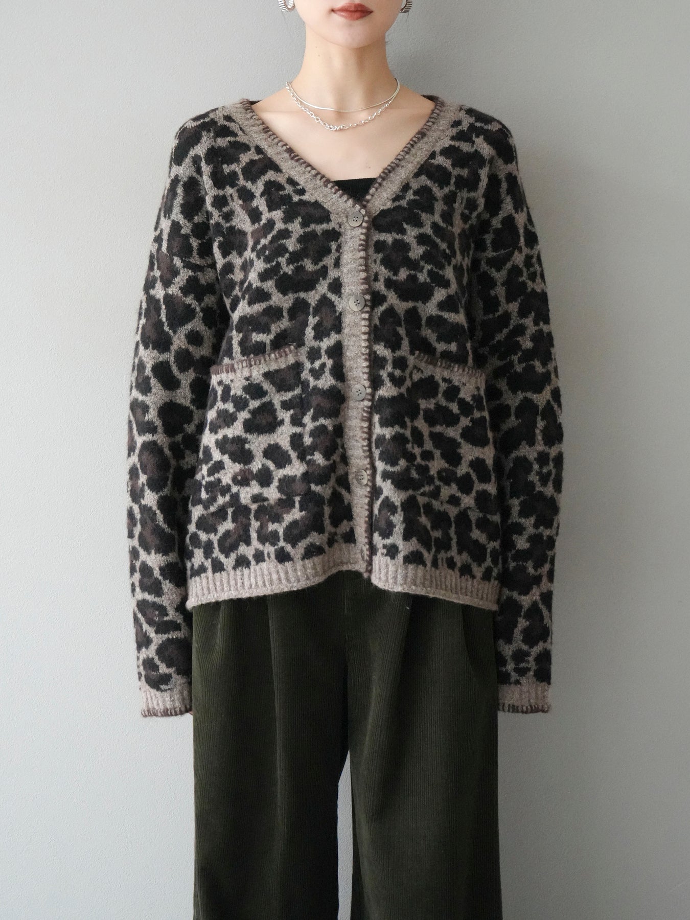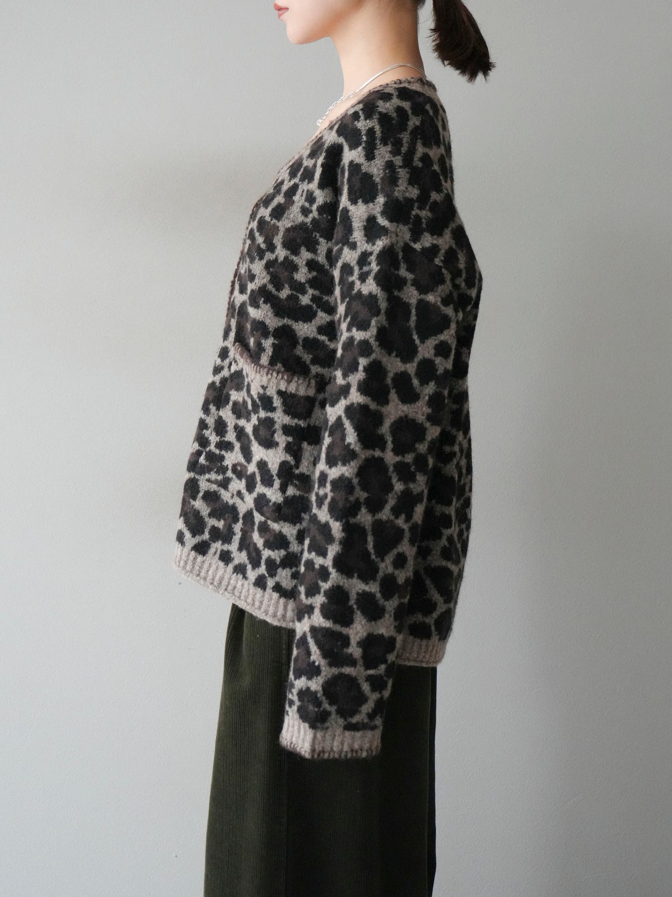[予約]アニマル柄ステッチニットカーディガン/brown