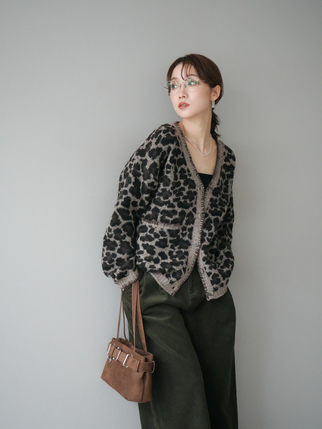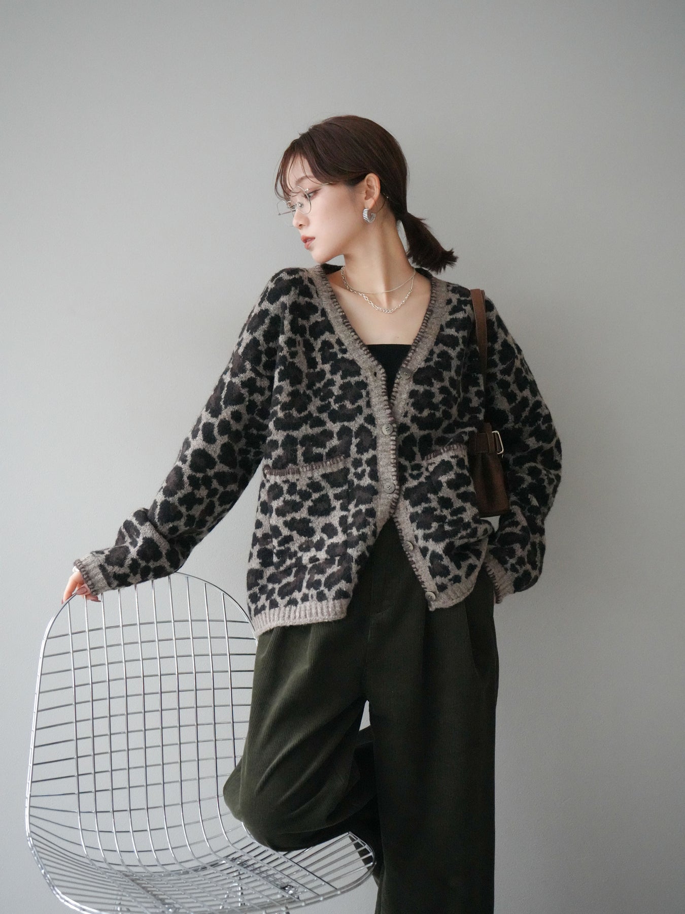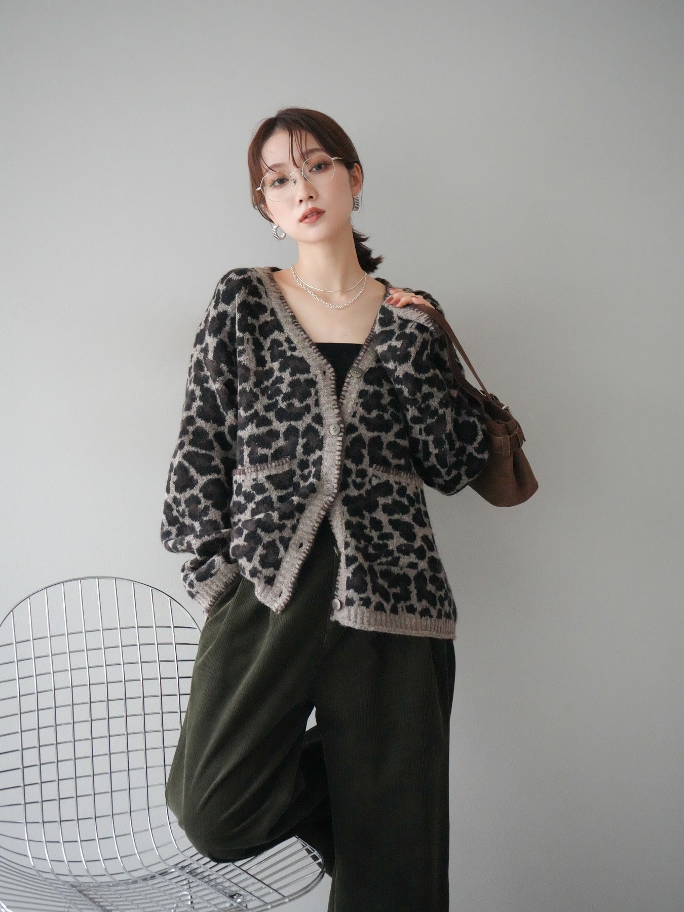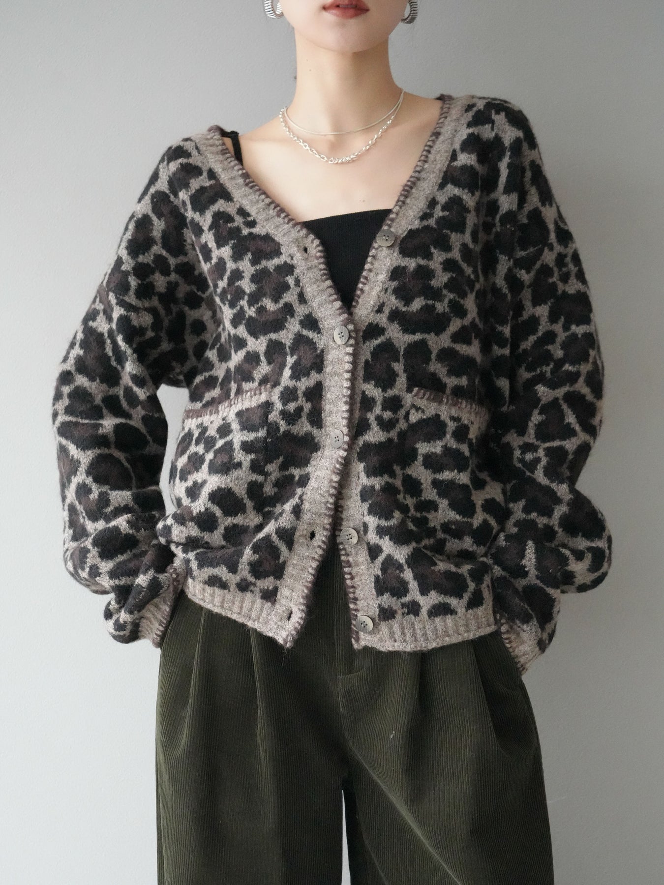 [予約]アニマル柄ステッチニットカーディガン/brown