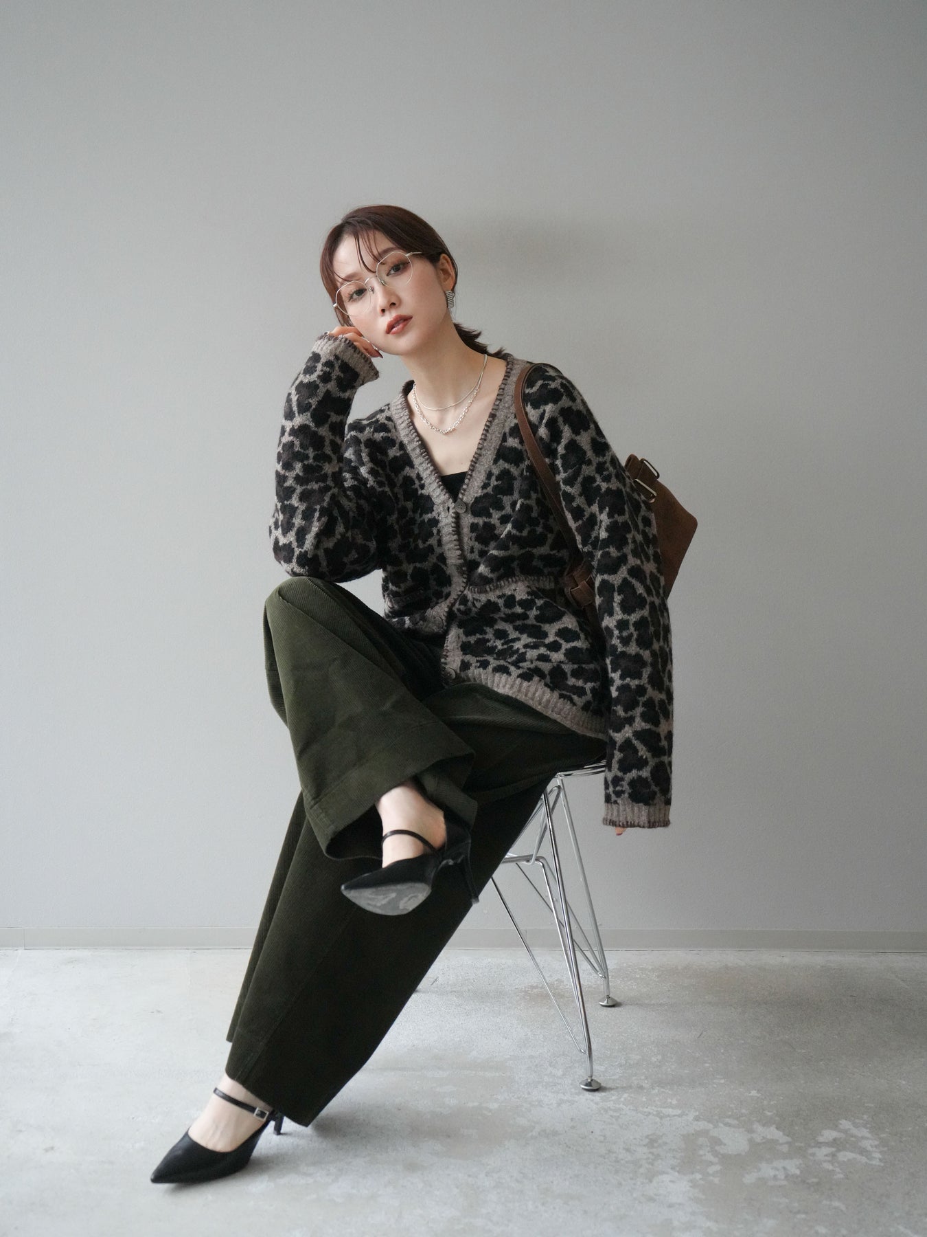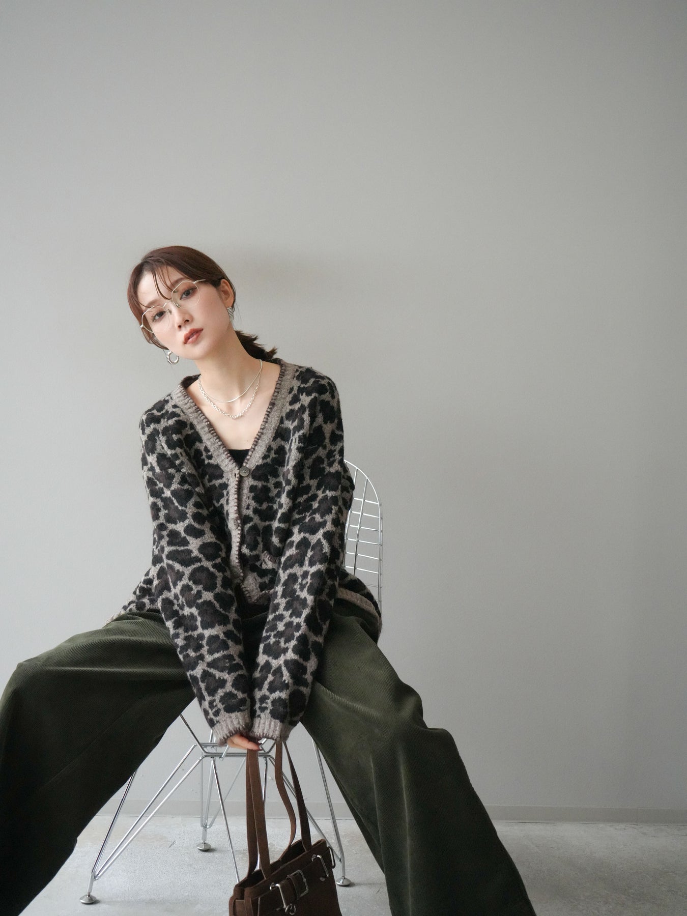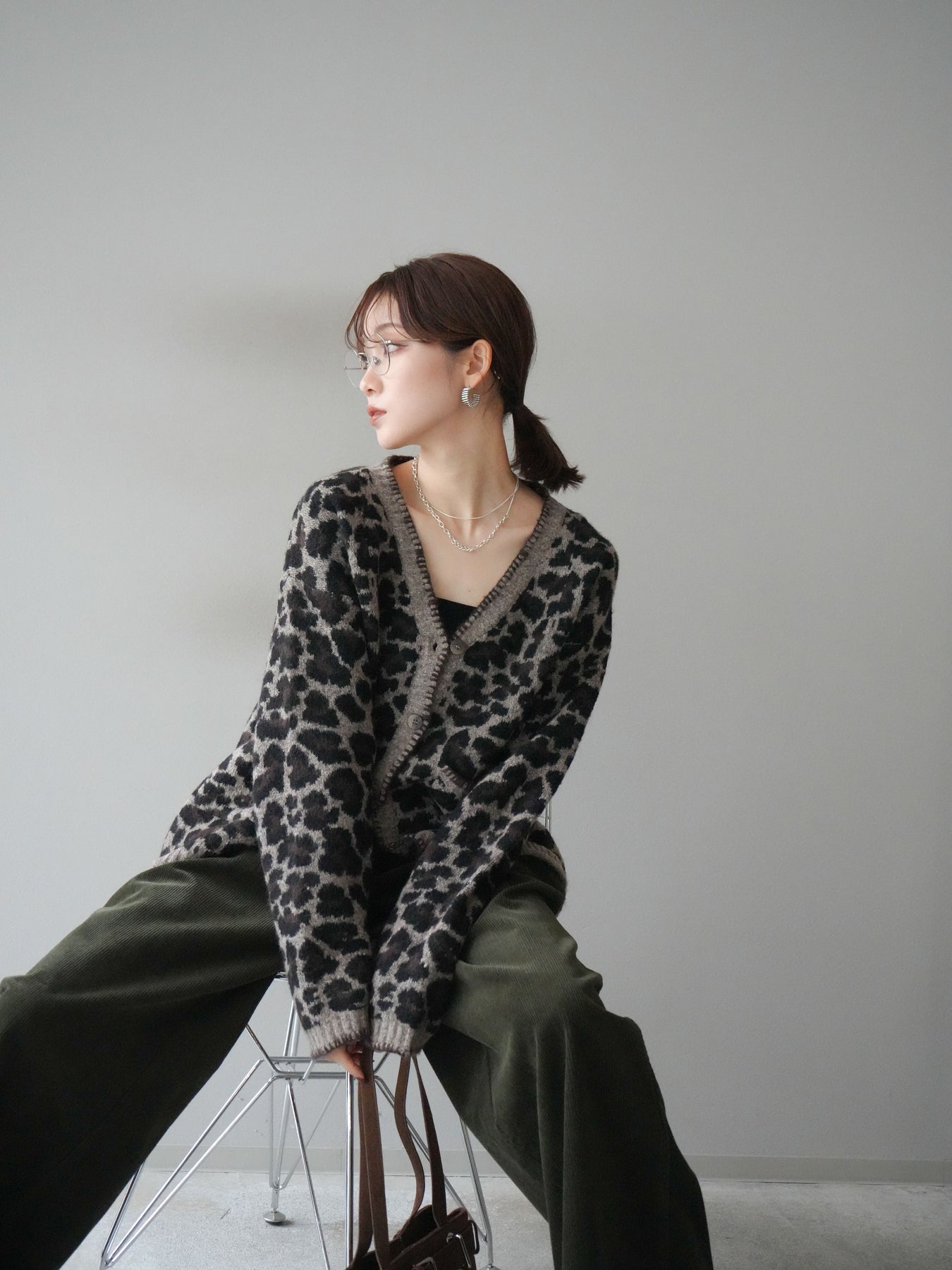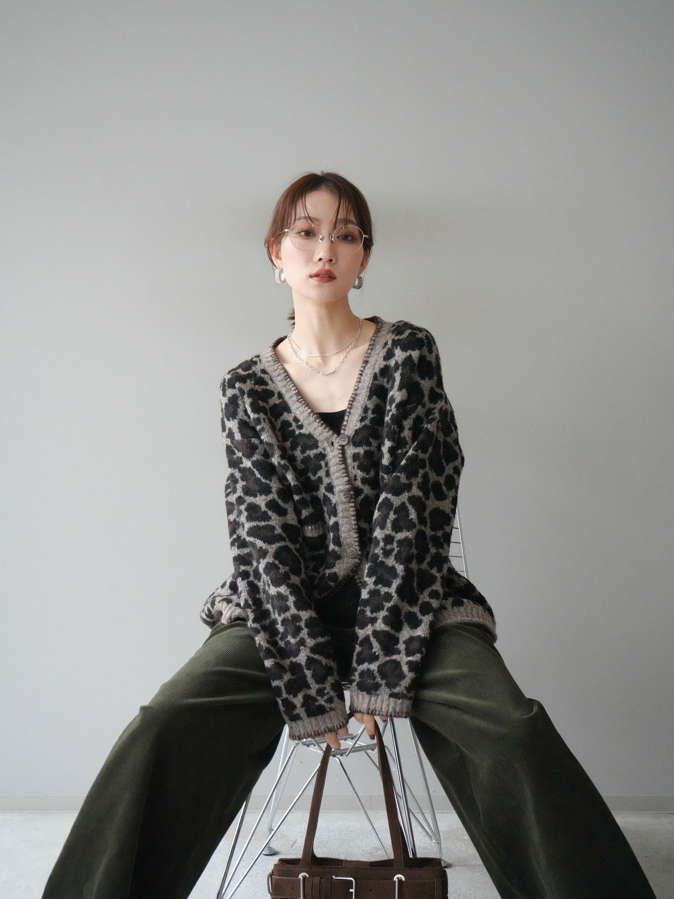 [予約]アニマル柄ステッチニットカーディガン/brown