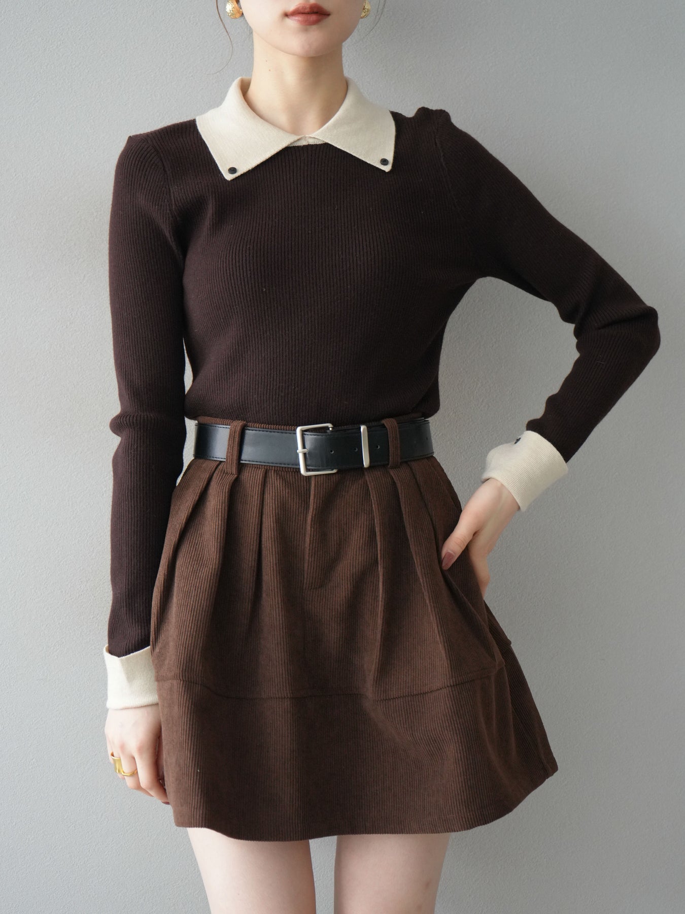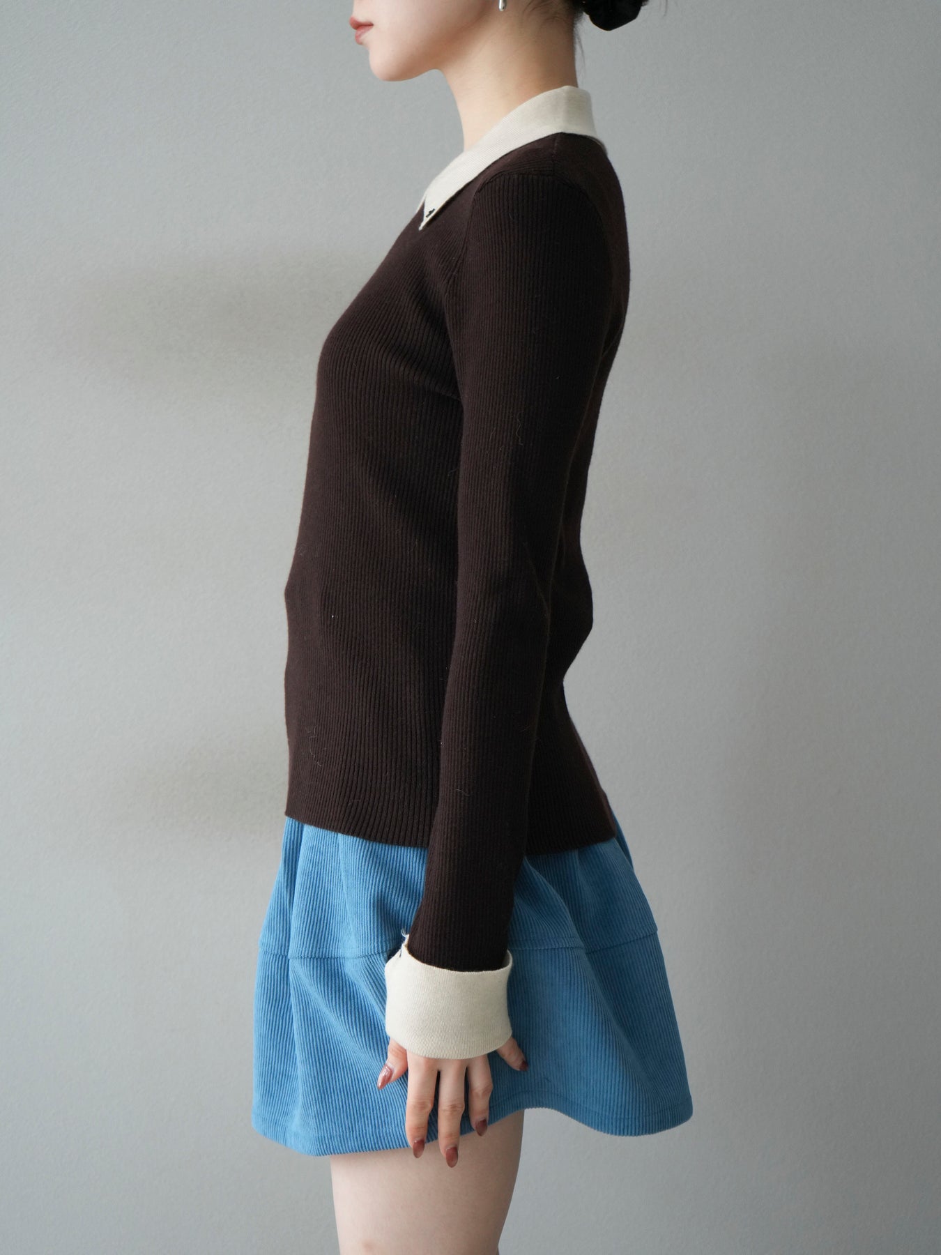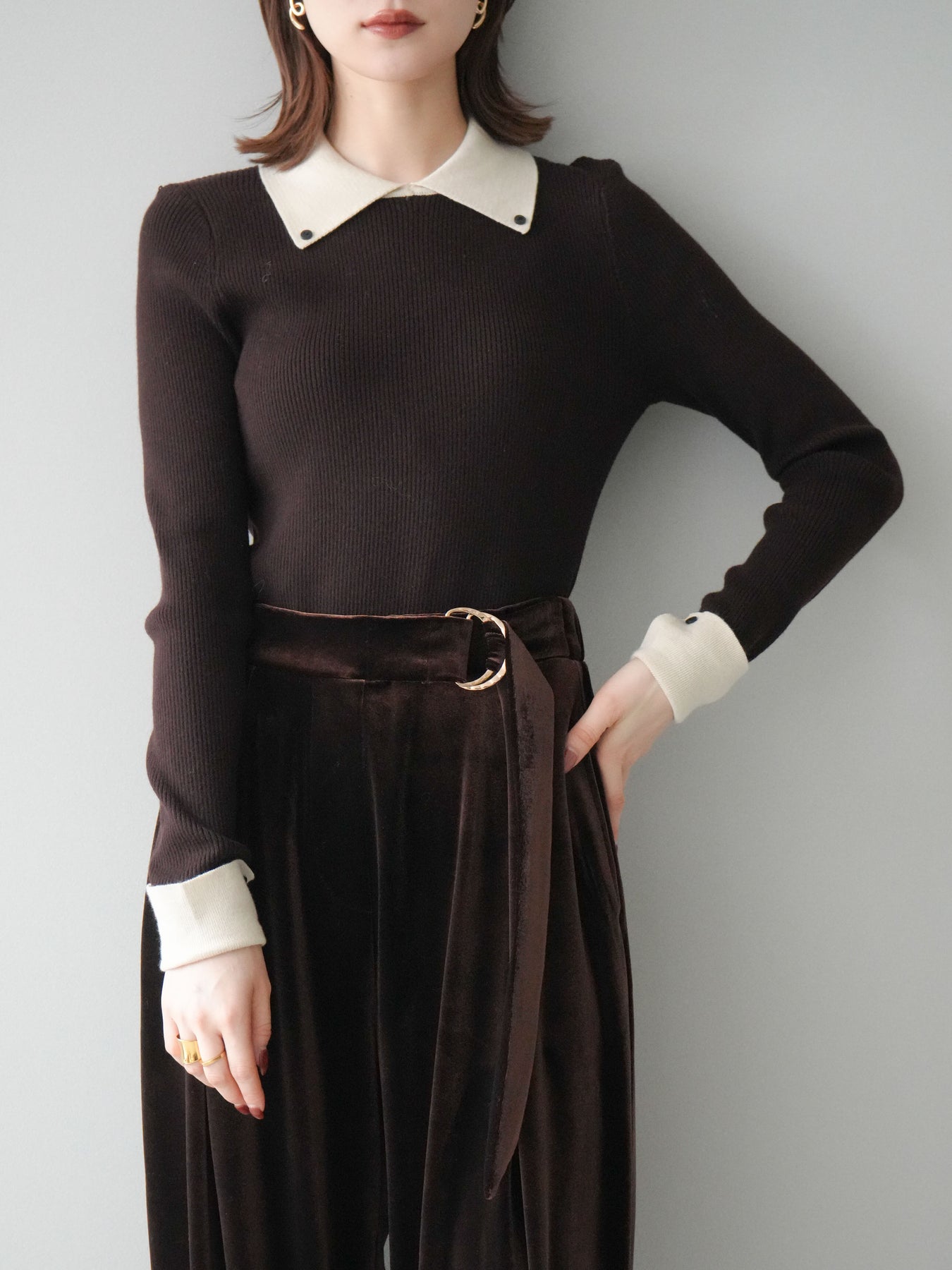 [予約]ニットカフス襟付き配色リブニットトップス/brown