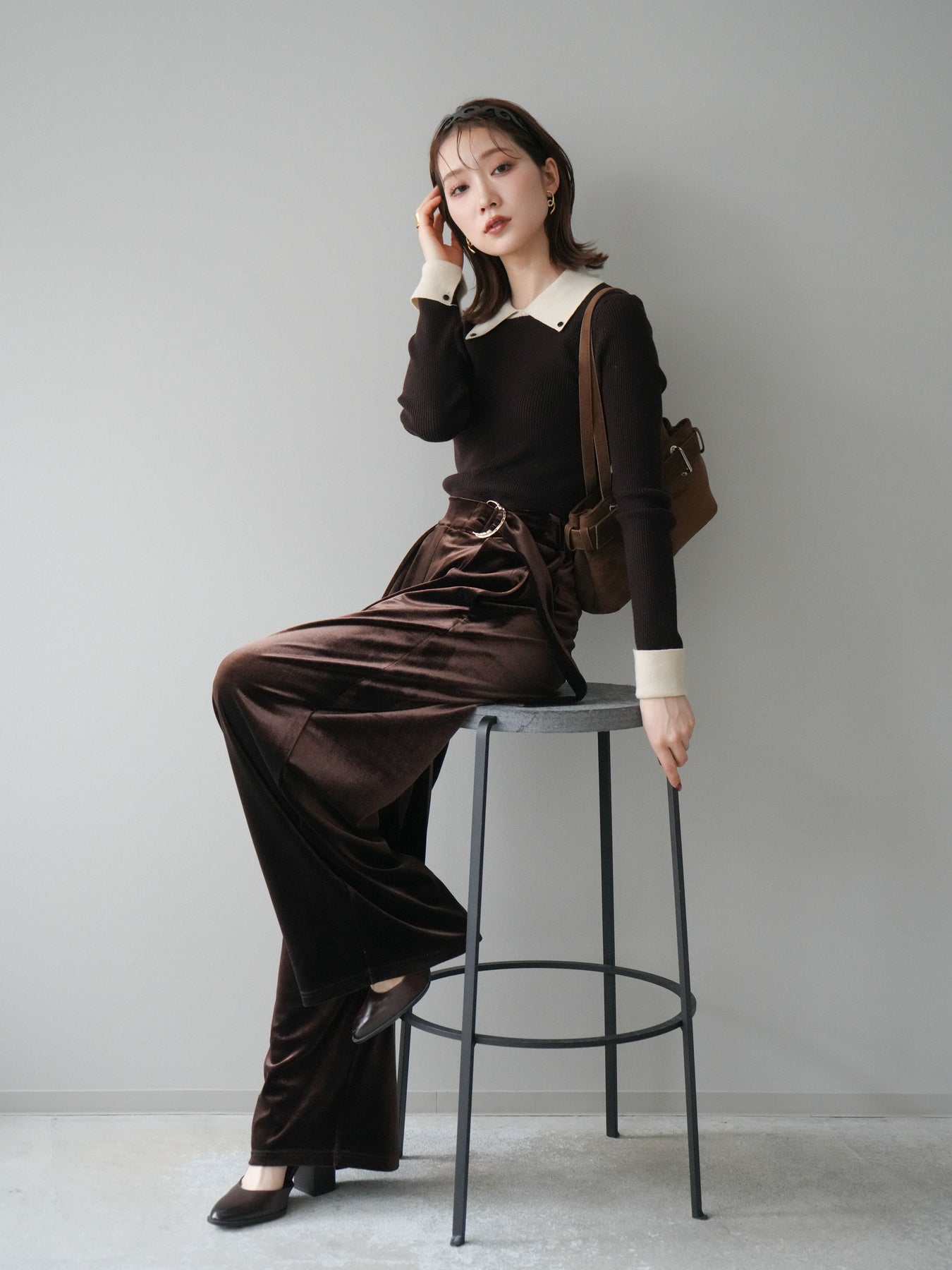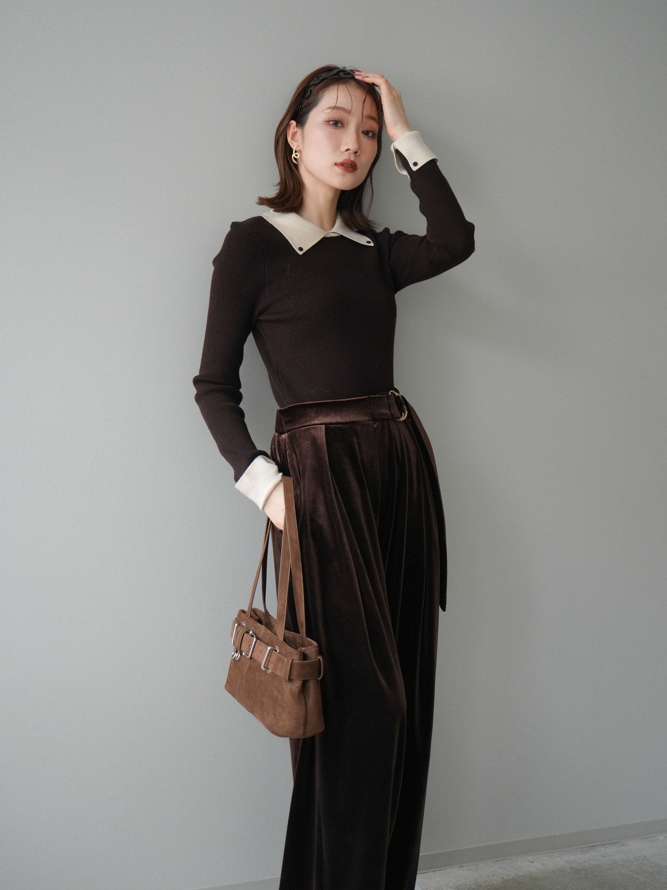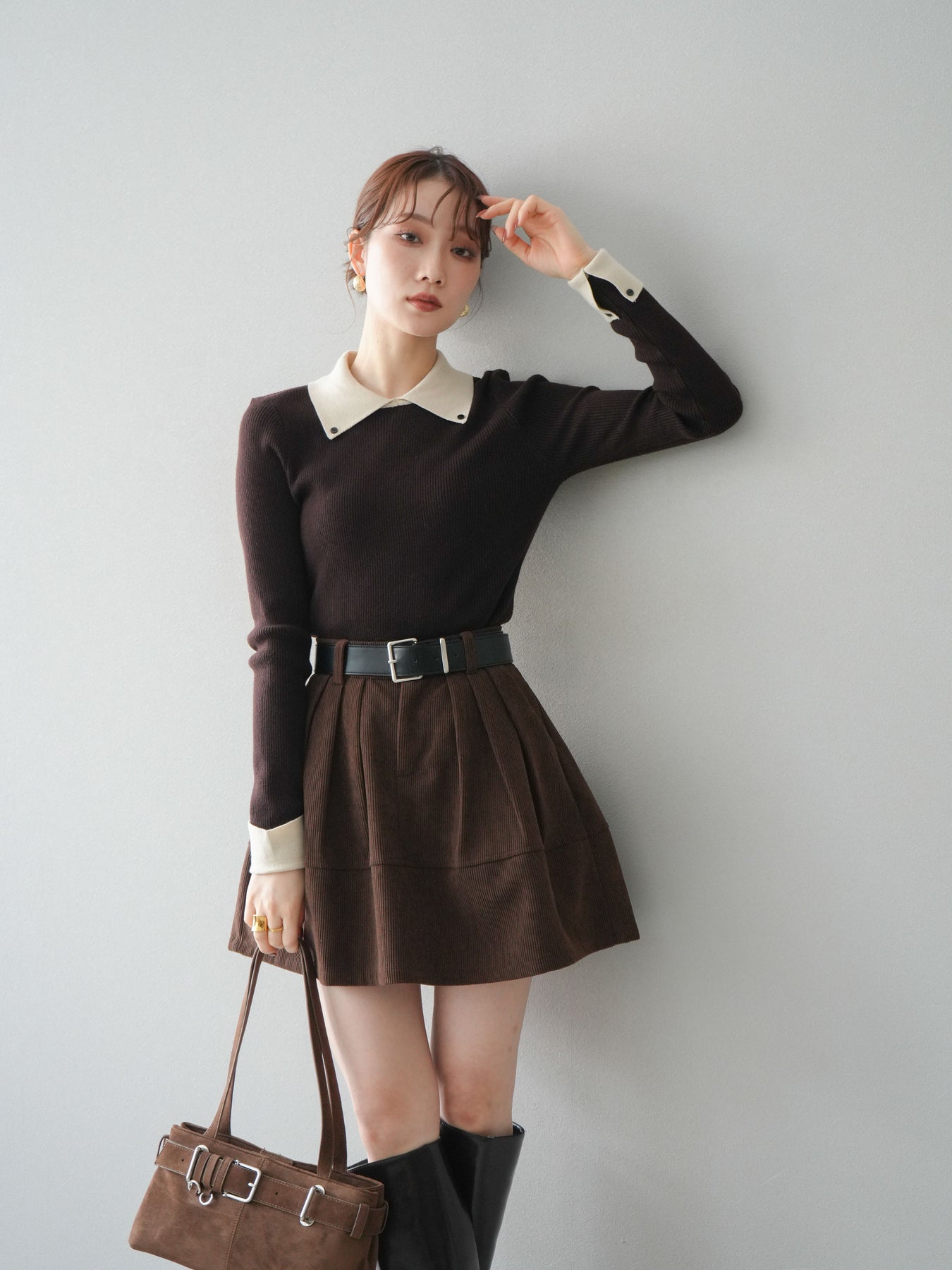 [予約]ニットカフス襟付き配色リブニットトップス/brown
