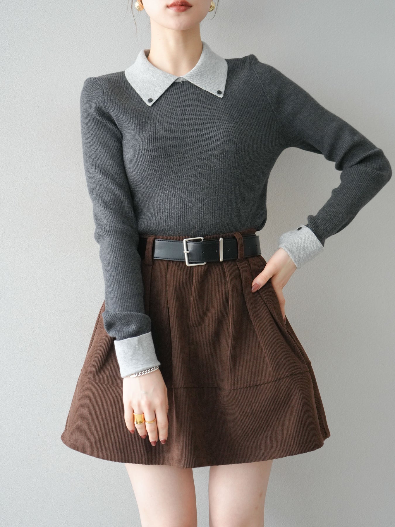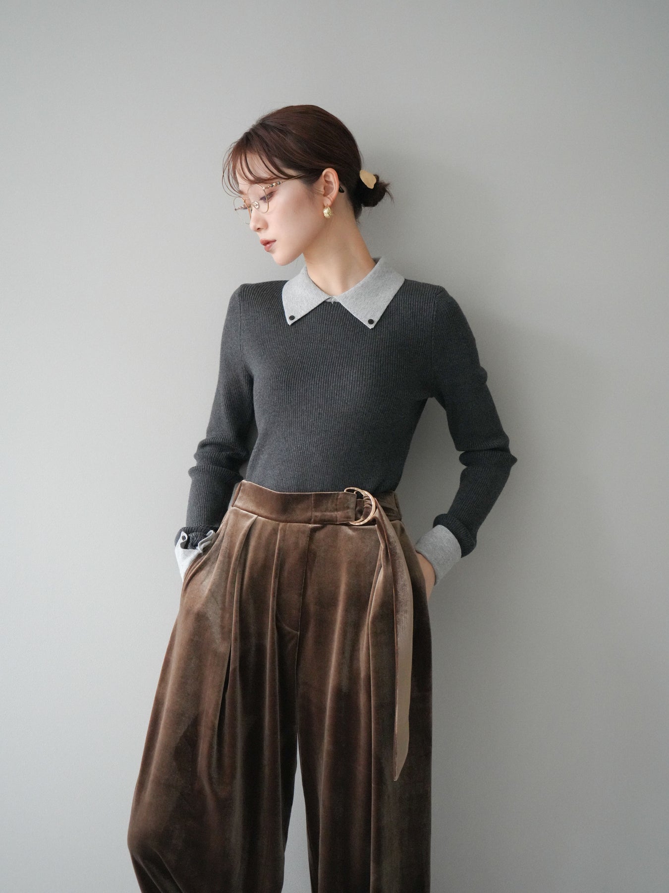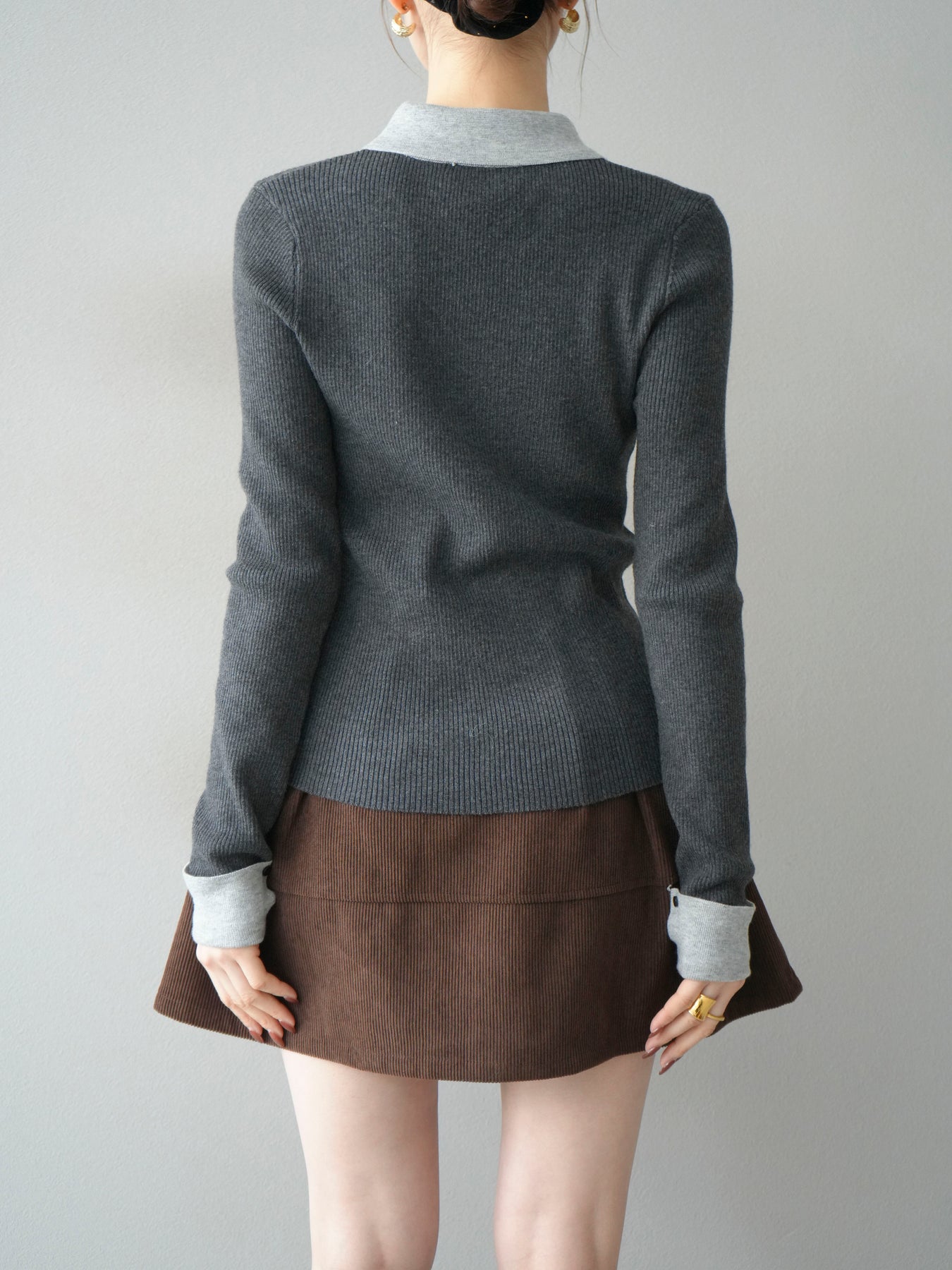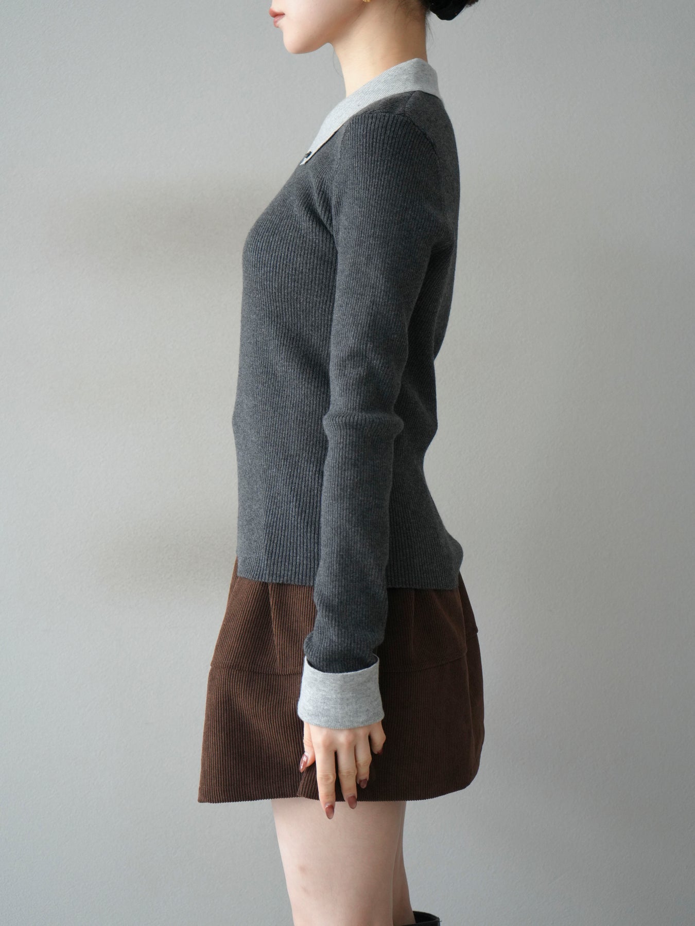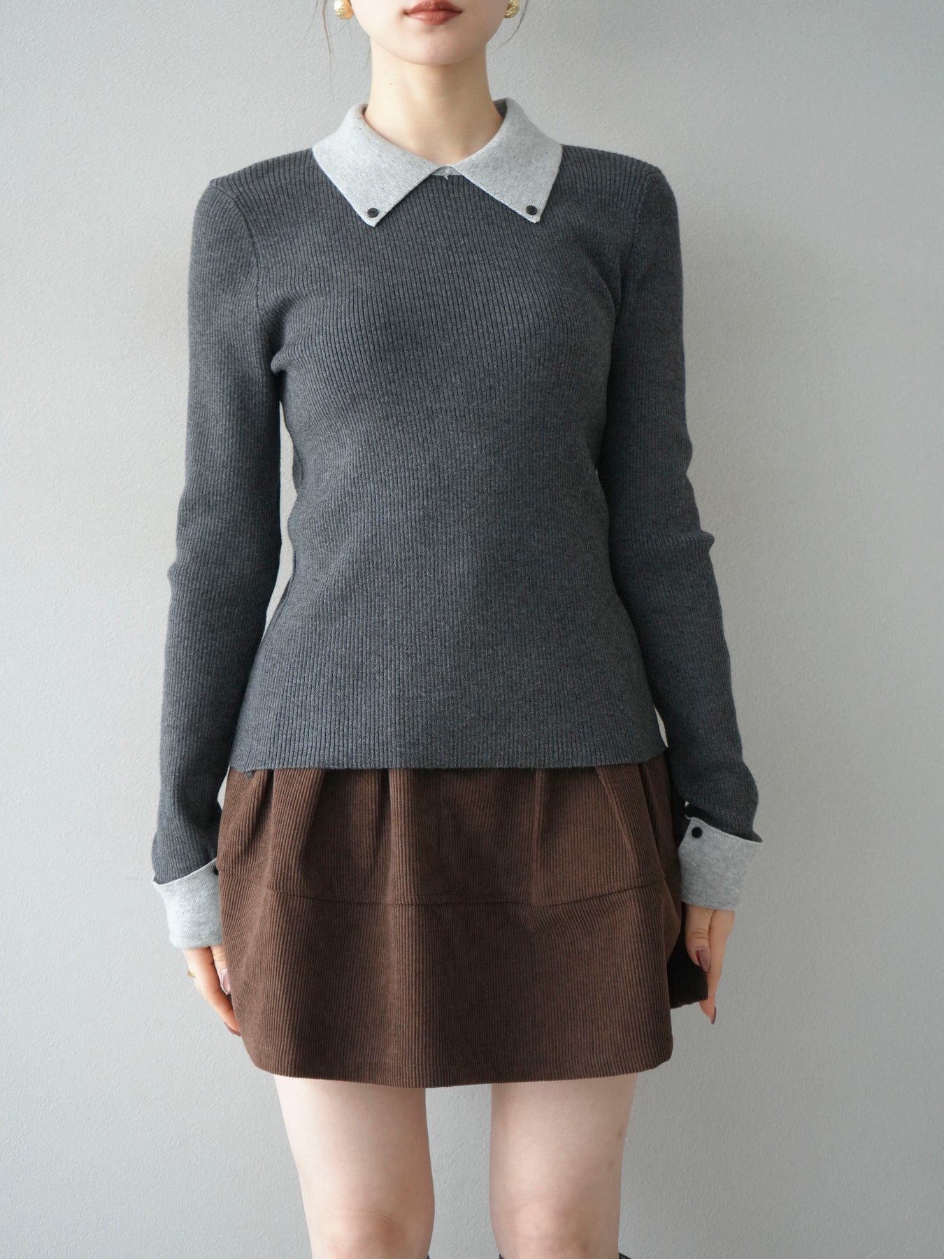 [予約]ニットカフス襟付き配色リブニットトップス/charcoal