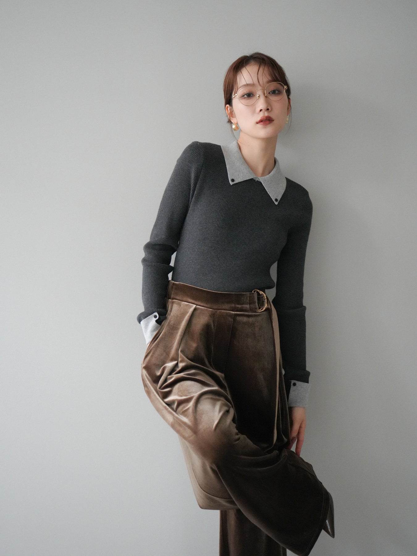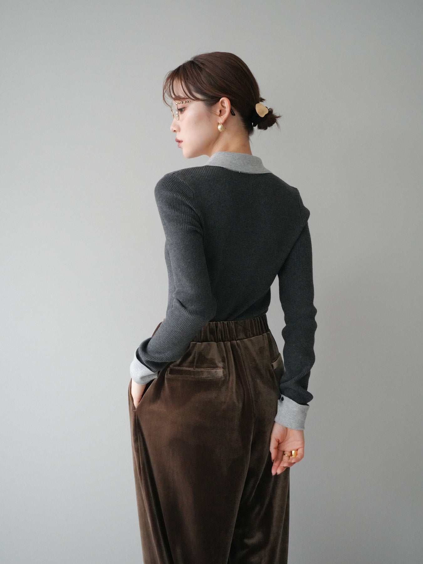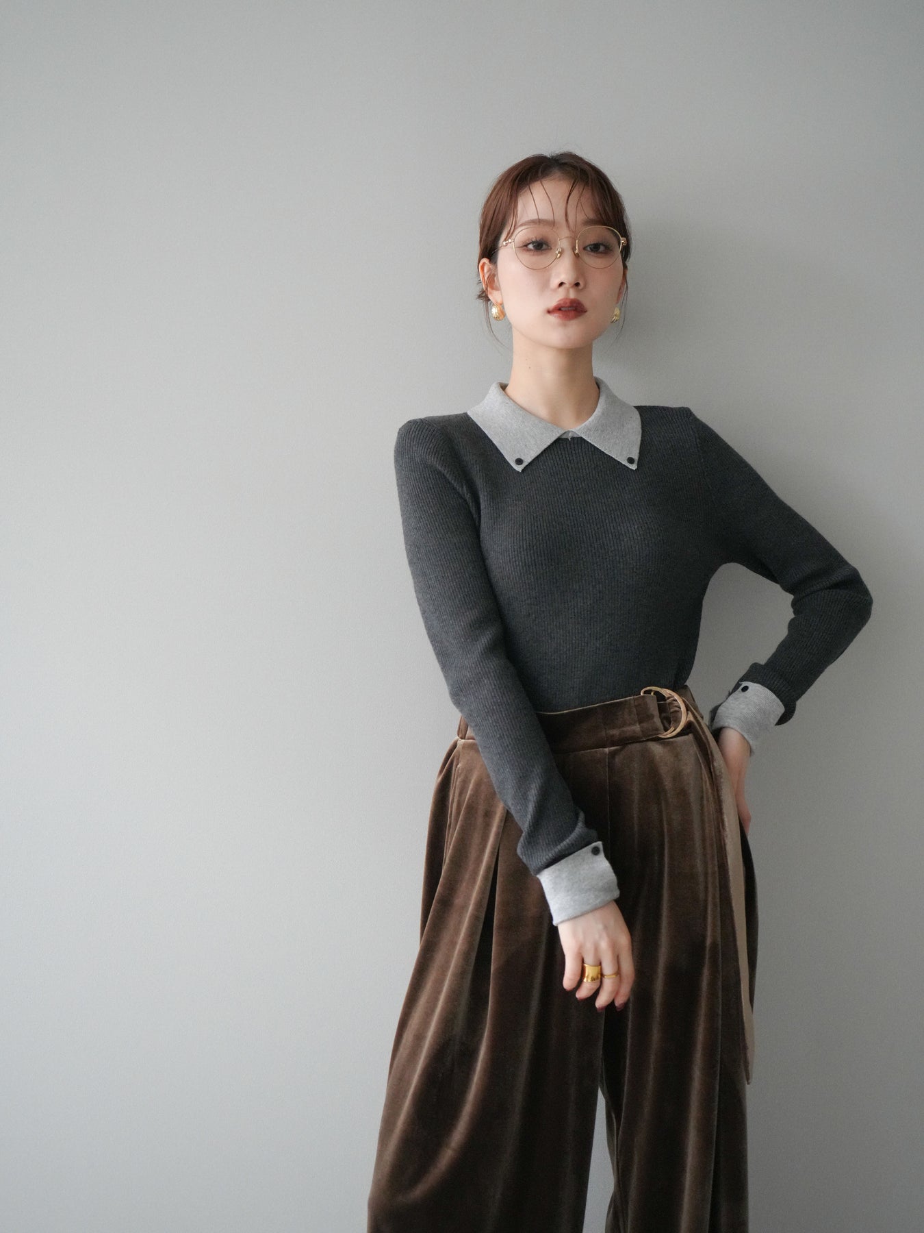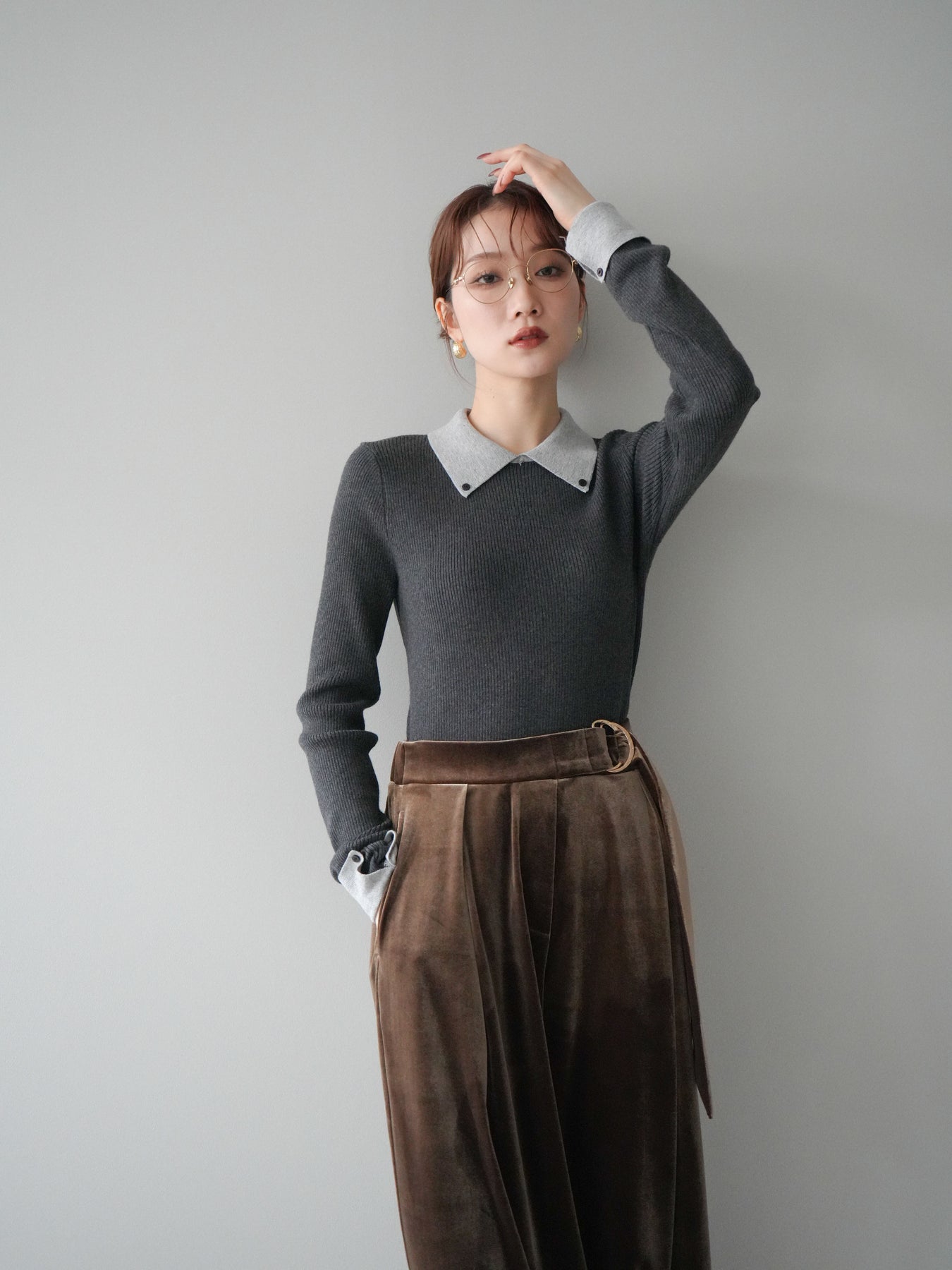 [予約]ニットカフス襟付き配色リブニットトップス/charcoal