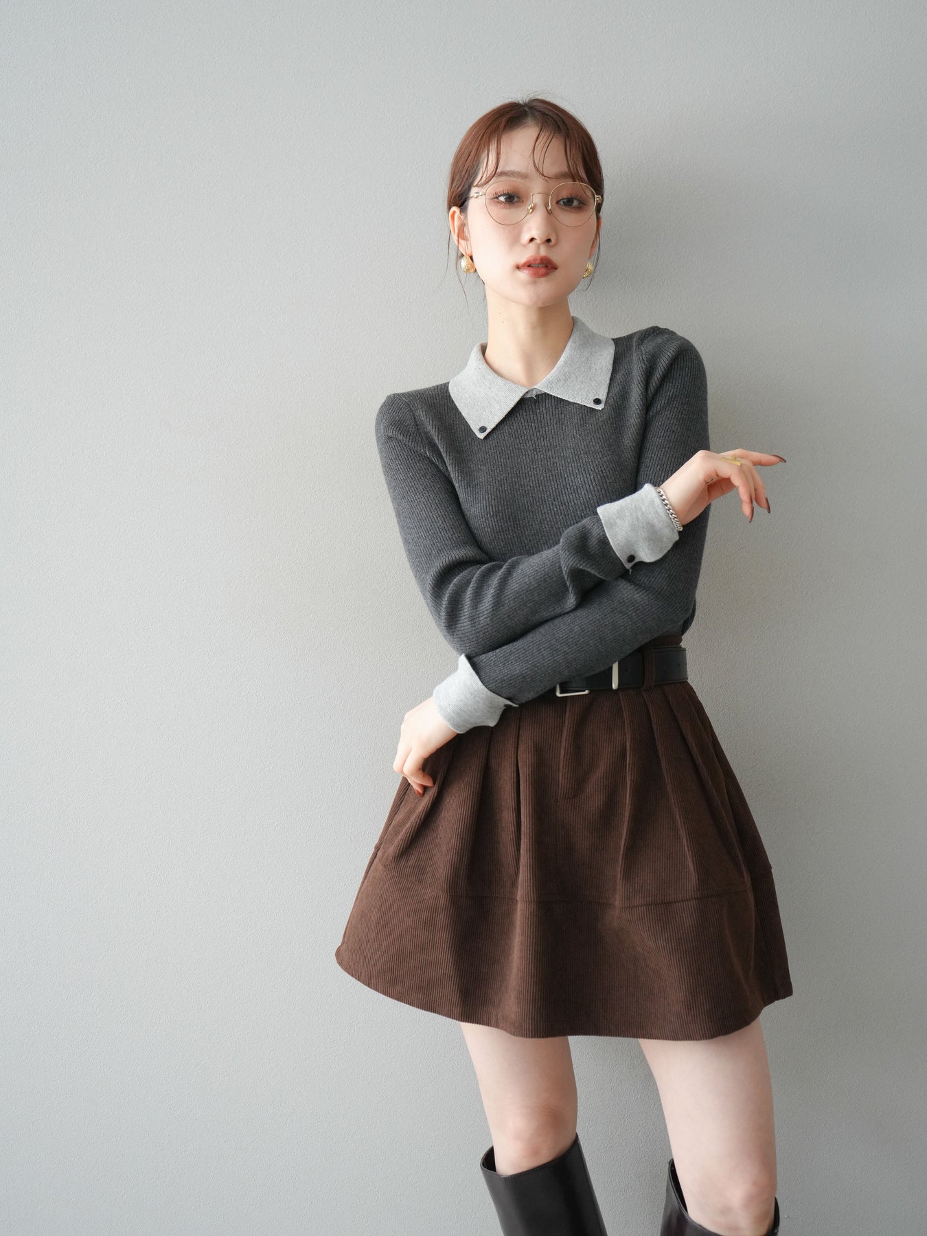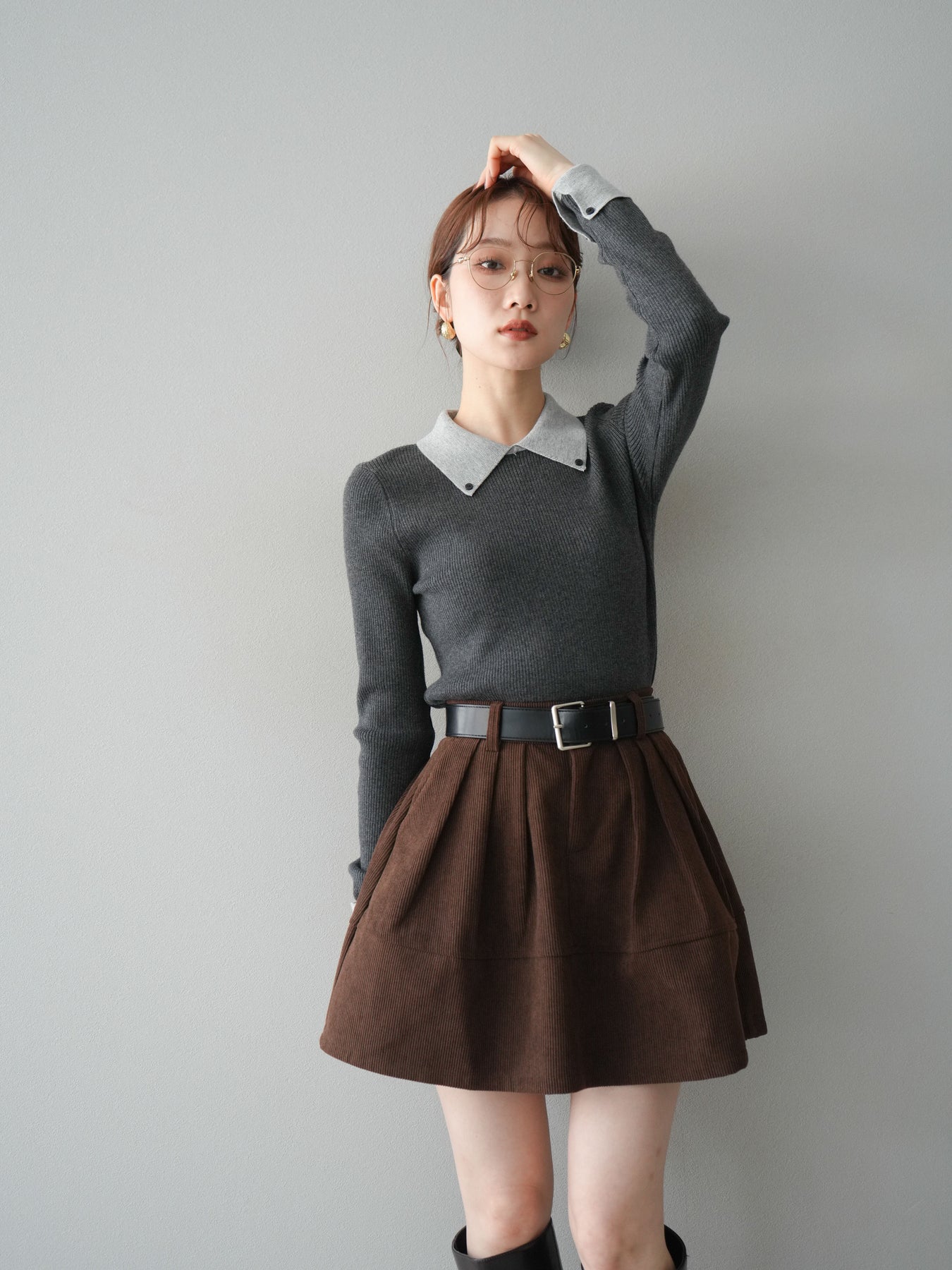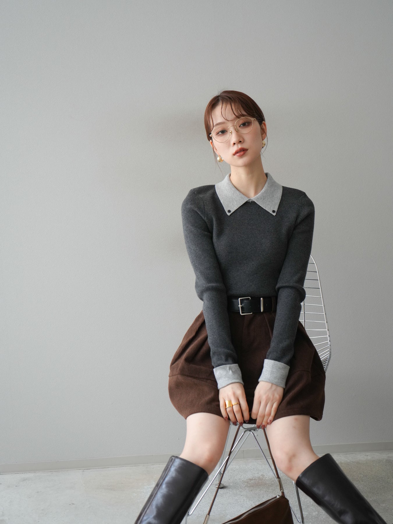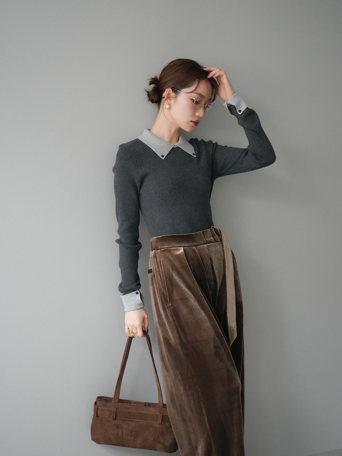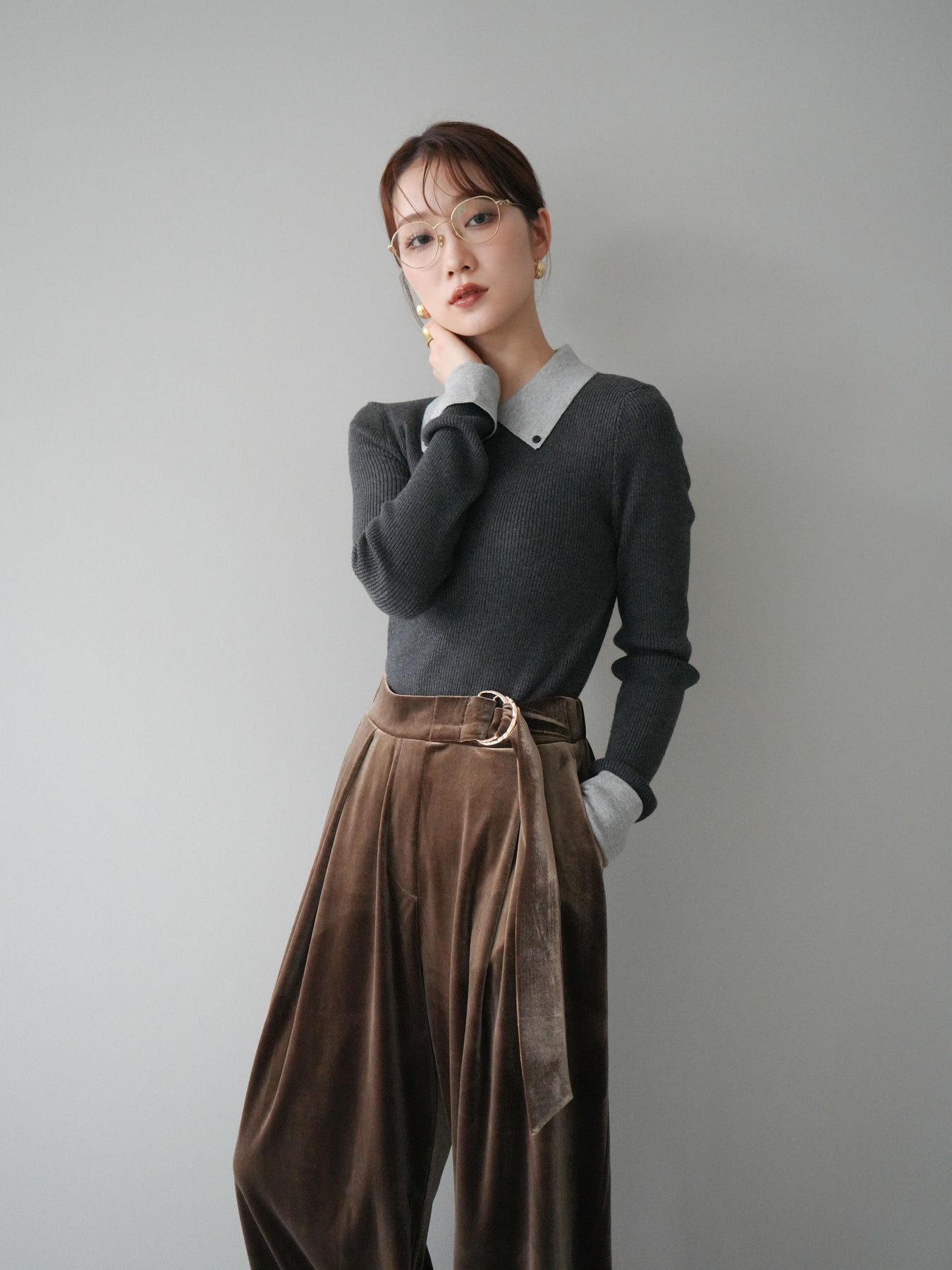 [予約]ニットカフス襟付き配色リブニットトップス/charcoal