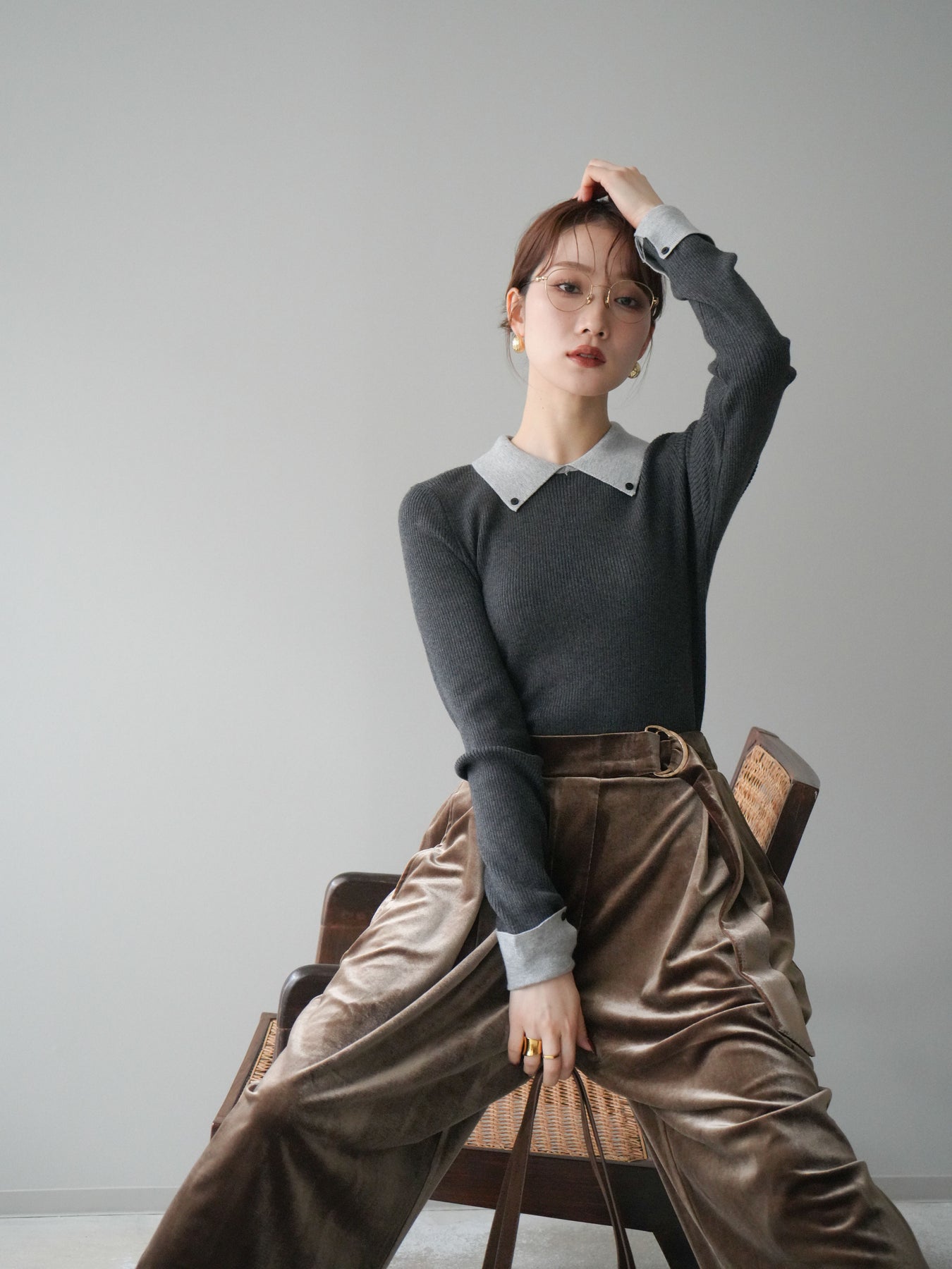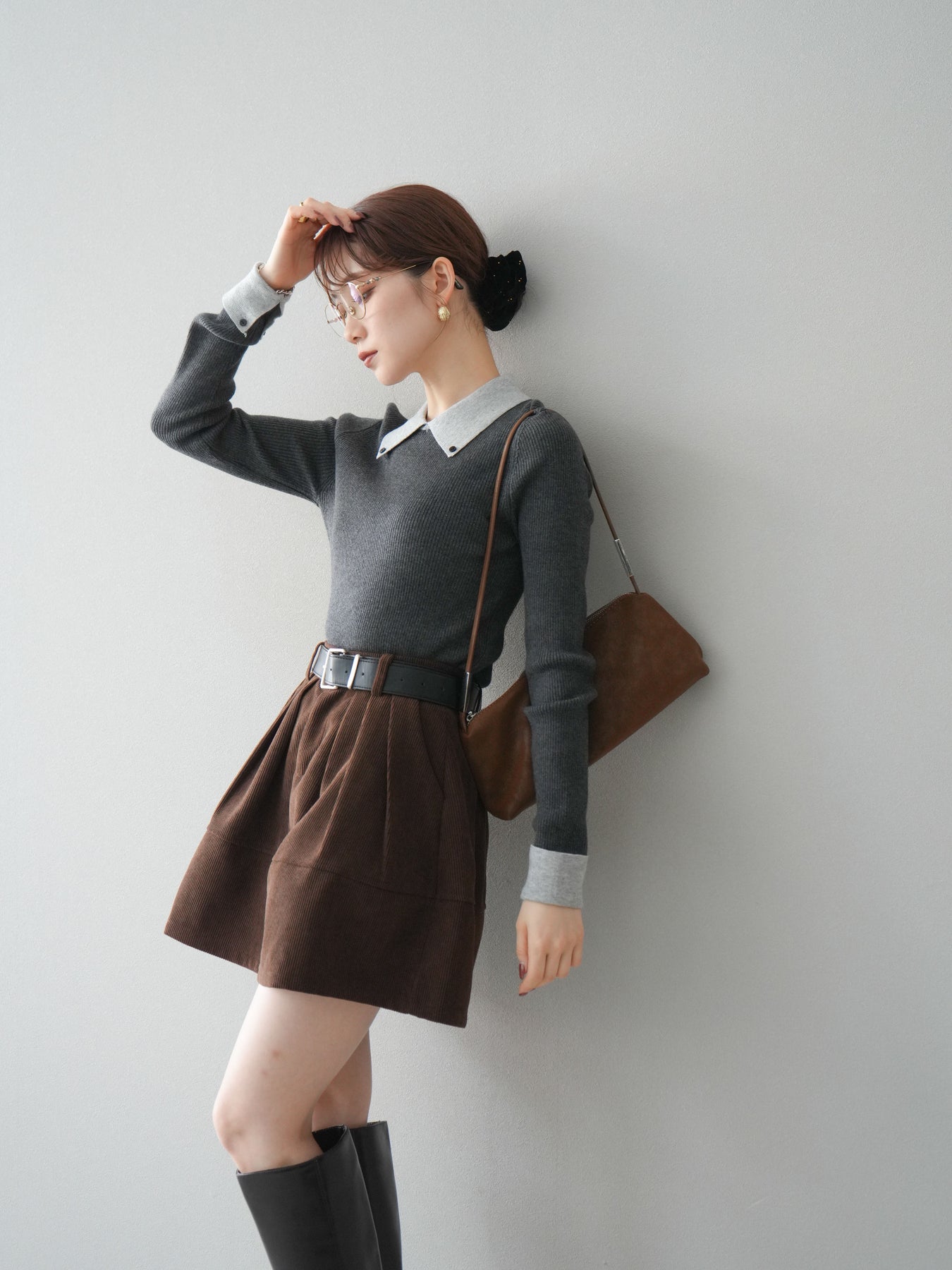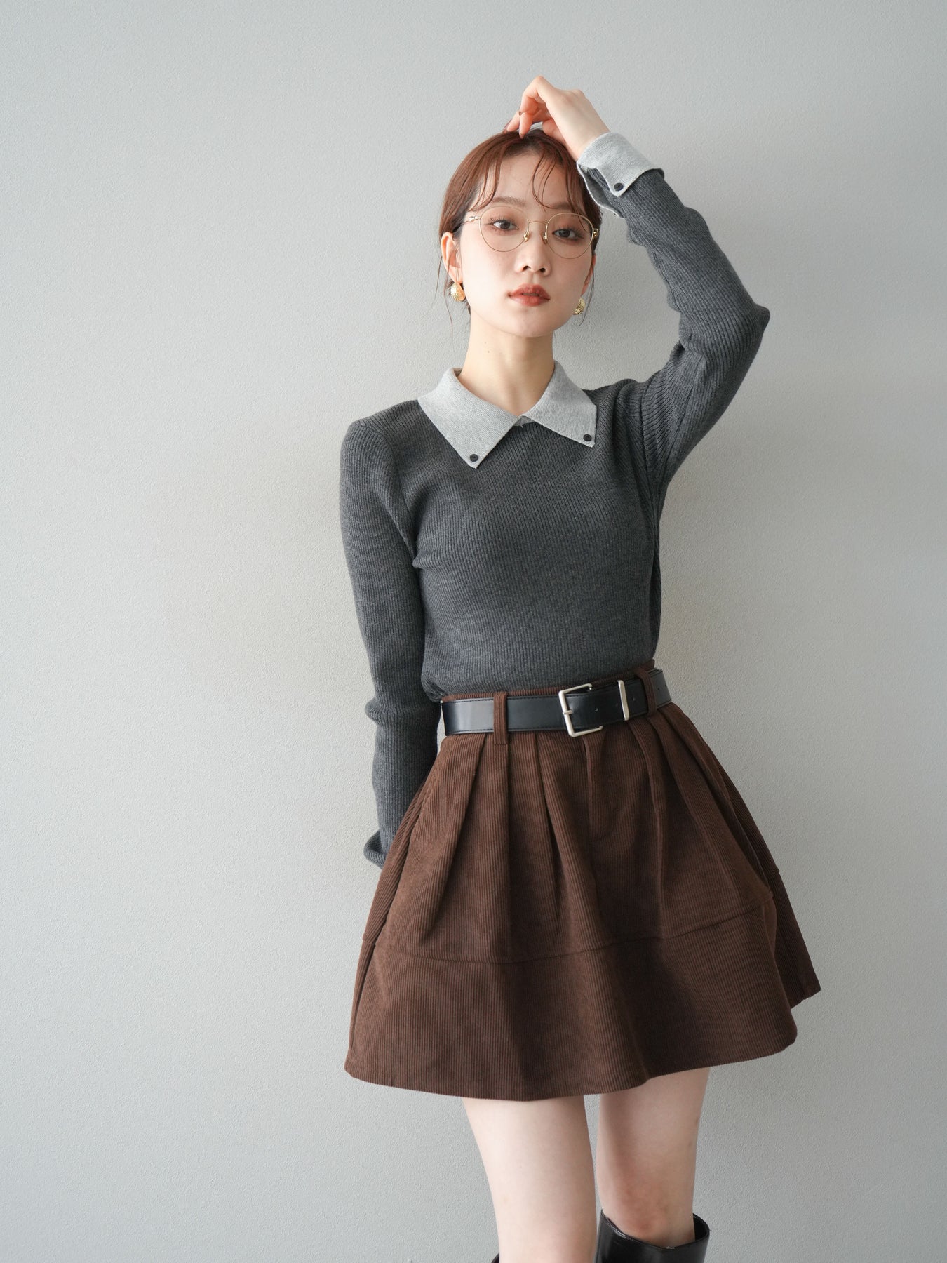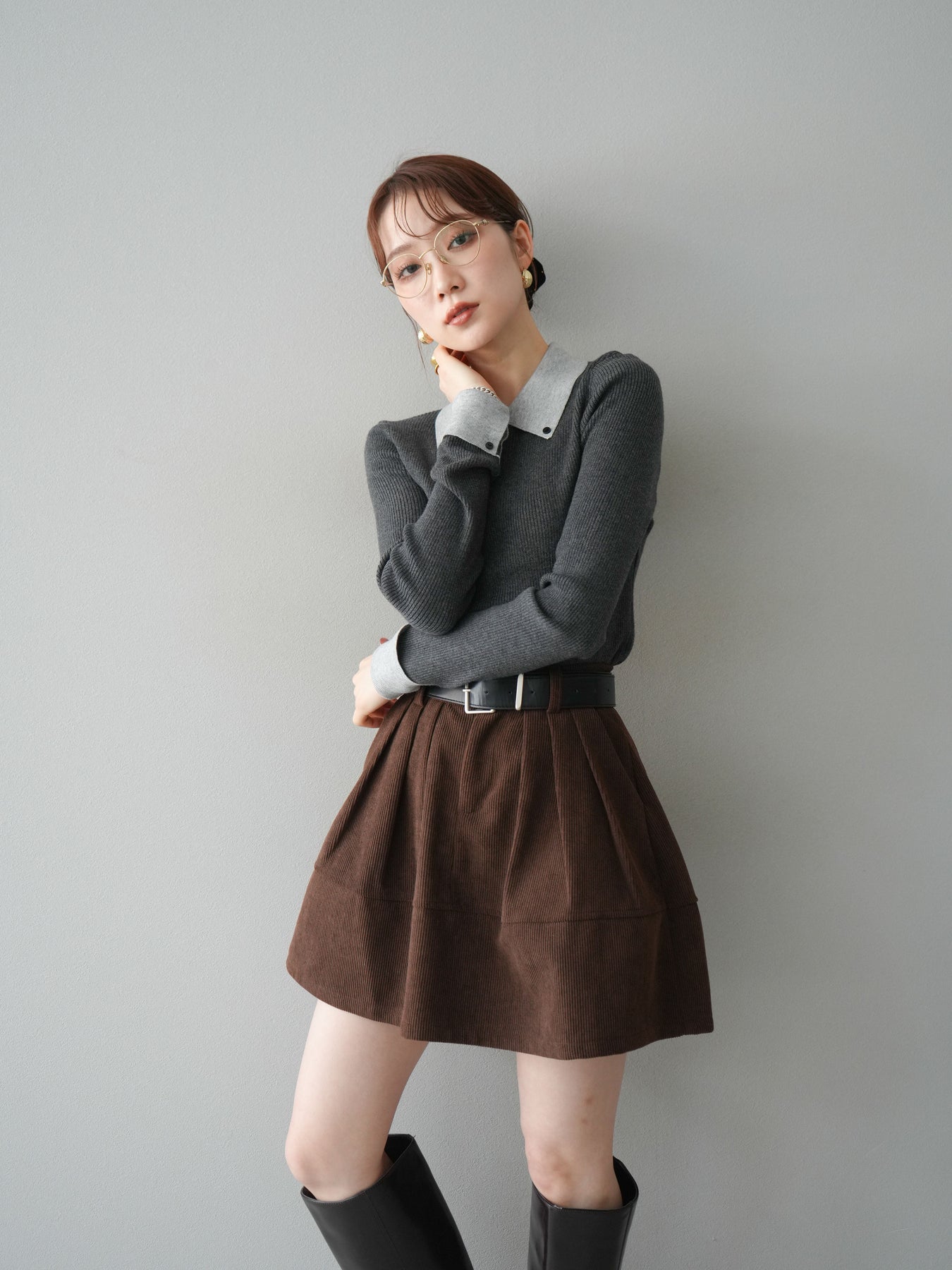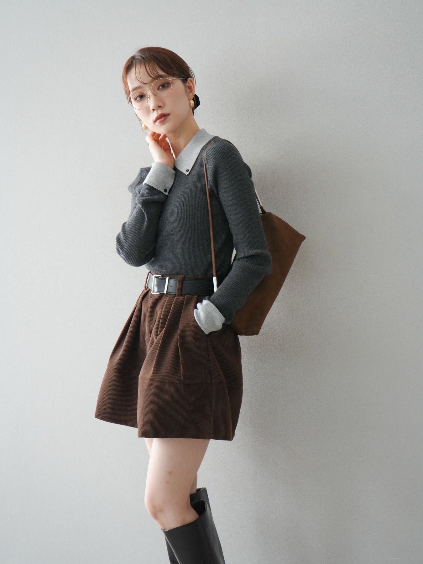 [予約]ニットカフス襟付き配色リブニットトップス/charcoal