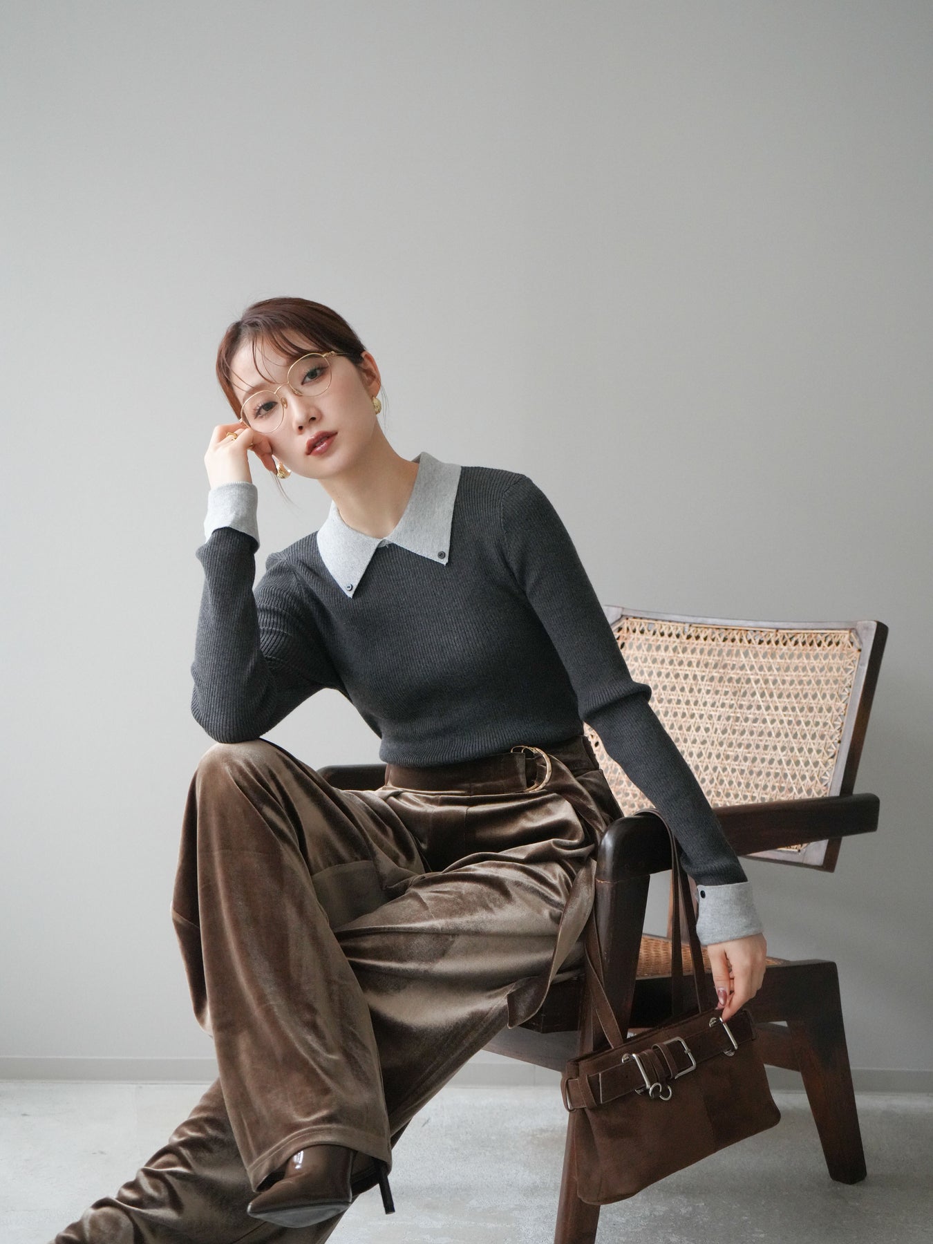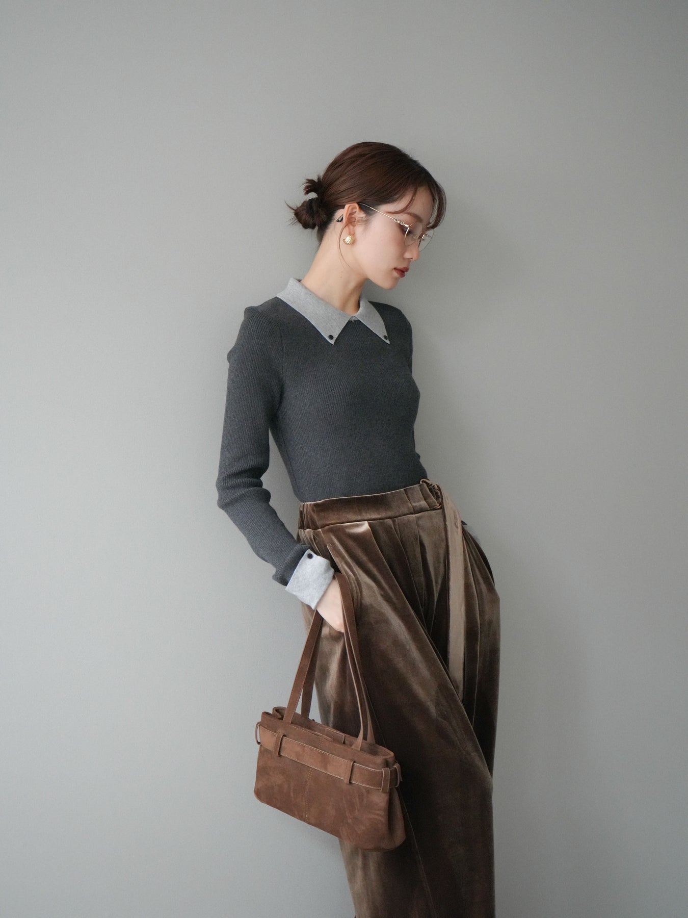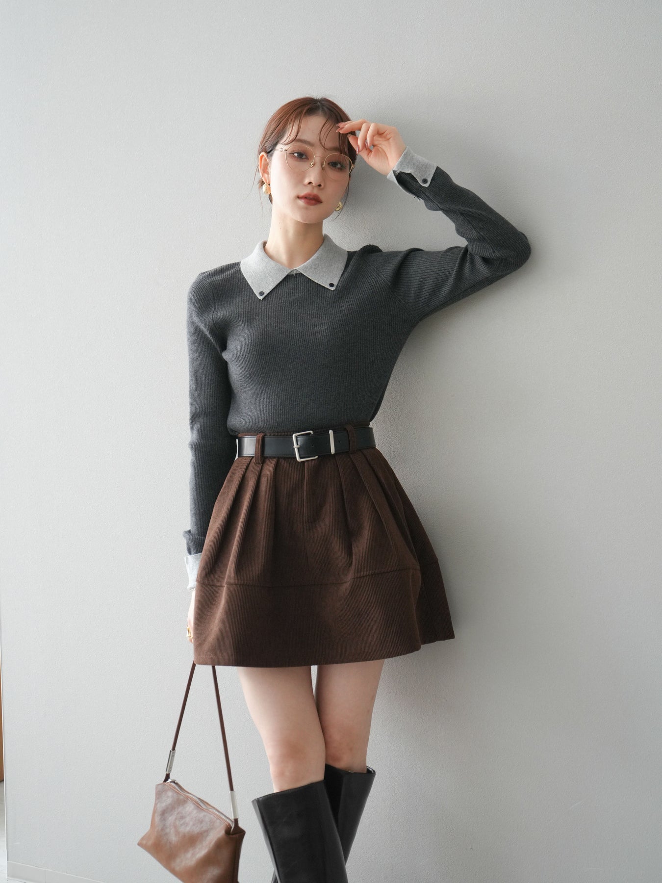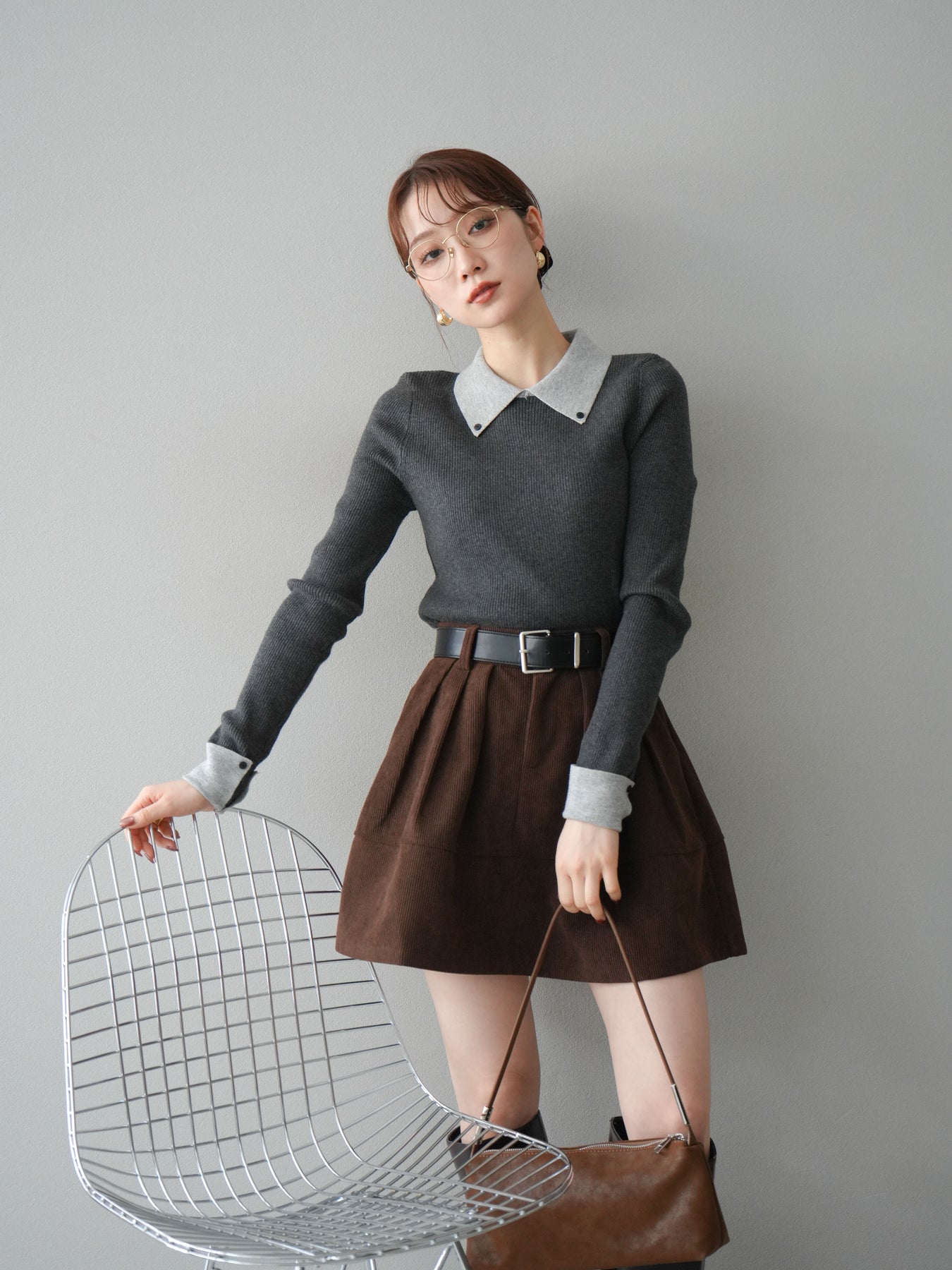 [予約]ニットカフス襟付き配色リブニットトップス/charcoal