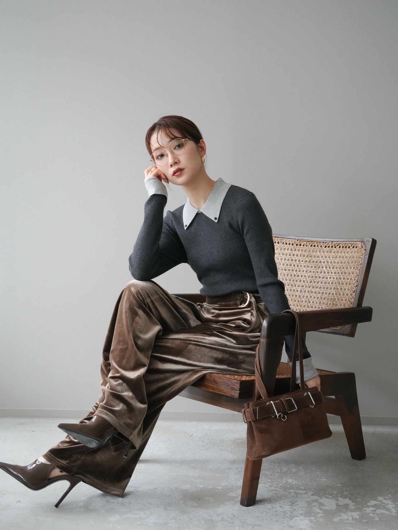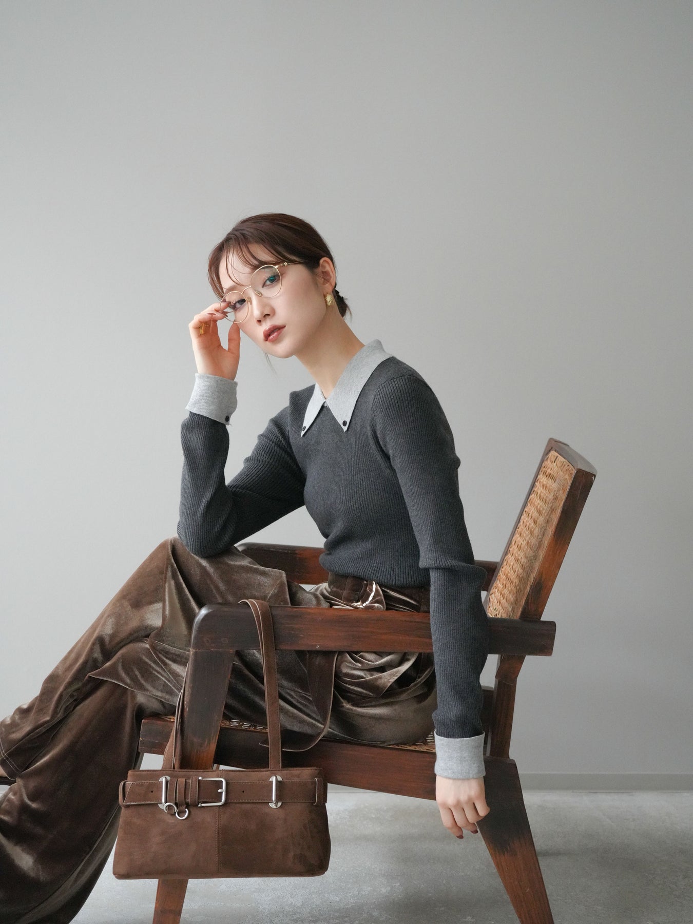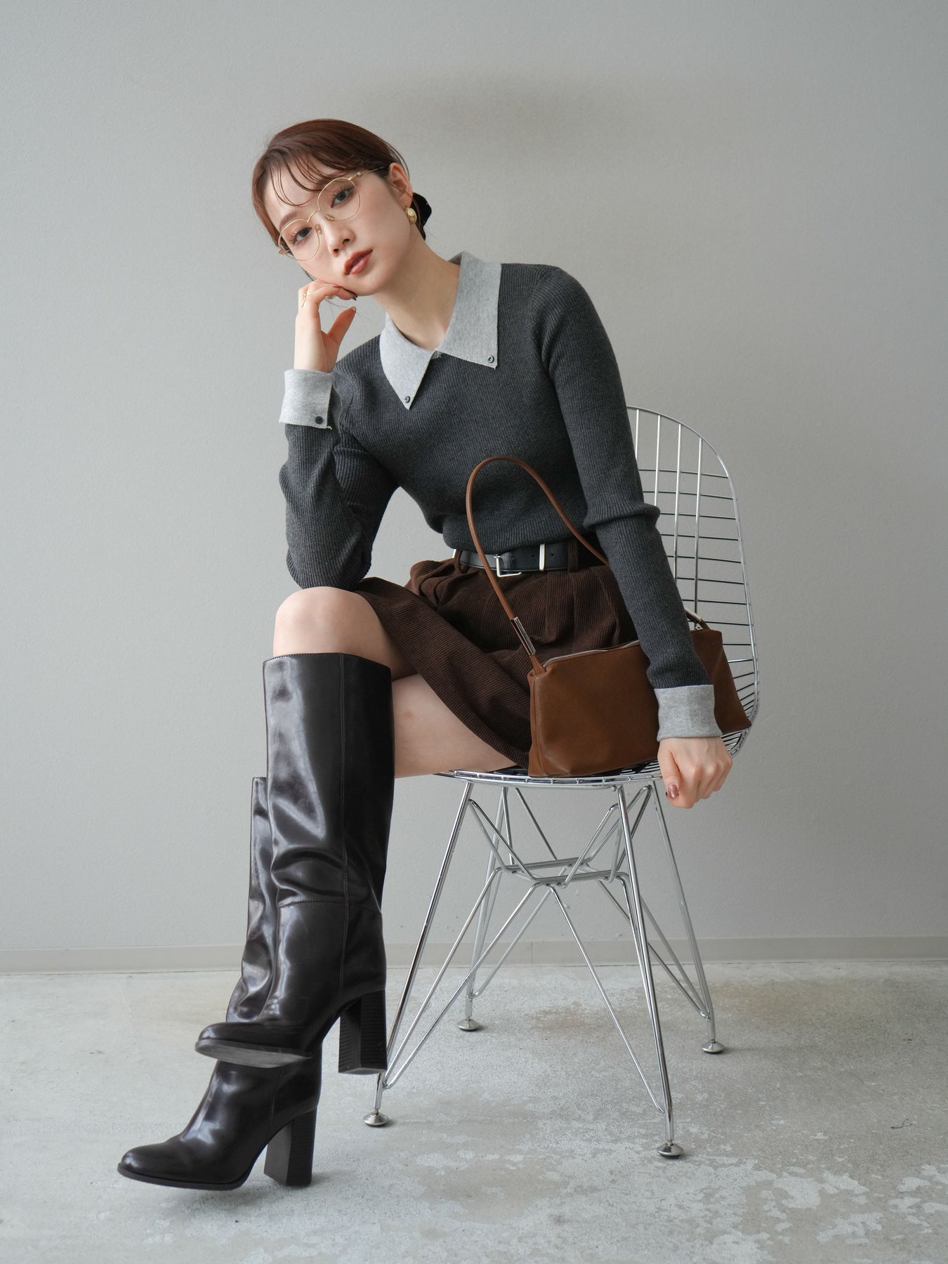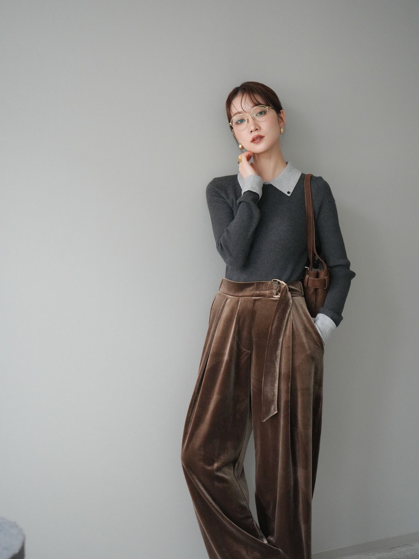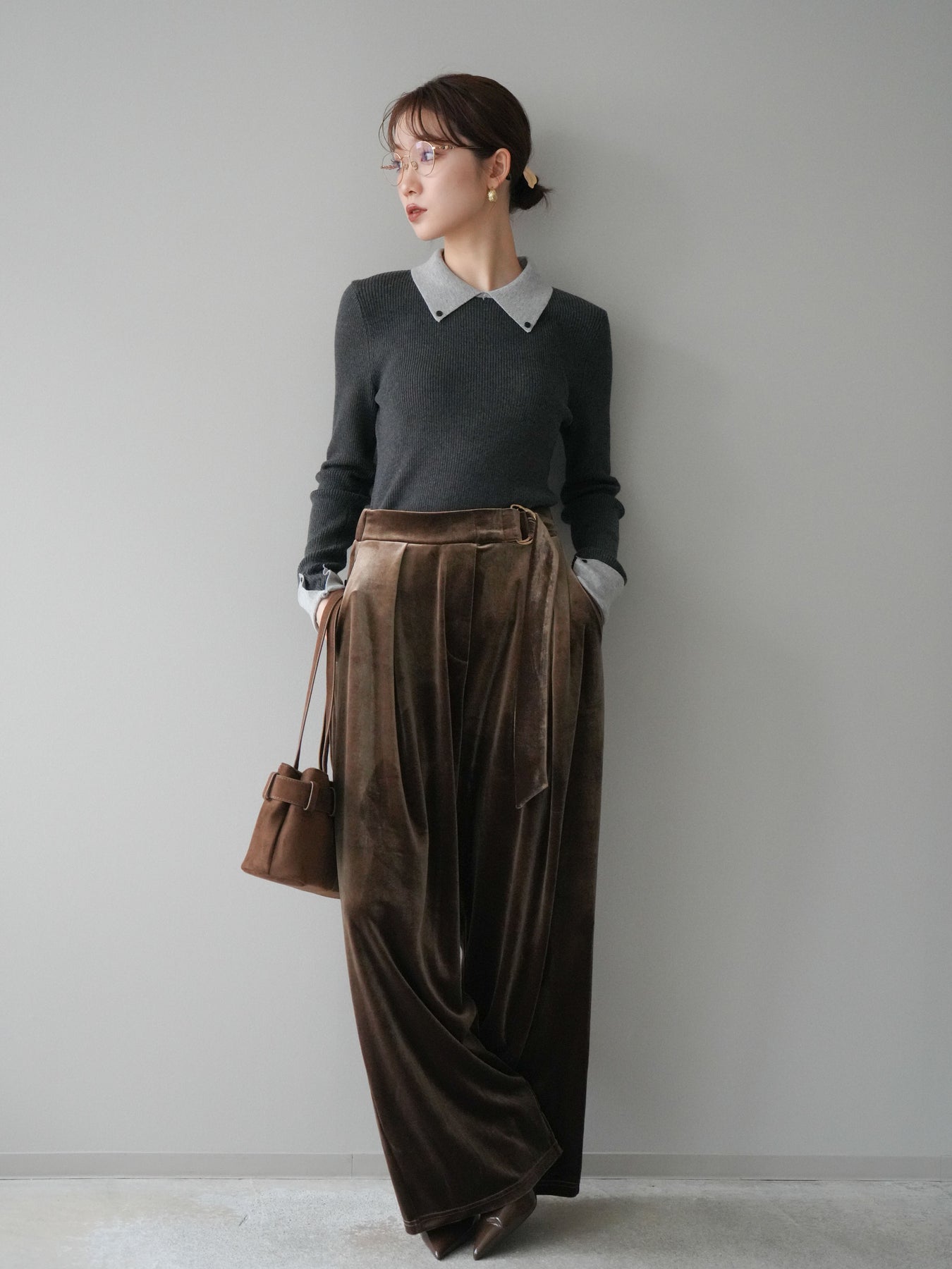 [予約]ニットカフス襟付き配色リブニットトップス/charcoal