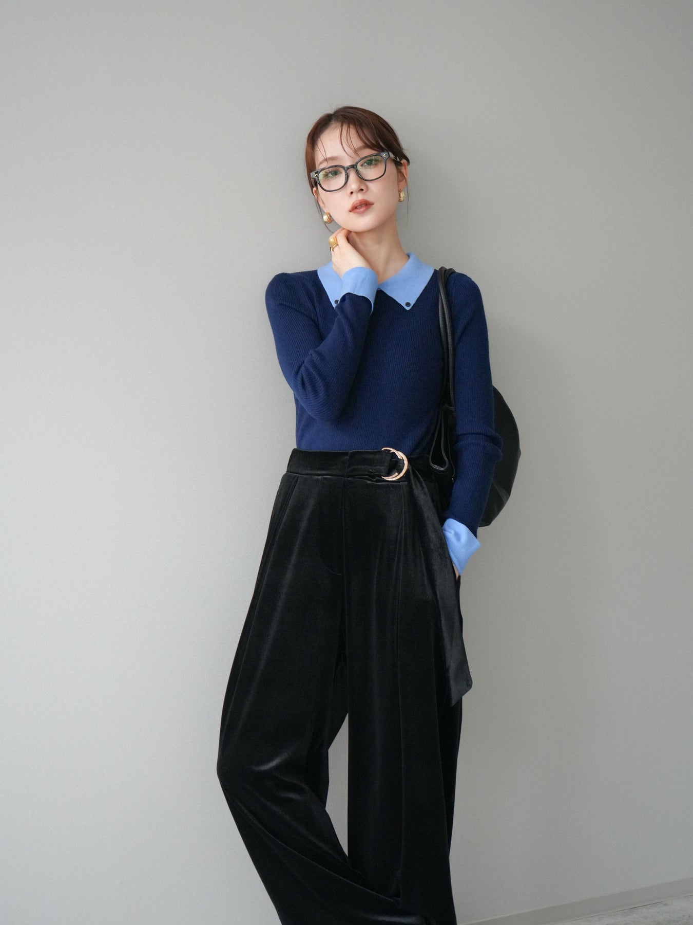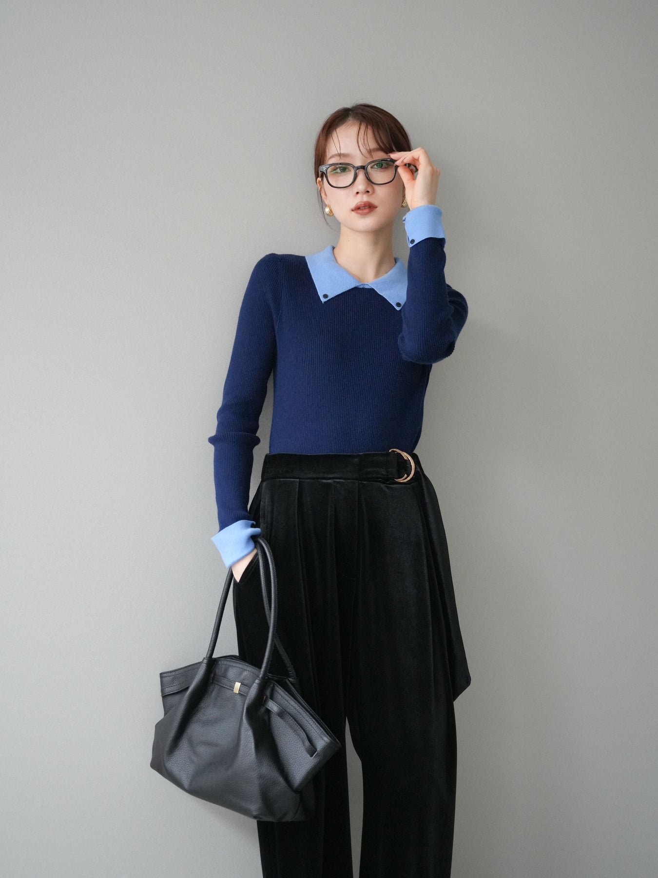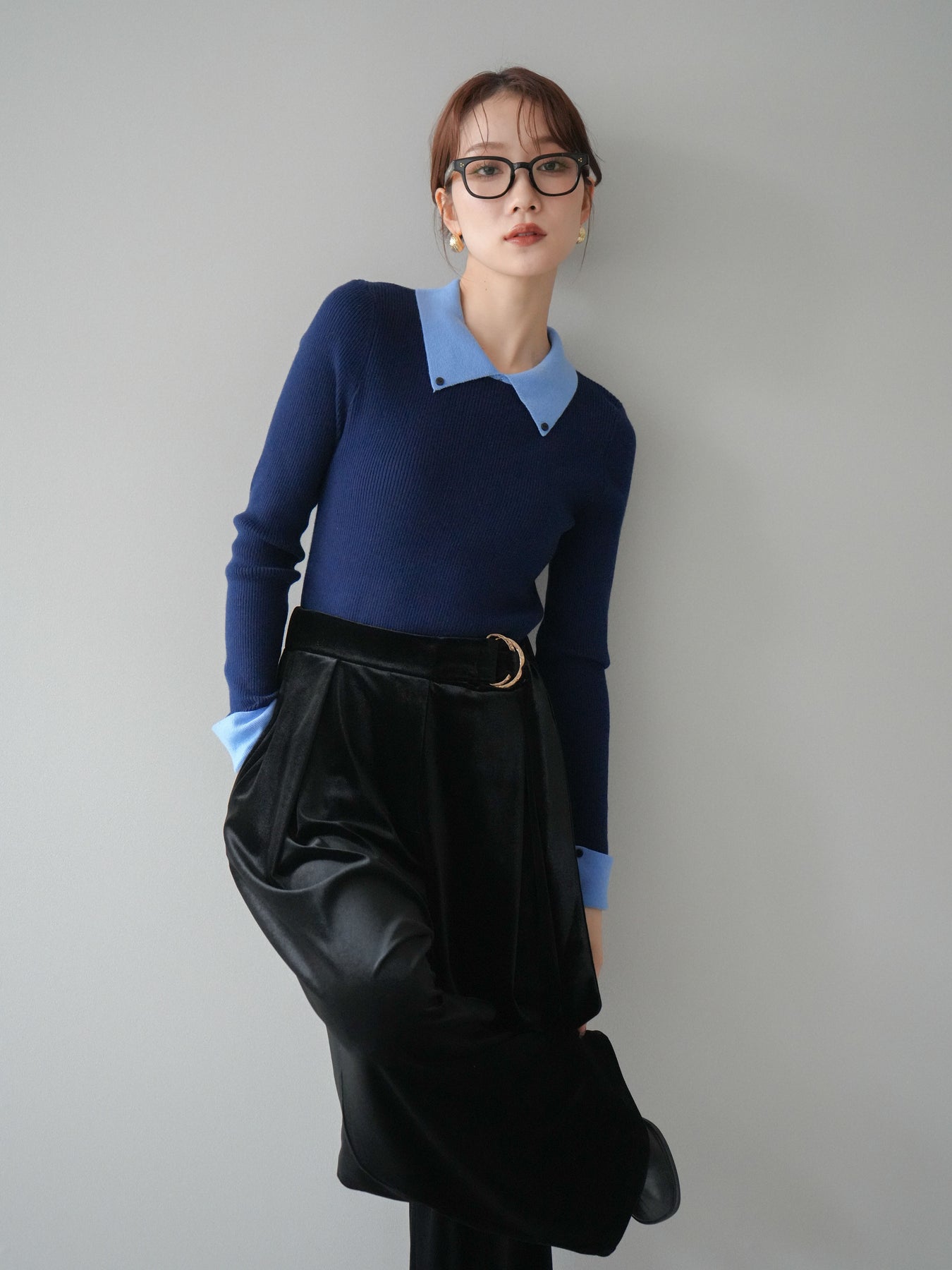 [予約]ニットカフス襟付き配色リブニットトップス/navy