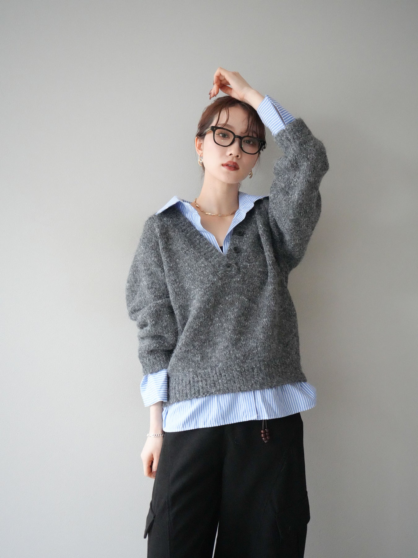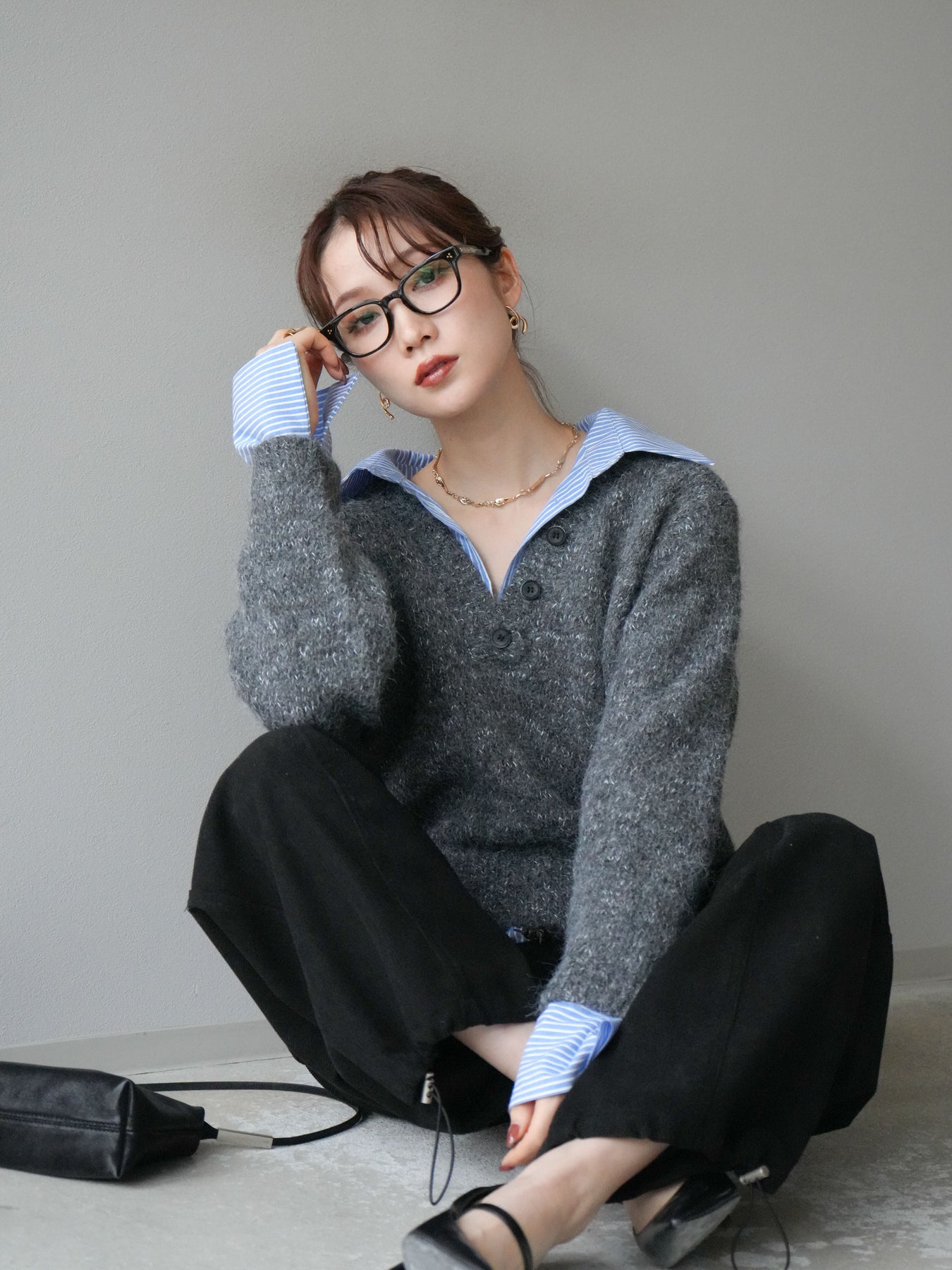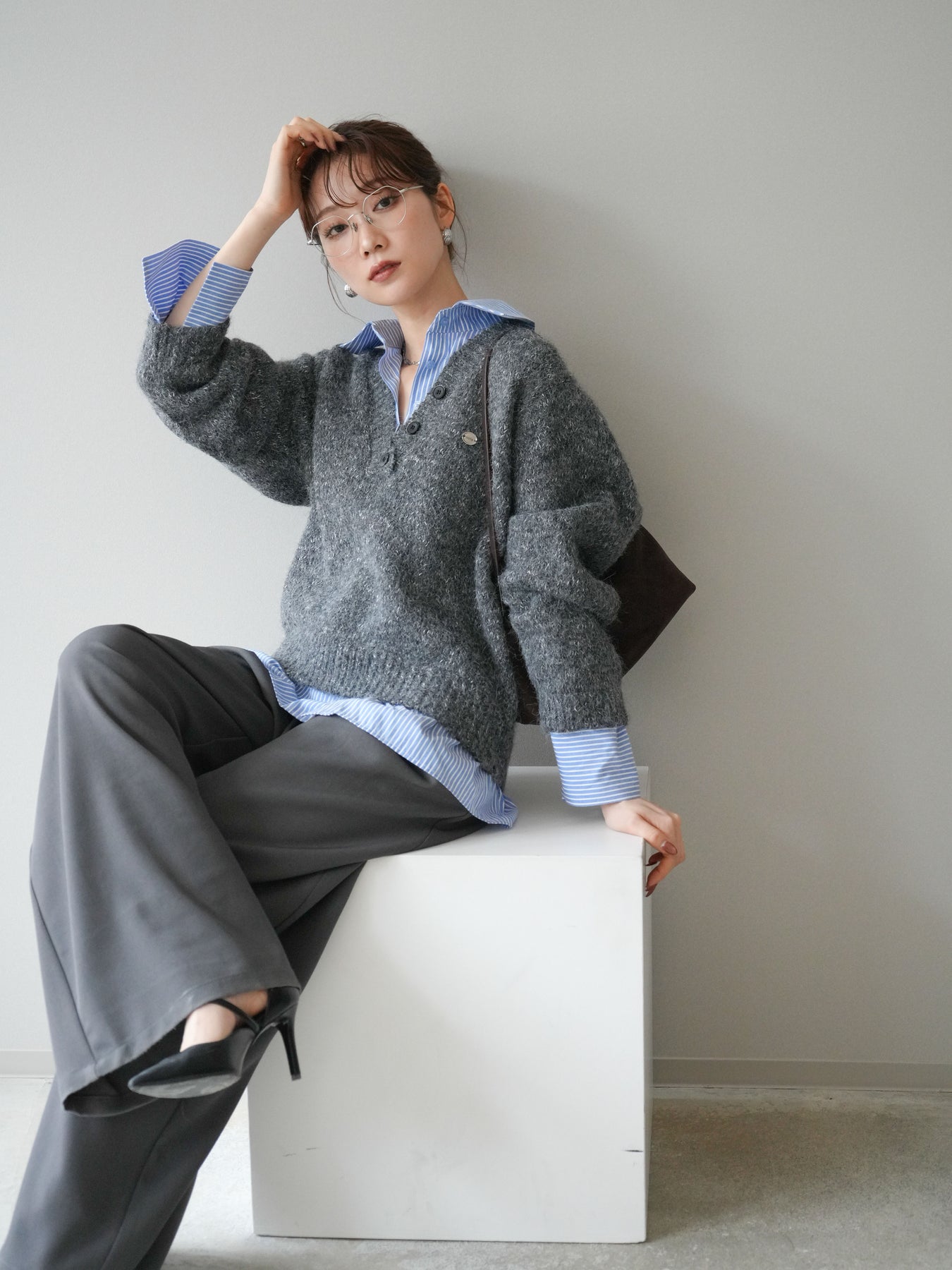 [予約]ストライプシャツドッキングMIXヤーンニットプルオーバー/charcoal