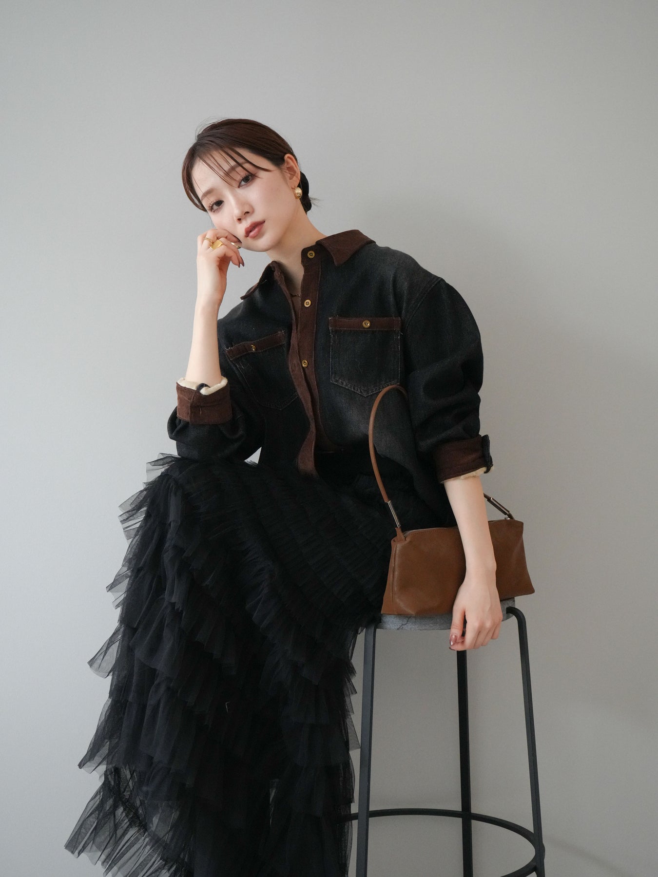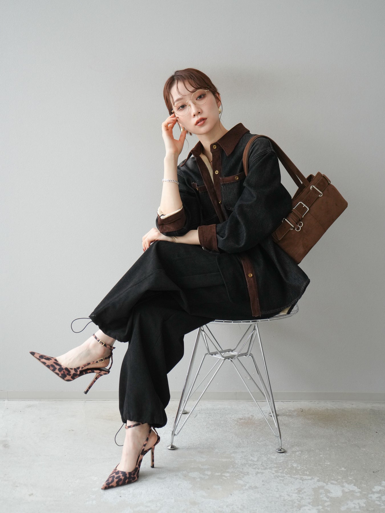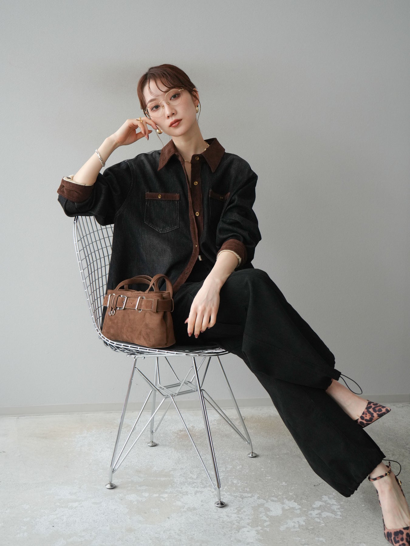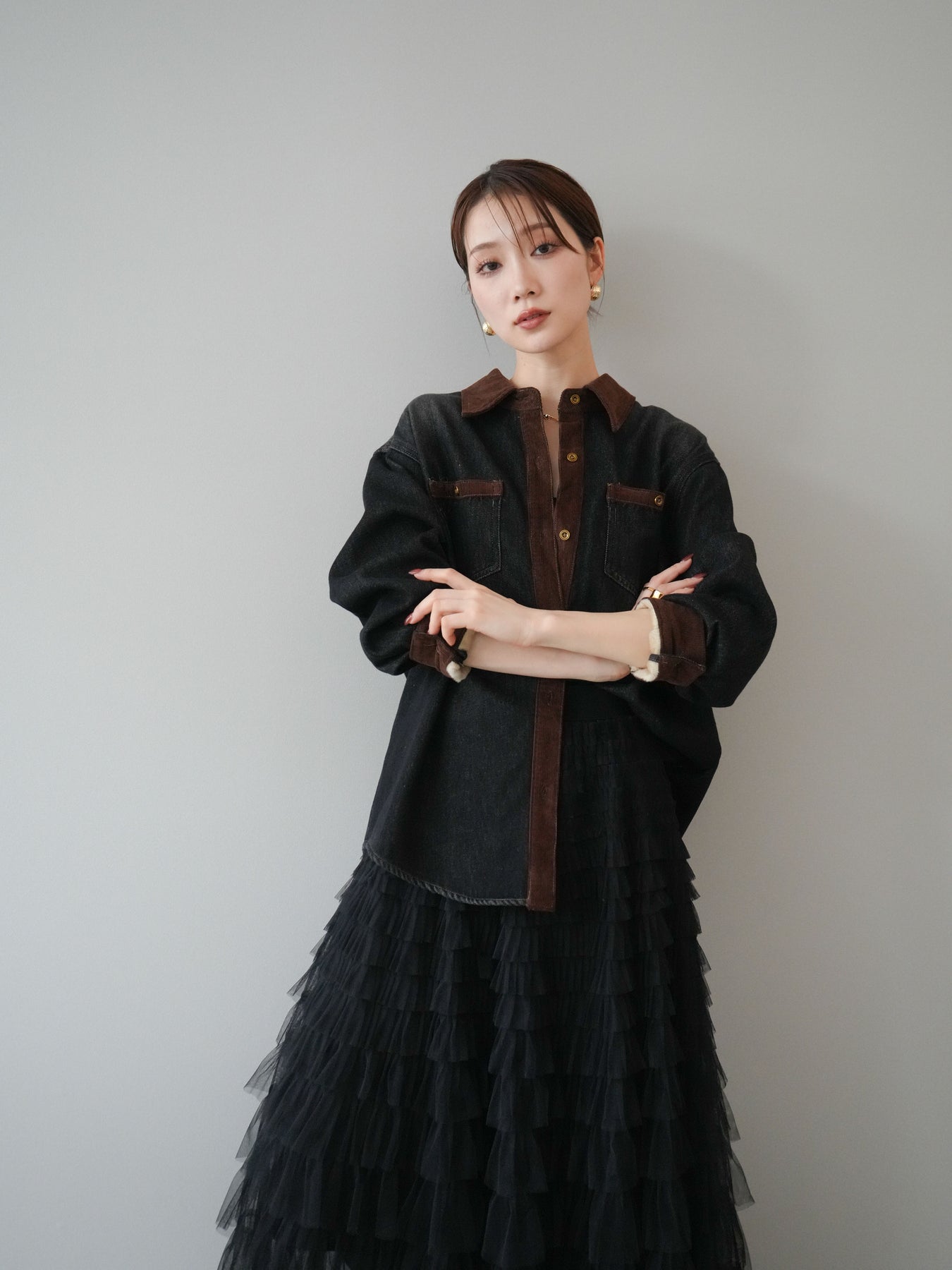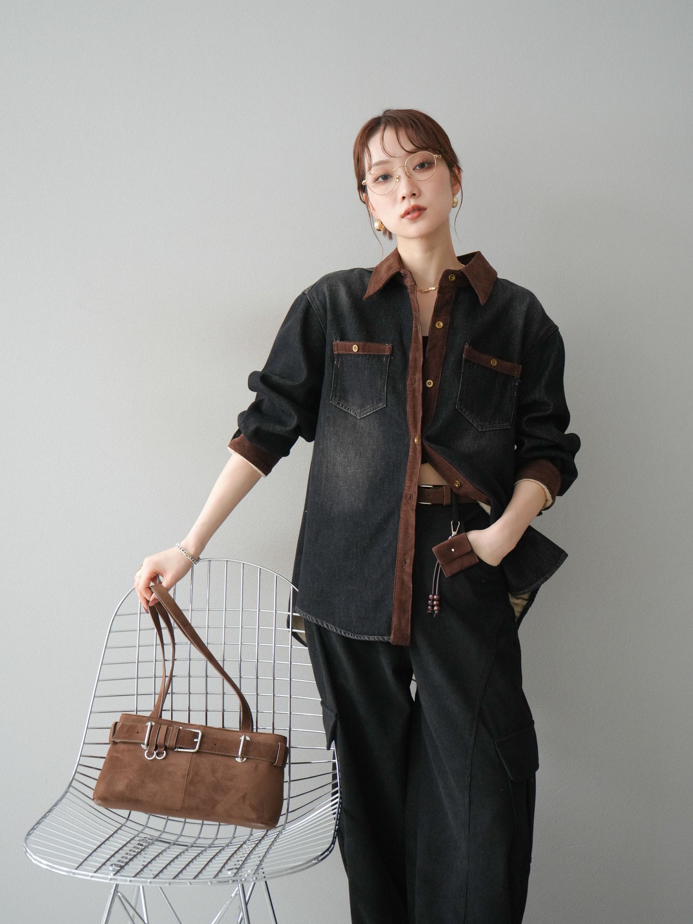 シーズンムード漂う、裏起毛仕様のデニムシャツジャケット。 コーデュロイ素材の襟と前立てがアクセントとなり、カジュアルながらも上品な印象に仕上げました。 程よい厚みとふんわりとした裏起毛で暖かく、アウターとしてもシャツ感覚でも着られる万能アイテム。 ゆったりとしたシルエットで重ね着しやすく、デイリーに活躍します。 デニムの風合いとコーデュロイの異素材ミックスがこなれ感を演出し、どんなコーデにも馴染む1着です。 ※ボトムス、キャミソール(インナー)以外の商品は一律でインナーは付属していません。