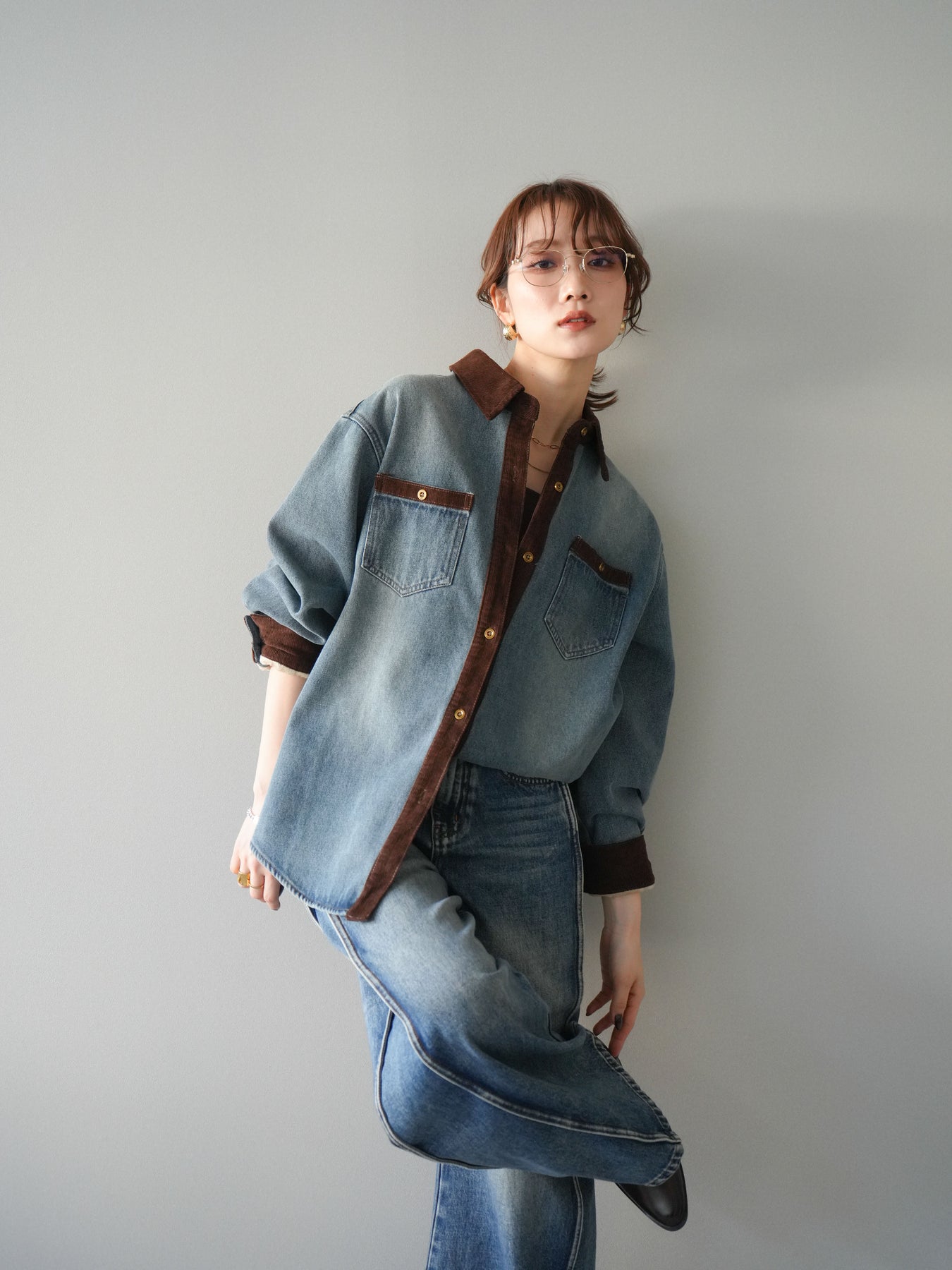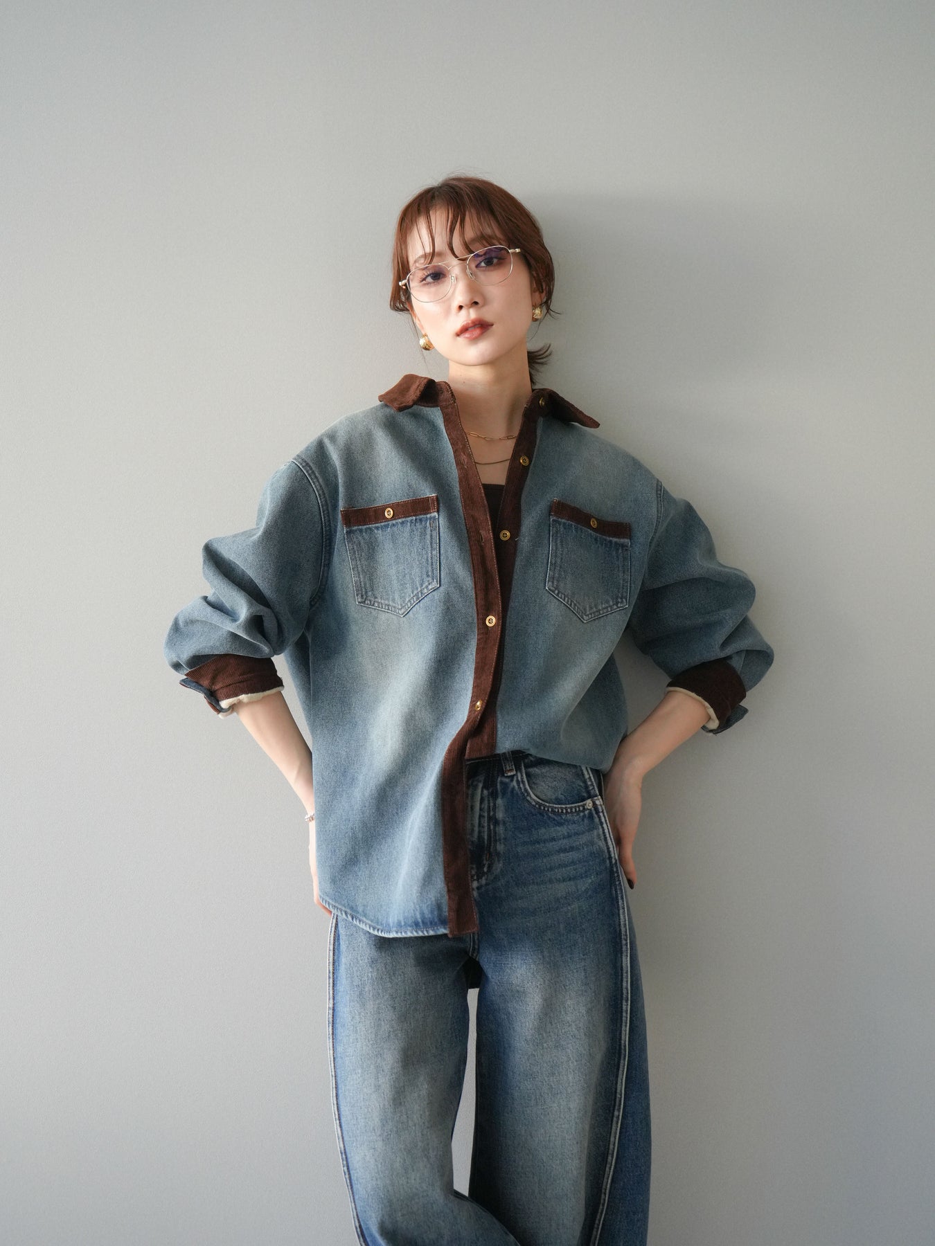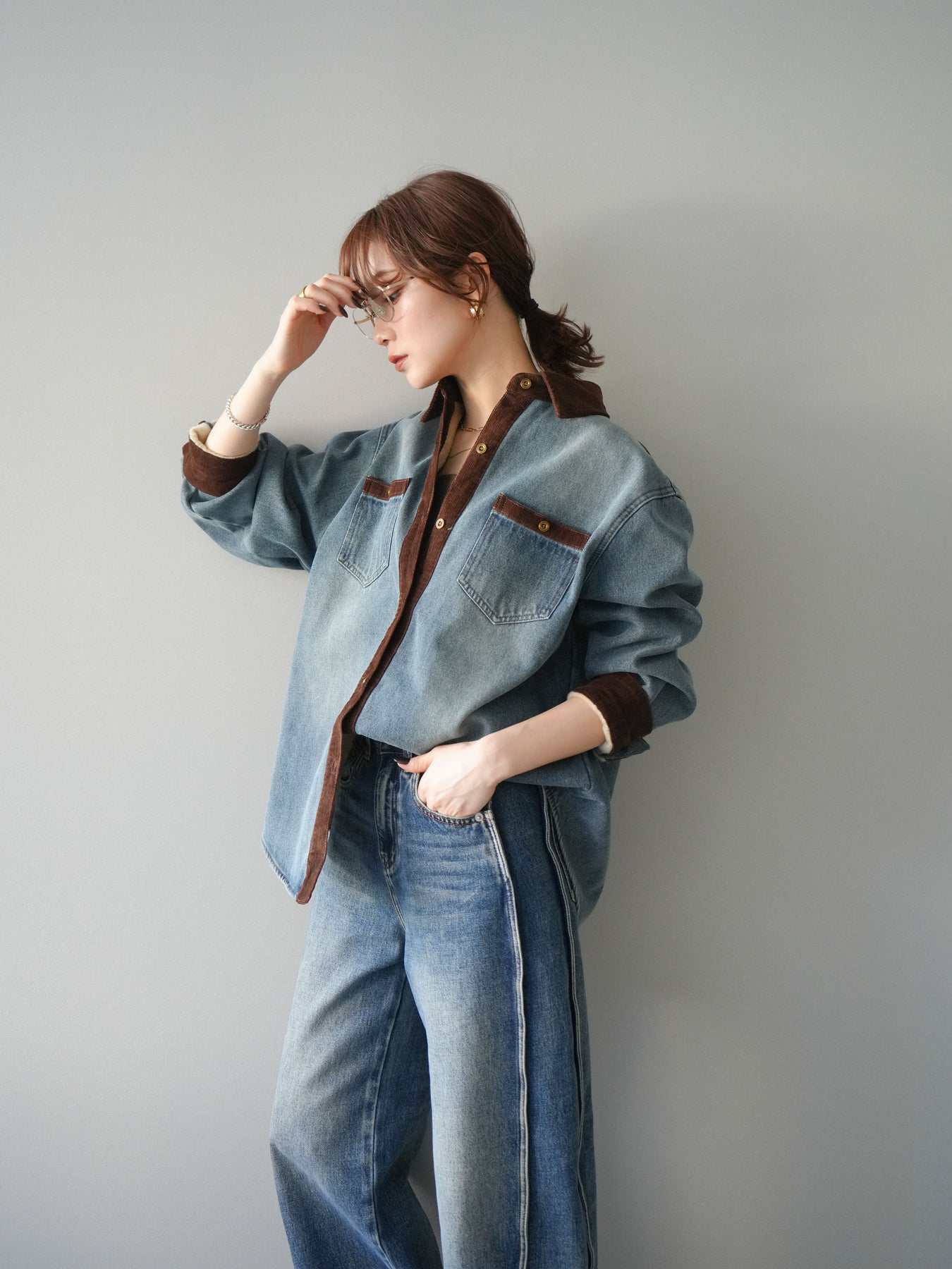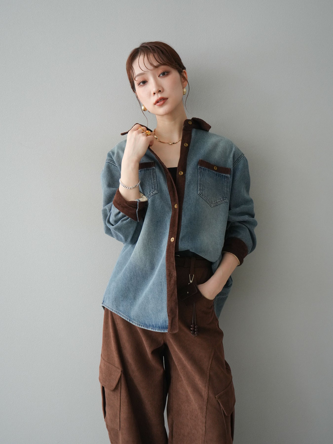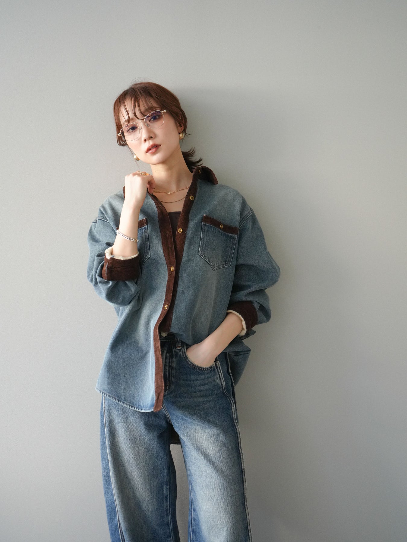 シーズンムード漂う、裏起毛仕様のデニムシャツジャケット。 コーデュロイ素材の襟と前立てがアクセントとなり、カジュアルながらも上品な印象に仕上げました。 程よい厚みとふんわりとした裏起毛で暖かく、アウターとしてもシャツ感覚でも着られる万能アイテム。 ゆったりとしたシルエットで重ね着しやすく、デイリーに活躍します。 デニムの風合いとコーデュロイの異素材ミックスがこなれ感を演出し、どんなコーデにも馴染む1着です。 ※ボトムス、キャミソール(インナー)以外の商品は一律でインナーは付属していません。