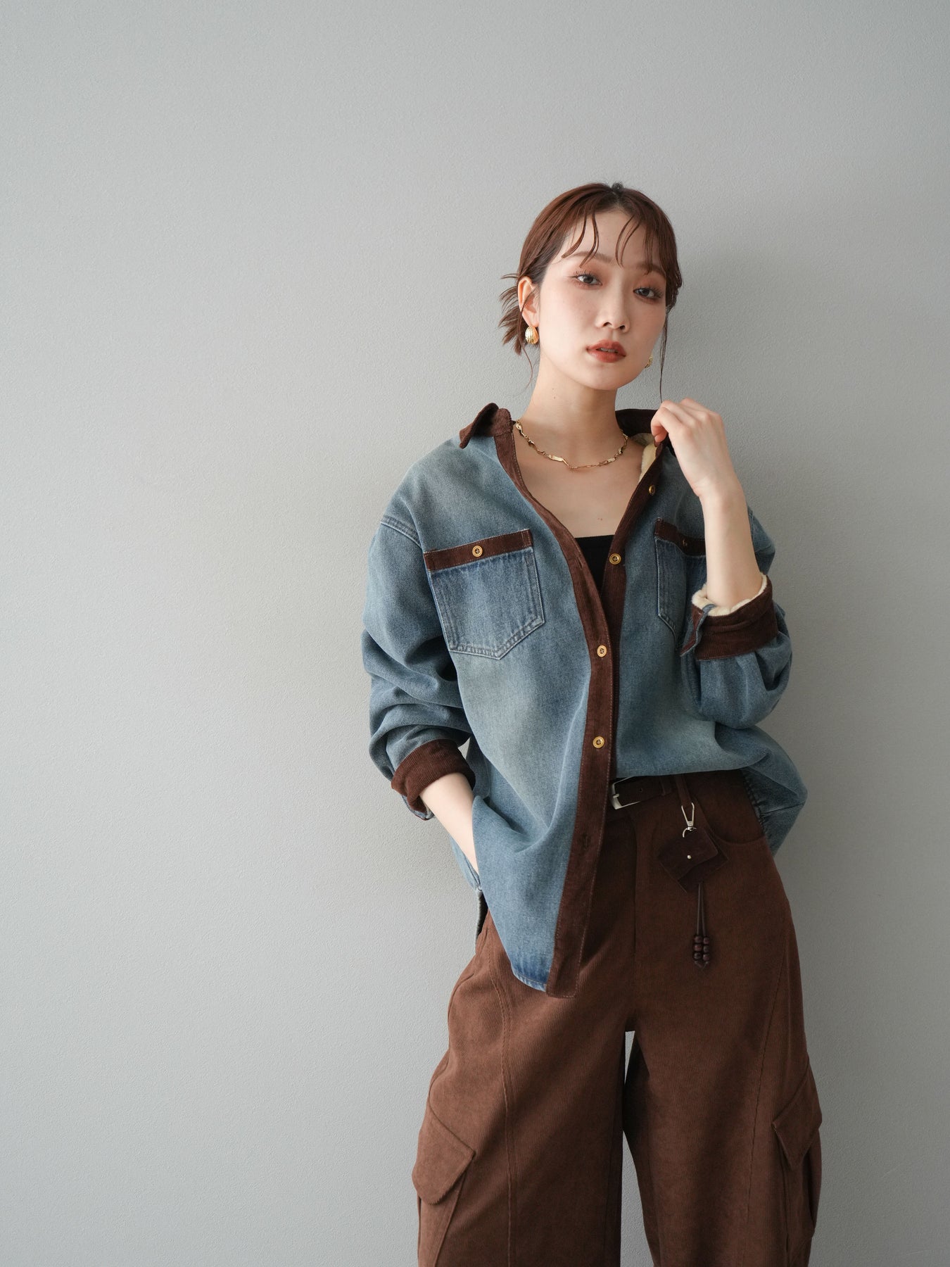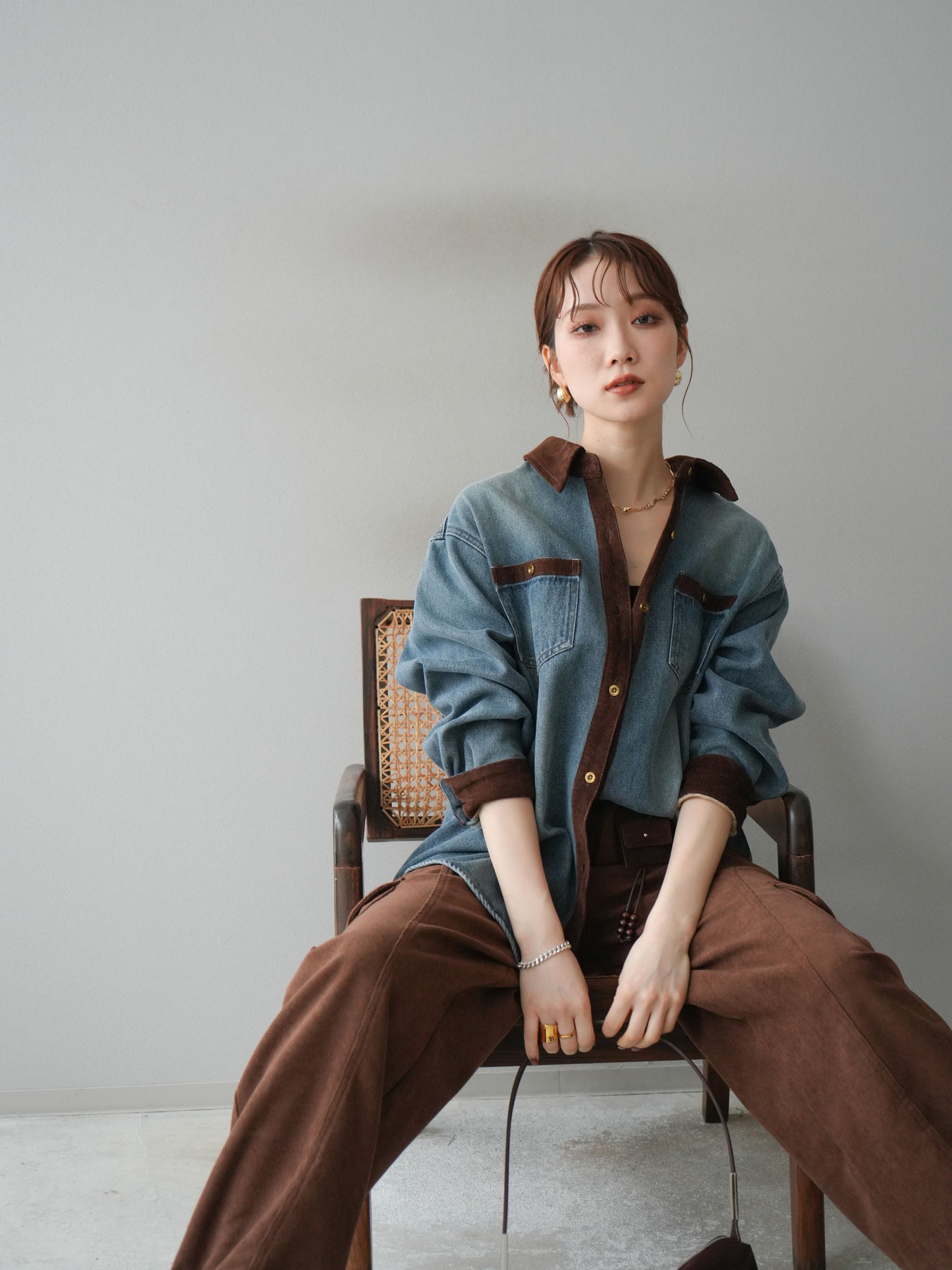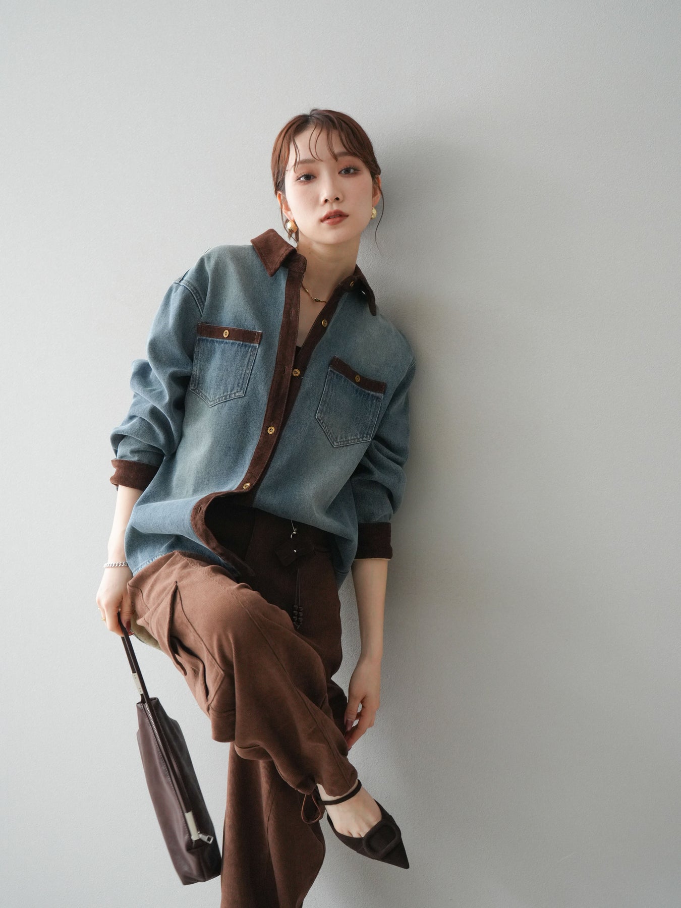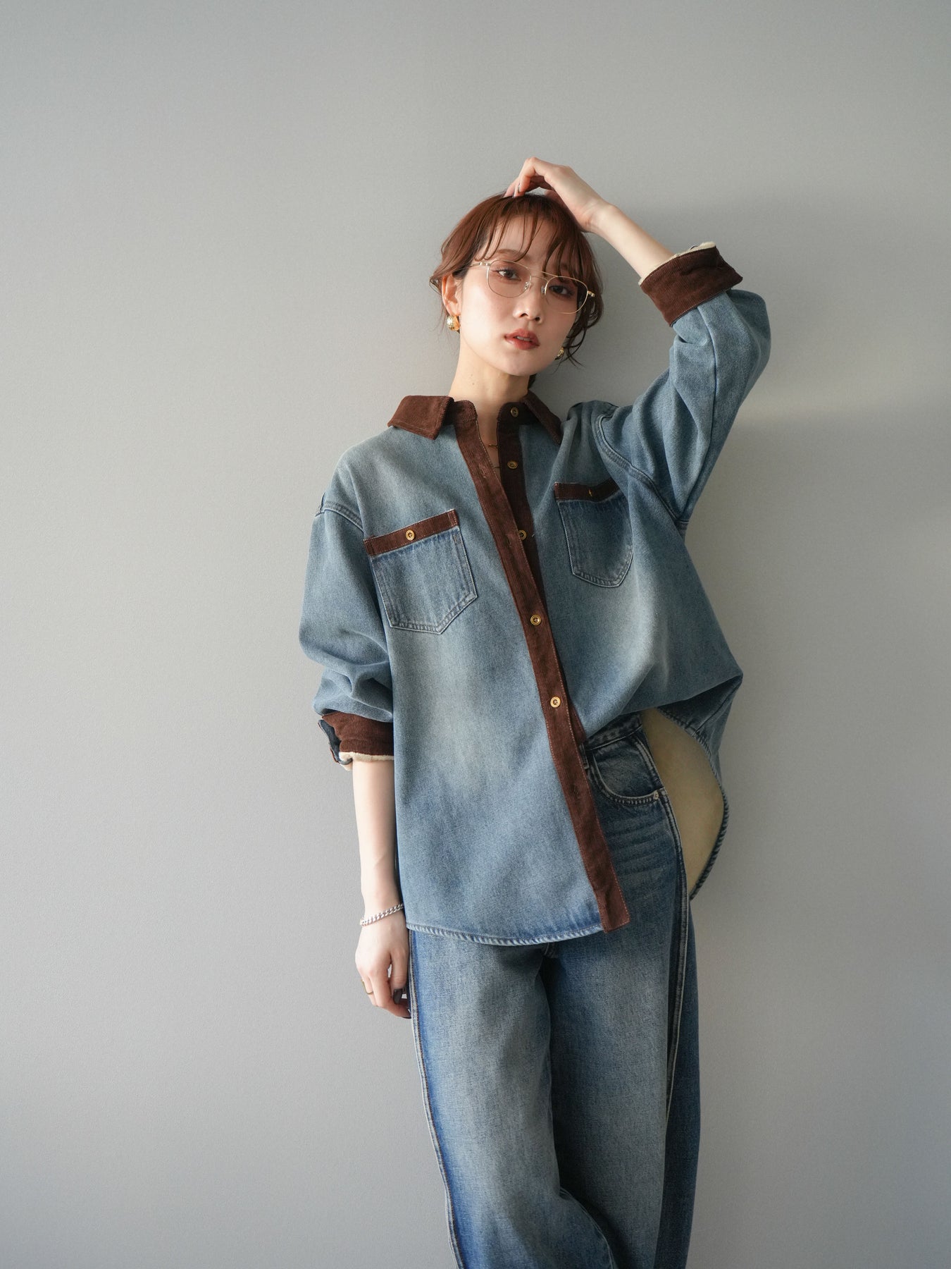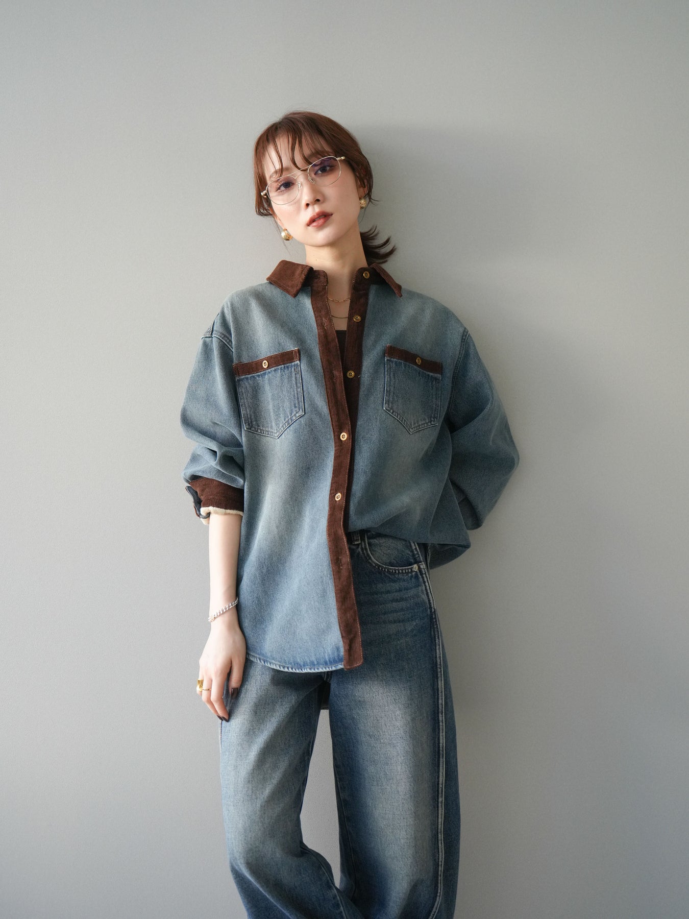 シーズンムード漂う、裏起毛仕様のデニムシャツジャケット。 コーデュロイ素材の襟と前立てがアクセントとなり、カジュアルながらも上品な印象に仕上げました。 程よい厚みとふんわりとした裏起毛で暖かく、アウターとしてもシャツ感覚でも着られる万能アイテム。 ゆったりとしたシルエットで重ね着しやすく、デイリーに活躍します。 デニムの風合いとコーデュロイの異素材ミックスがこなれ感を演出し、どんなコーデにも馴染む1着です。 ※ボトムス、キャミソール(インナー)以外の商品は一律でインナーは付属していません。