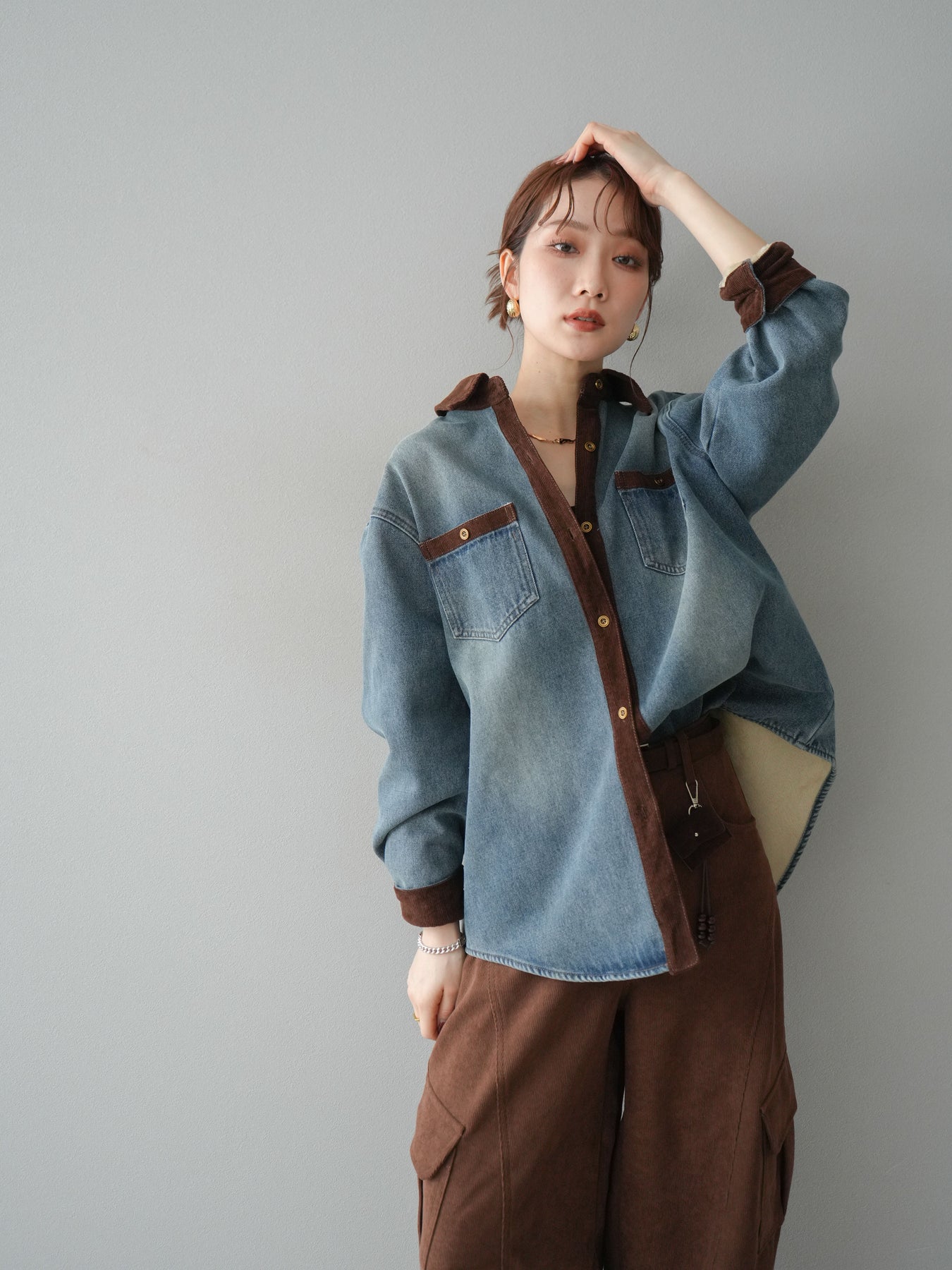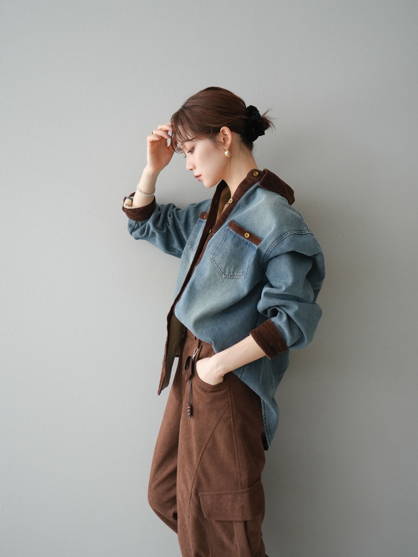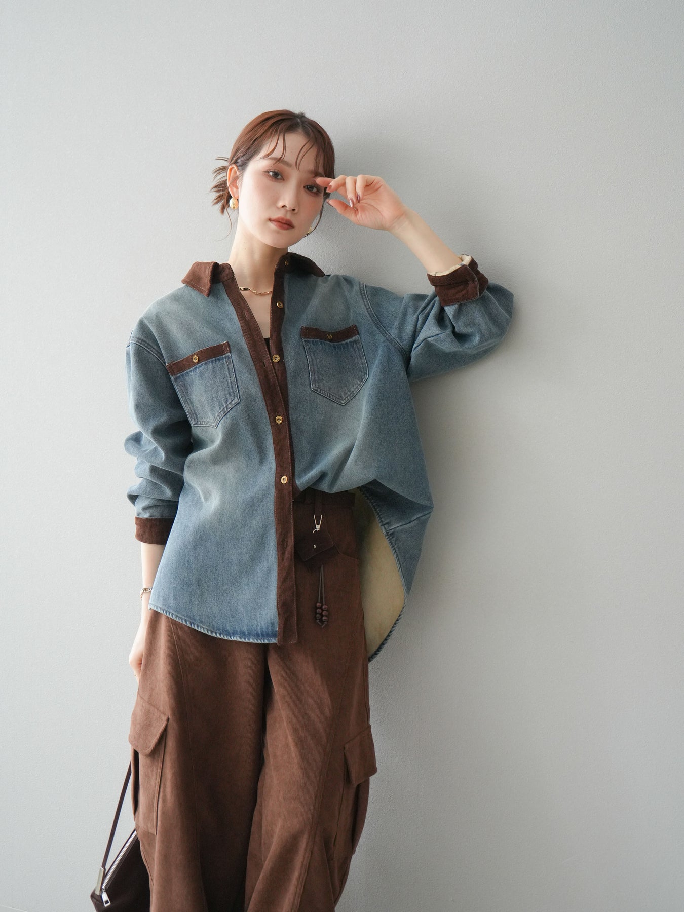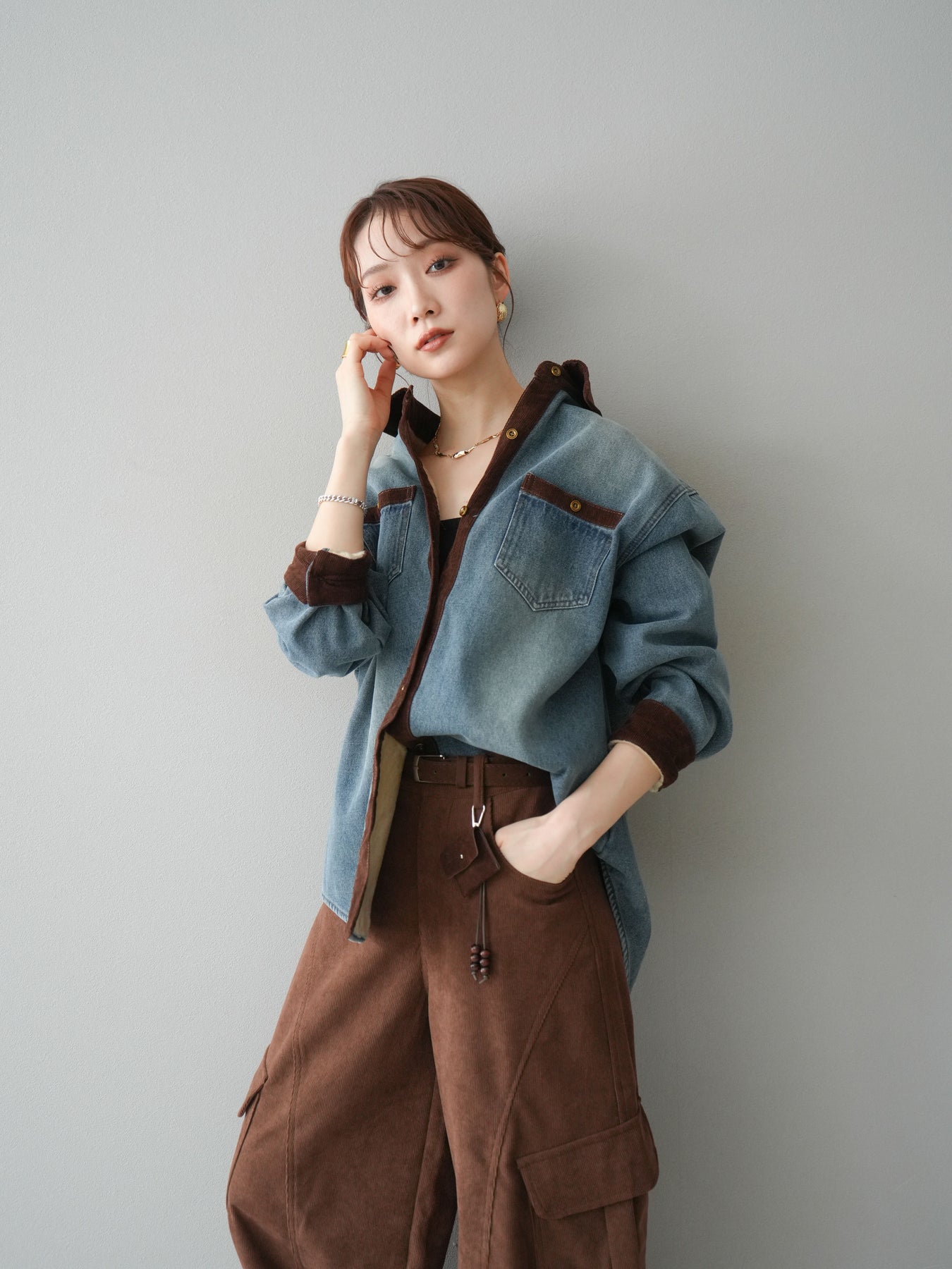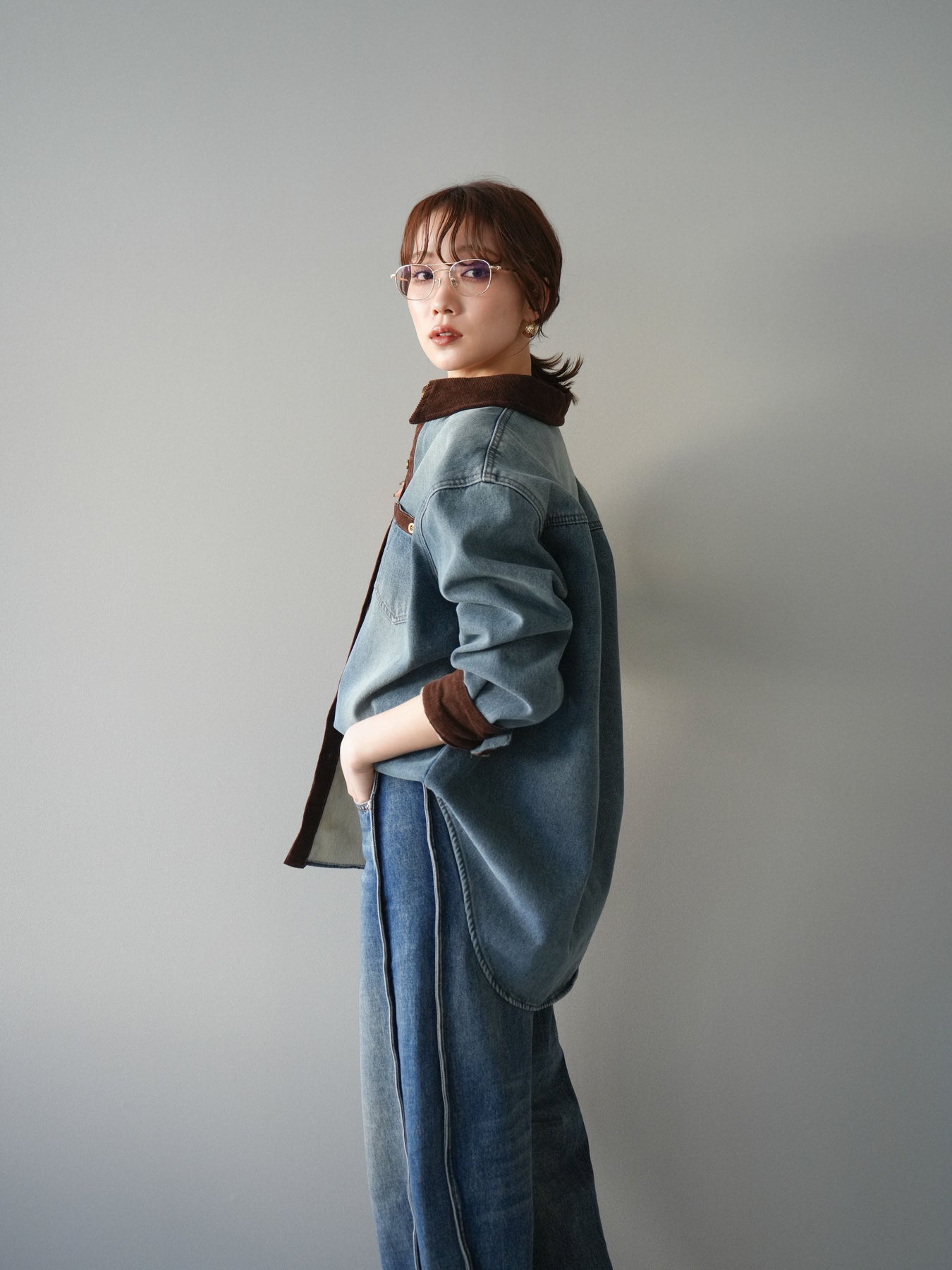 シーズンムード漂う、裏起毛仕様のデニムシャツジャケット。 コーデュロイ素材の襟と前立てがアクセントとなり、カジュアルながらも上品な印象に仕上げました。 程よい厚みとふんわりとした裏起毛で暖かく、アウターとしてもシャツ感覚でも着られる万能アイテム。 ゆったりとしたシルエットで重ね着しやすく、デイリーに活躍します。 デニムの風合いとコーデュロイの異素材ミックスがこなれ感を演出し、どんなコーデにも馴染む1着です。 ※ボトムス、キャミソール(インナー)以外の商品は一律でインナーは付属していません。