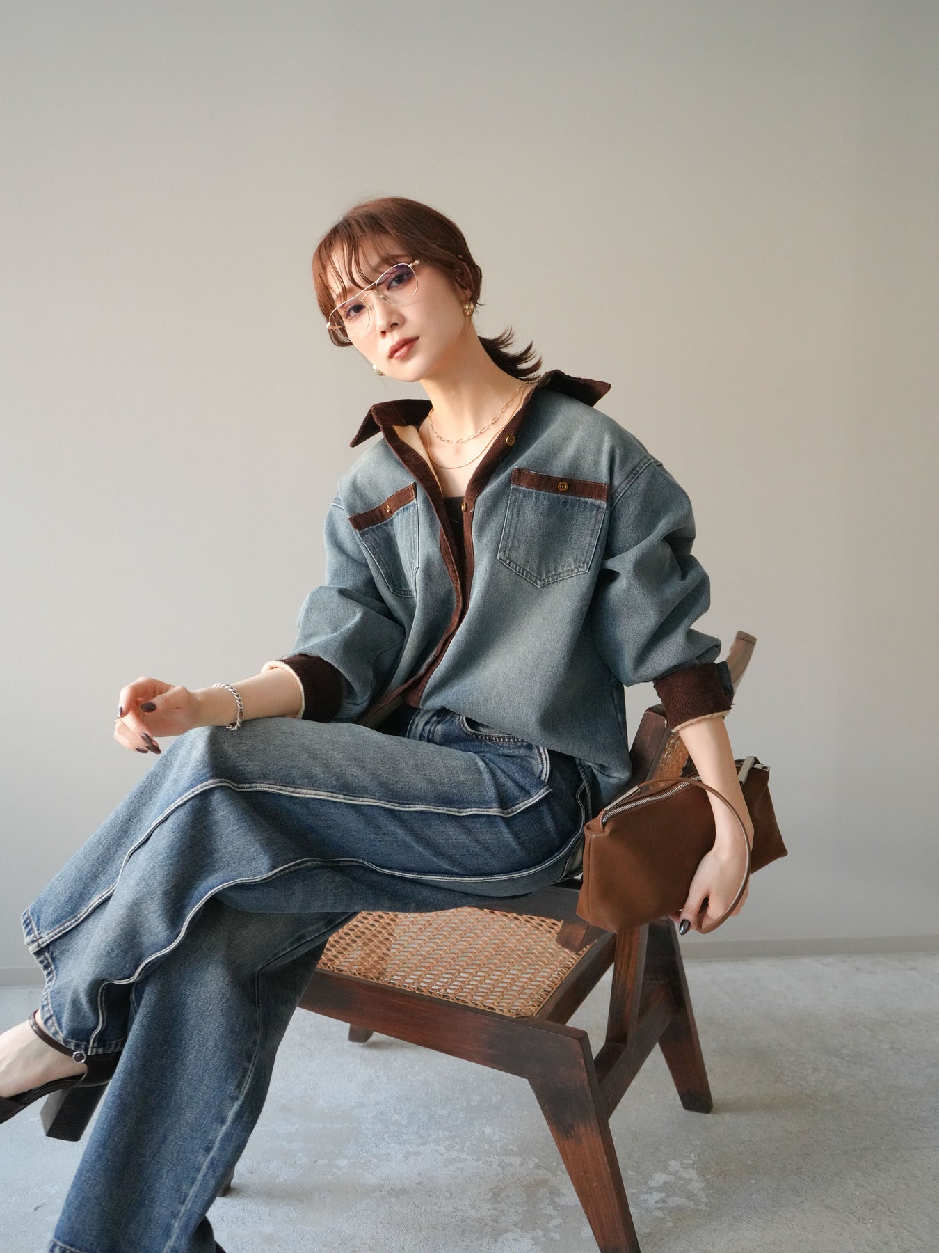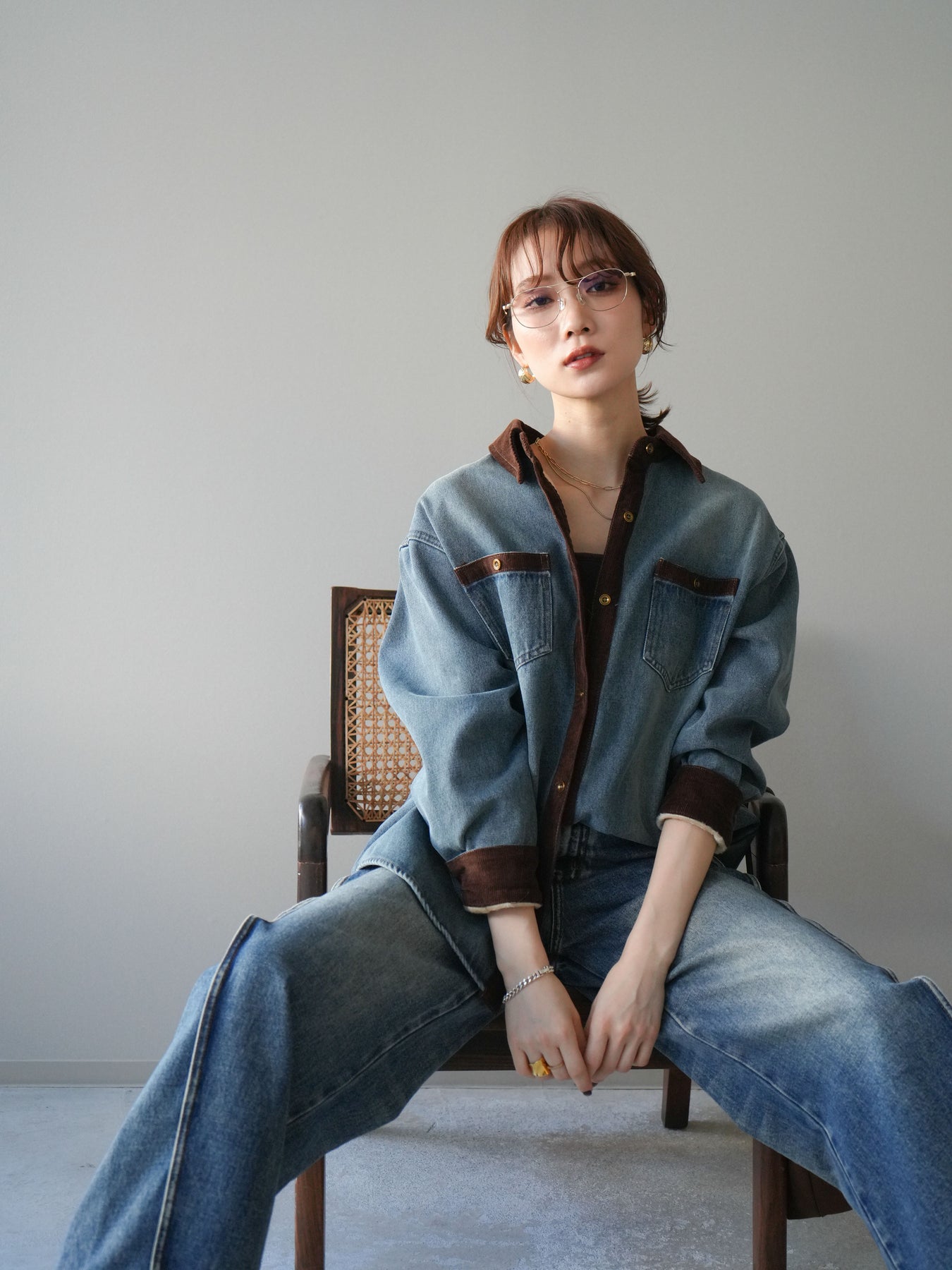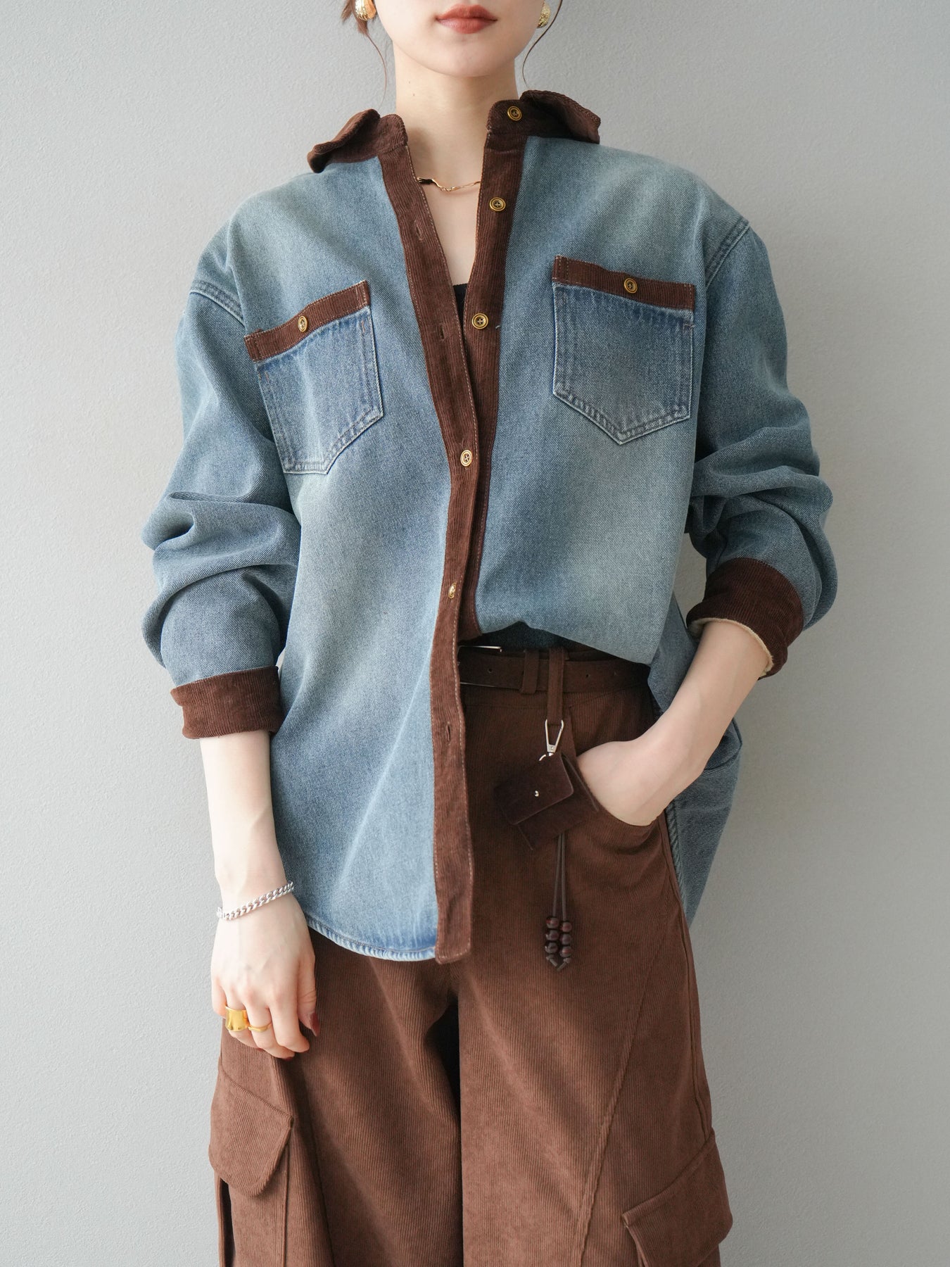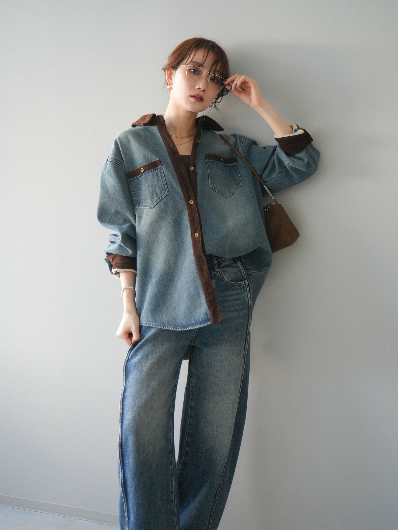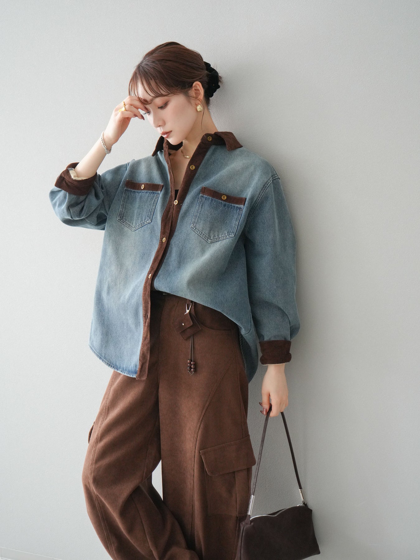 シーズンムード漂う、裏起毛仕様のデニムシャツジャケット。 コーデュロイ素材の襟と前立てがアクセントとなり、カジュアルながらも上品な印象に仕上げました。 程よい厚みとふんわりとした裏起毛で暖かく、アウターとしてもシャツ感覚でも着られる万能アイテム。 ゆったりとしたシルエットで重ね着しやすく、デイリーに活躍します。 デニムの風合いとコーデュロイの異素材ミックスがこなれ感を演出し、どんなコーデにも馴染む1着です。 ※ボトムス、キャミソール(インナー)以外の商品は一律でインナーは付属していません。