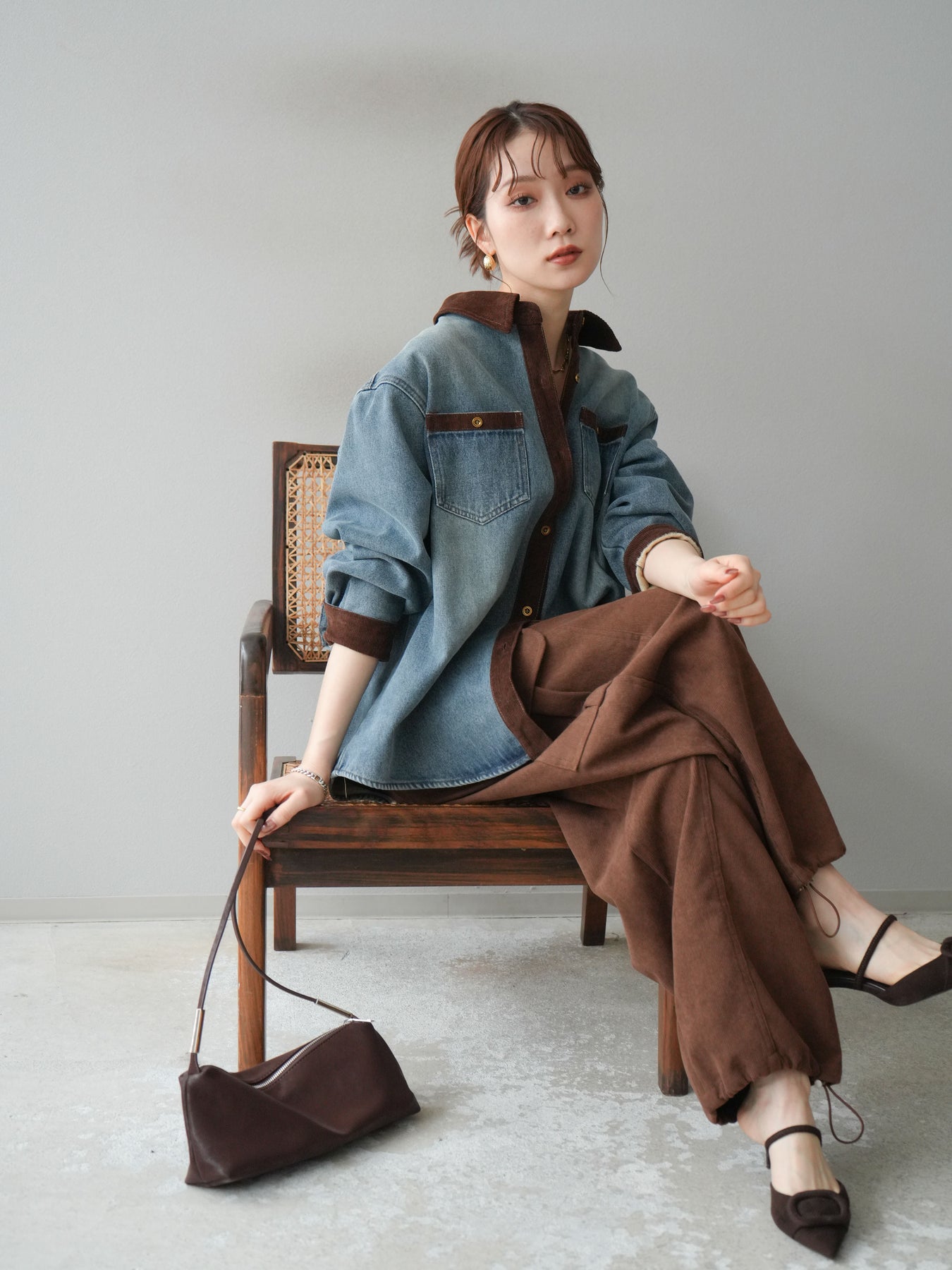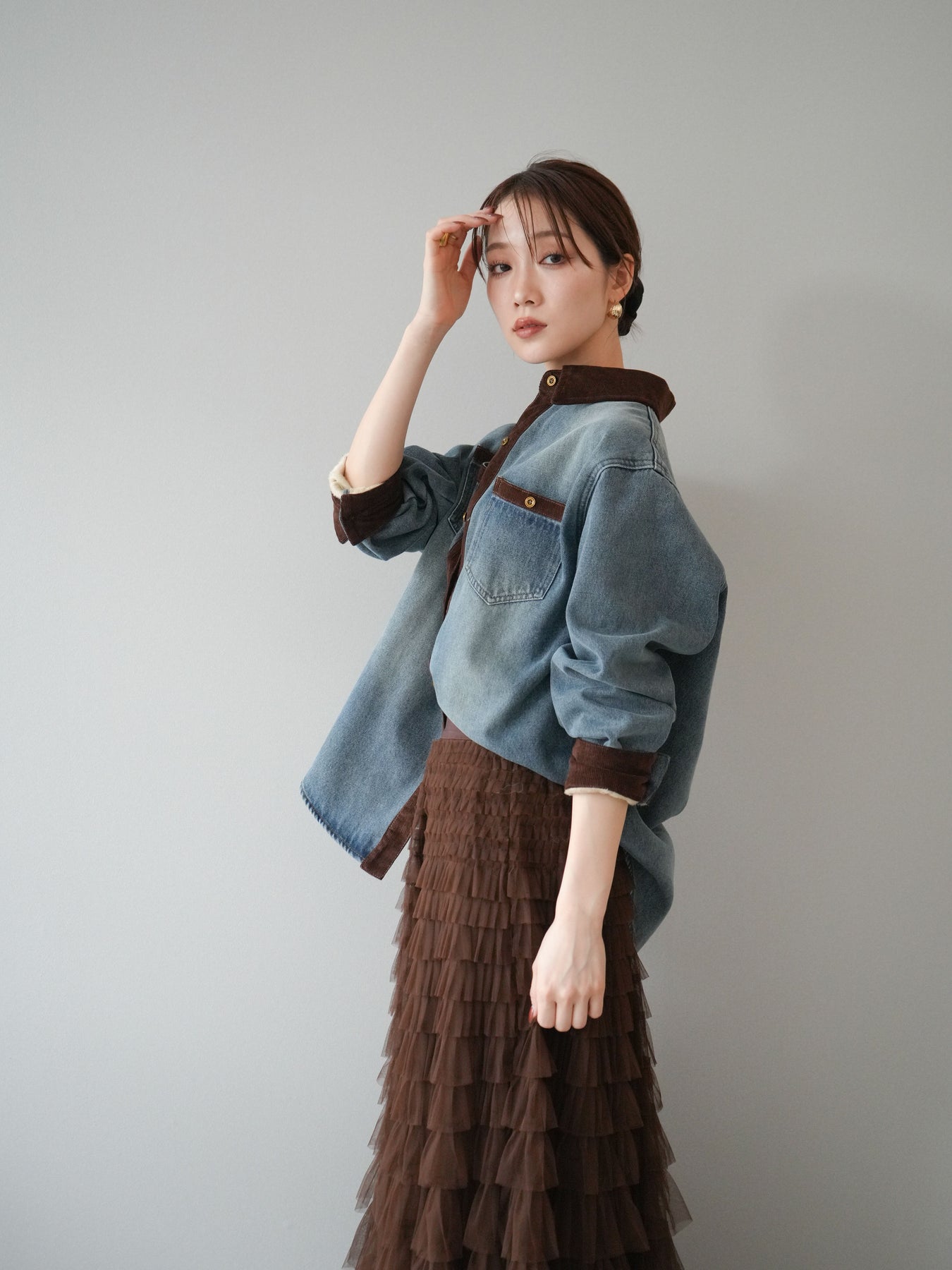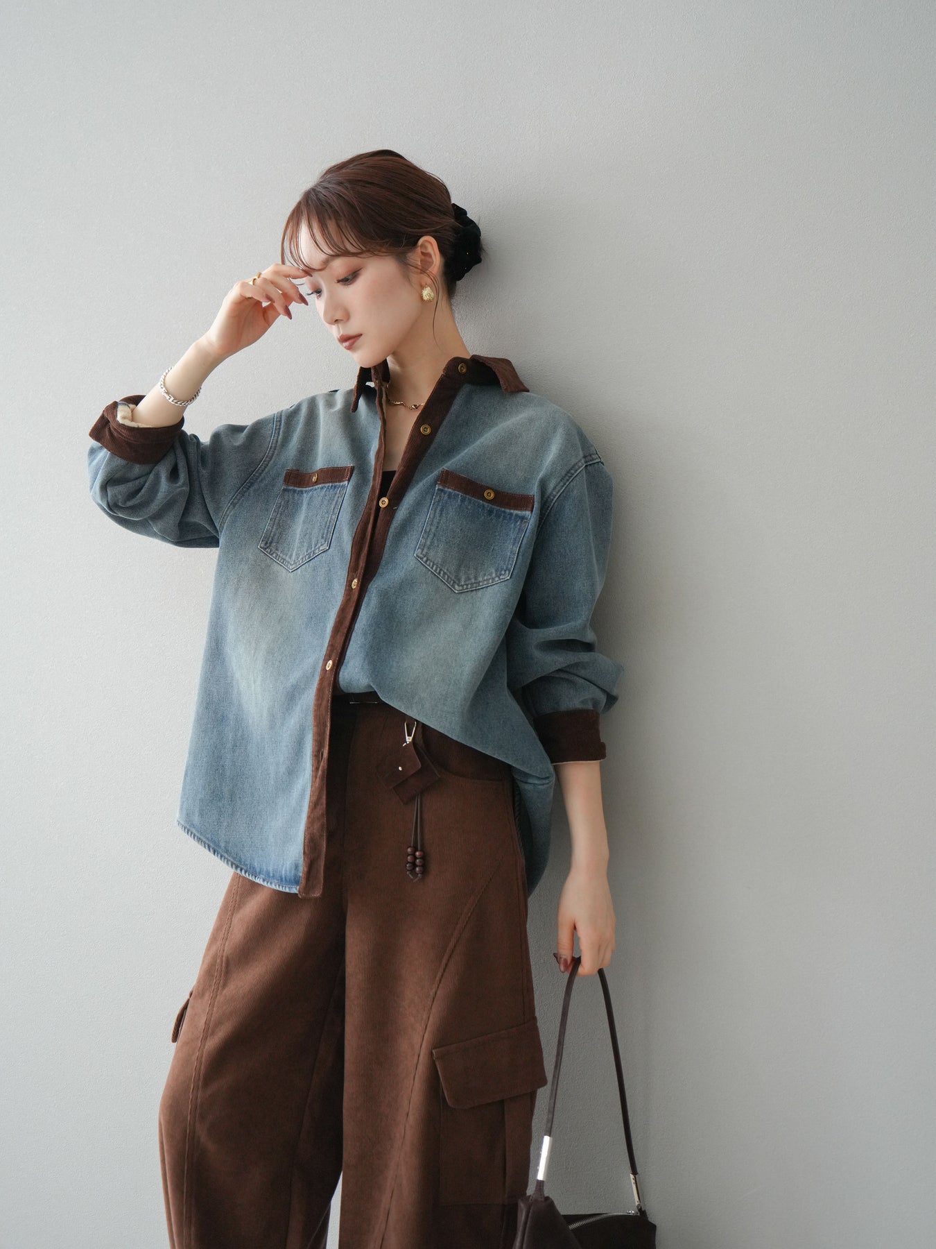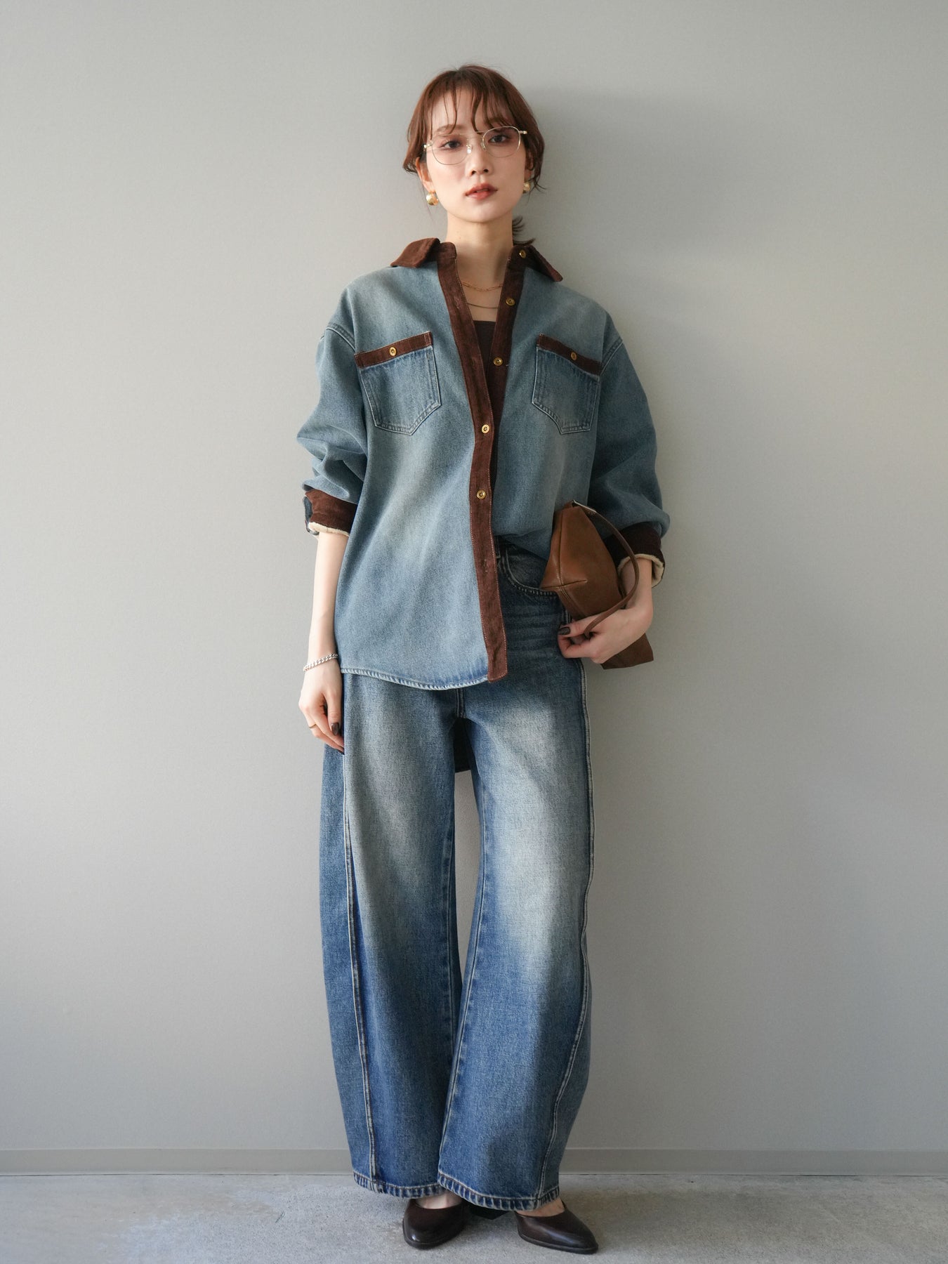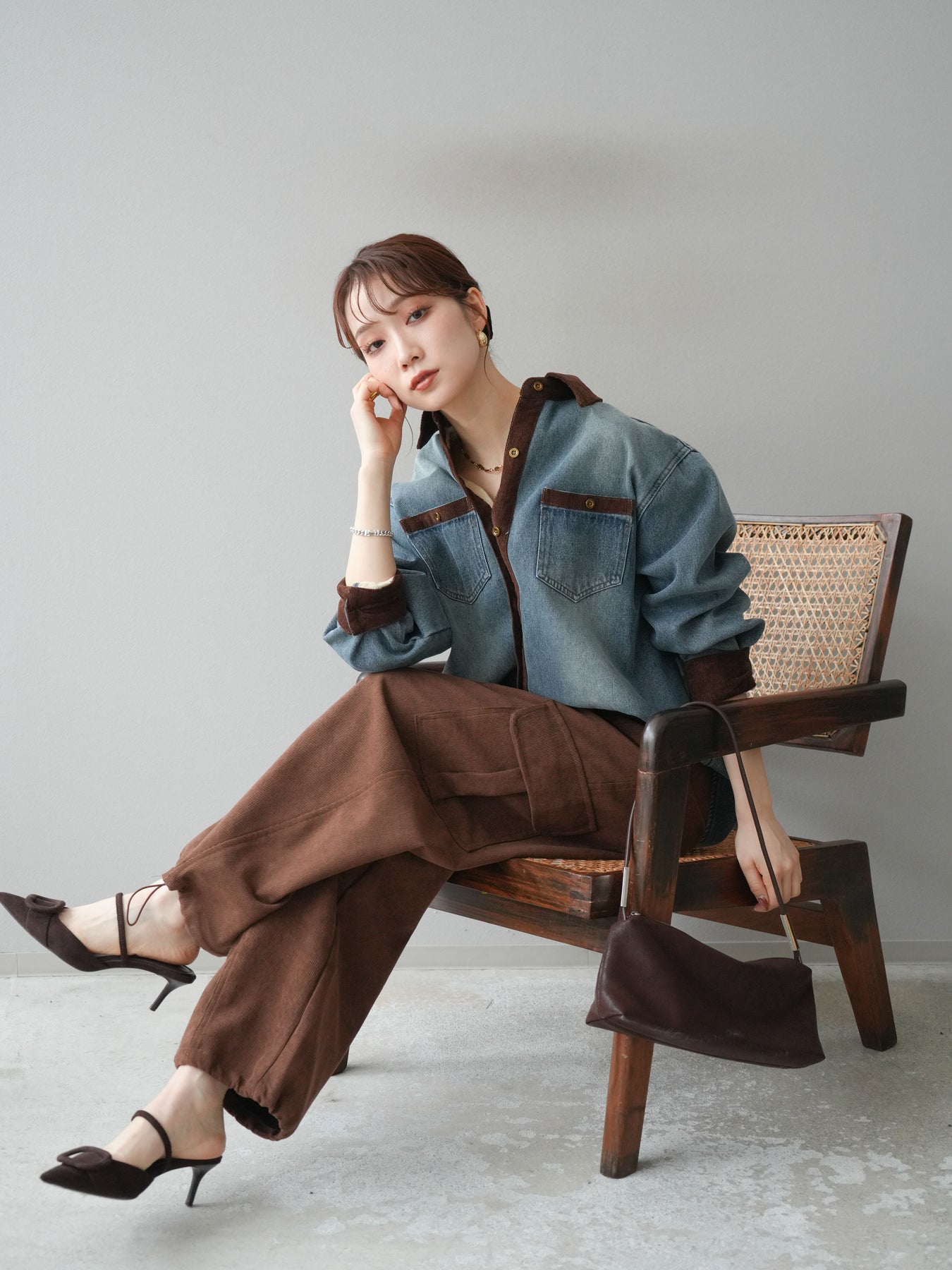 シーズンムード漂う、裏起毛仕様のデニムシャツジャケット。 コーデュロイ素材の襟と前立てがアクセントとなり、カジュアルながらも上品な印象に仕上げました。 程よい厚みとふんわりとした裏起毛で暖かく、アウターとしてもシャツ感覚でも着られる万能アイテム。 ゆったりとしたシルエットで重ね着しやすく、デイリーに活躍します。 デニムの風合いとコーデュロイの異素材ミックスがこなれ感を演出し、どんなコーデにも馴染む1着です。 ※ボトムス、キャミソール(インナー)以外の商品は一律でインナーは付属していません。