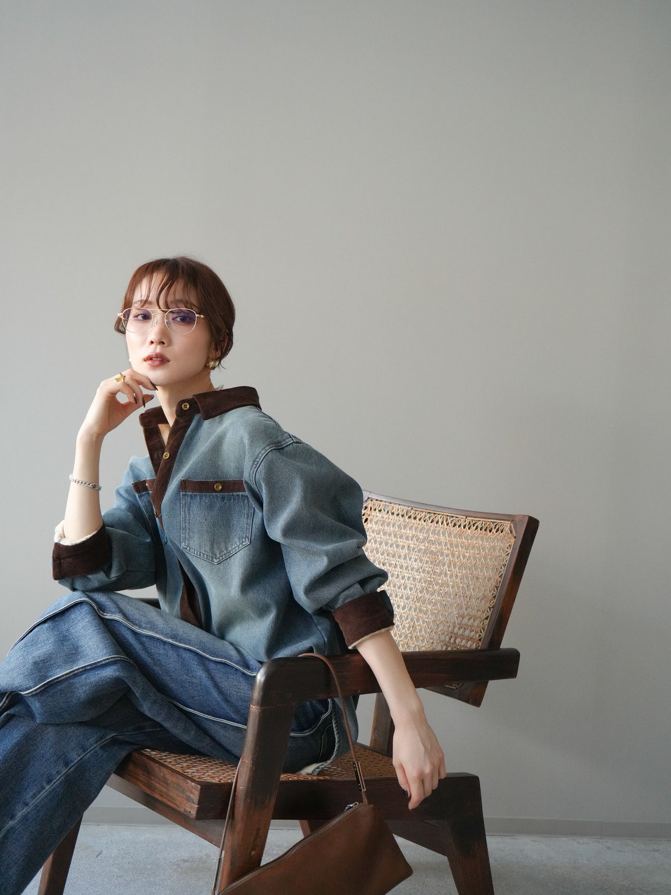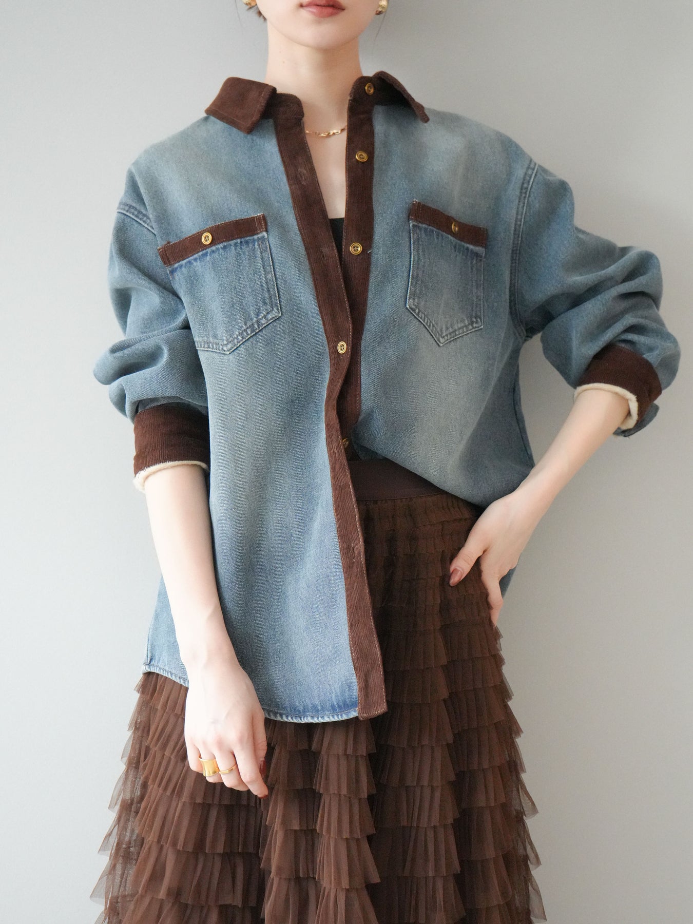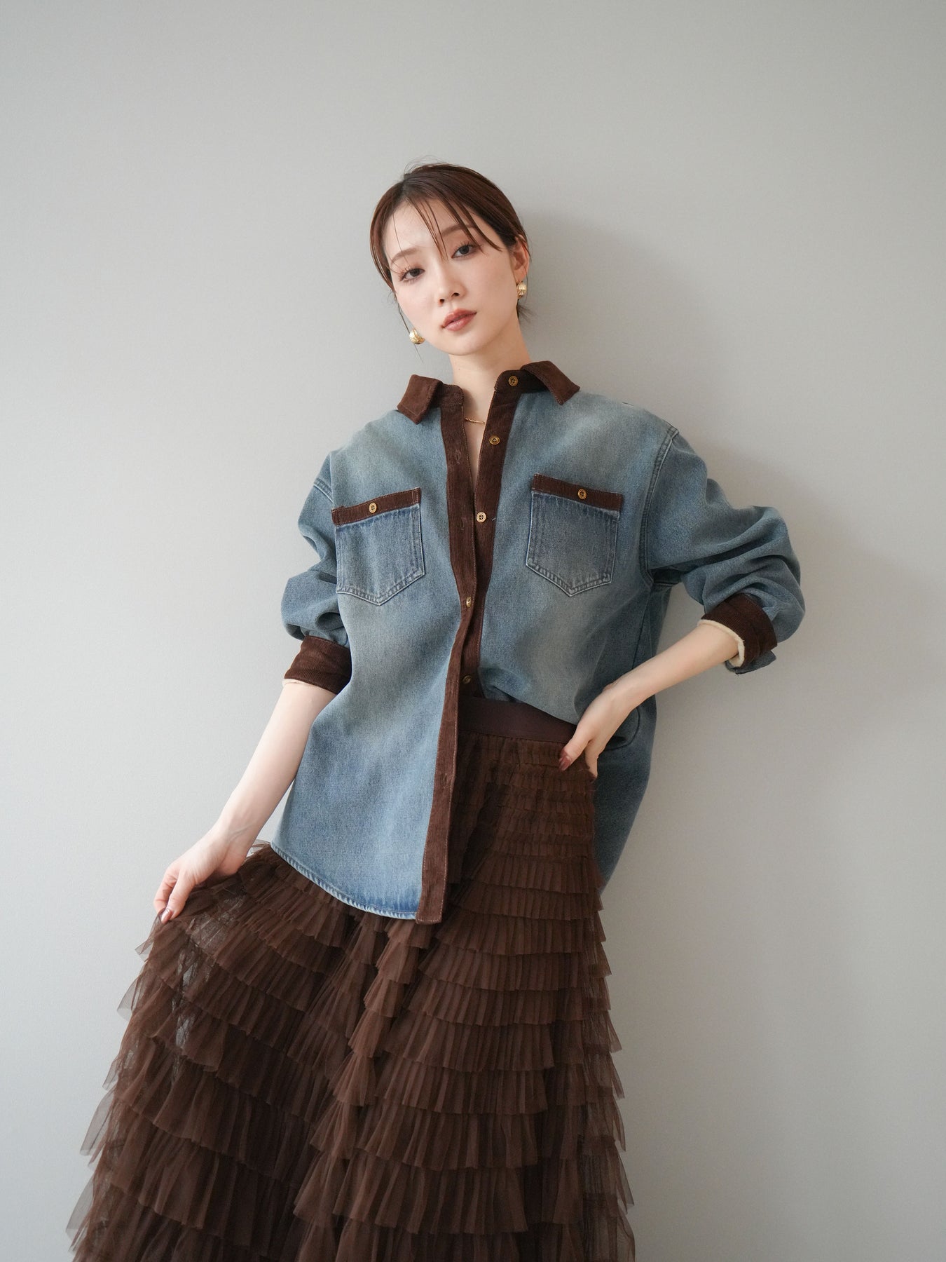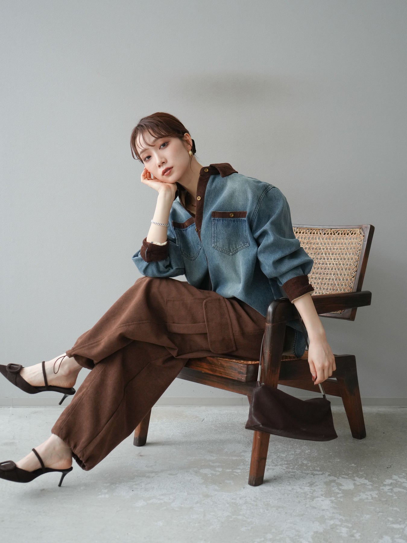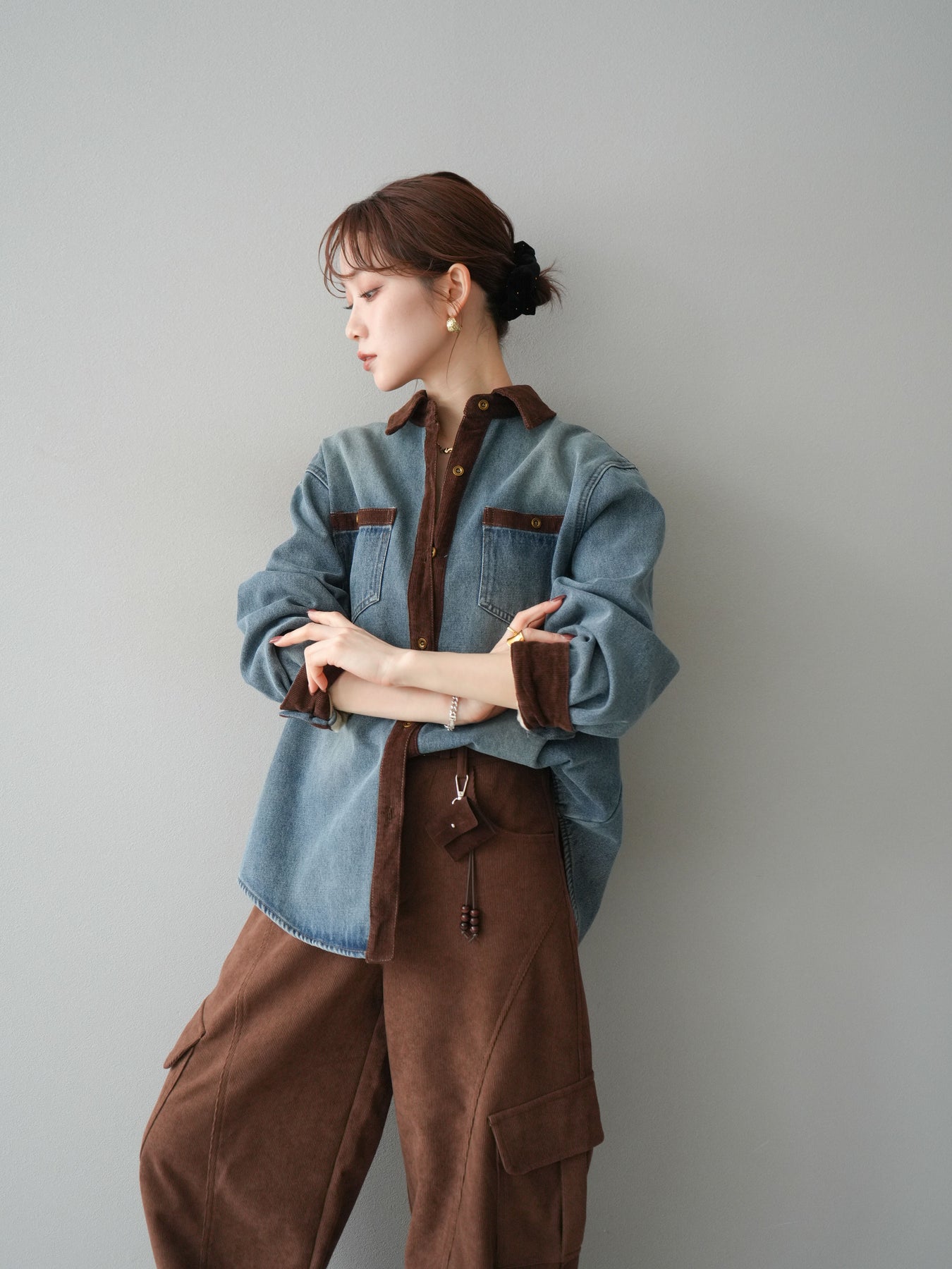 シーズンムード漂う、裏起毛仕様のデニムシャツジャケット。 コーデュロイ素材の襟と前立てがアクセントとなり、カジュアルながらも上品な印象に仕上げました。 程よい厚みとふんわりとした裏起毛で暖かく、アウターとしてもシャツ感覚でも着られる万能アイテム。 ゆったりとしたシルエットで重ね着しやすく、デイリーに活躍します。 デニムの風合いとコーデュロイの異素材ミックスがこなれ感を演出し、どんなコーデにも馴染む1着です。 ※ボトムス、キャミソール(インナー)以外の商品は一律でインナーは付属していません。