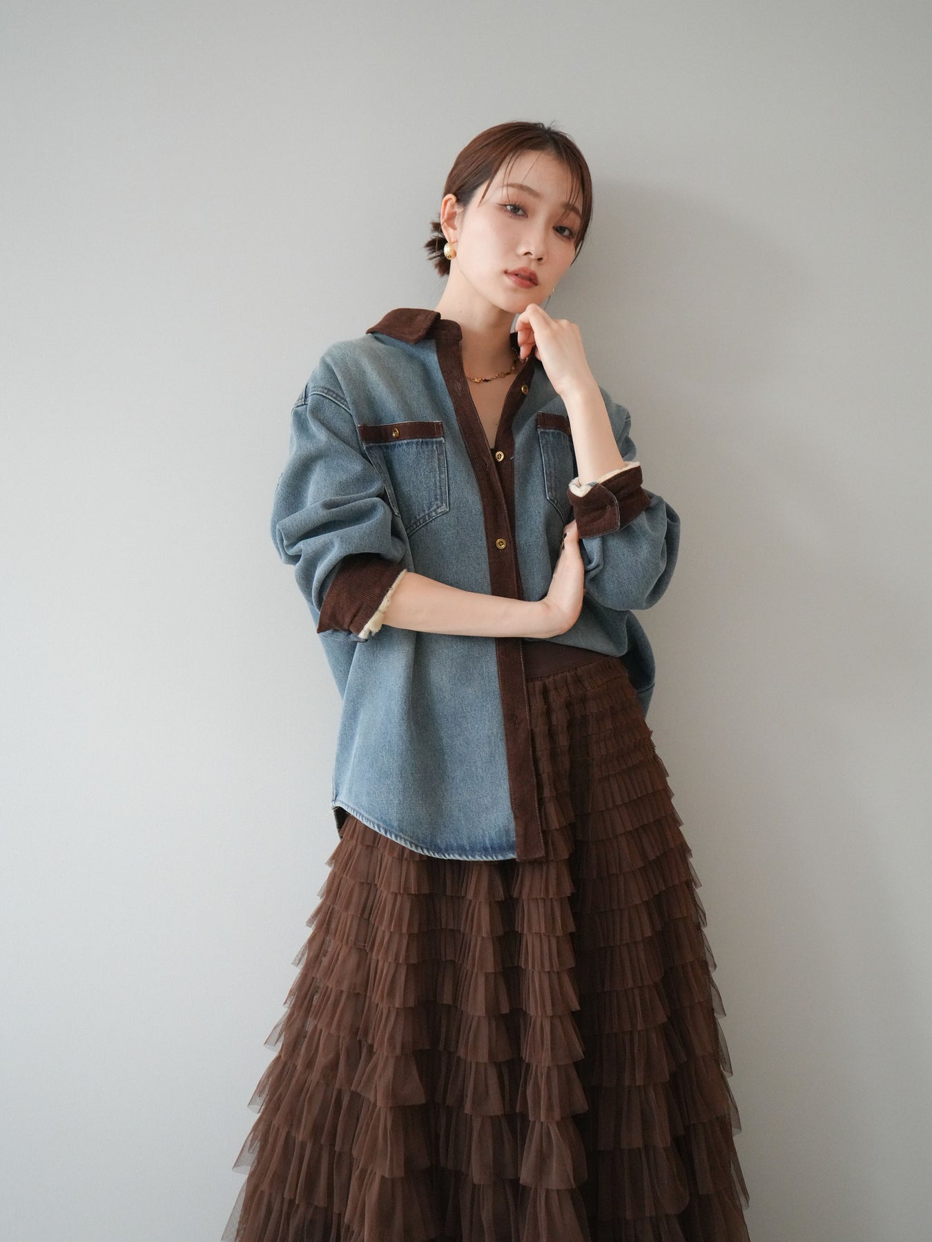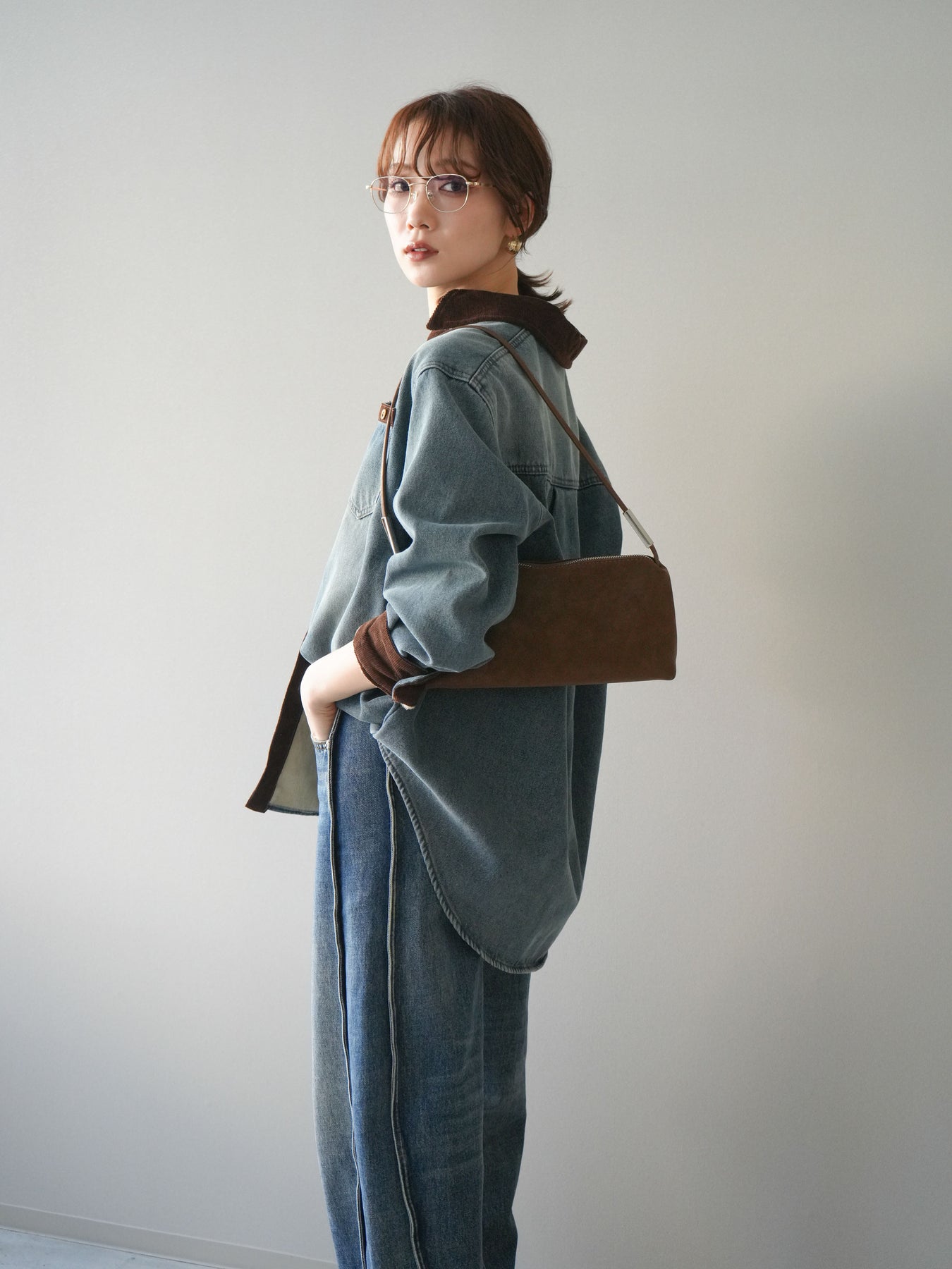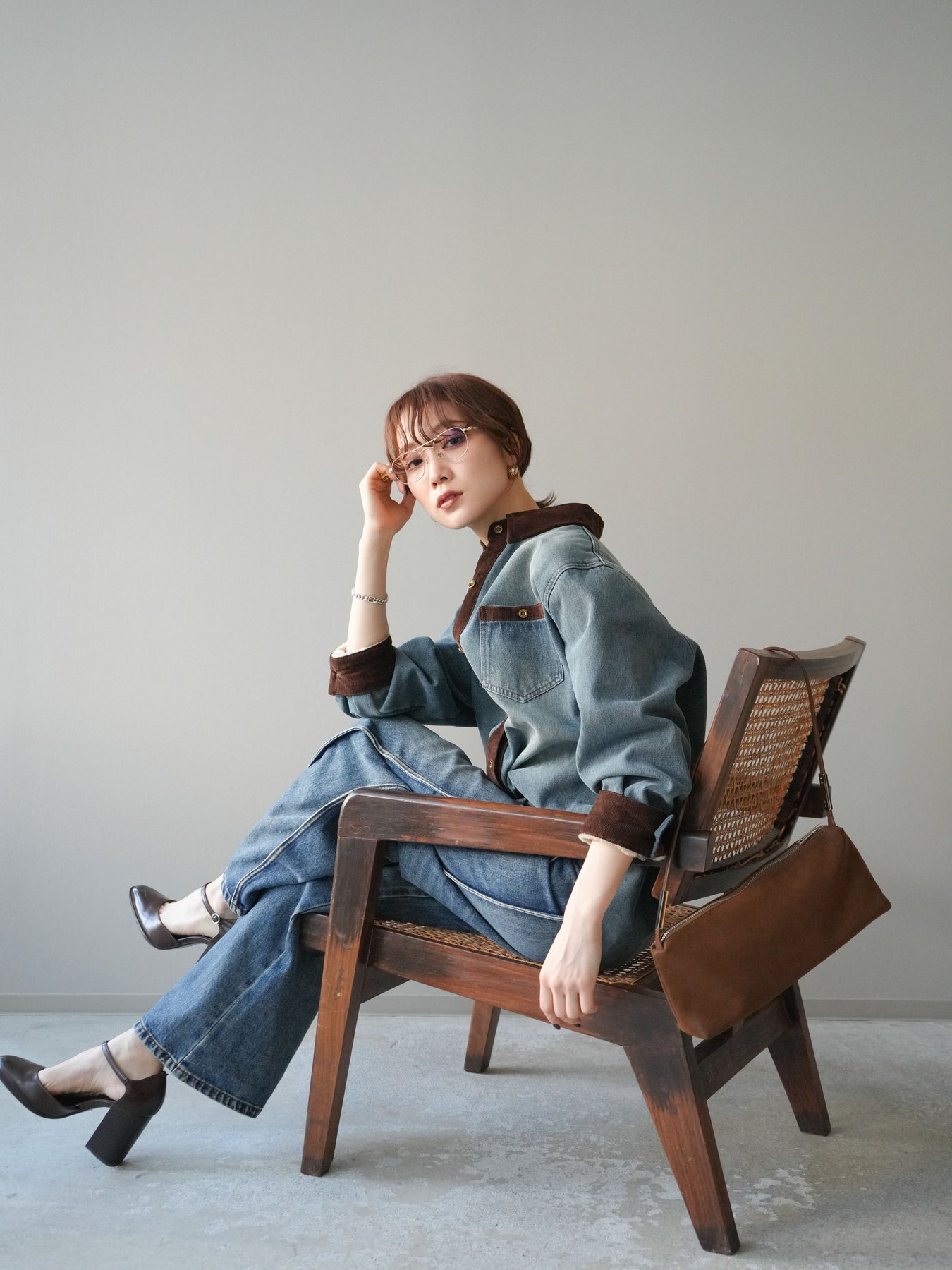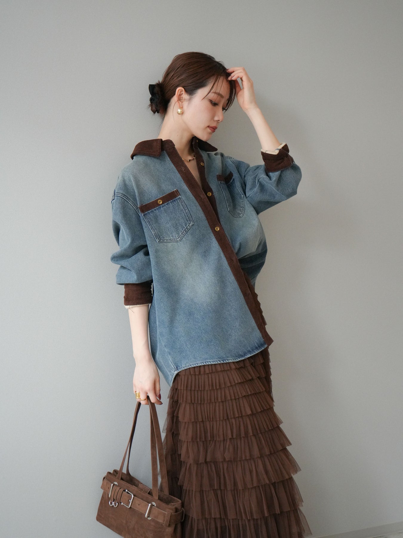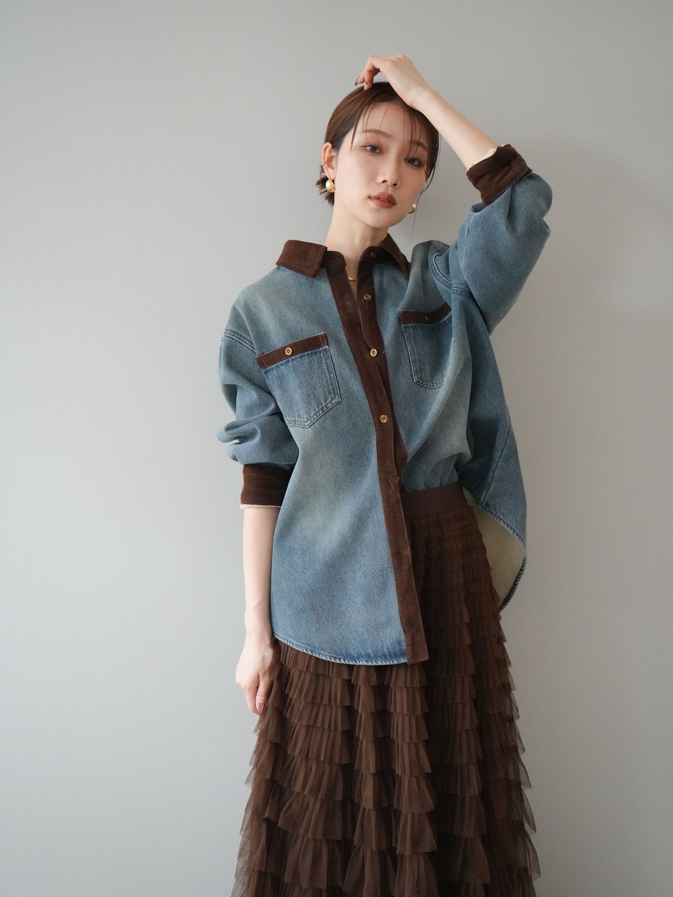 シーズンムード漂う、裏起毛仕様のデニムシャツジャケット。 コーデュロイ素材の襟と前立てがアクセントとなり、カジュアルながらも上品な印象に仕上げました。 程よい厚みとふんわりとした裏起毛で暖かく、アウターとしてもシャツ感覚でも着られる万能アイテム。 ゆったりとしたシルエットで重ね着しやすく、デイリーに活躍します。 デニムの風合いとコーデュロイの異素材ミックスがこなれ感を演出し、どんなコーデにも馴染む1着です。 ※ボトムス、キャミソール(インナー)以外の商品は一律でインナーは付属していません。