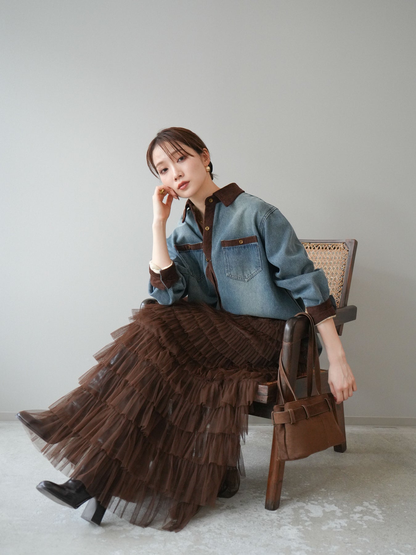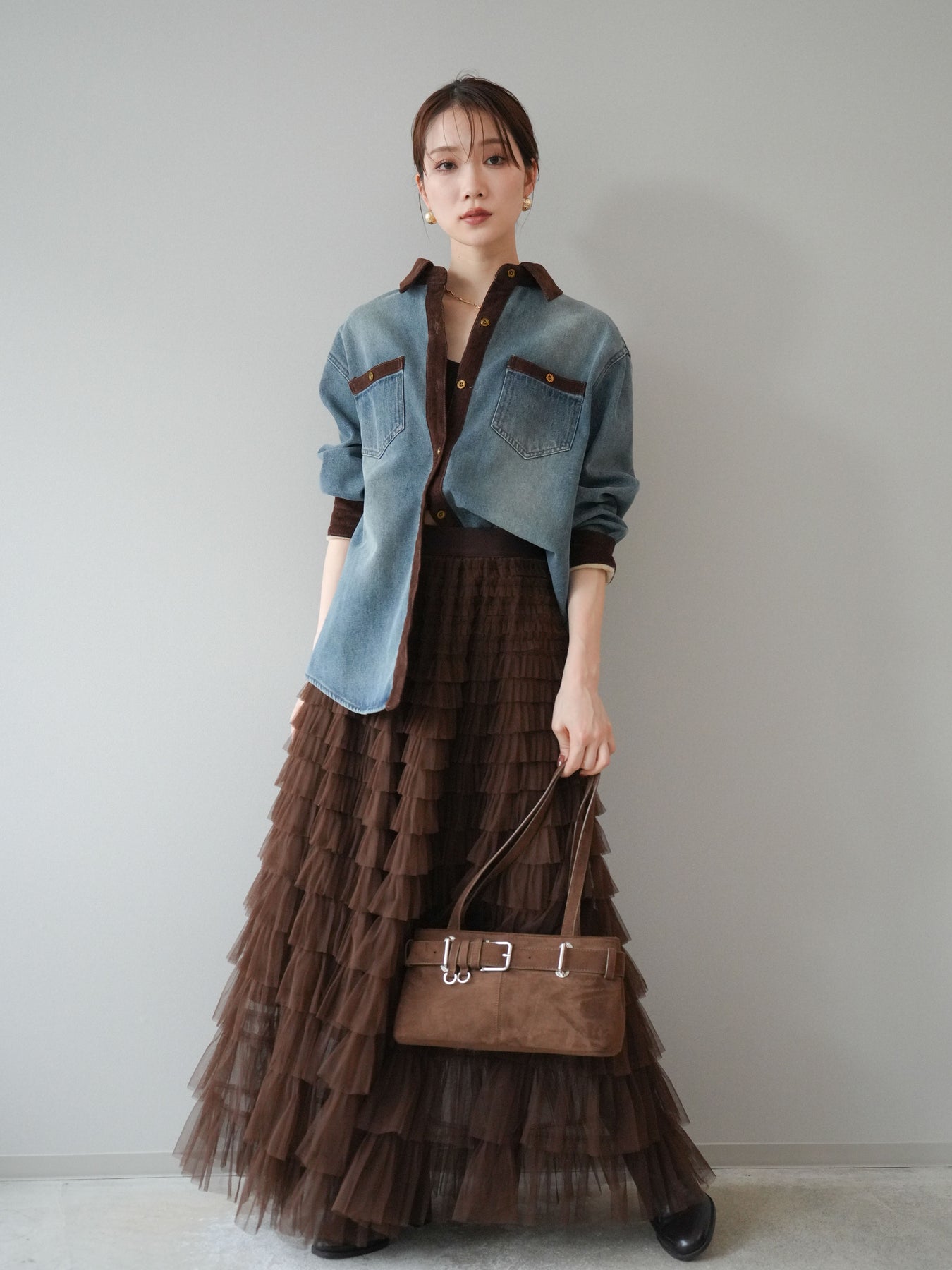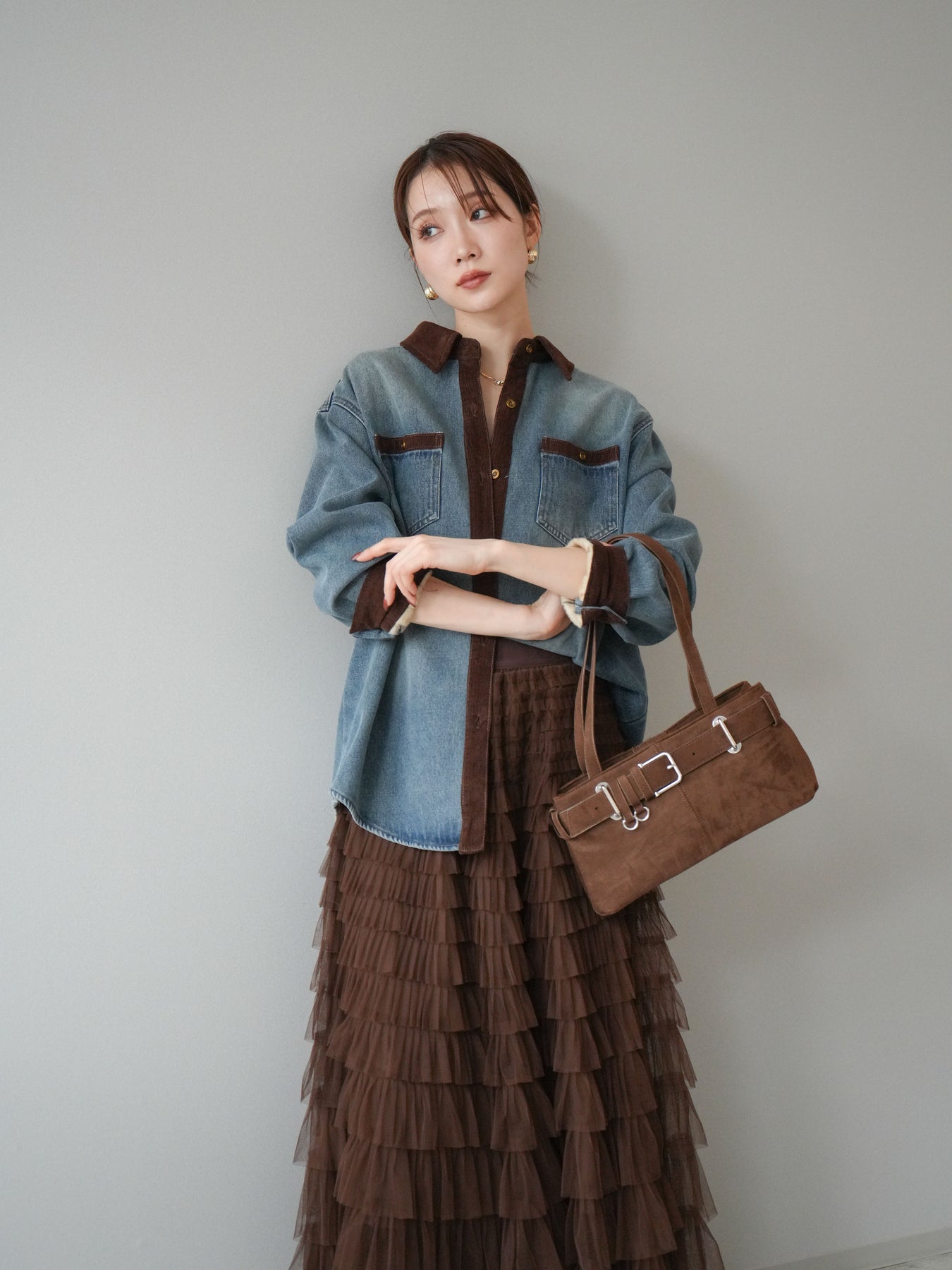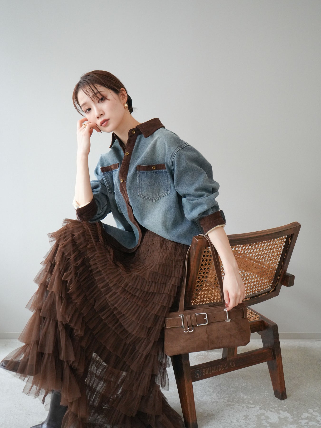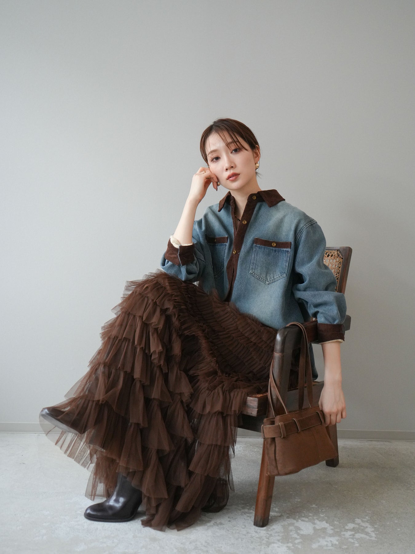 シーズンムード漂う、裏起毛仕様のデニムシャツジャケット。 コーデュロイ素材の襟と前立てがアクセントとなり、カジュアルながらも上品な印象に仕上げました。 程よい厚みとふんわりとした裏起毛で暖かく、アウターとしてもシャツ感覚でも着られる万能アイテム。 ゆったりとしたシルエットで重ね着しやすく、デイリーに活躍します。 デニムの風合いとコーデュロイの異素材ミックスがこなれ感を演出し、どんなコーデにも馴染む1着です。 ※ボトムス、キャミソール(インナー)以外の商品は一律でインナーは付属していません。