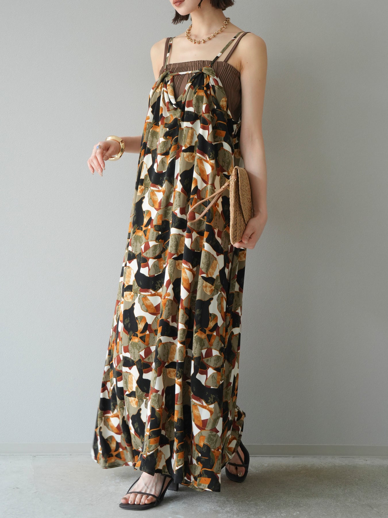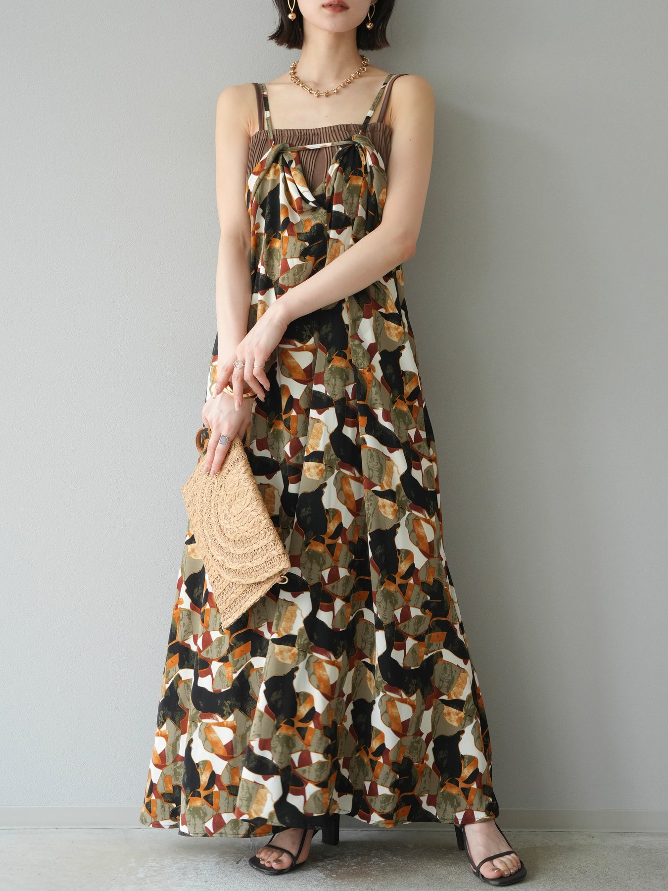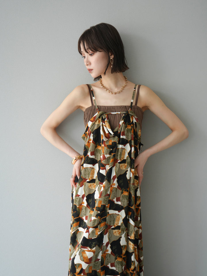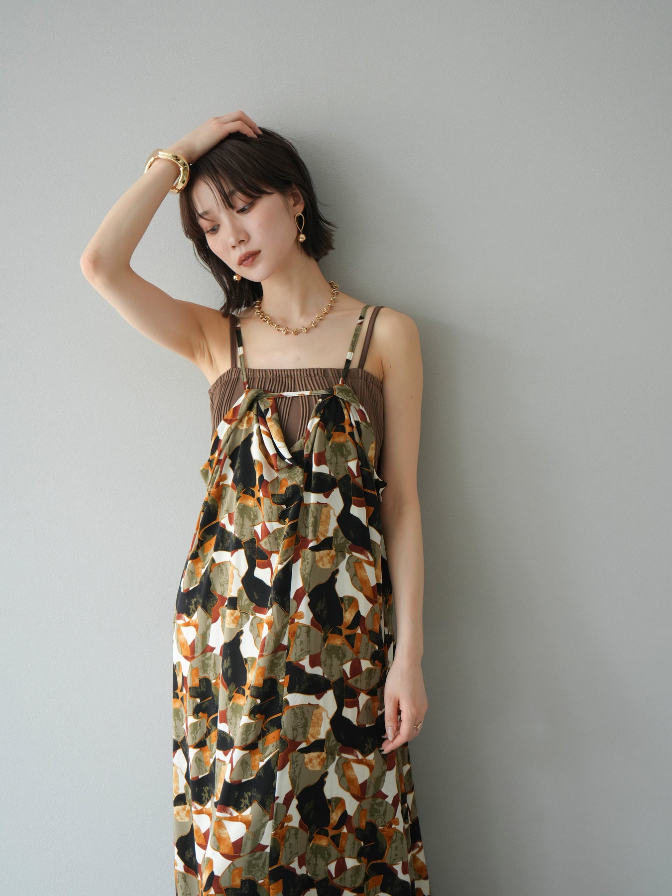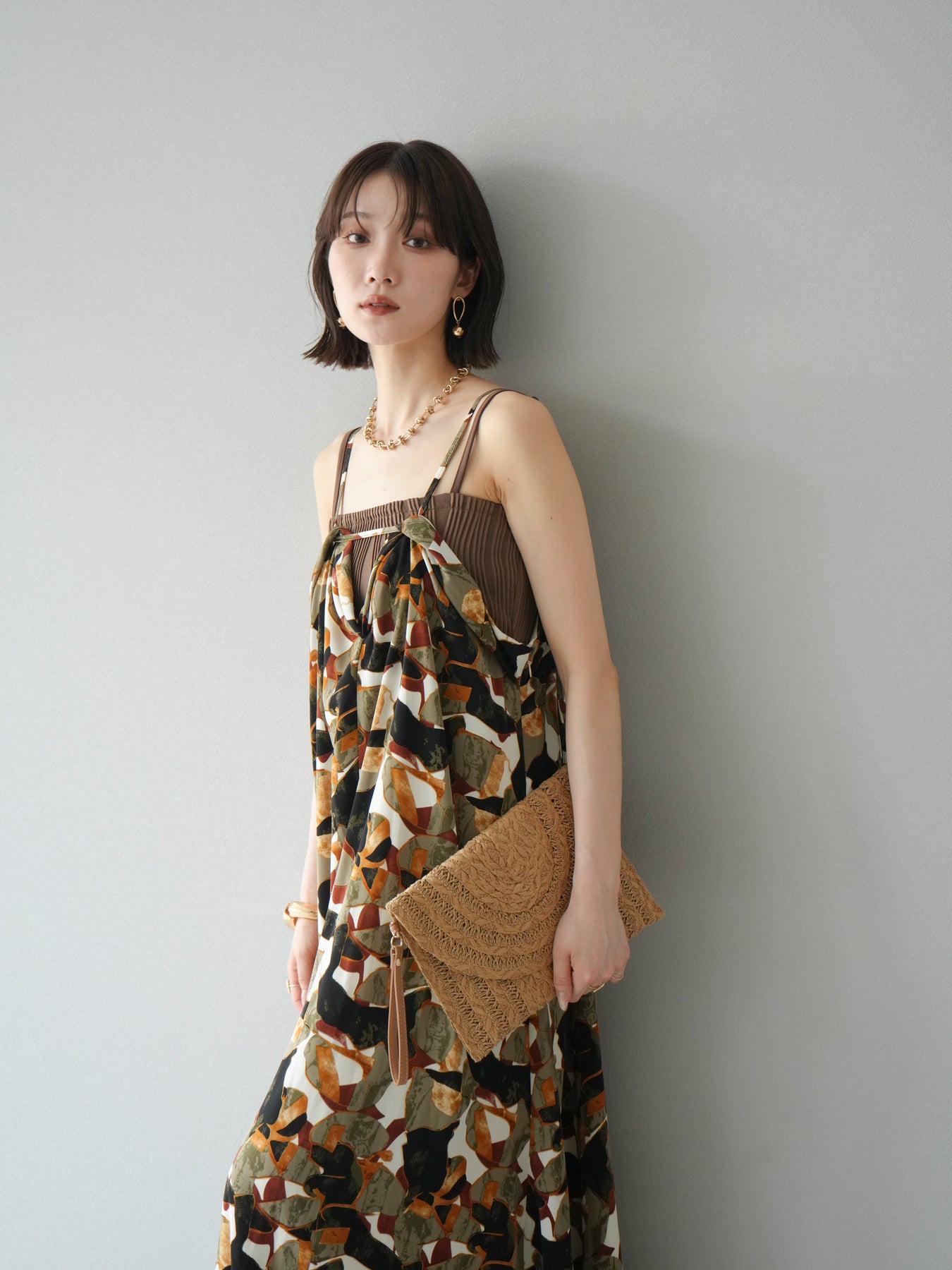 [予約]タックデザインネック幾何学柄キャミワンピース/ブラウン
