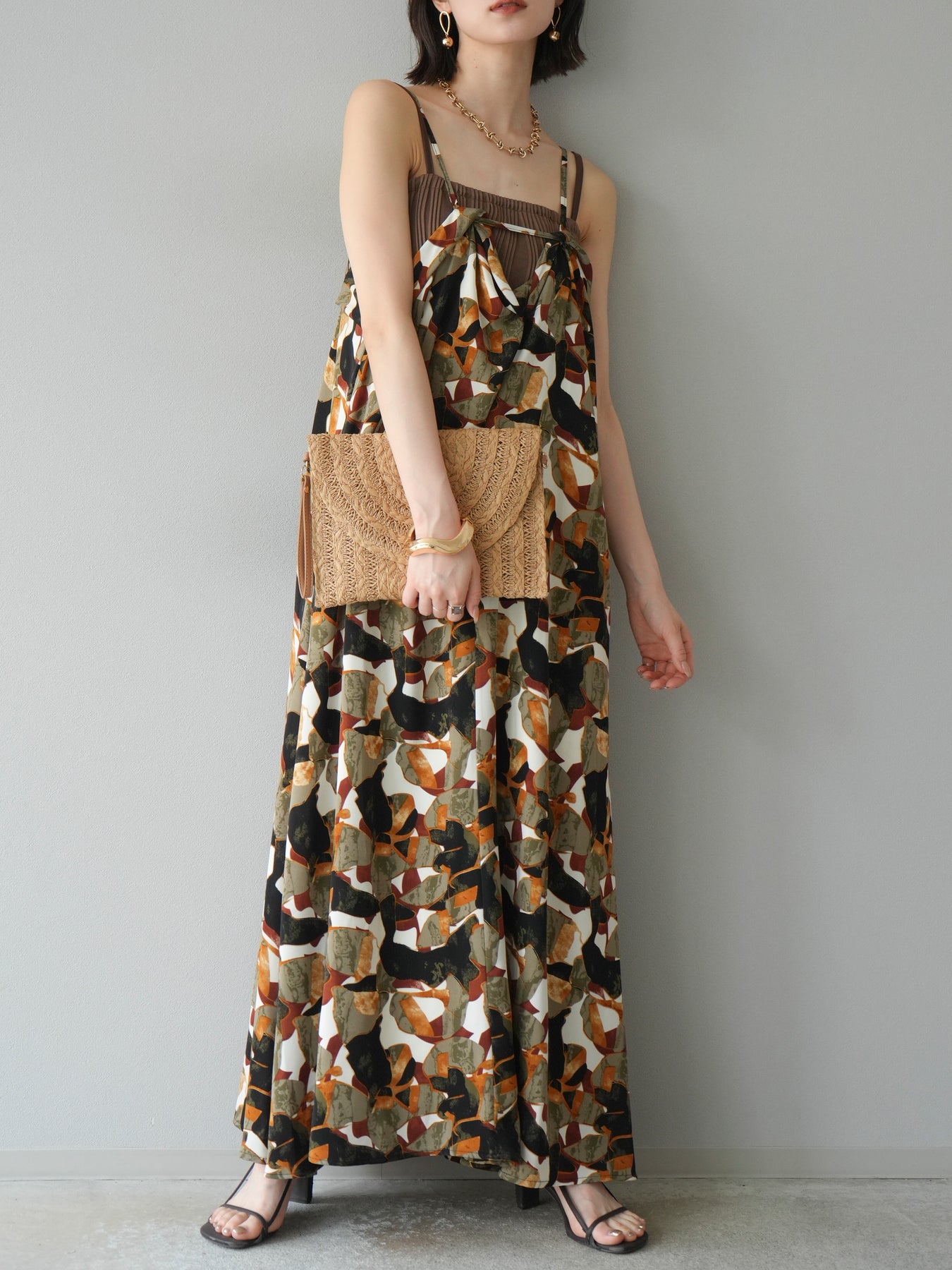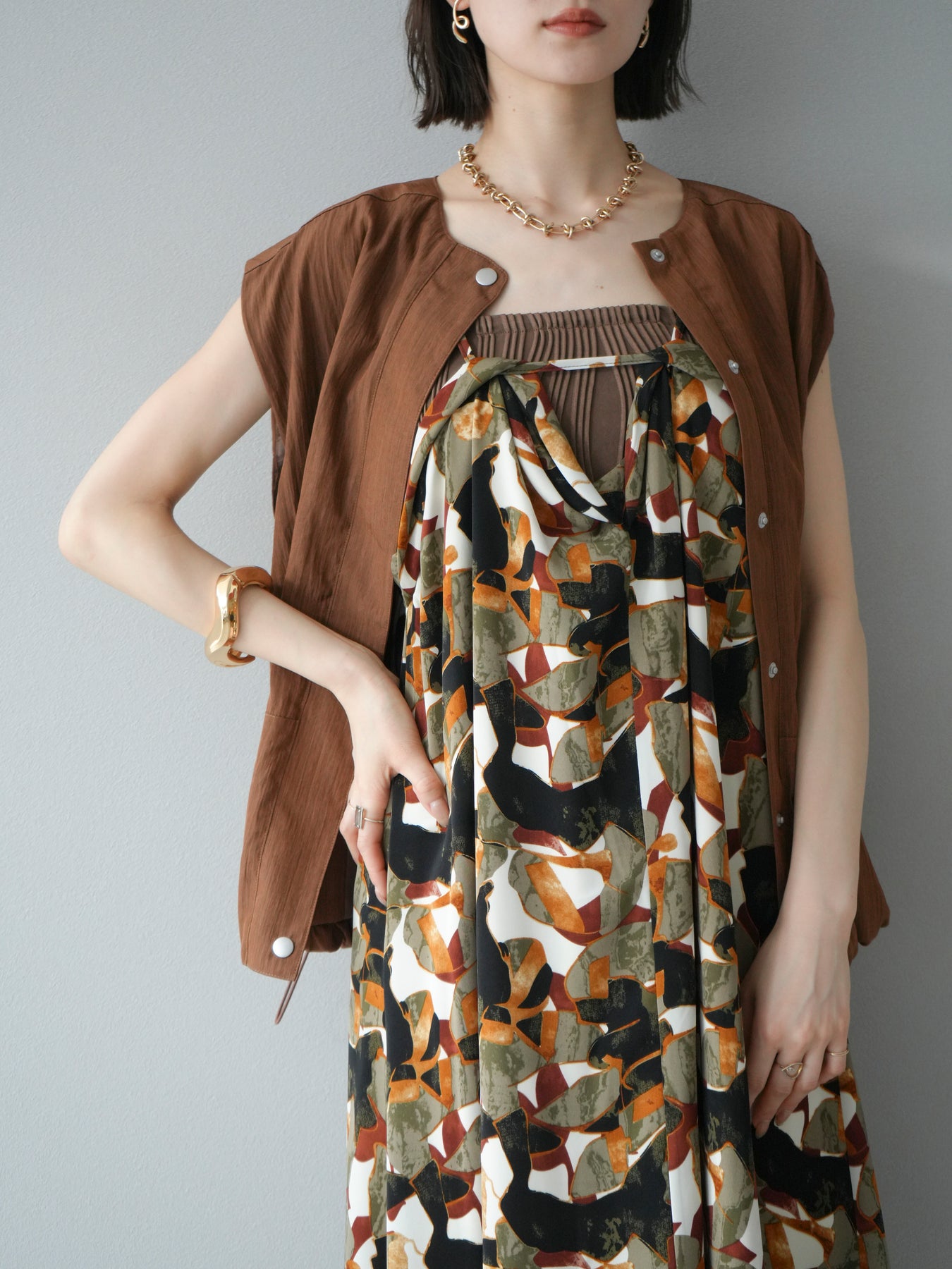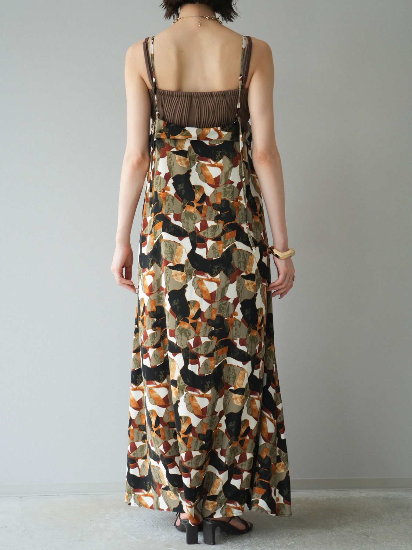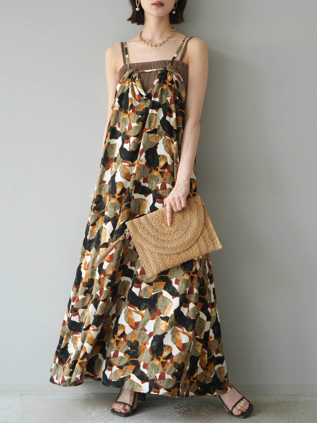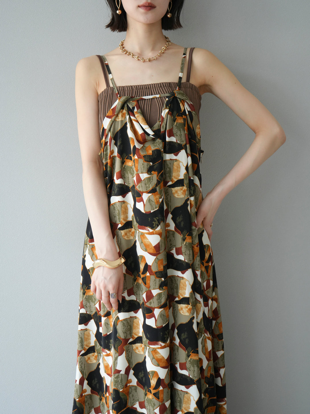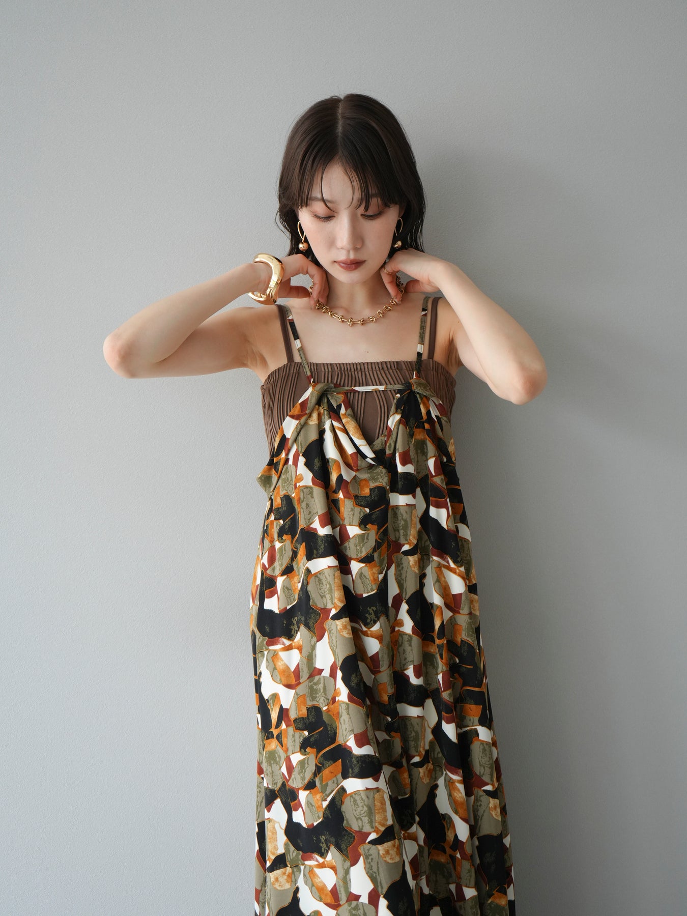 [予約]タックデザインネック幾何学柄キャミワンピース/ブラウン