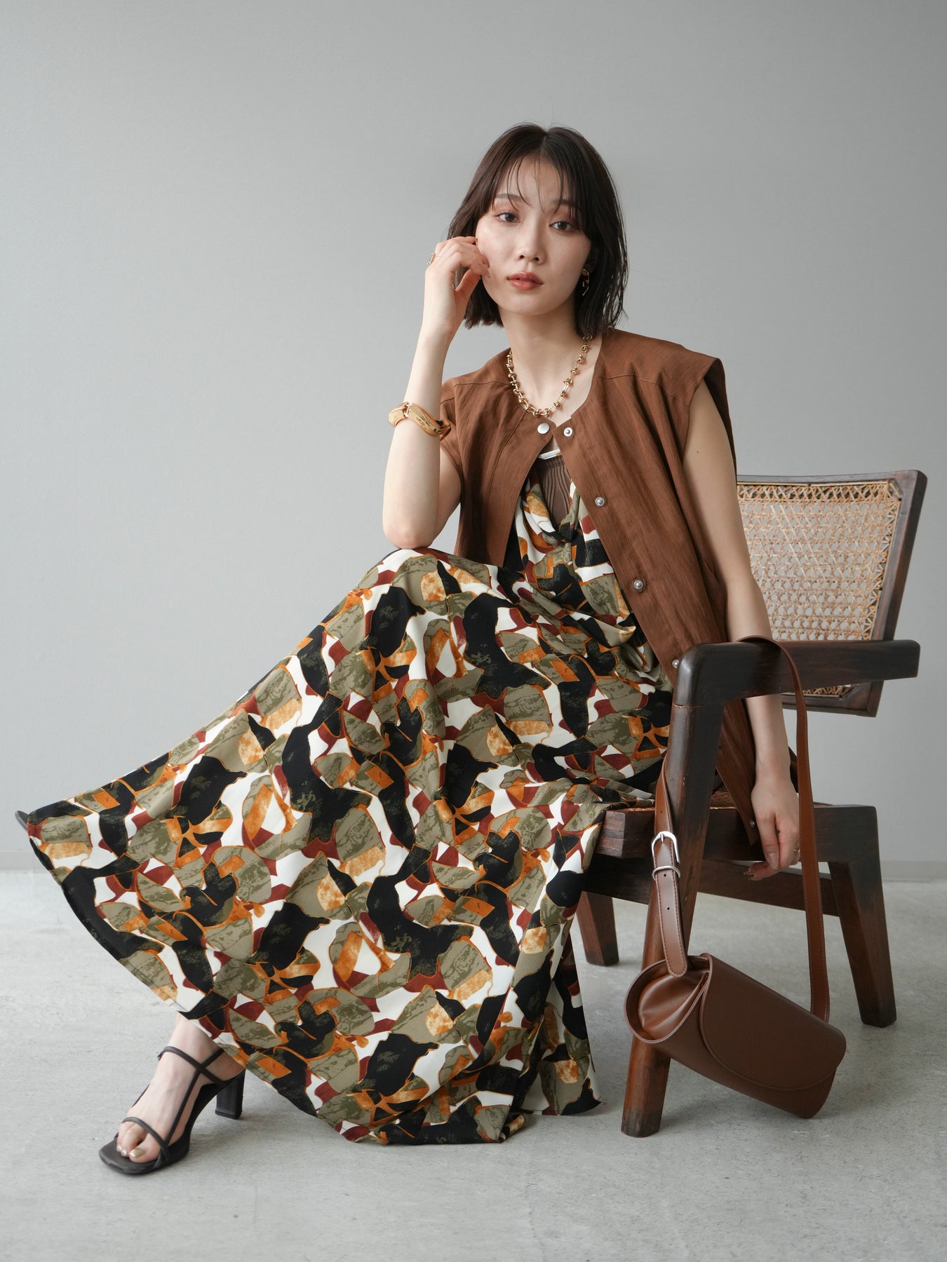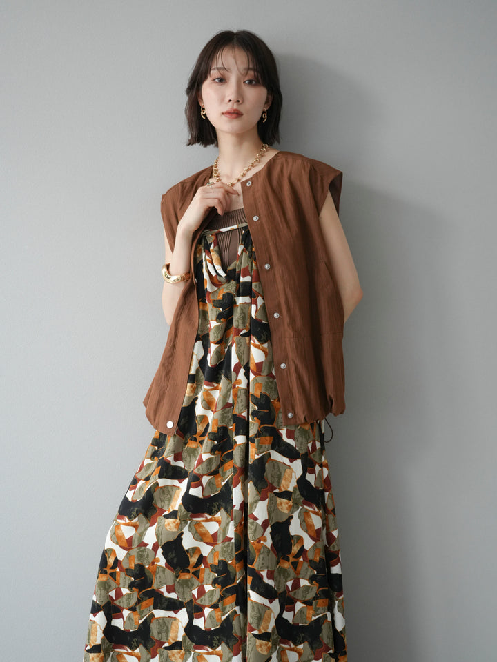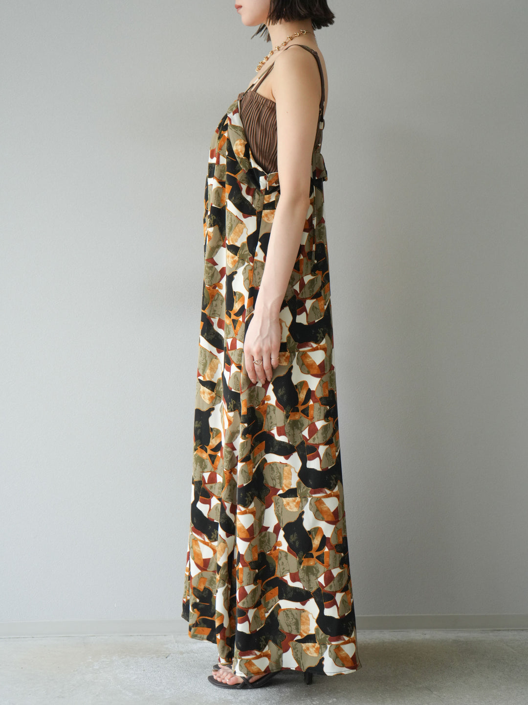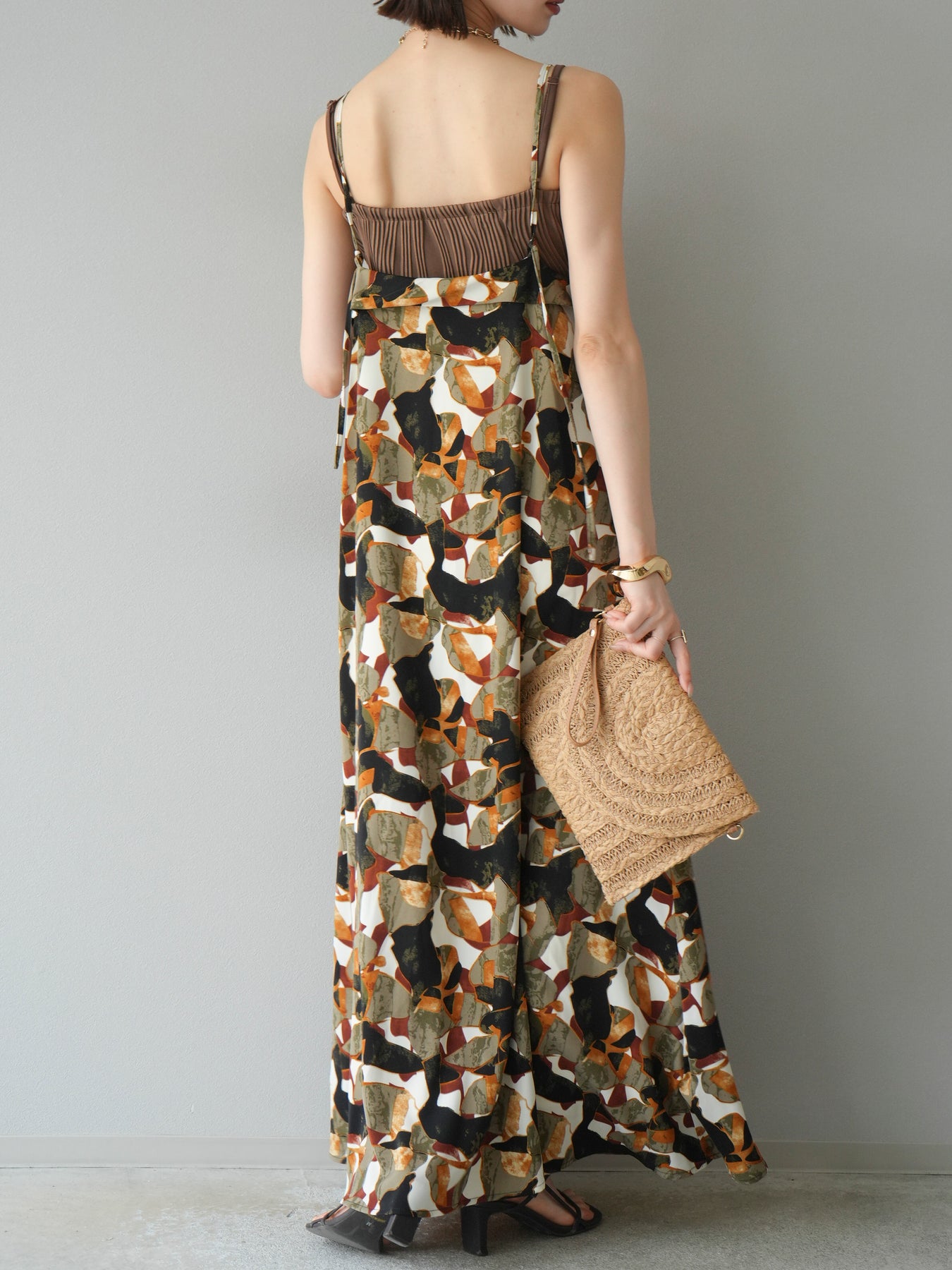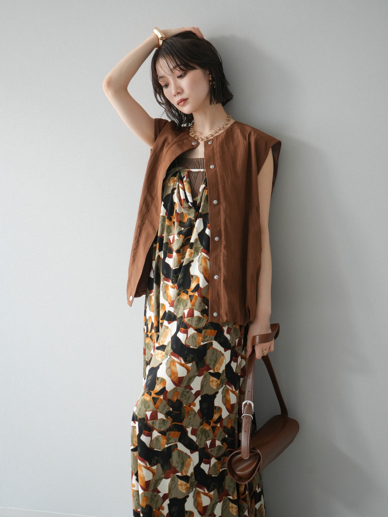 [予約]タックデザインネック幾何学柄キャミワンピース/ブラウン