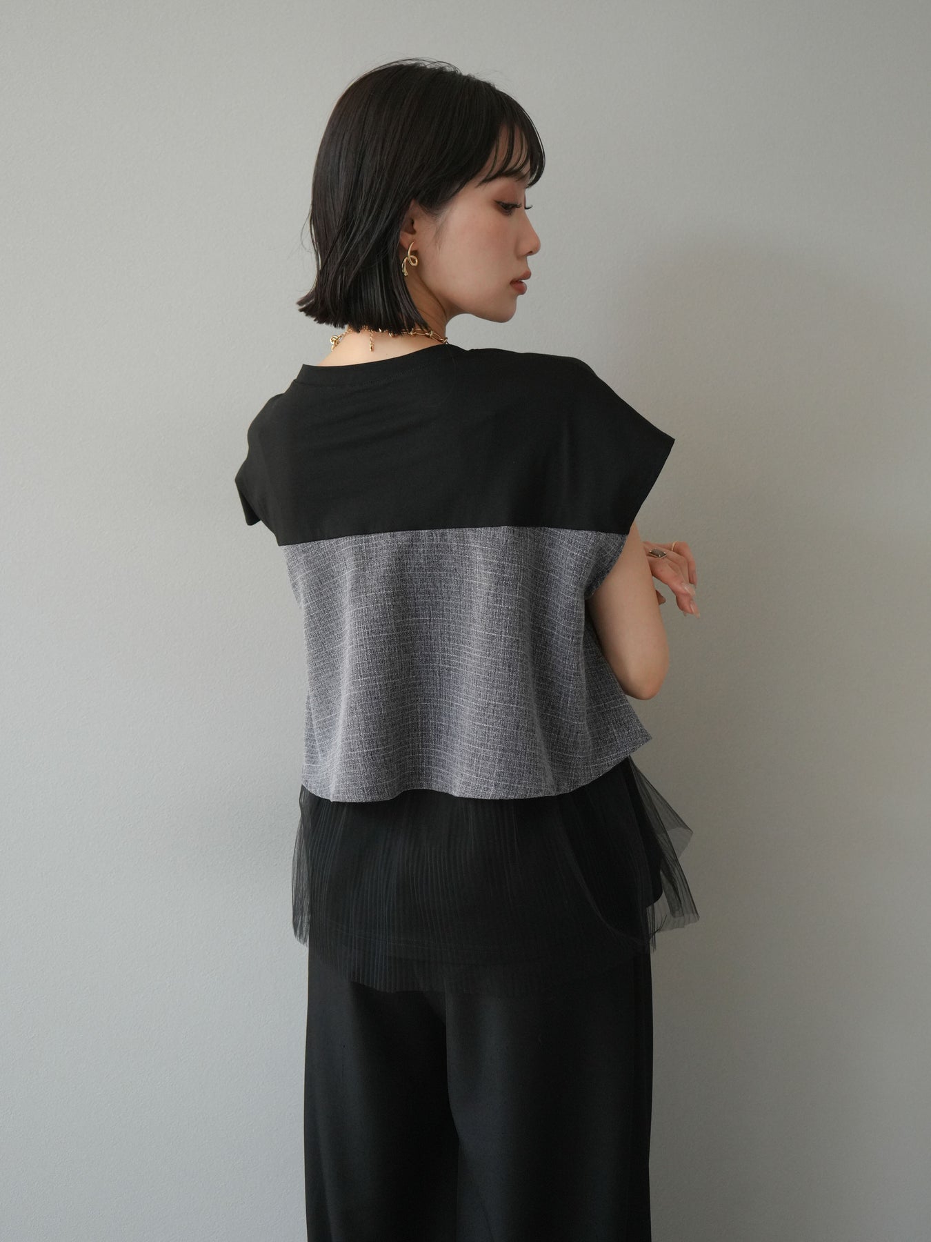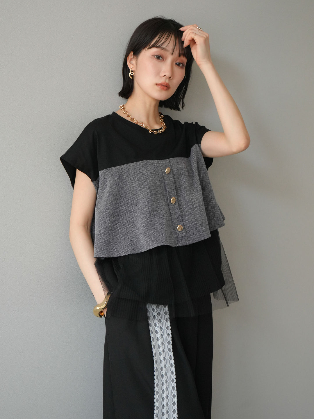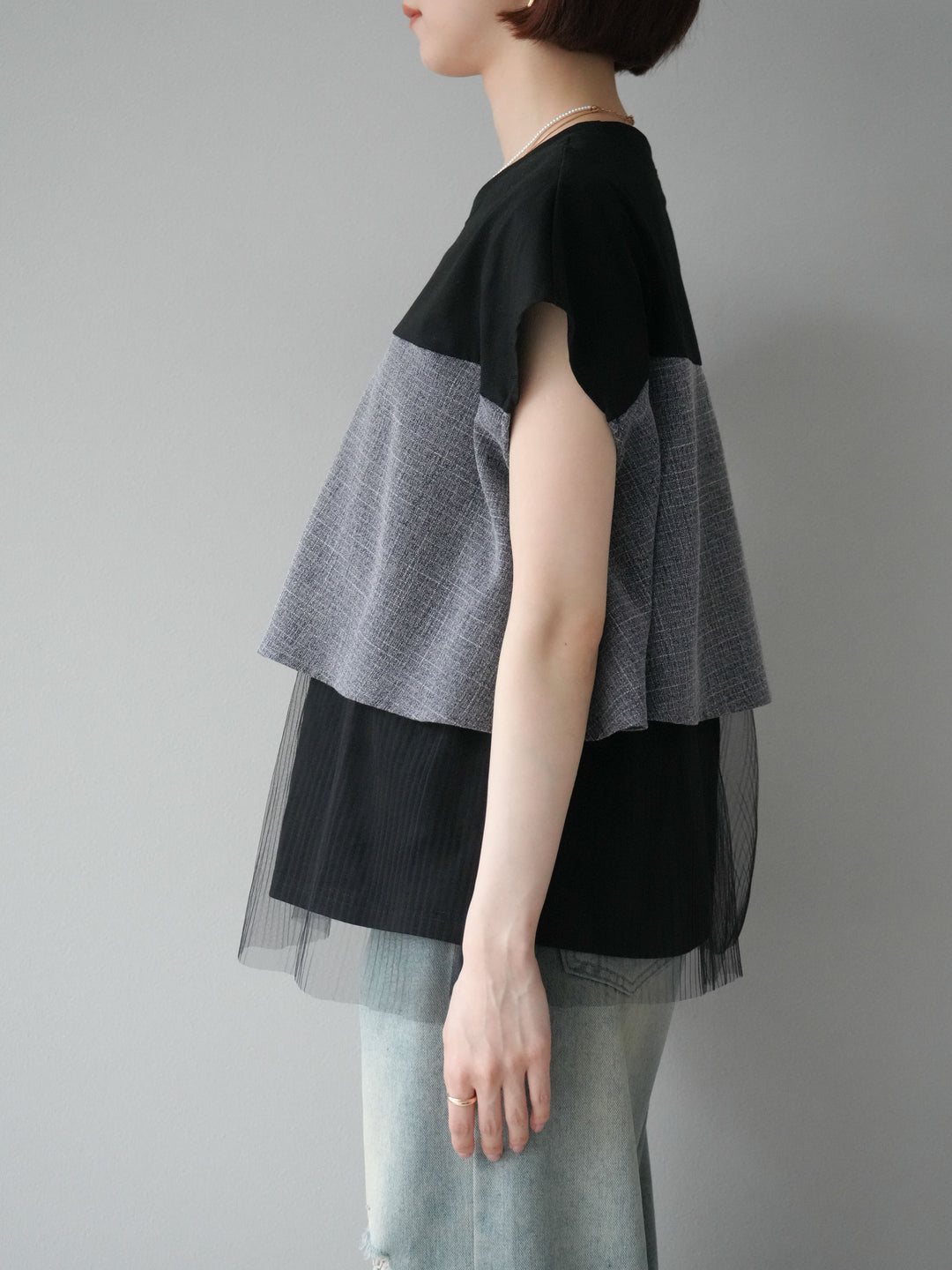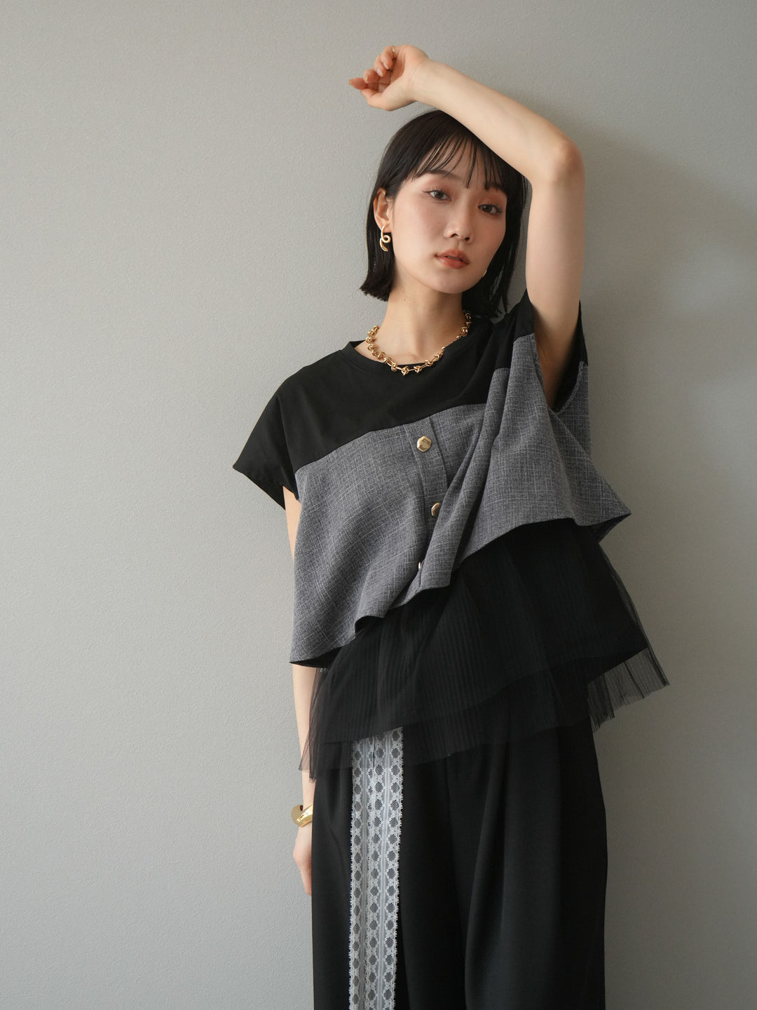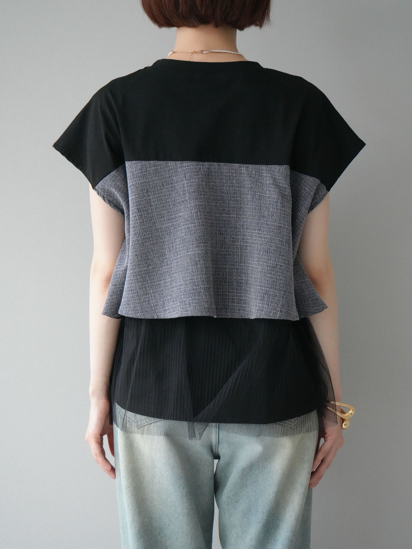 [予約]デザイン切替チュールレイヤードTシャツ/ブラック×ネイビー