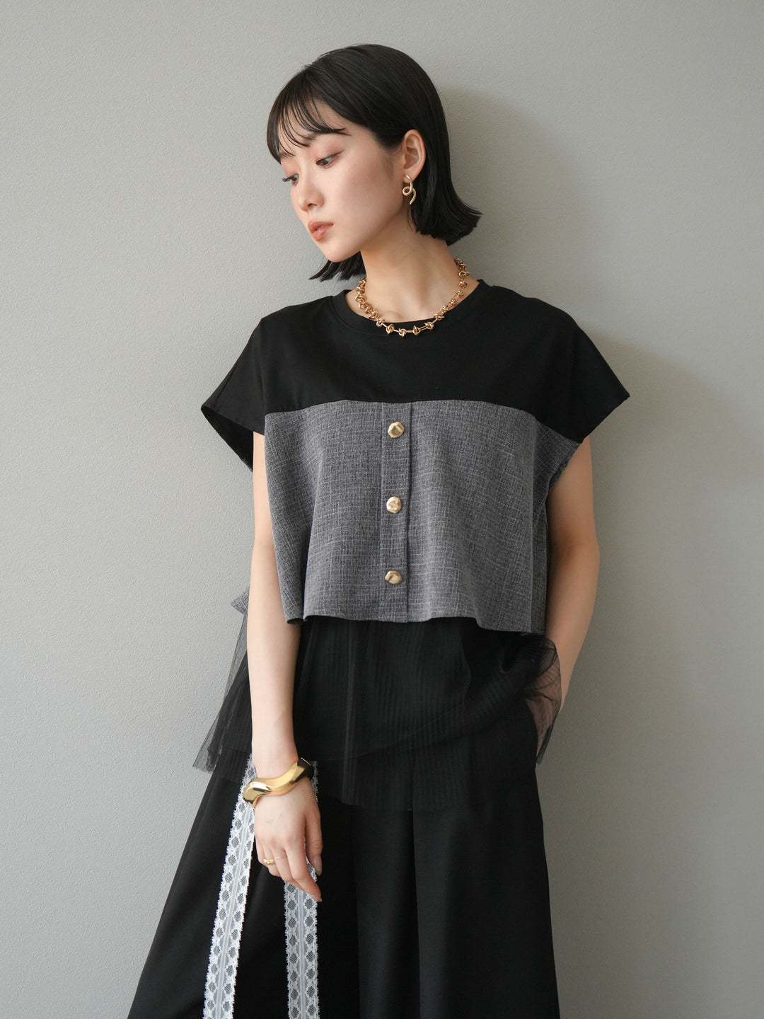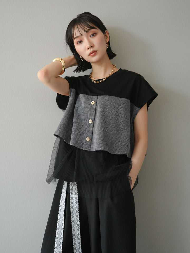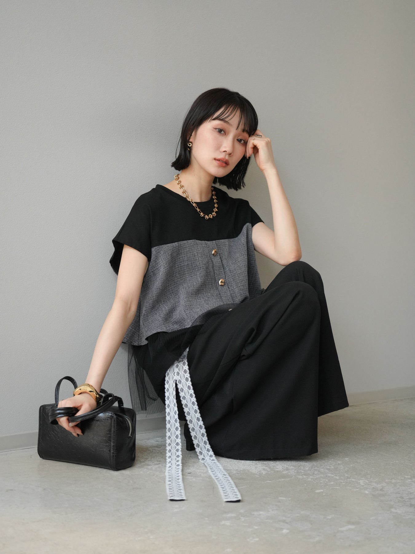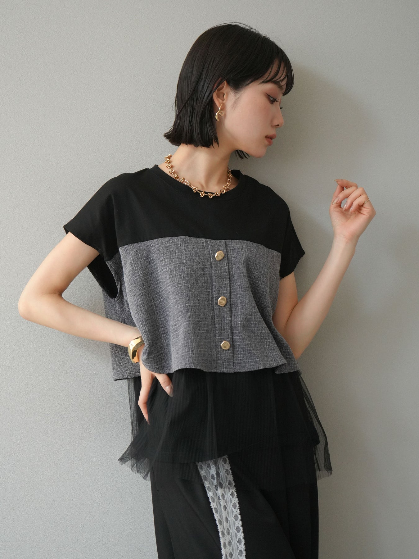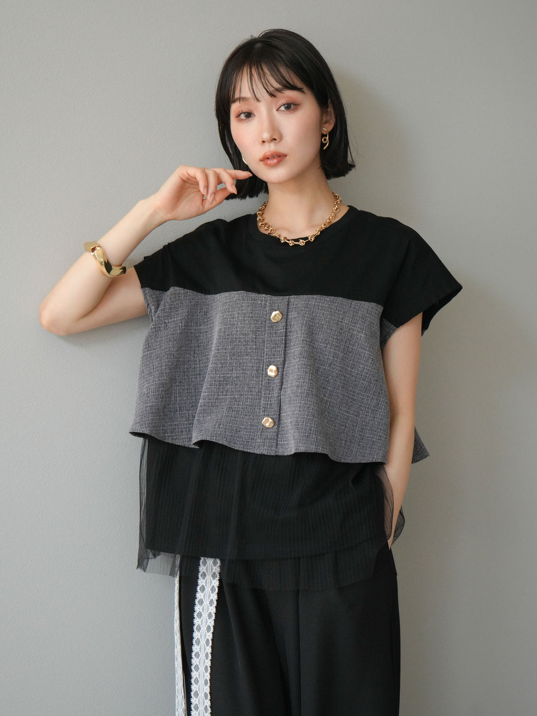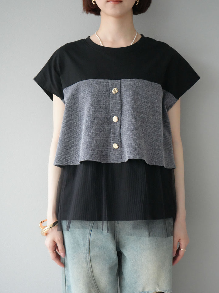 [予約]デザイン切替チュールレイヤードTシャツ/ブラック×ネイビー