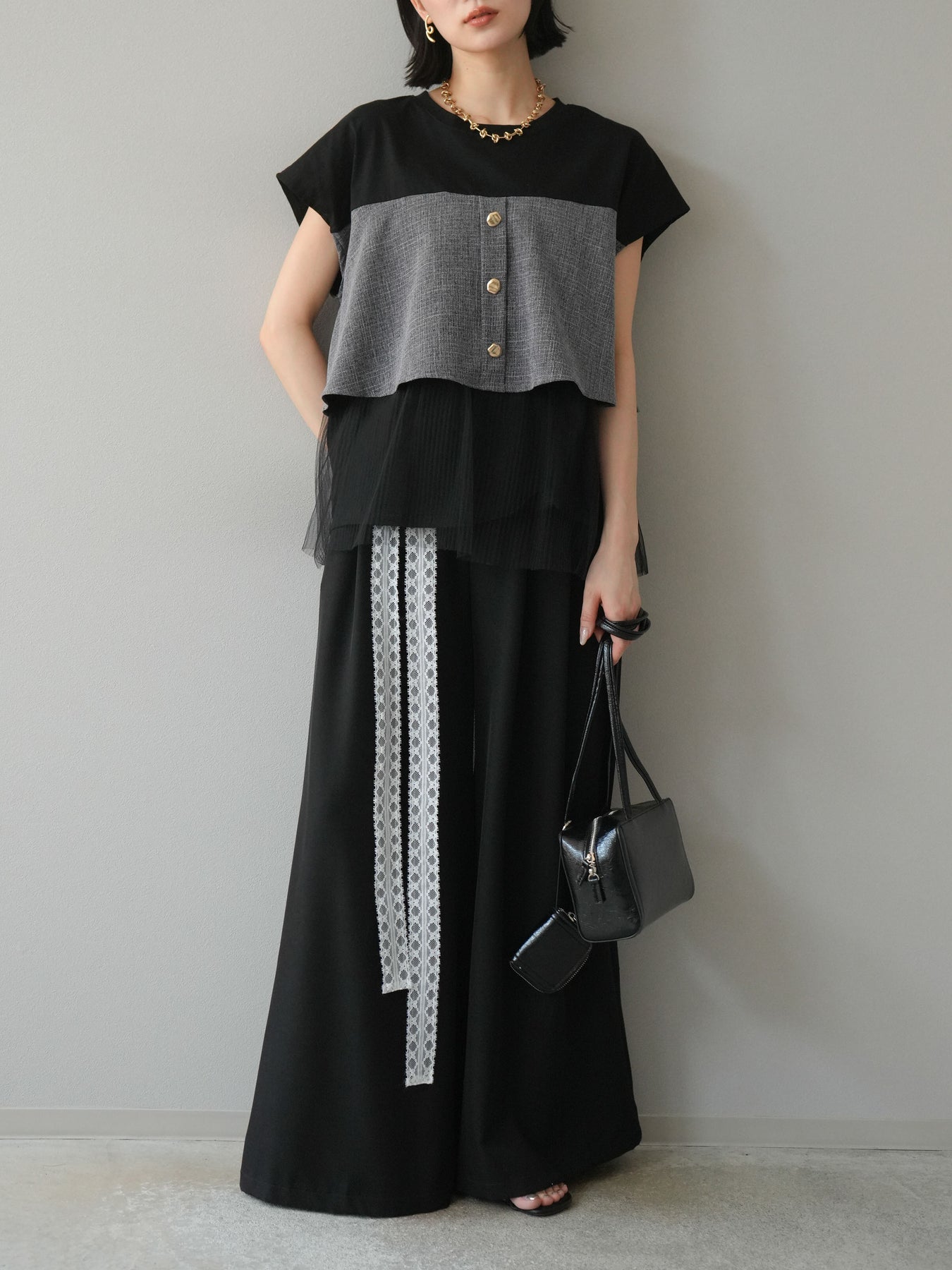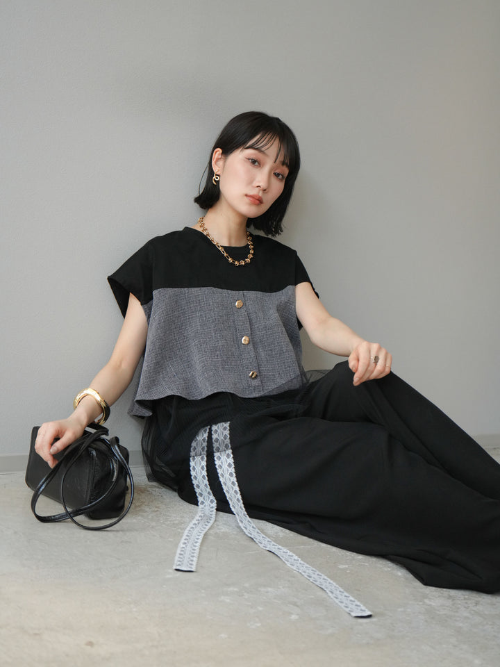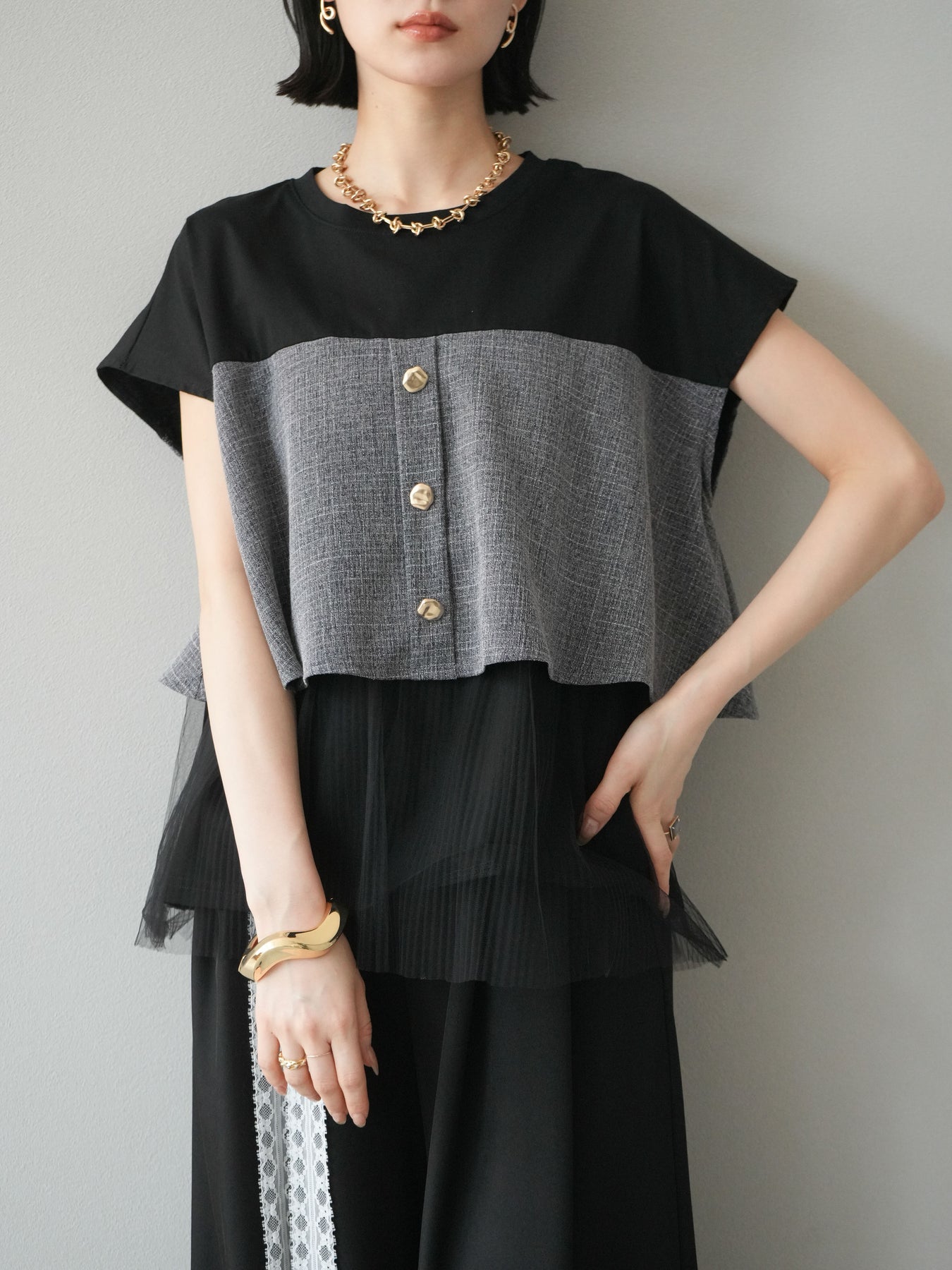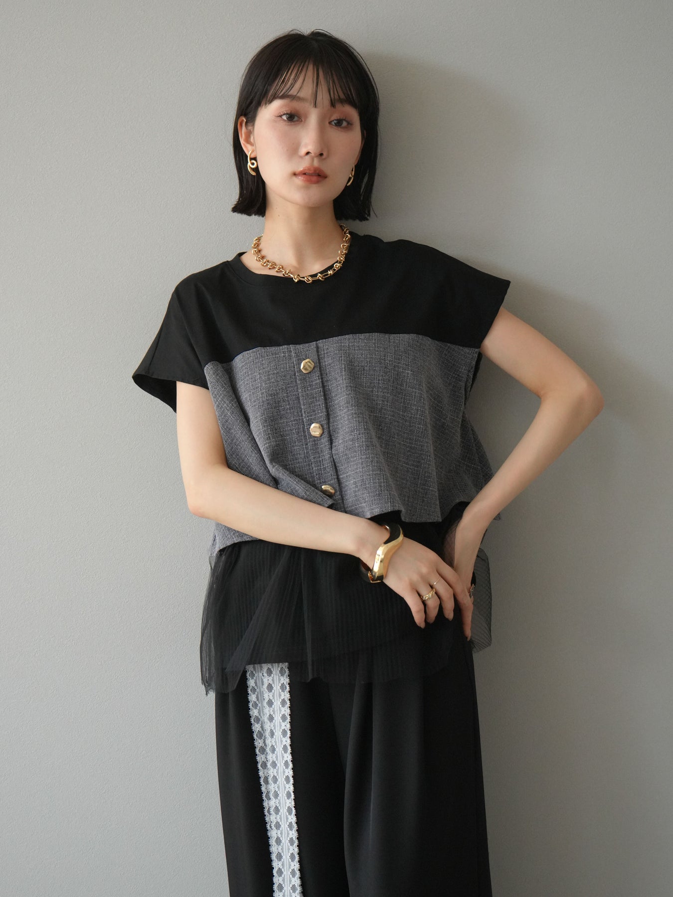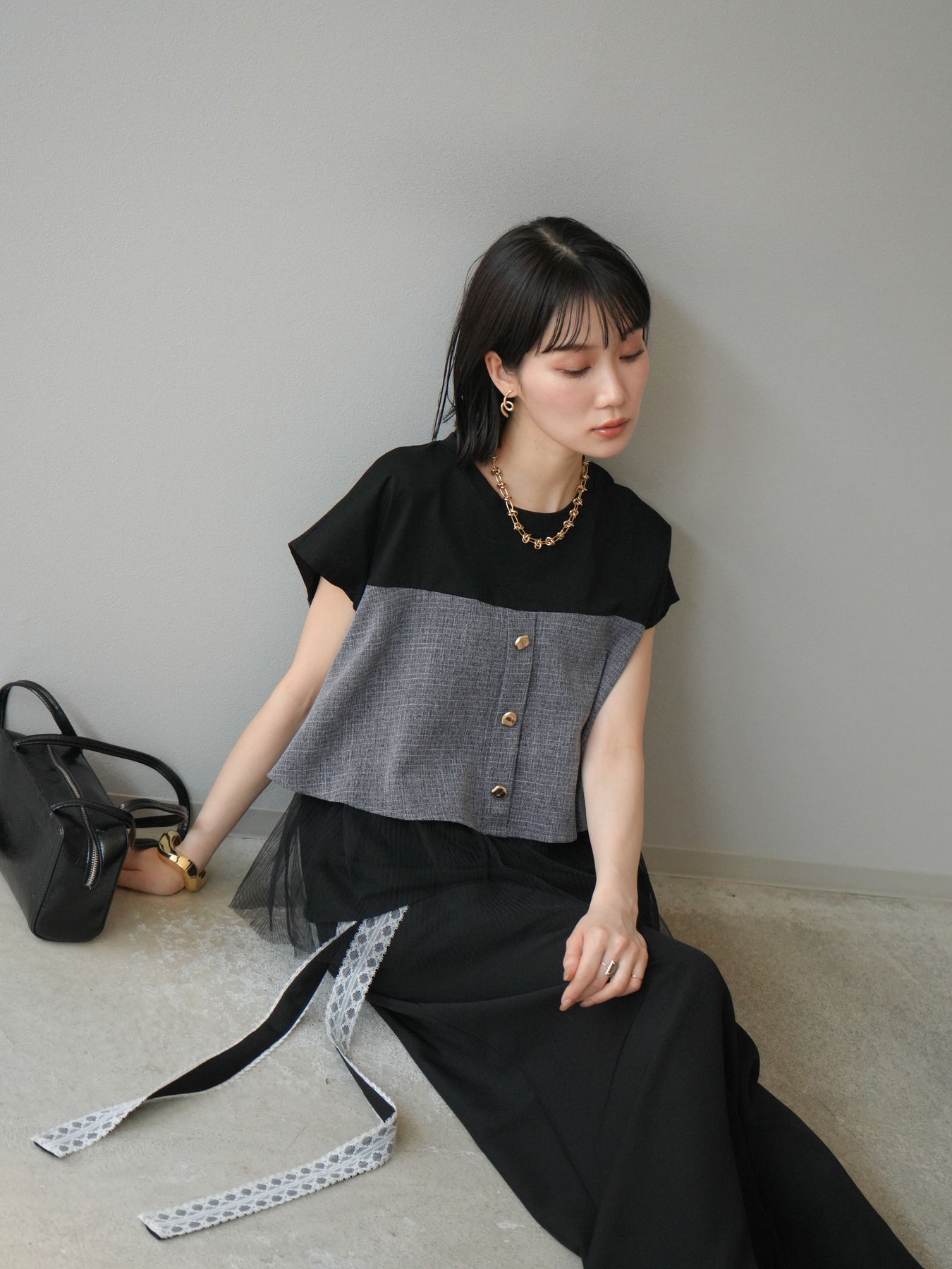 [予約]デザイン切替チュールレイヤードTシャツ/ブラック×ネイビー
