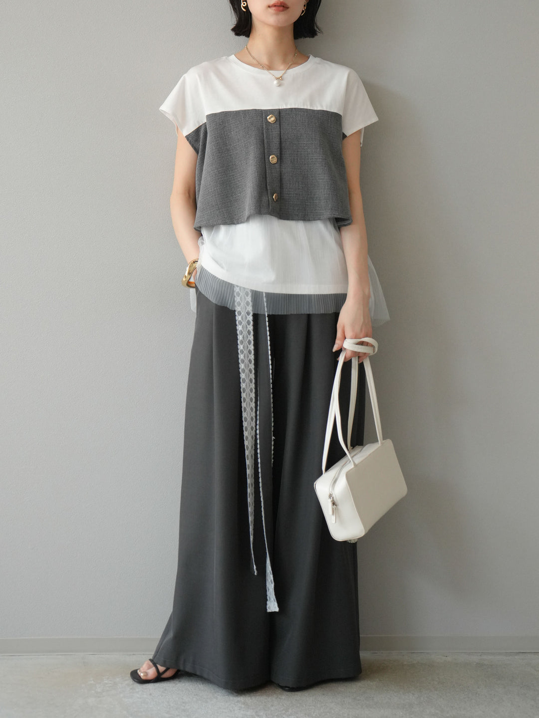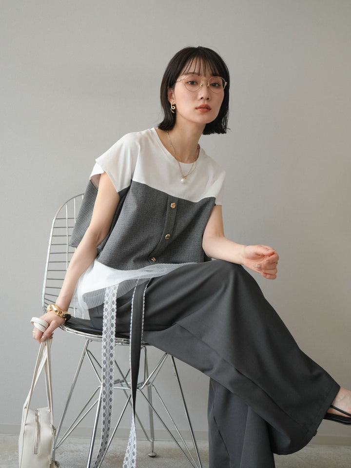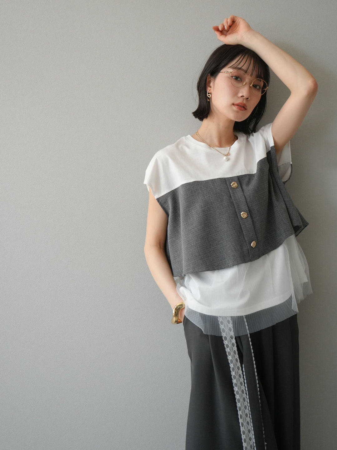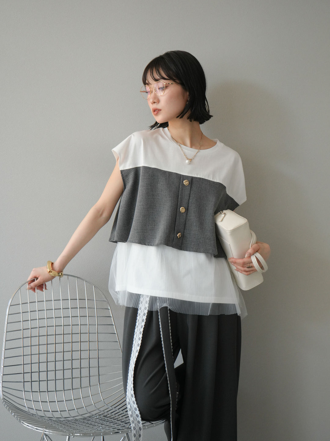 [予約]デザイン切替チュールレイヤードTシャツ/ホワイト×ブラック