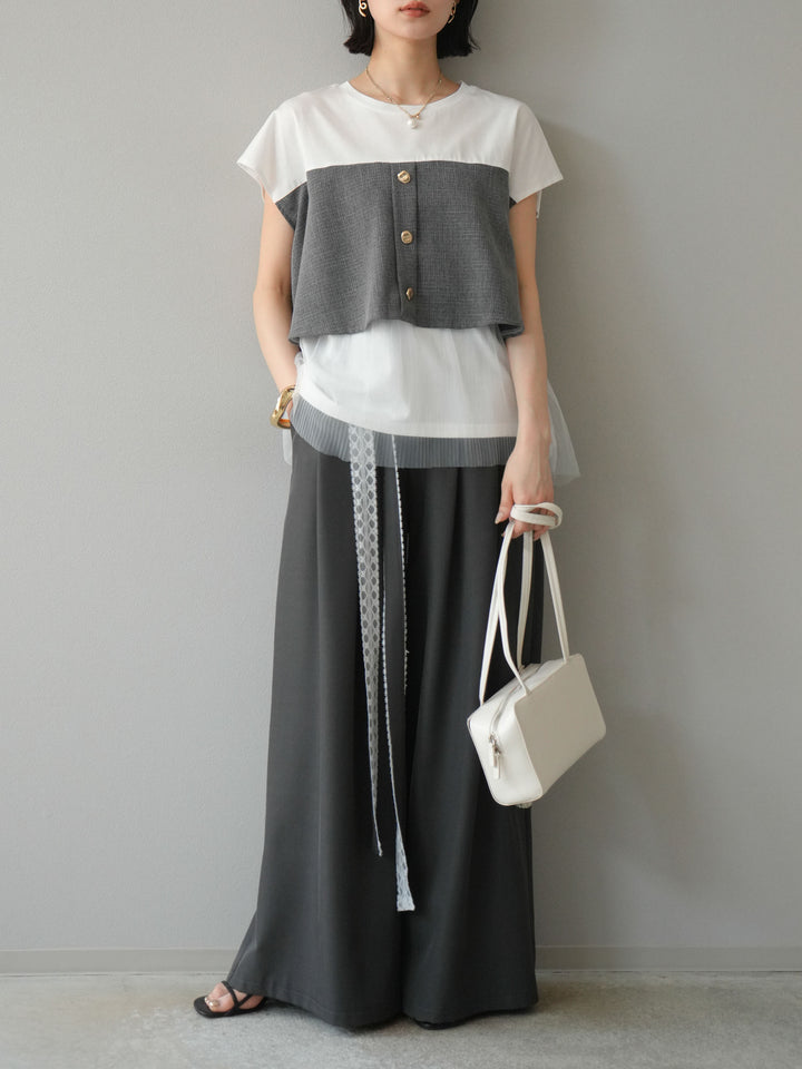 異素材の切替デザインとチュールのレイヤードが目を引くトレンド感たっぷりのTシャツ。フロントのボタンディテールがアクセントとなり、シンプルながらも洗練された印象に。ゆったりとしたシルエットで体型カバーも叶い、カジュアルからきれいめコーデまで幅広く活躍します。1枚で主役になる万能アイテムです。 ※ボトムス、キャミソール(インナー)以外の商品は一律でインナーは付属していません