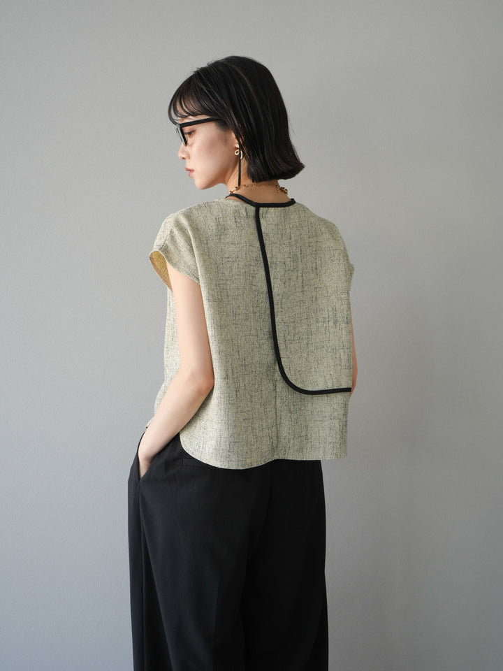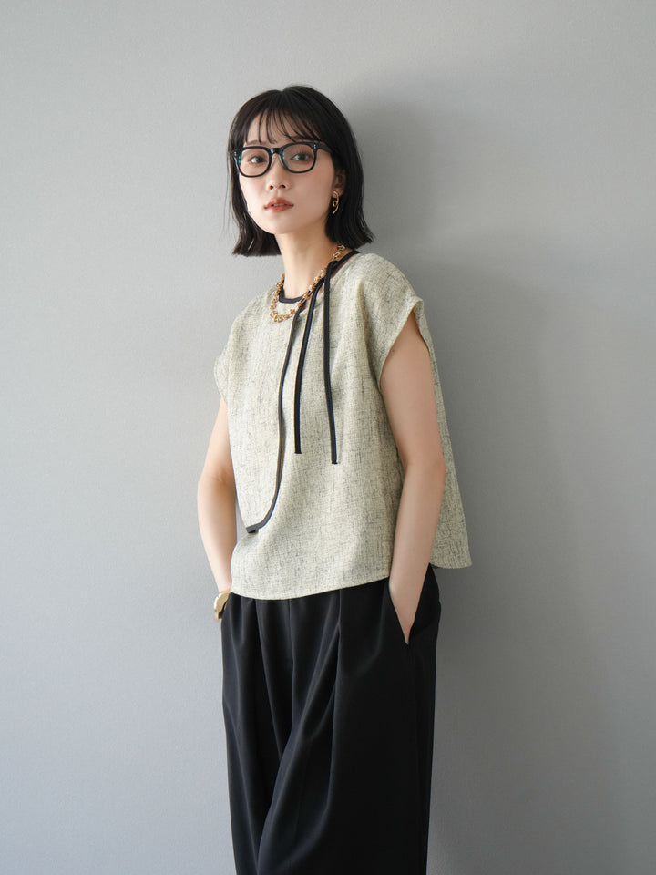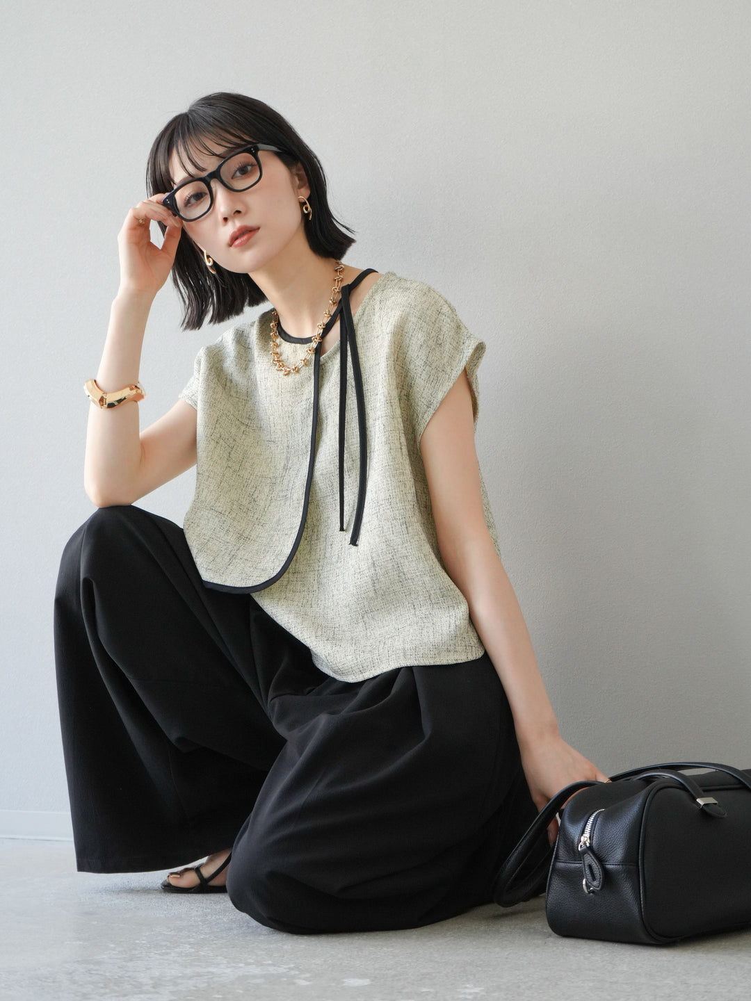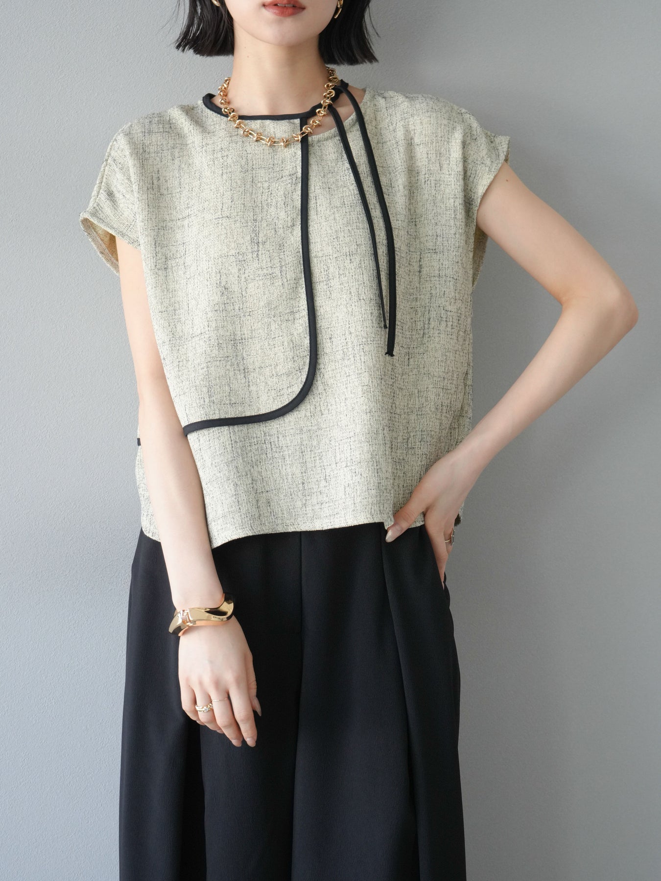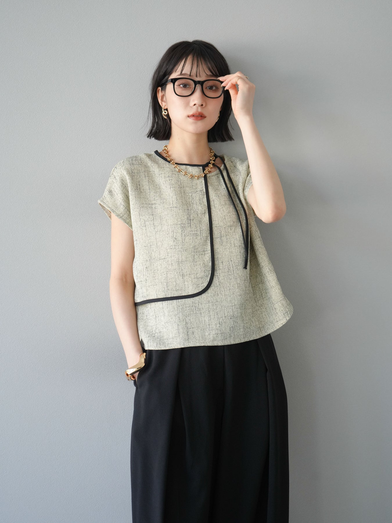 軽やかなサマーツイード素材を使用し、上品さとカジュアルさを兼ね備えたプルオーバー。ケープ風のデザインがモード感を演出し、胸元のパイピングがアクセントに。ゆったりとしたシルエットで涼しく着られ、デイリーからオフィスカジュアルまで幅広く活躍します。コーデにこなれ感をプラスする1枚です。 ※ボトムス、キャミソール(インナー)以外の商品は一律でインナーは付属していません