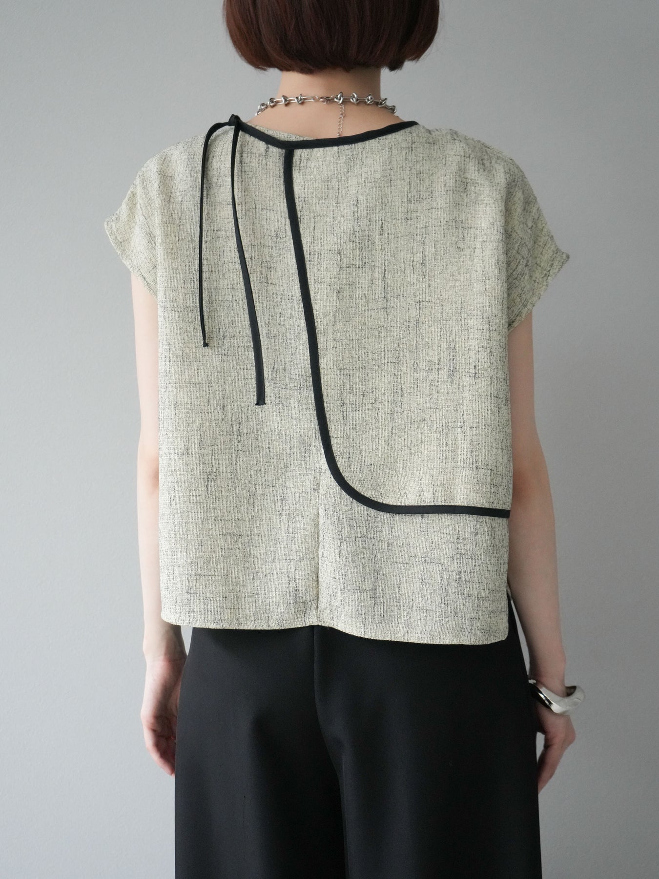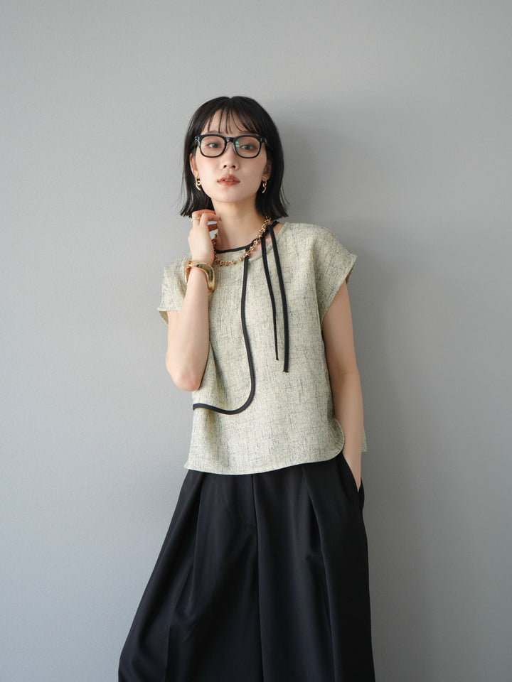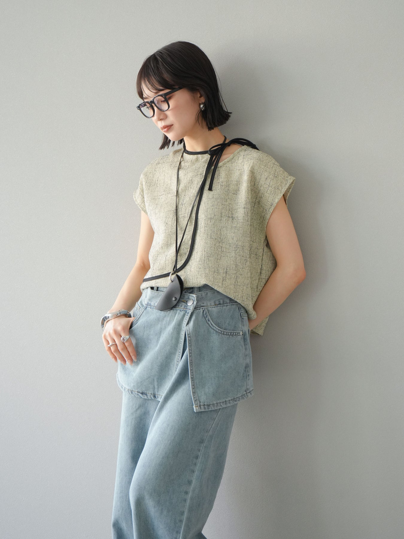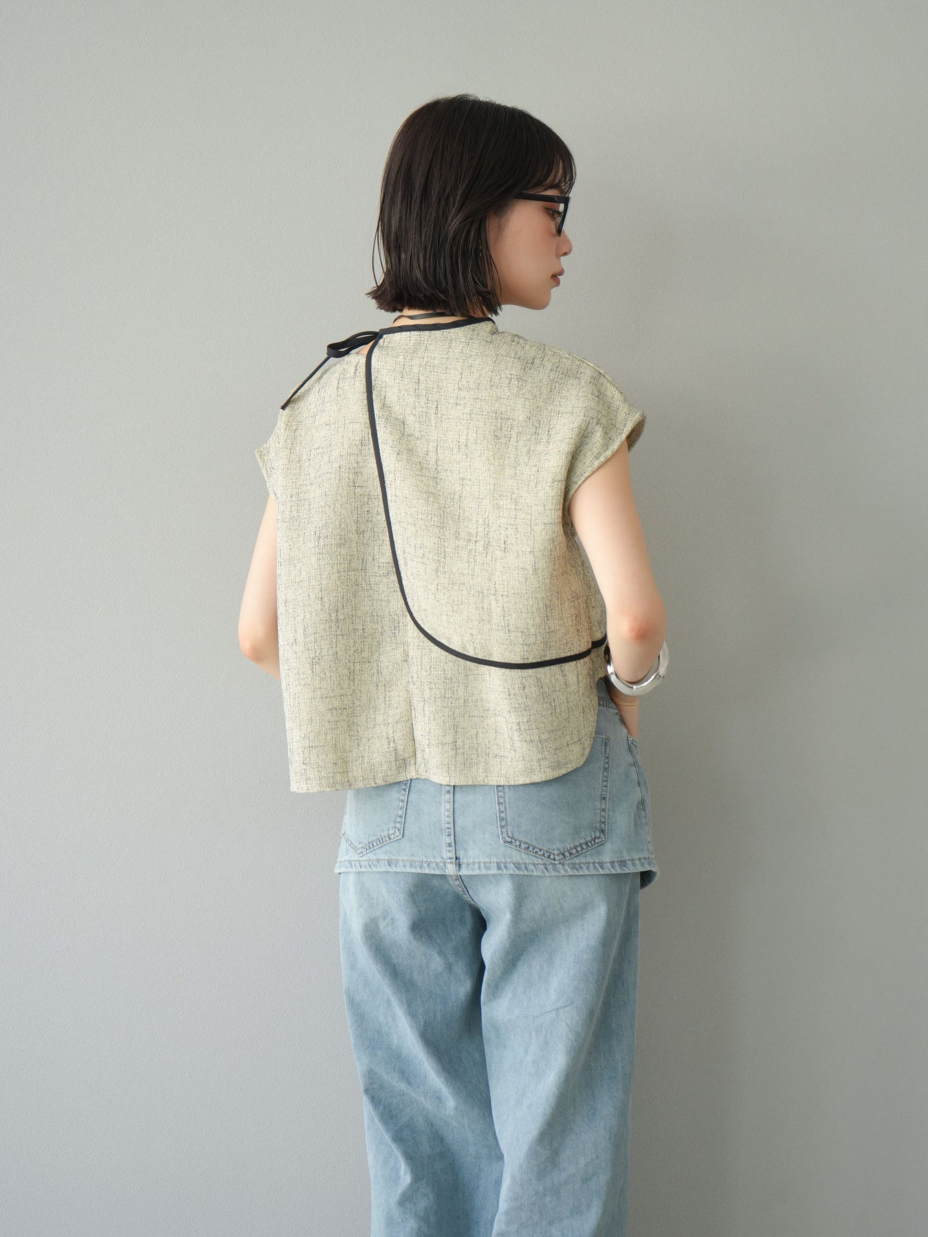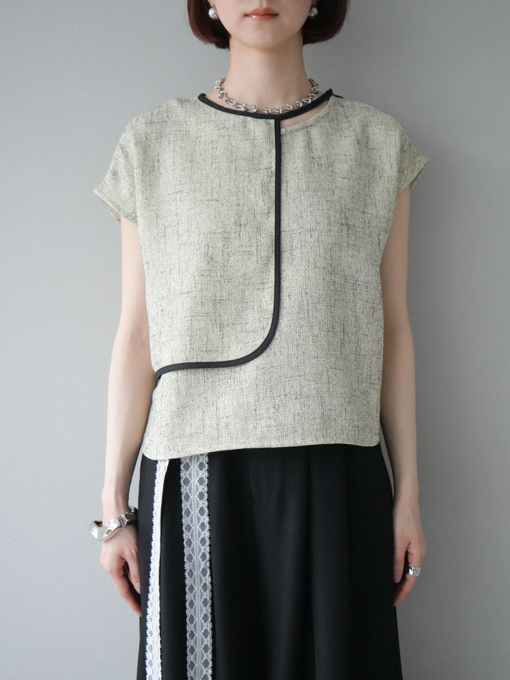 軽やかなサマーツイード素材を使用し、上品さとカジュアルさを兼ね備えたプルオーバー。ケープ風のデザインがモード感を演出し、胸元のパイピングがアクセントに。ゆったりとしたシルエットで涼しく着られ、デイリーからオフィスカジュアルまで幅広く活躍します。コーデにこなれ感をプラスする1枚です。 ※ボトムス、キャミソール(インナー)以外の商品は一律でインナーは付属していません