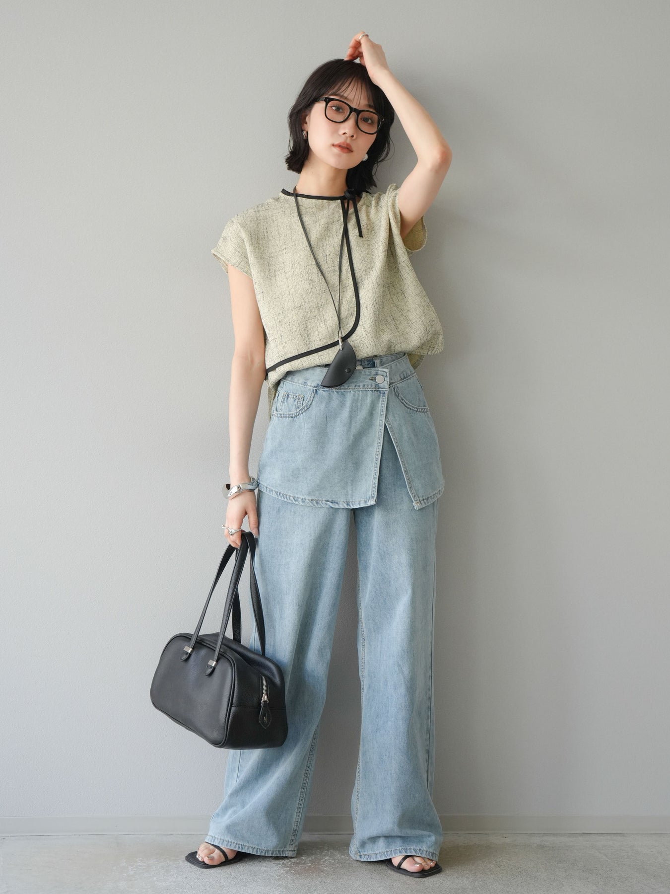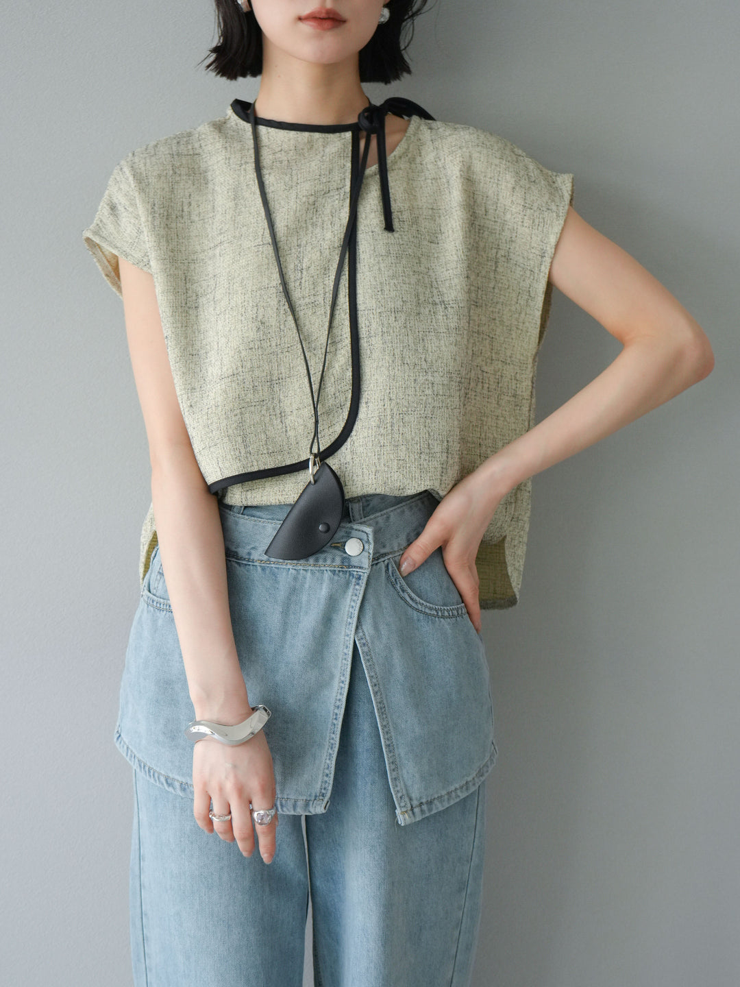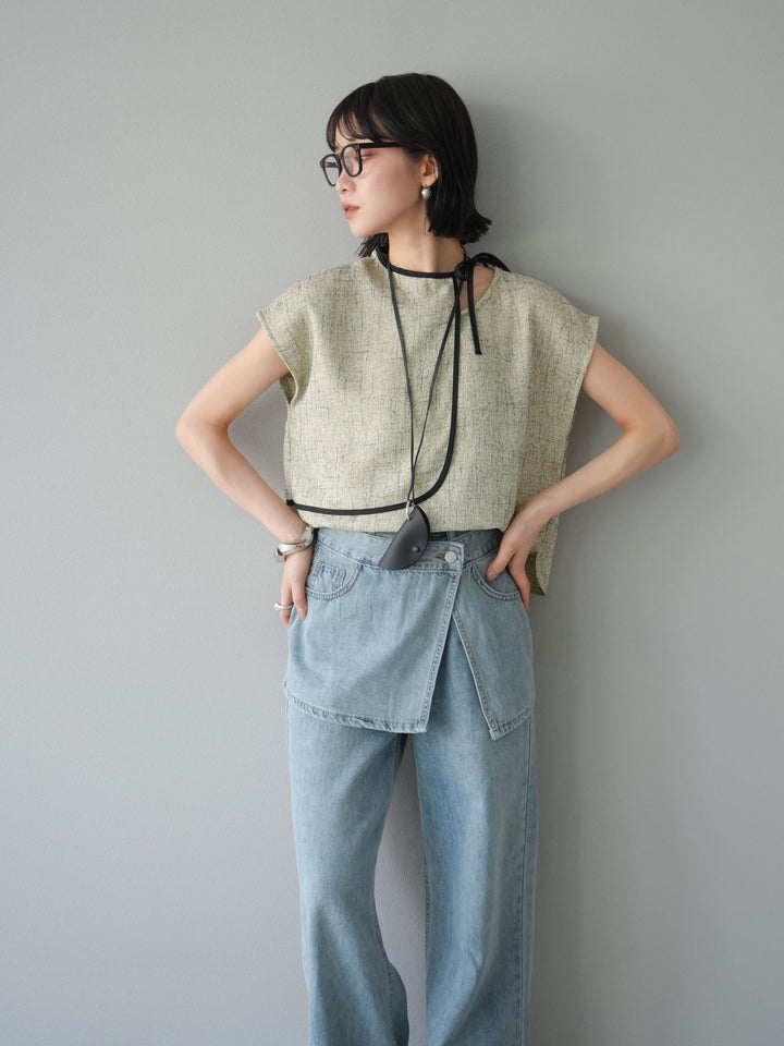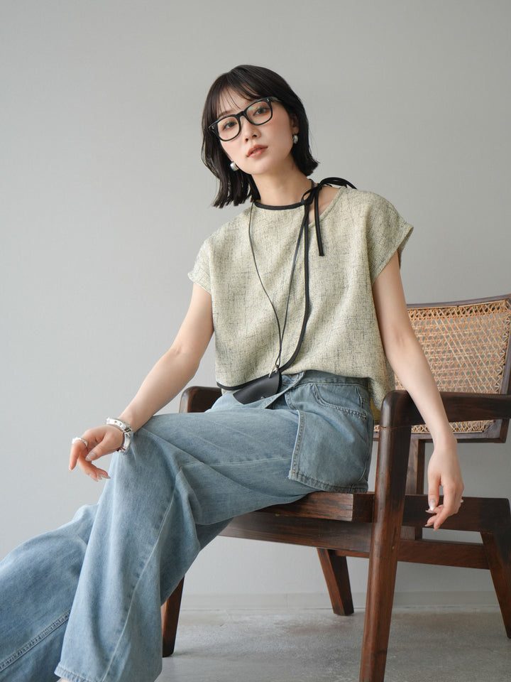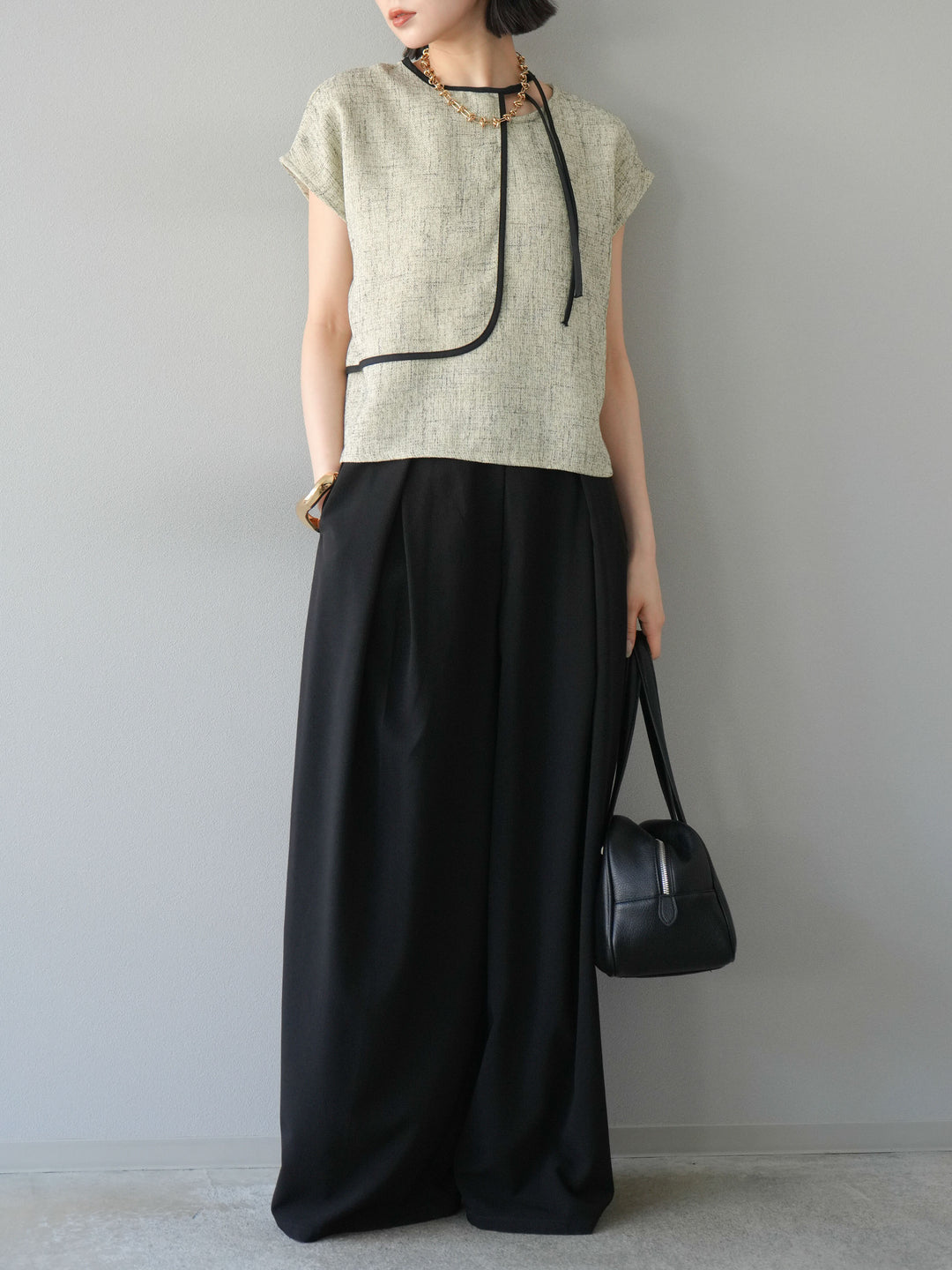 軽やかなサマーツイード素材を使用し、上品さとカジュアルさを兼ね備えたプルオーバー。ケープ風のデザインがモード感を演出し、胸元のパイピングがアクセントに。ゆったりとしたシルエットで涼しく着られ、デイリーからオフィスカジュアルまで幅広く活躍します。コーデにこなれ感をプラスする1枚です。 ※ボトムス、キャミソール(インナー)以外の商品は一律でインナーは付属していません