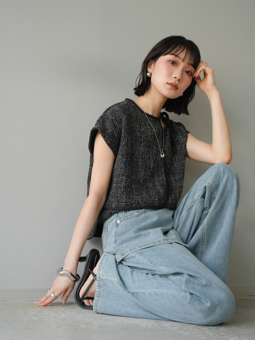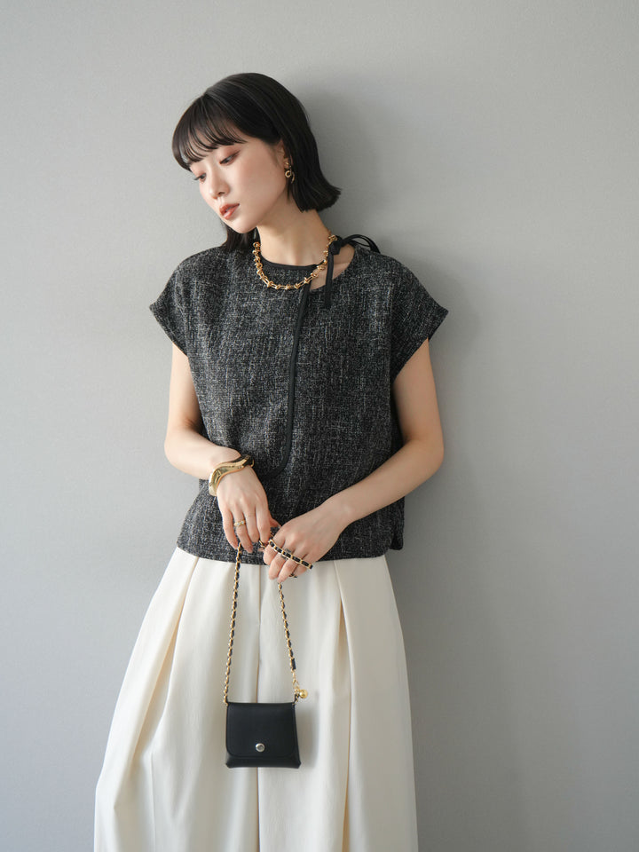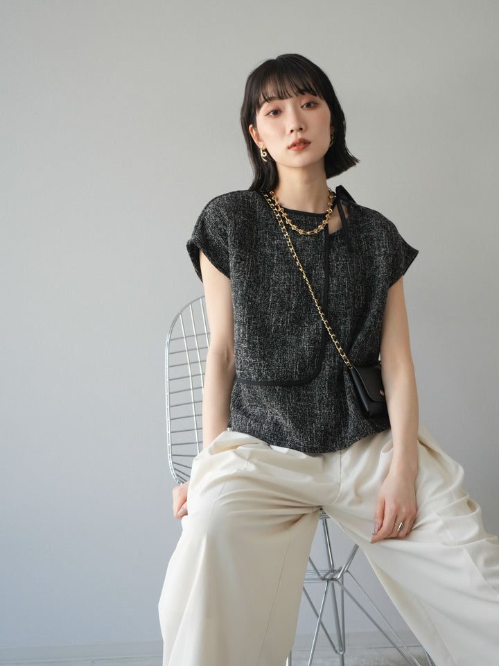 軽やかなサマーツイード素材を使用し、上品さとカジュアルさを兼ね備えたプルオーバー。ケープ風のデザインがモード感を演出し、胸元のパイピングがアクセントに。ゆったりとしたシルエットで涼しく着られ、デイリーからオフィスカジュアルまで幅広く活躍します。コーデにこなれ感をプラスする1枚です。 ※ボトムス、キャミソール(インナー)以外の商品は一律でインナーは付属していません