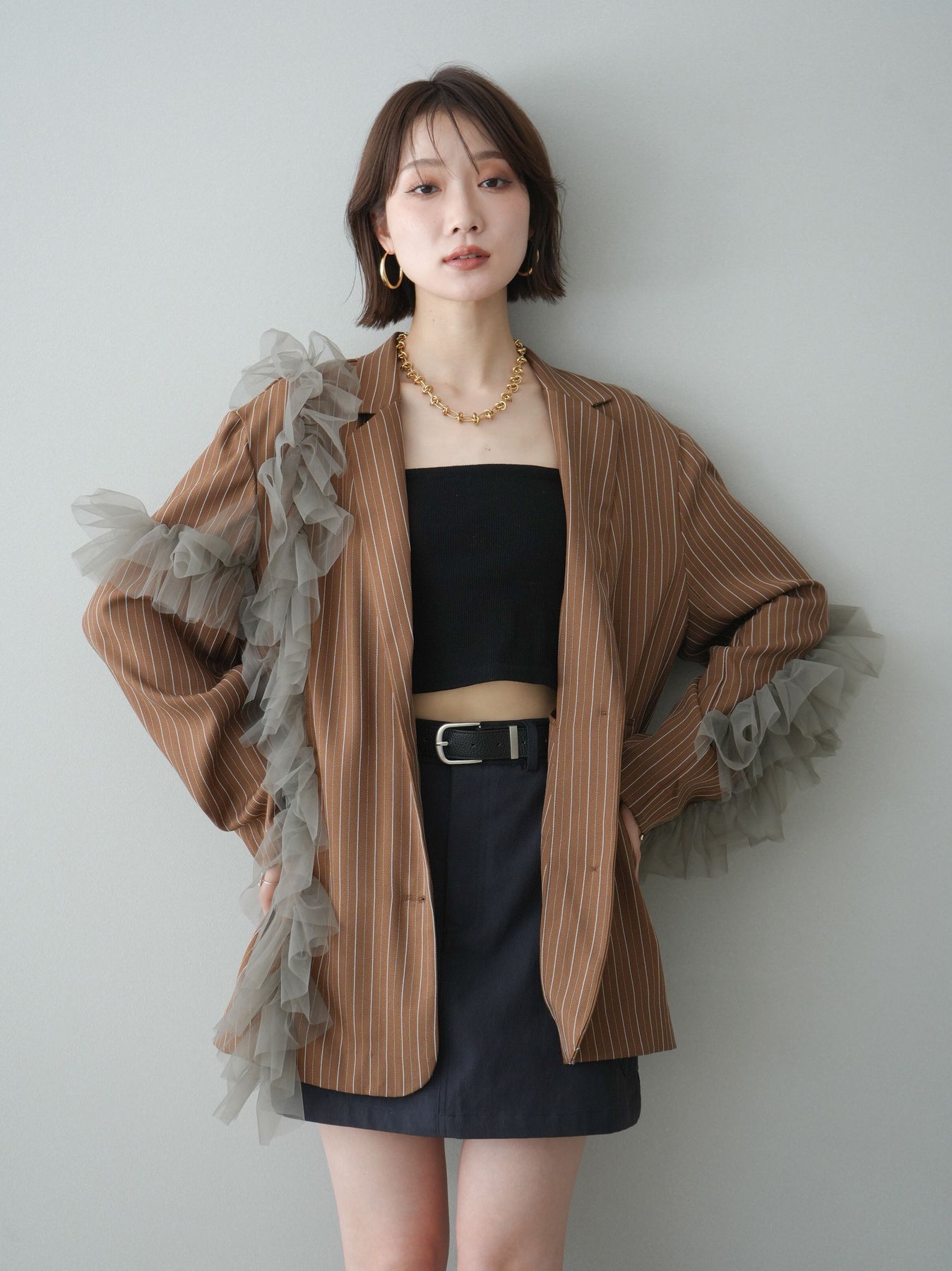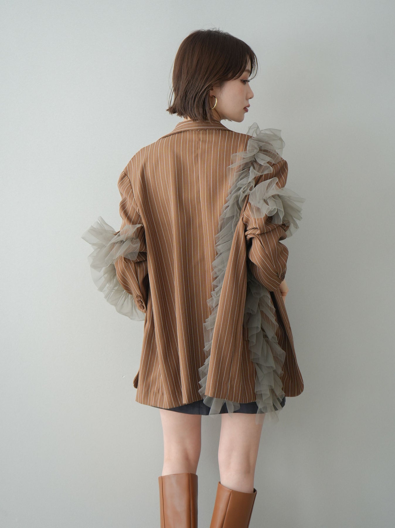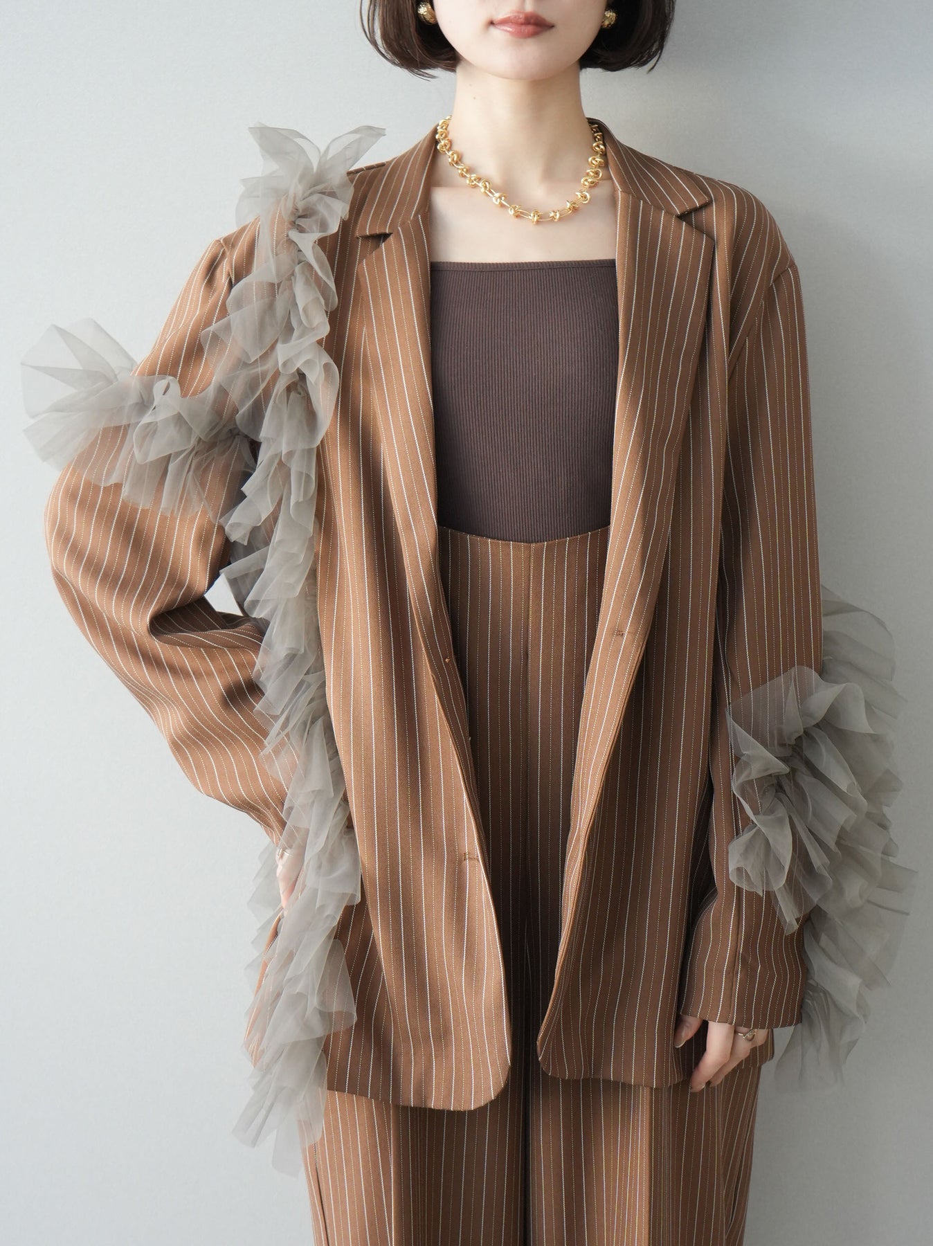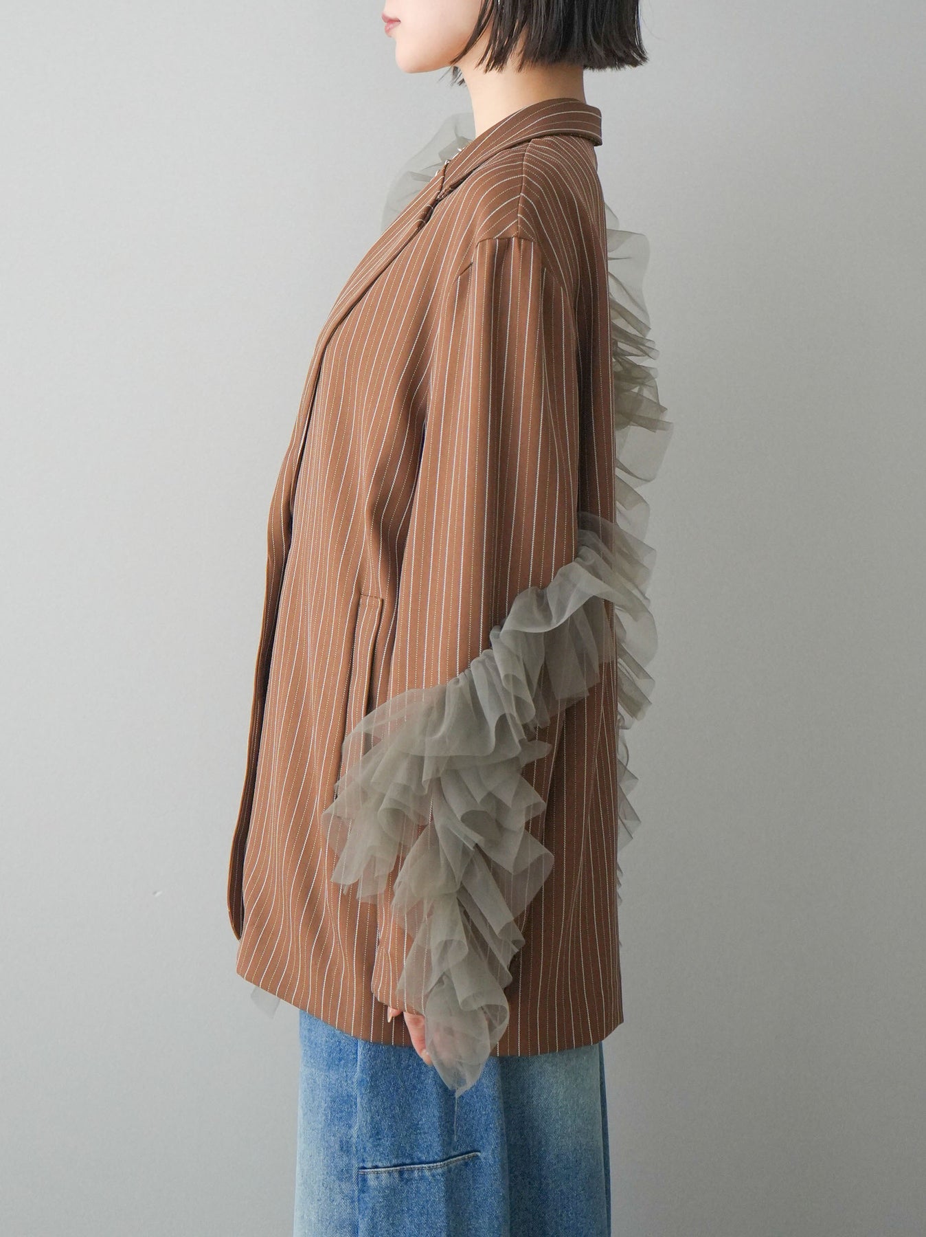 [予約]アシンメトリーチュールストライプジャケット/goldbrown