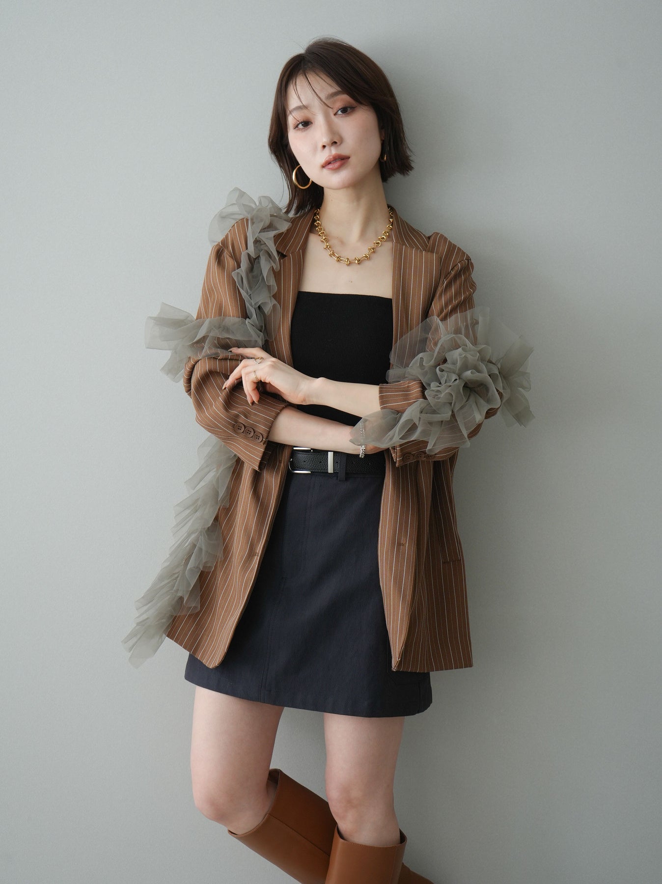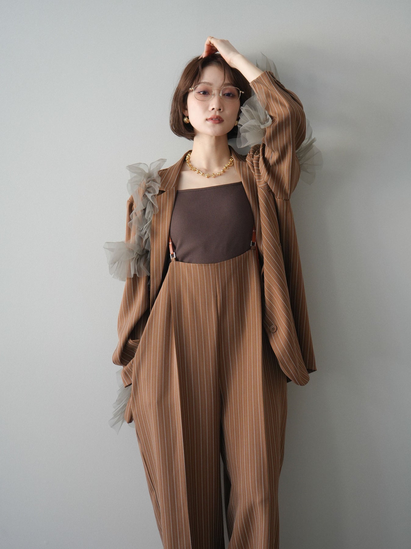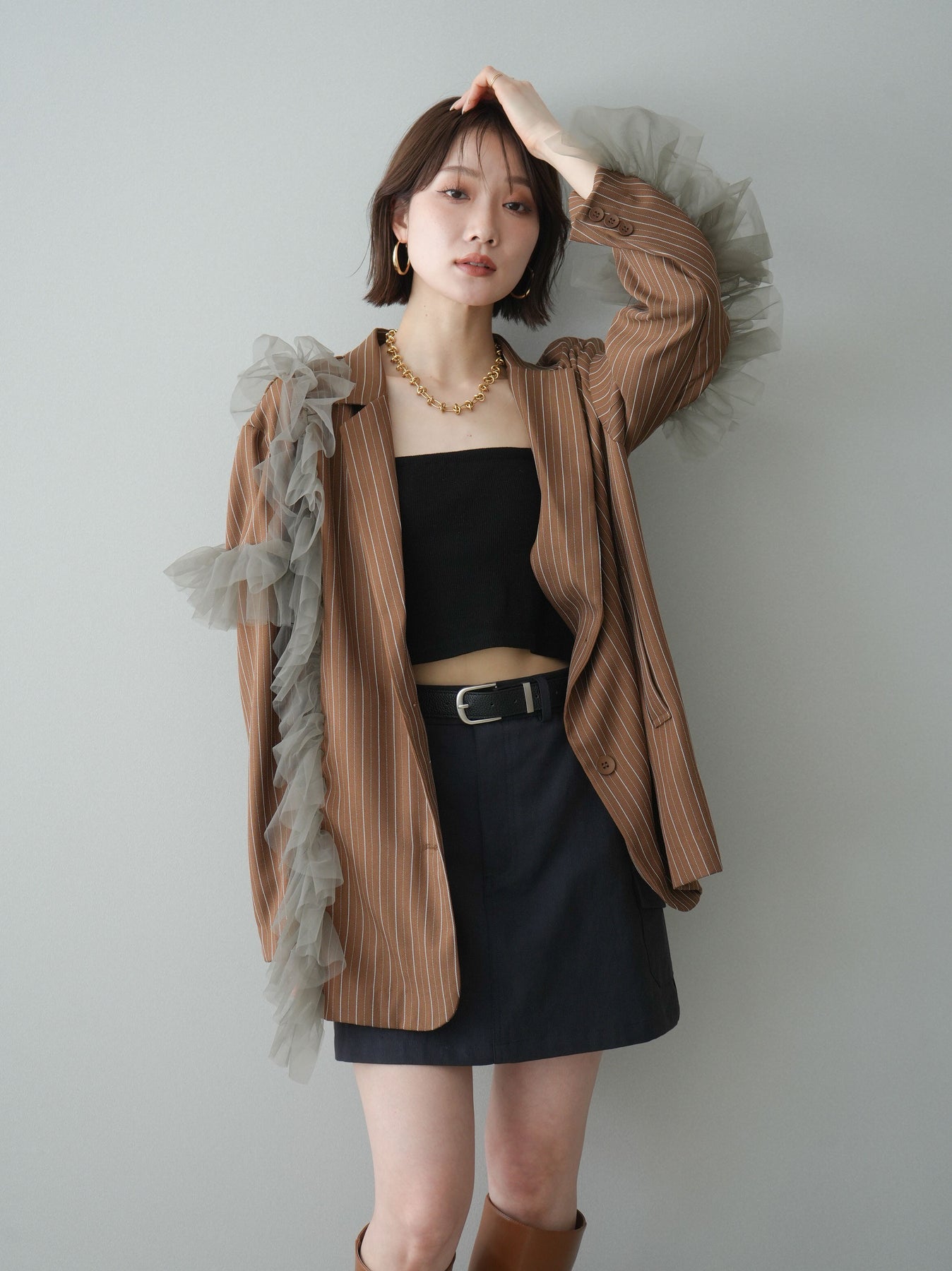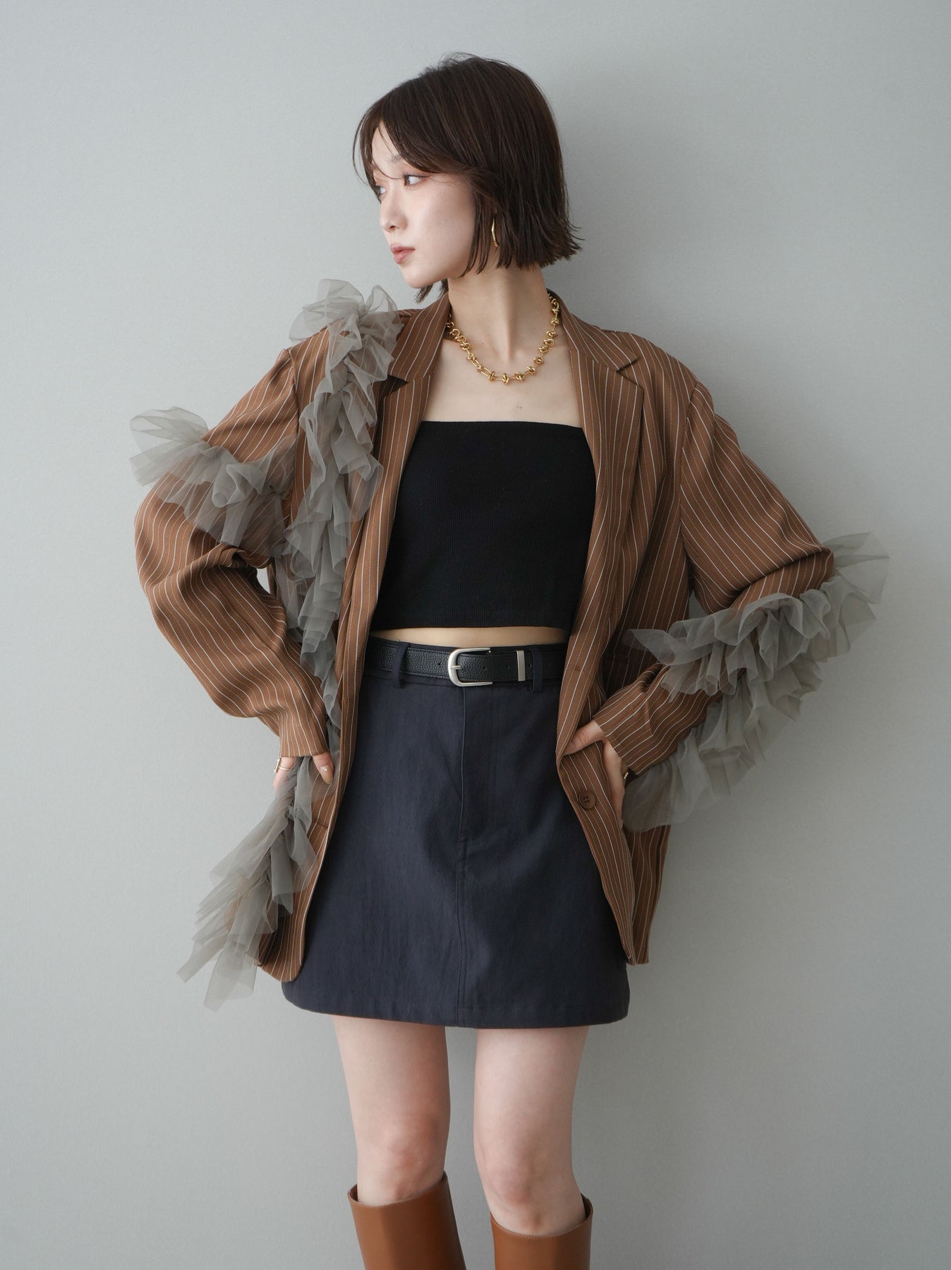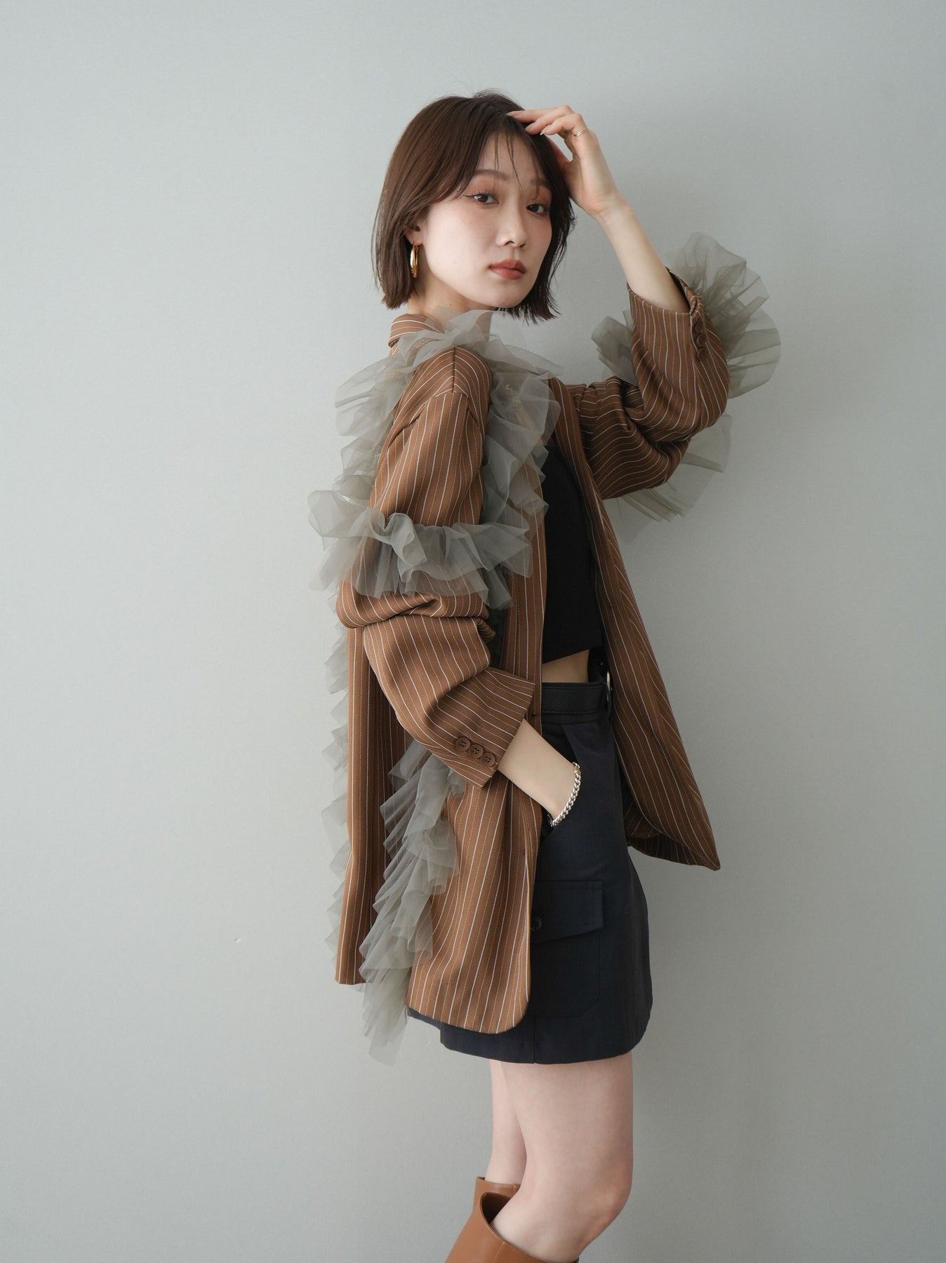 [予約]アシンメトリーチュールストライプジャケット/goldbrown