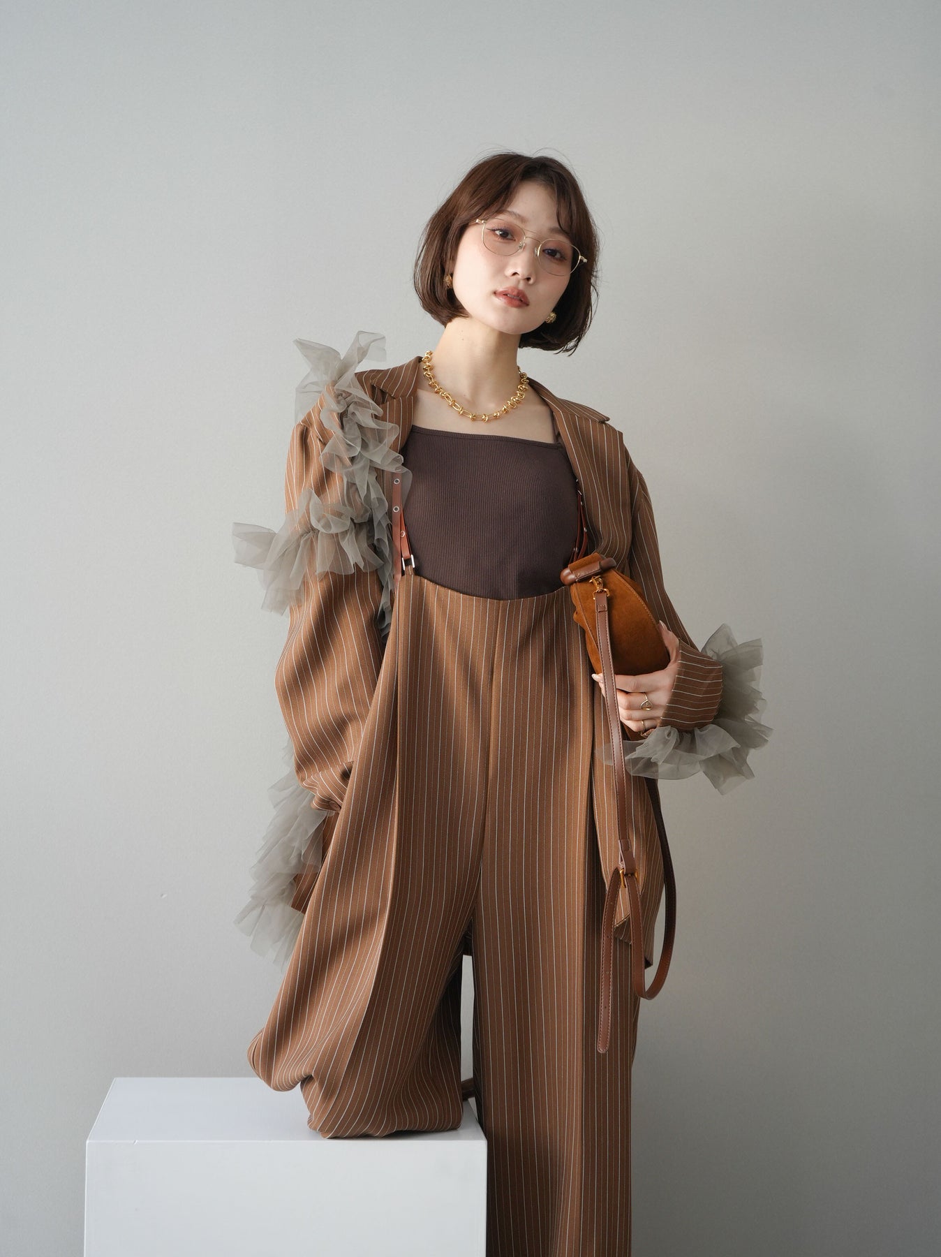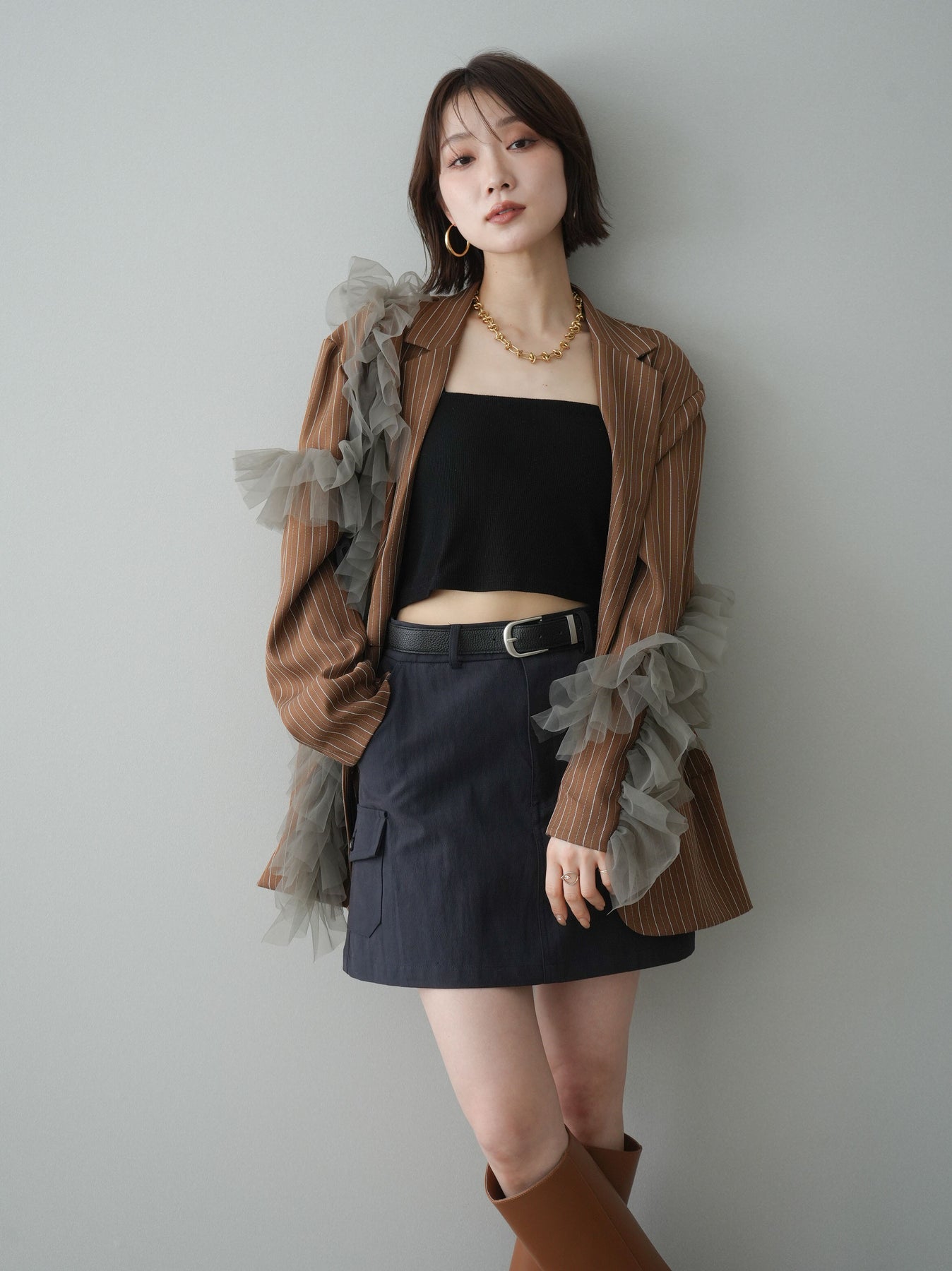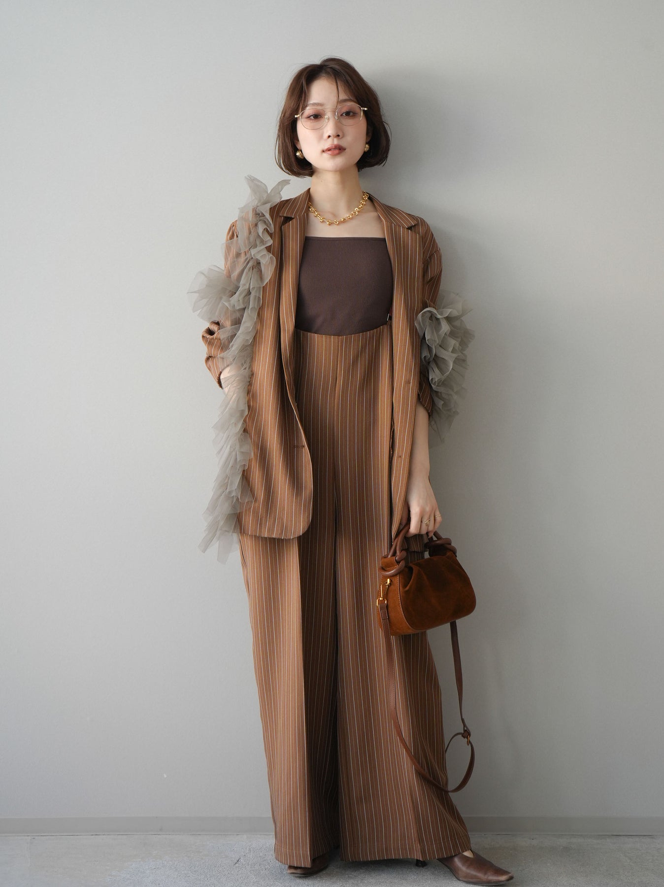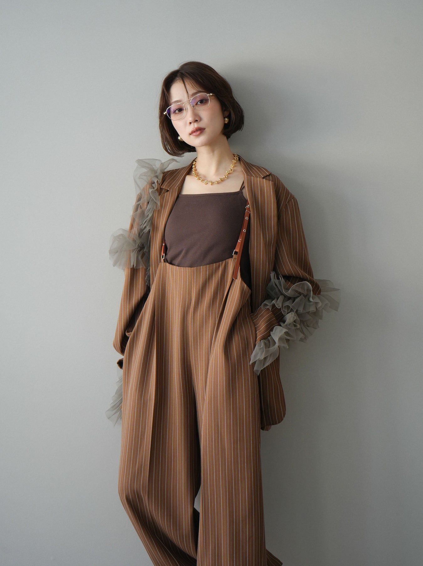 [予約]アシンメトリーチュールストライプジャケット/goldbrown