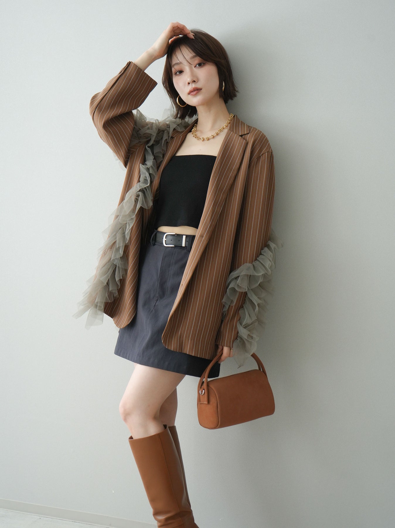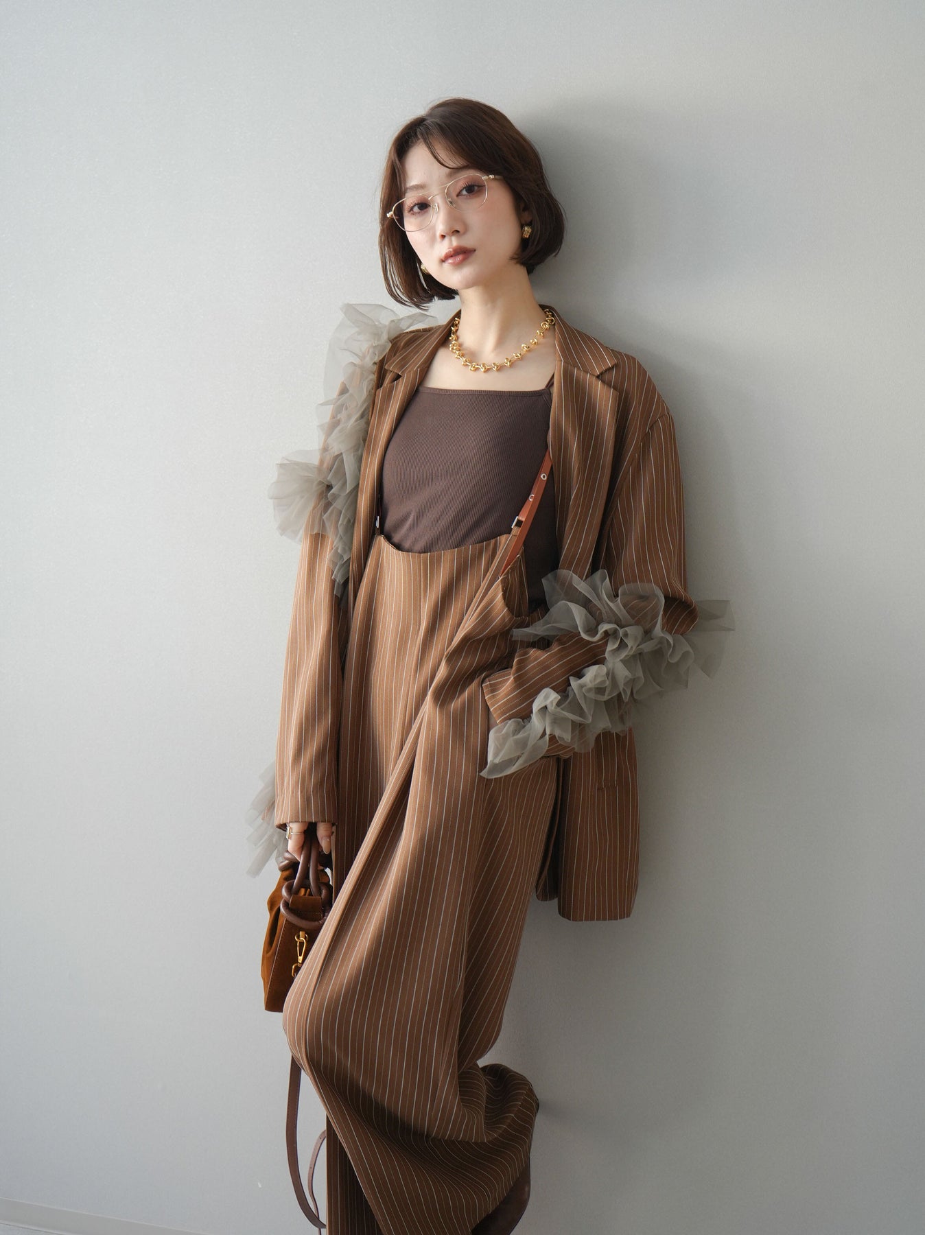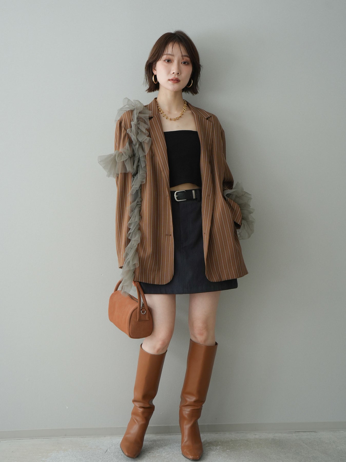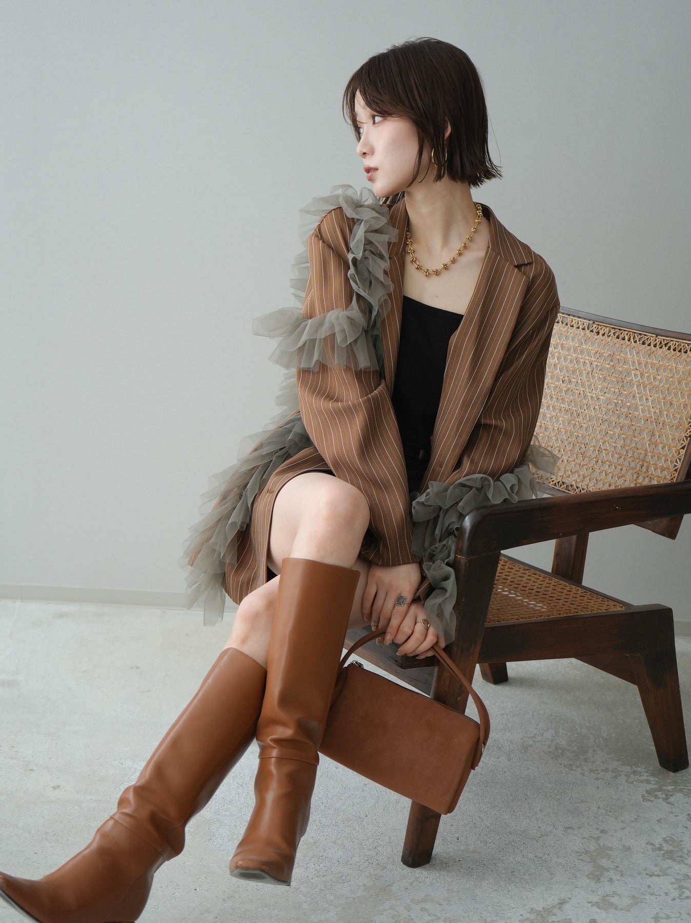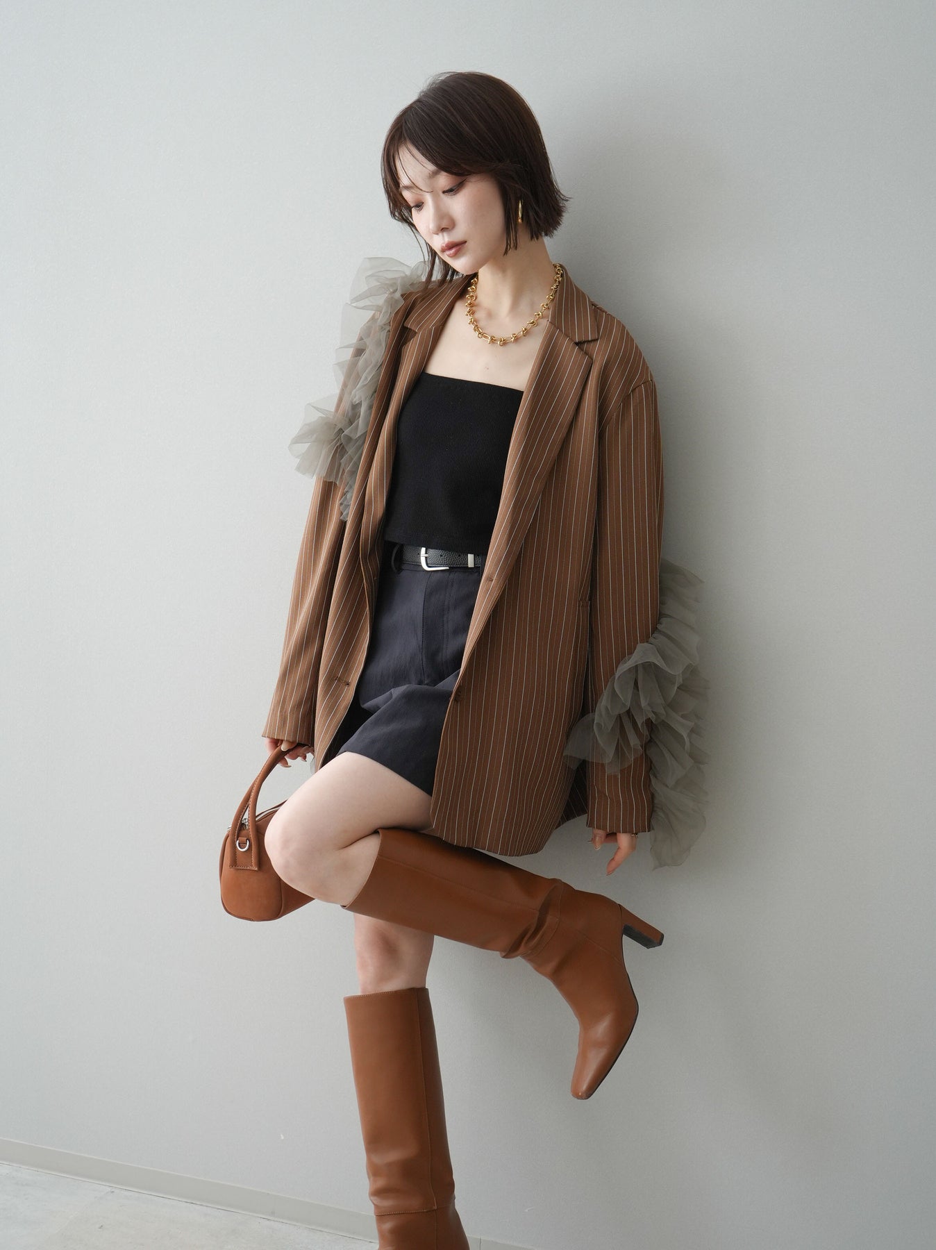 [予約]アシンメトリーチュールストライプジャケット/goldbrown