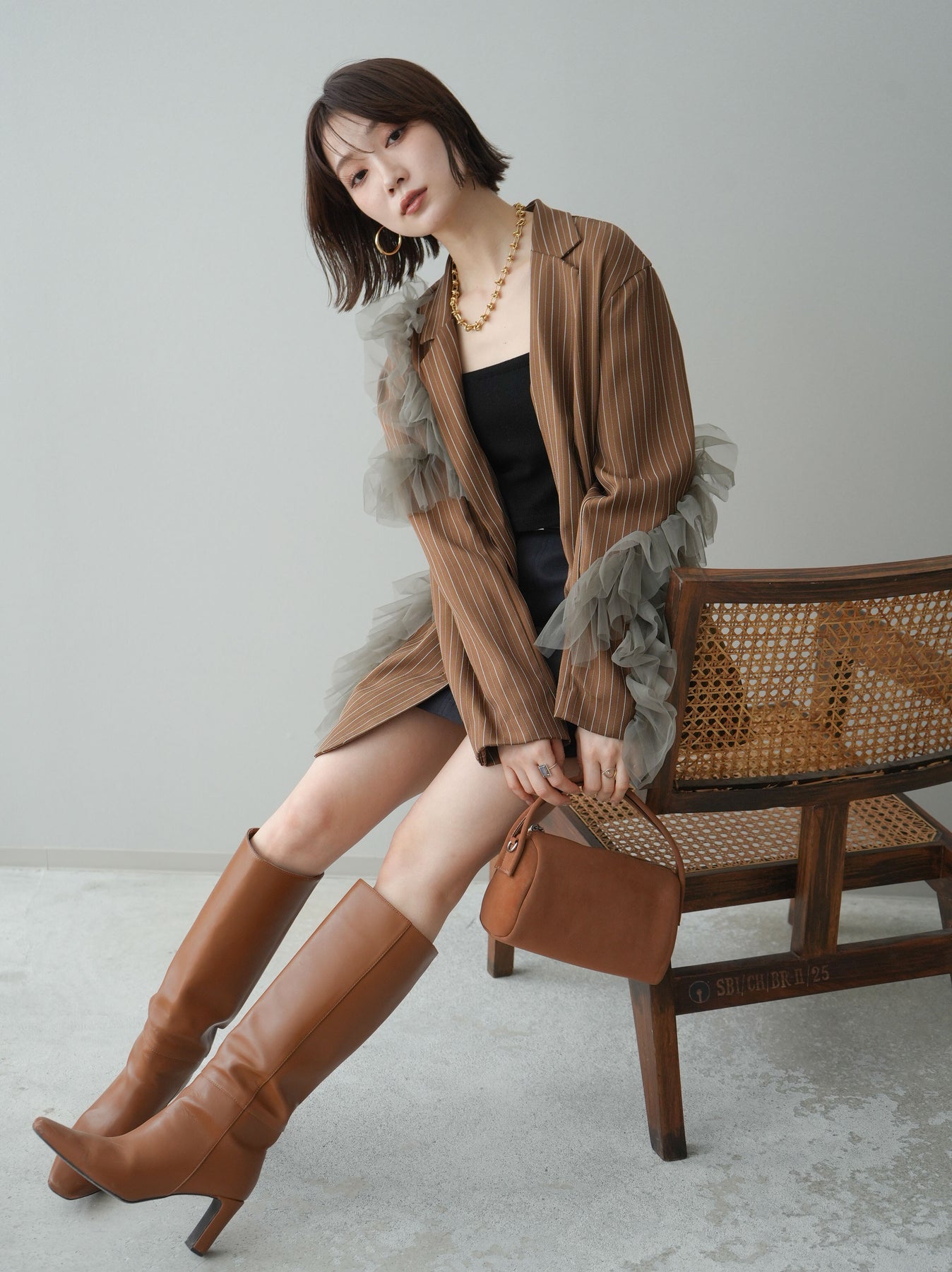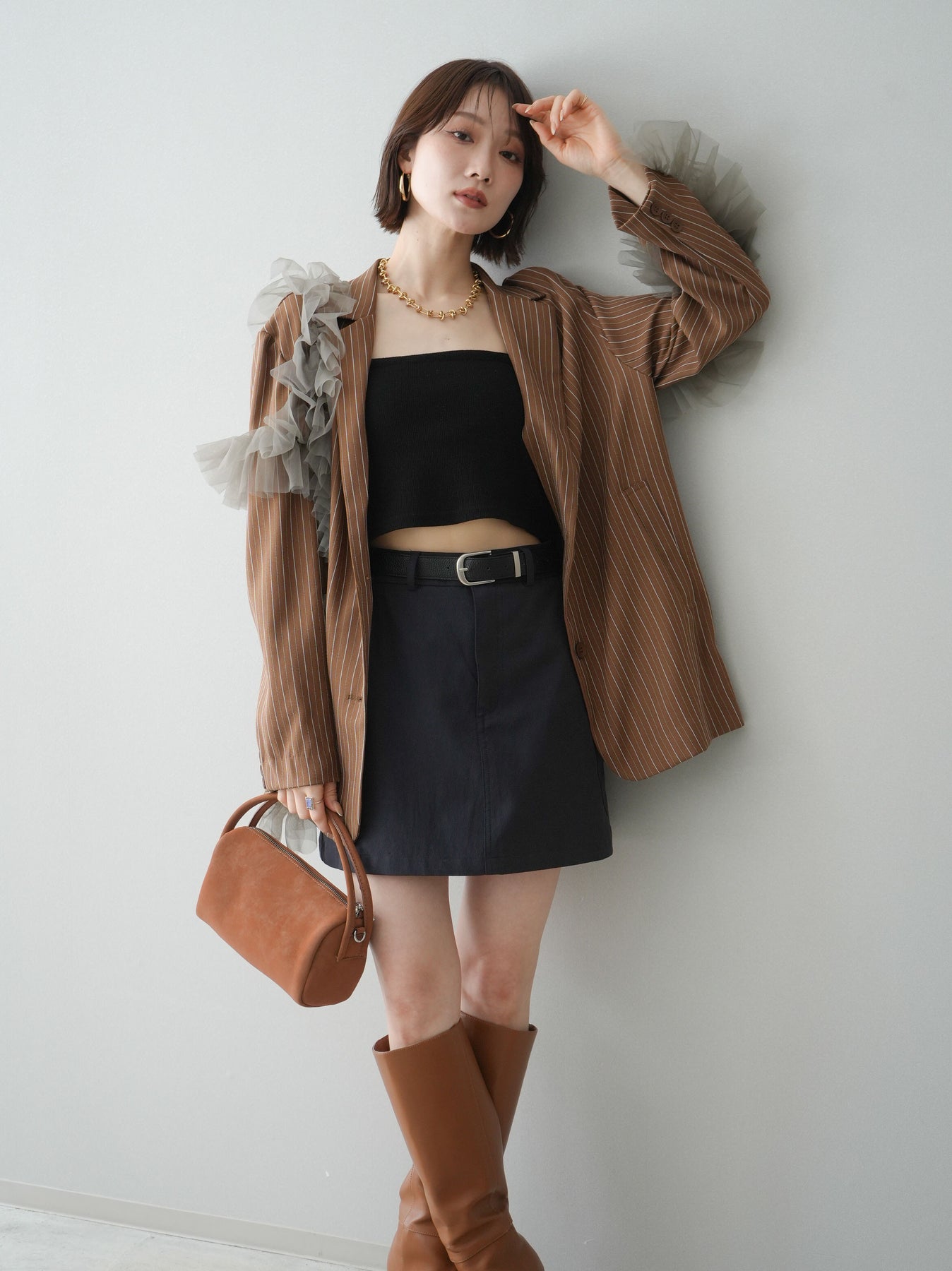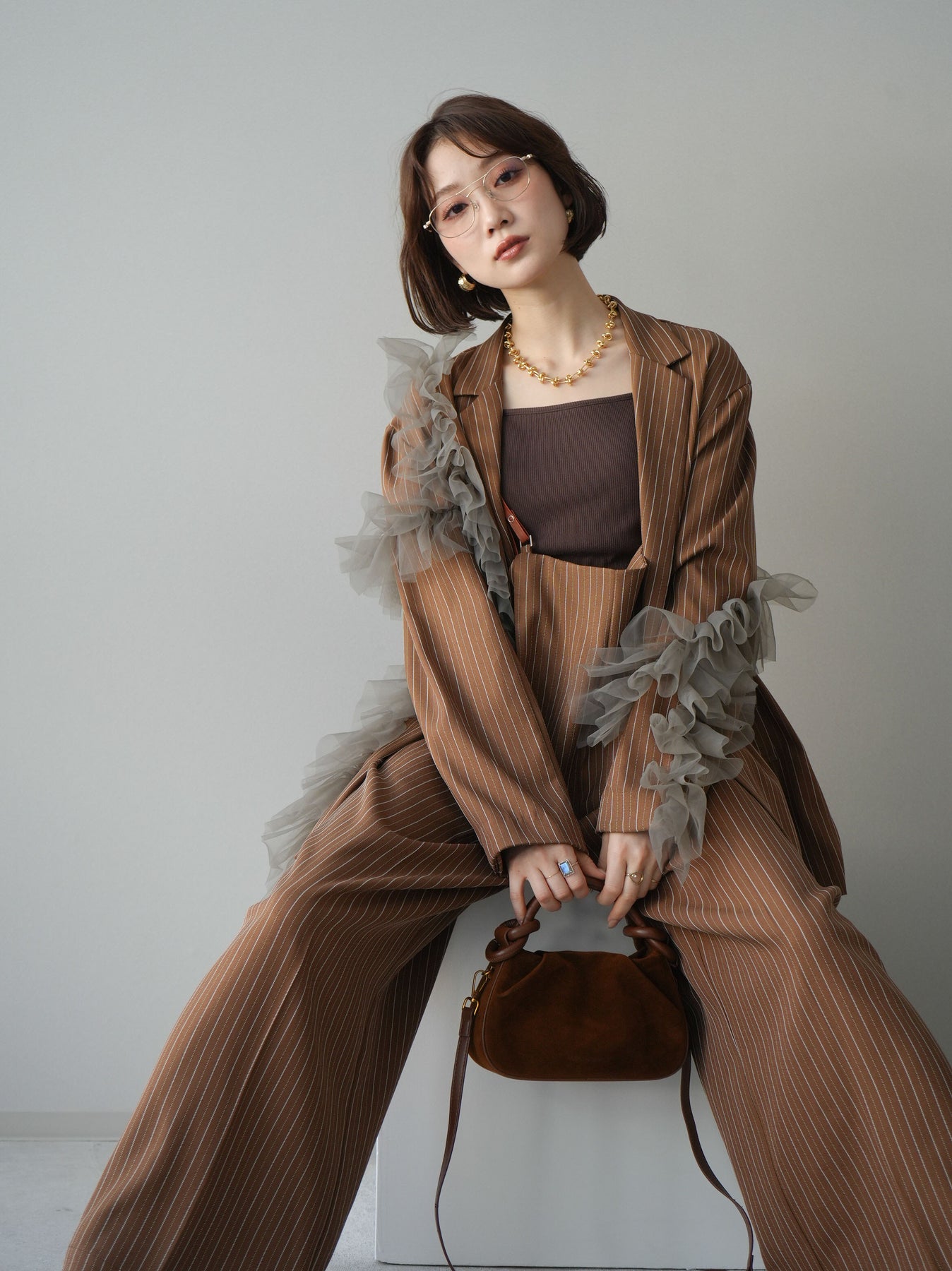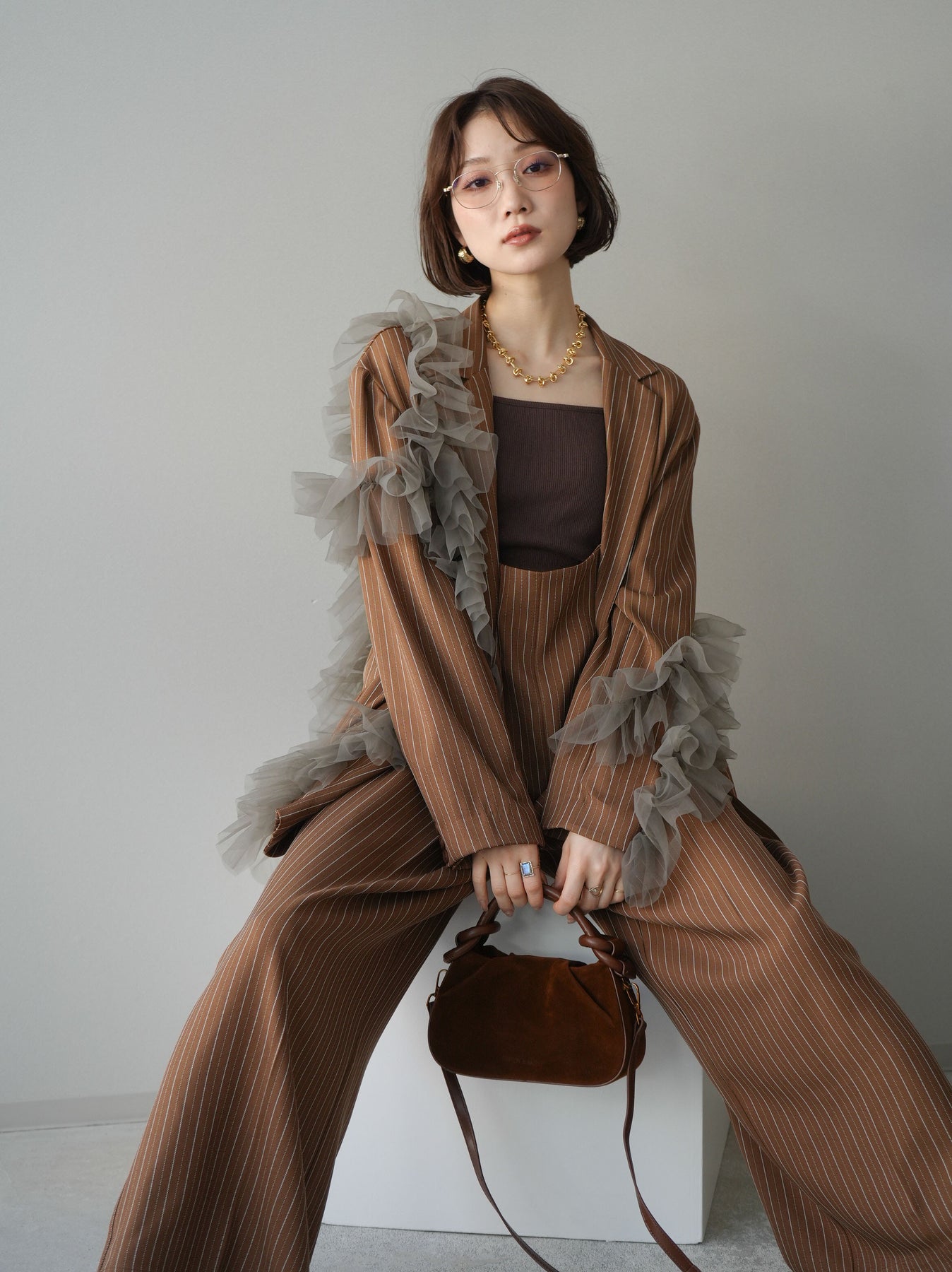 [予約]アシンメトリーチュールストライプジャケット/goldbrown