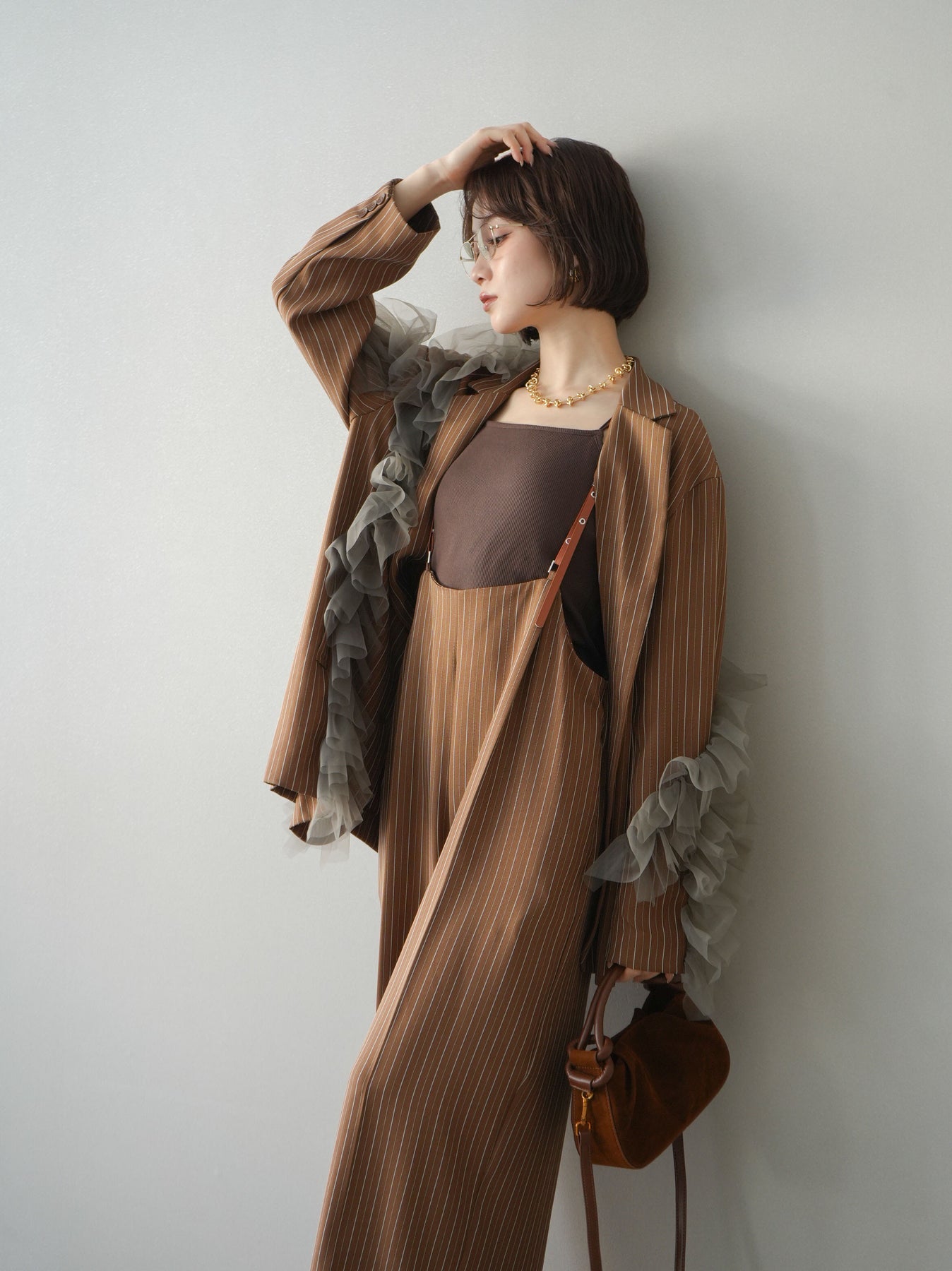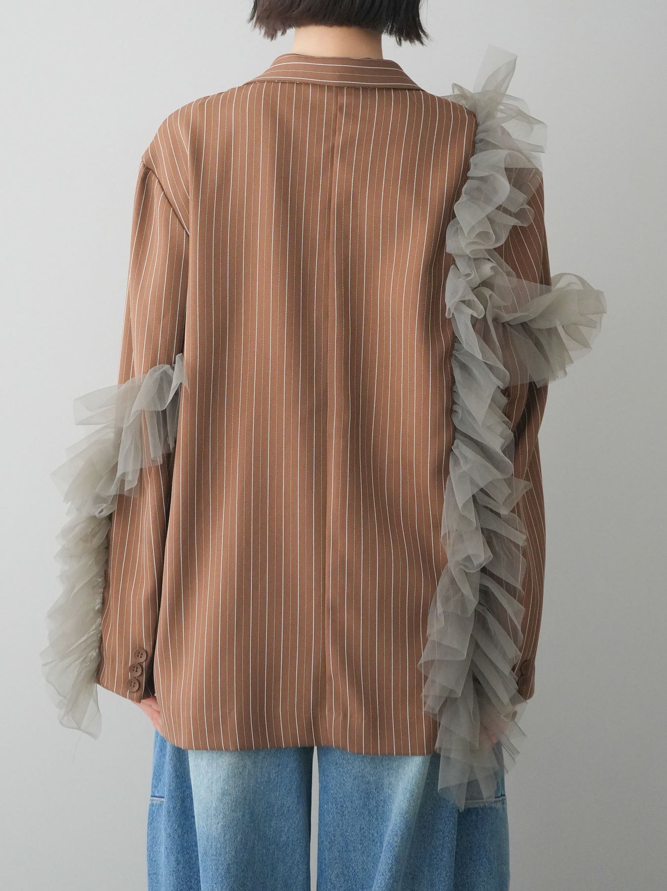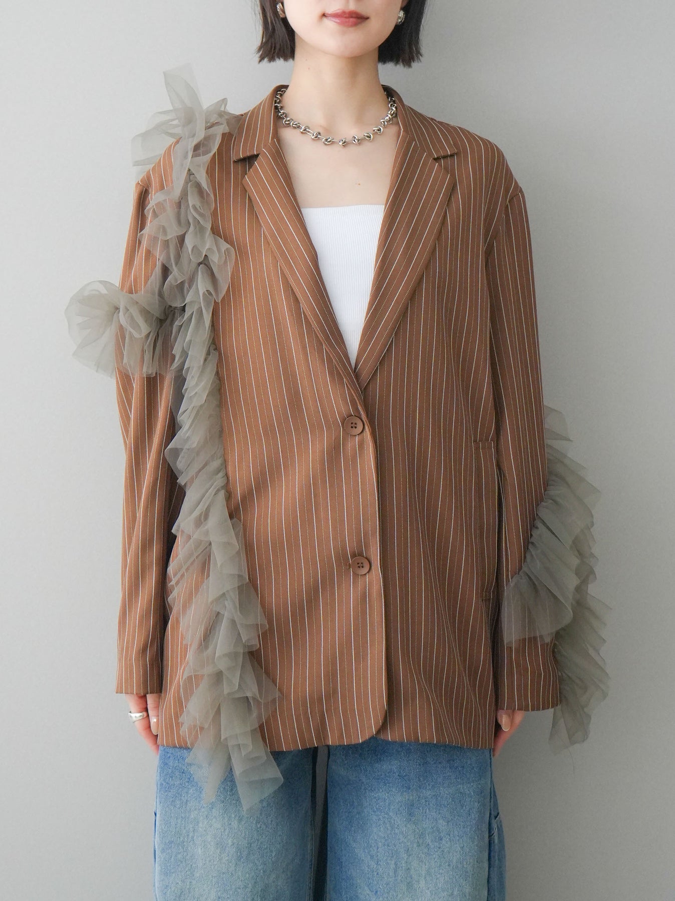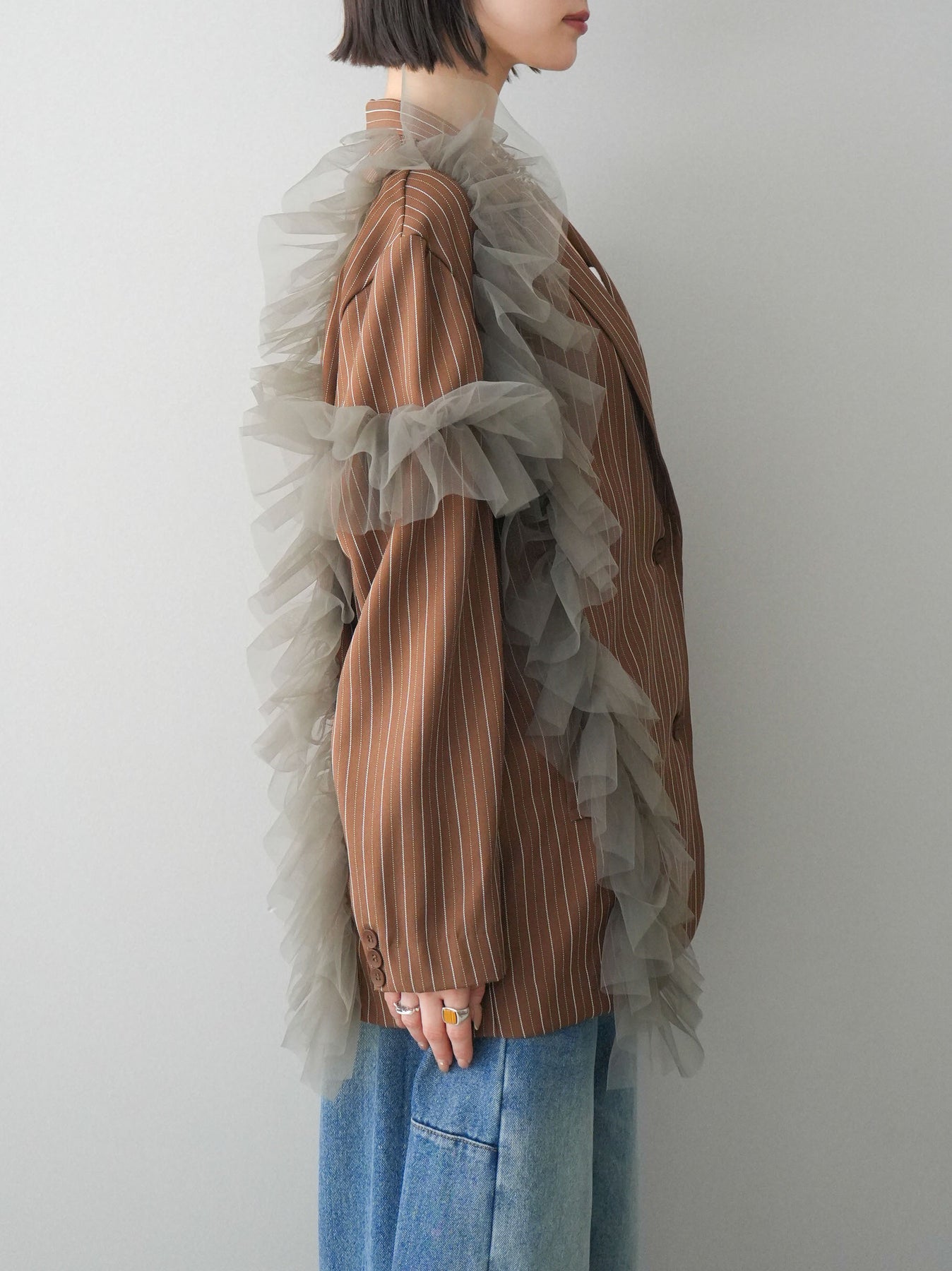クラシカルなストライプ柄に、アシンメトリーにあしらったチュールフリルを重ねたデザインジャケット。マニッシュなテーラードシルエットに、立体感のあるチュールを組み合わせることで、モードな華やかさをプラスした一着です。縦ラインを強調するストライプがすっきりとした印象を与え、ゆとりのあるシルエットで抜け感も演出。さっと羽織るだけでコーディネートの主役になり、シンプルなインナーやボトムスと合わせるだけでも洗練されたスタイリングが完成します。デニムやスラックスと合わせた大人カジュアルから、ワンピースとのレイヤードまで幅広く楽しめる存在感のあるアイテムです。 ※ボトムス、キャミソール(インナー)以外の商品は一律でインナーは付属していません。