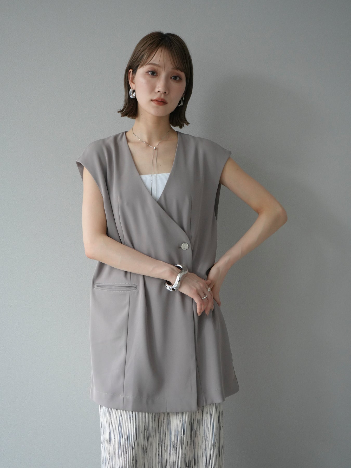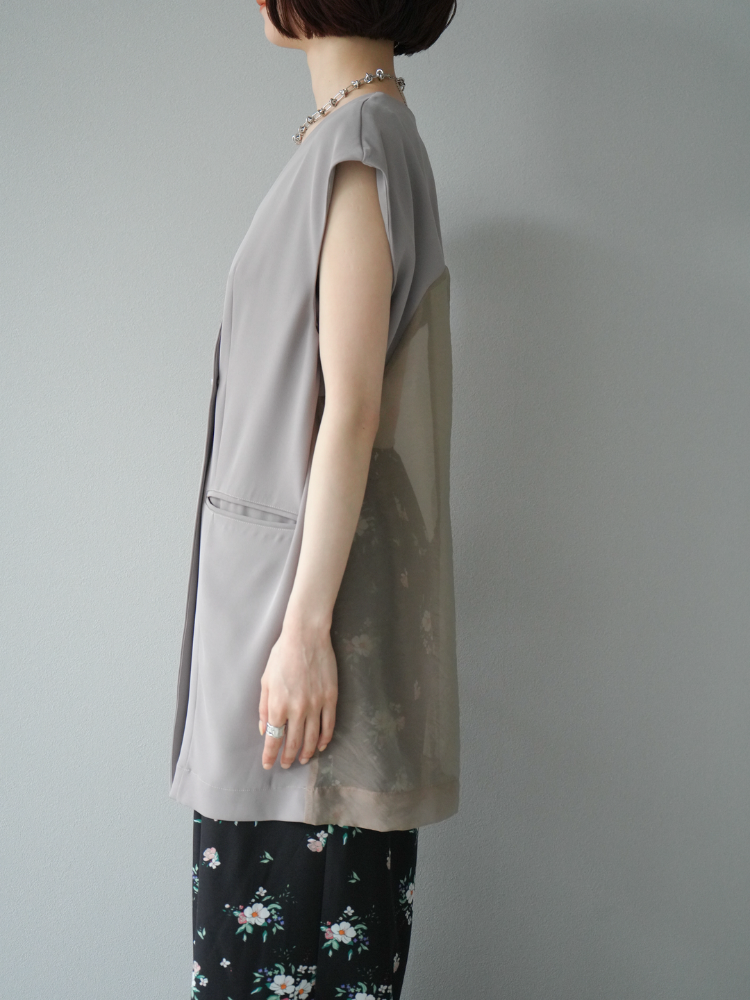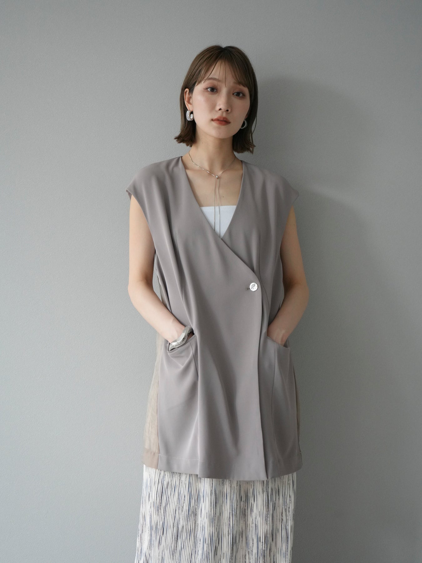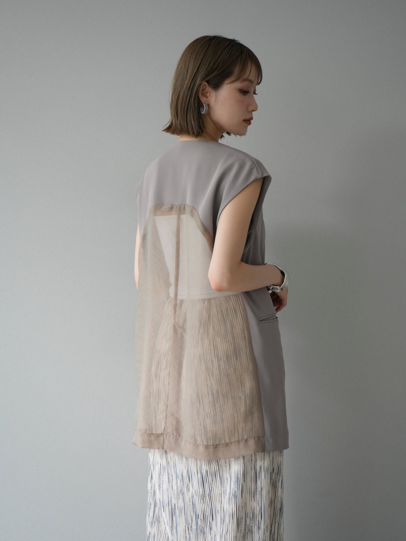 バックスタイルにシアー素材を切り替えた、今季注目のトレンドジレ。程よくゆったりとしたオーバーシルエットが抜け感を演出し、レイヤードコーデにぴったりな一着です。フロントはマニッシュなテーラード風、バックは軽やかな透け感があり、後ろ姿まで印象的に。パンツにもスカートにも合わせやすく、羽織るだけで旬なスタイルに仕上がります。 ※ボトムス、キャミソール(インナー)以外の商品は一律でインナーは付属していません