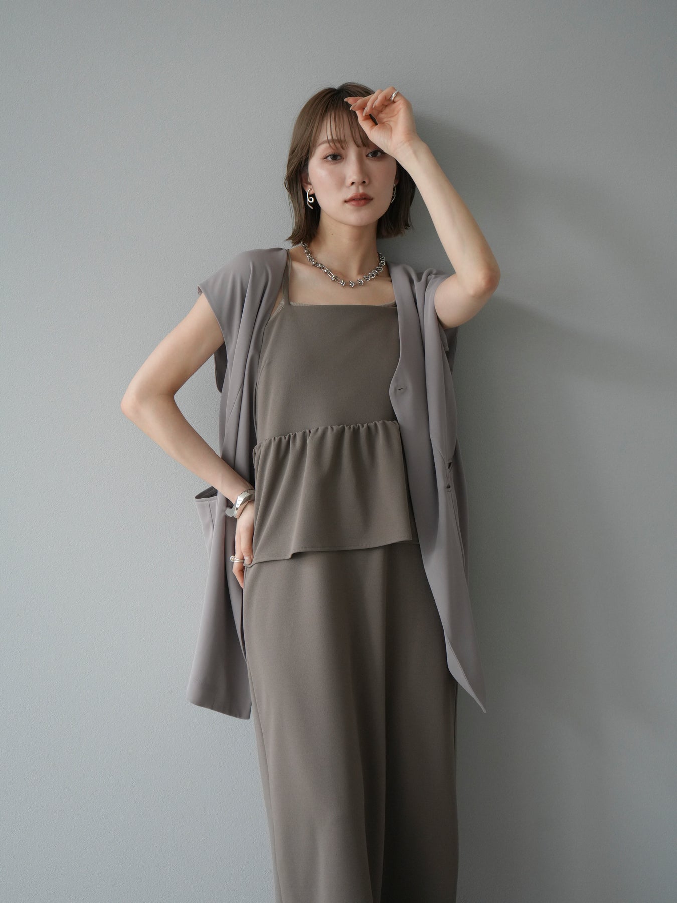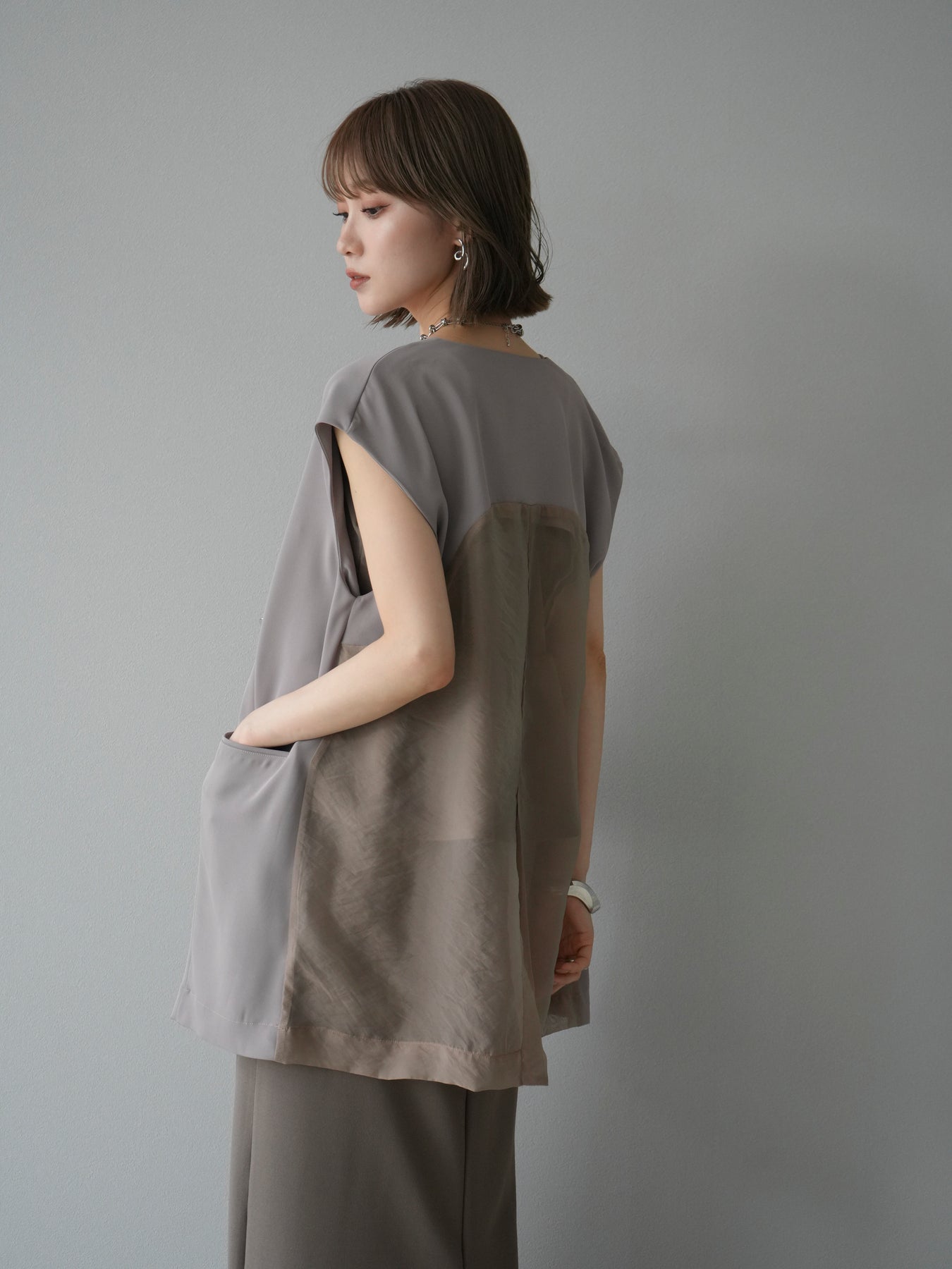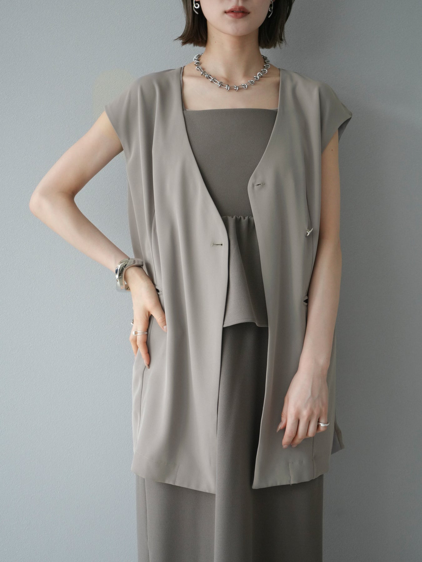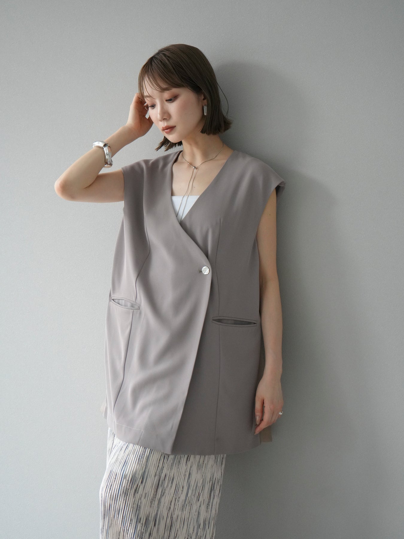 バックスタイルにシアー素材を切り替えた、今季注目のトレンドジレ。程よくゆったりとしたオーバーシルエットが抜け感を演出し、レイヤードコーデにぴったりな一着です。フロントはマニッシュなテーラード風、バックは軽やかな透け感があり、後ろ姿まで印象的に。パンツにもスカートにも合わせやすく、羽織るだけで旬なスタイルに仕上がります。 ※ボトムス、キャミソール(インナー)以外の商品は一律でインナーは付属していません