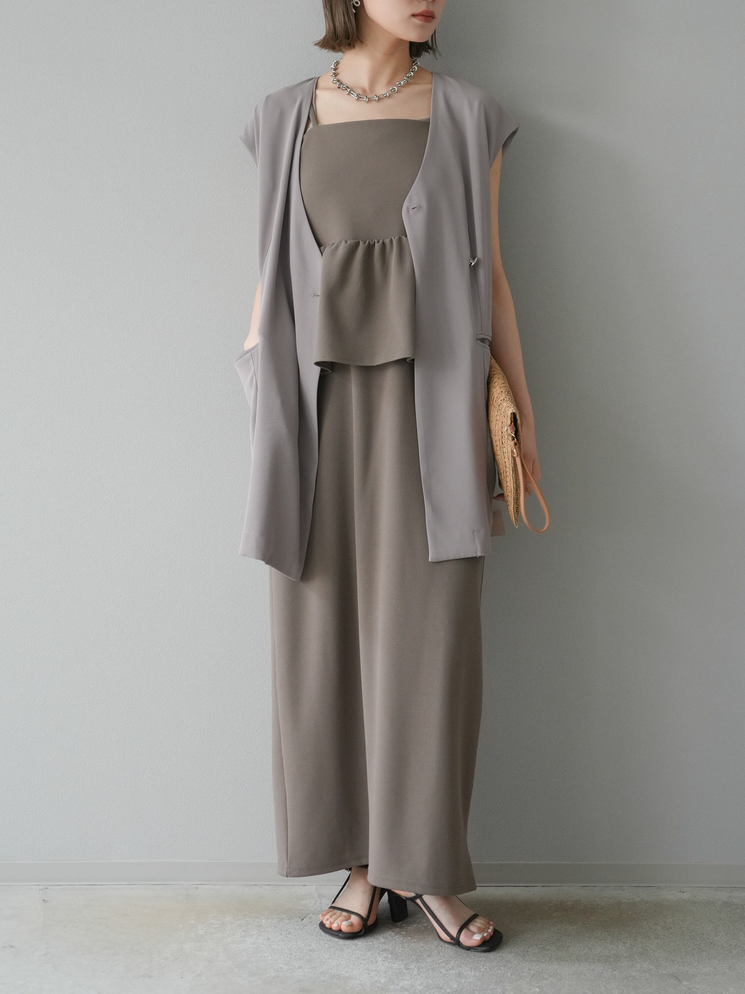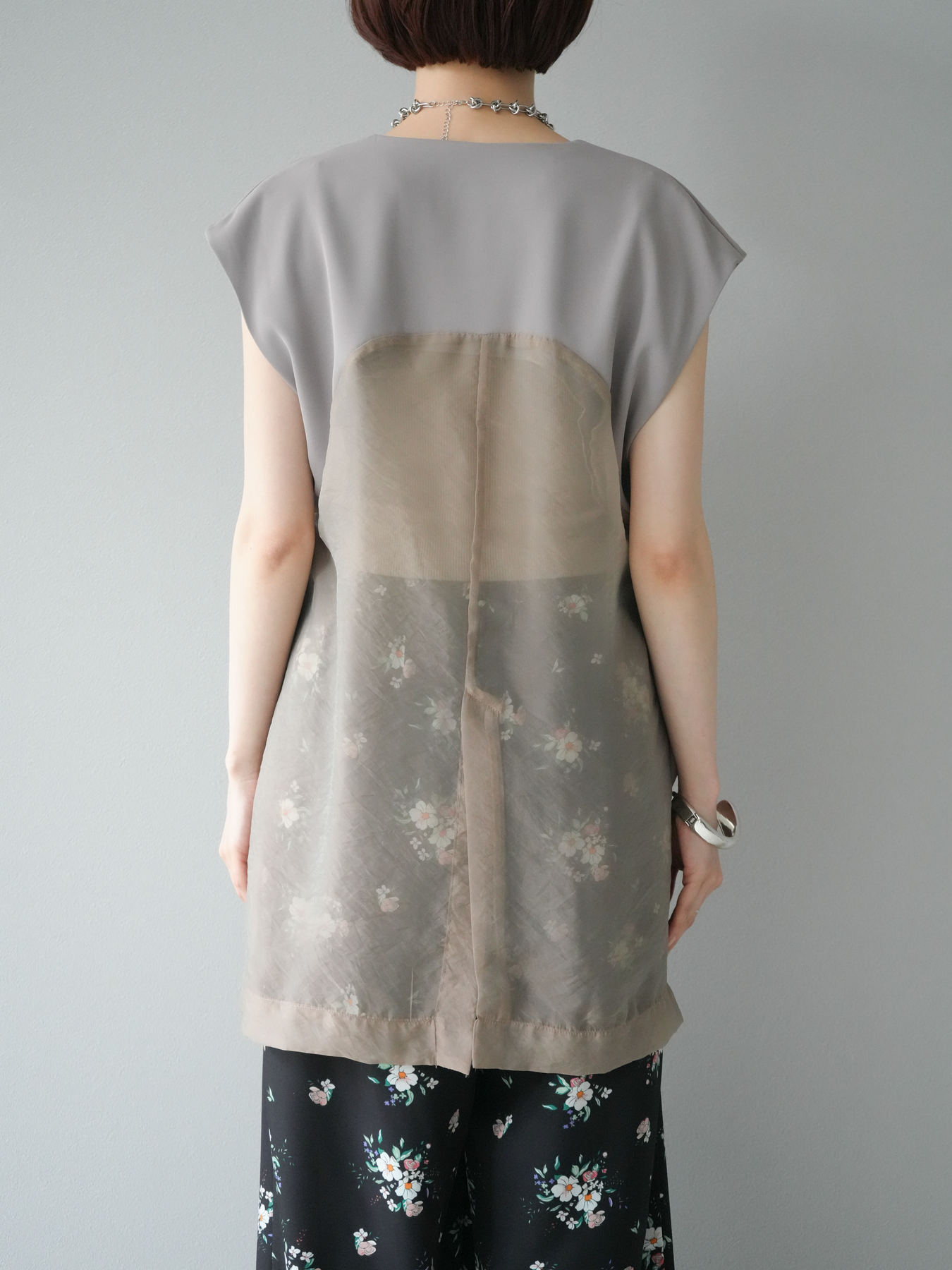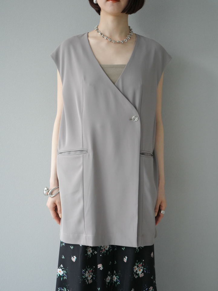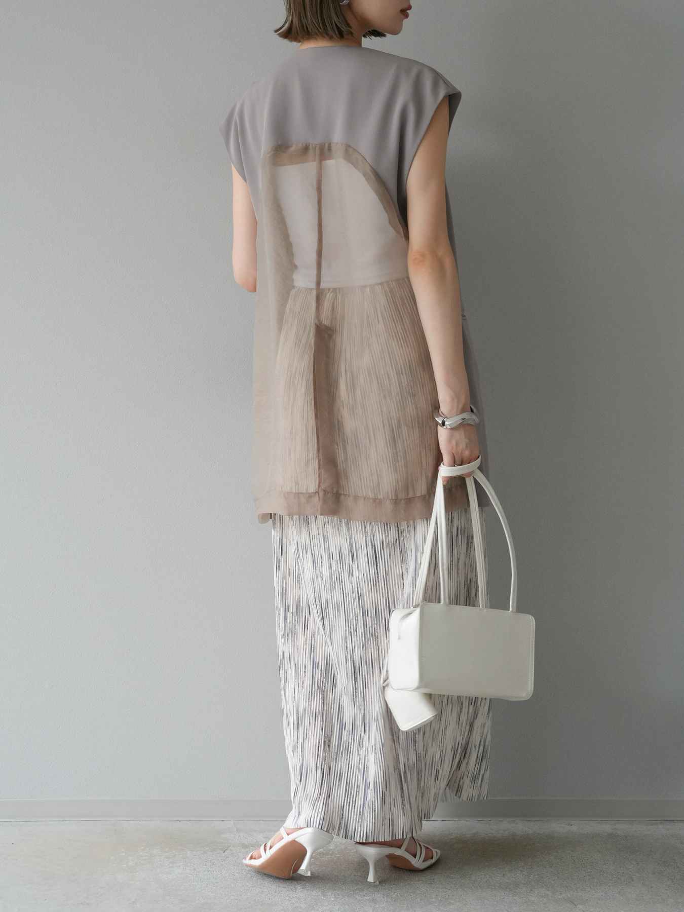 バックスタイルにシアー素材を切り替えた、今季注目のトレンドジレ。程よくゆったりとしたオーバーシルエットが抜け感を演出し、レイヤードコーデにぴったりな一着です。フロントはマニッシュなテーラード風、バックは軽やかな透け感があり、後ろ姿まで印象的に。パンツにもスカートにも合わせやすく、羽織るだけで旬なスタイルに仕上がります。 ※ボトムス、キャミソール(インナー)以外の商品は一律でインナーは付属していません