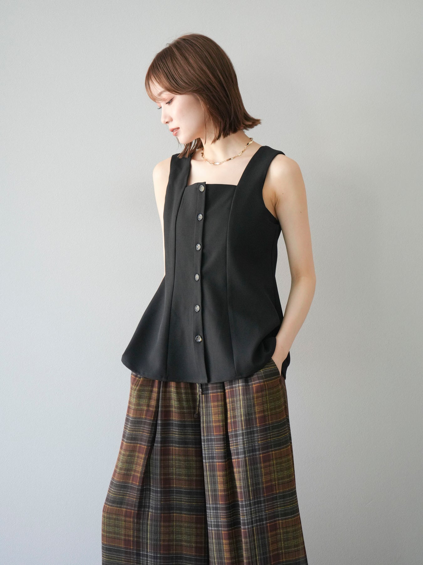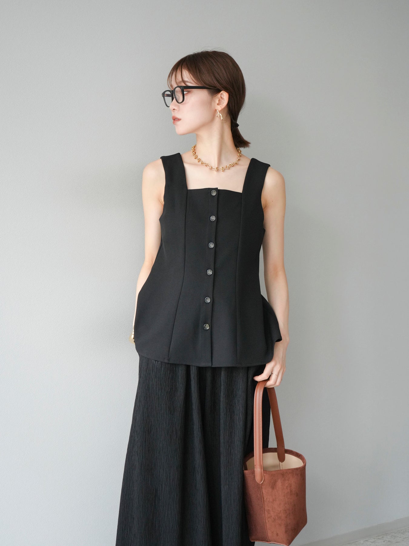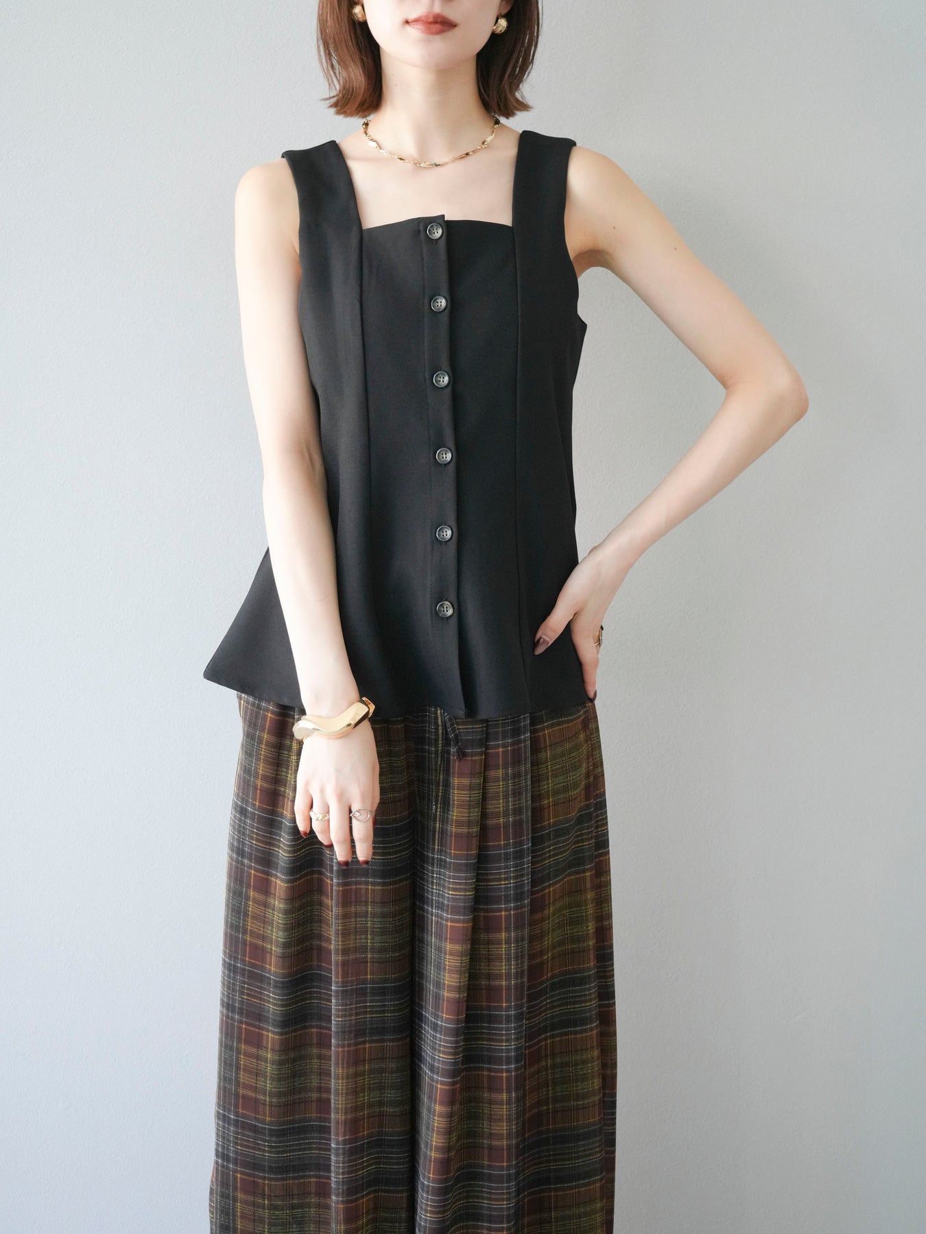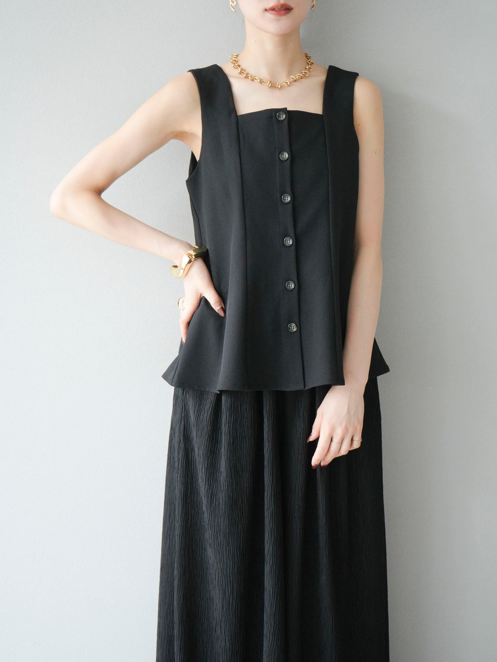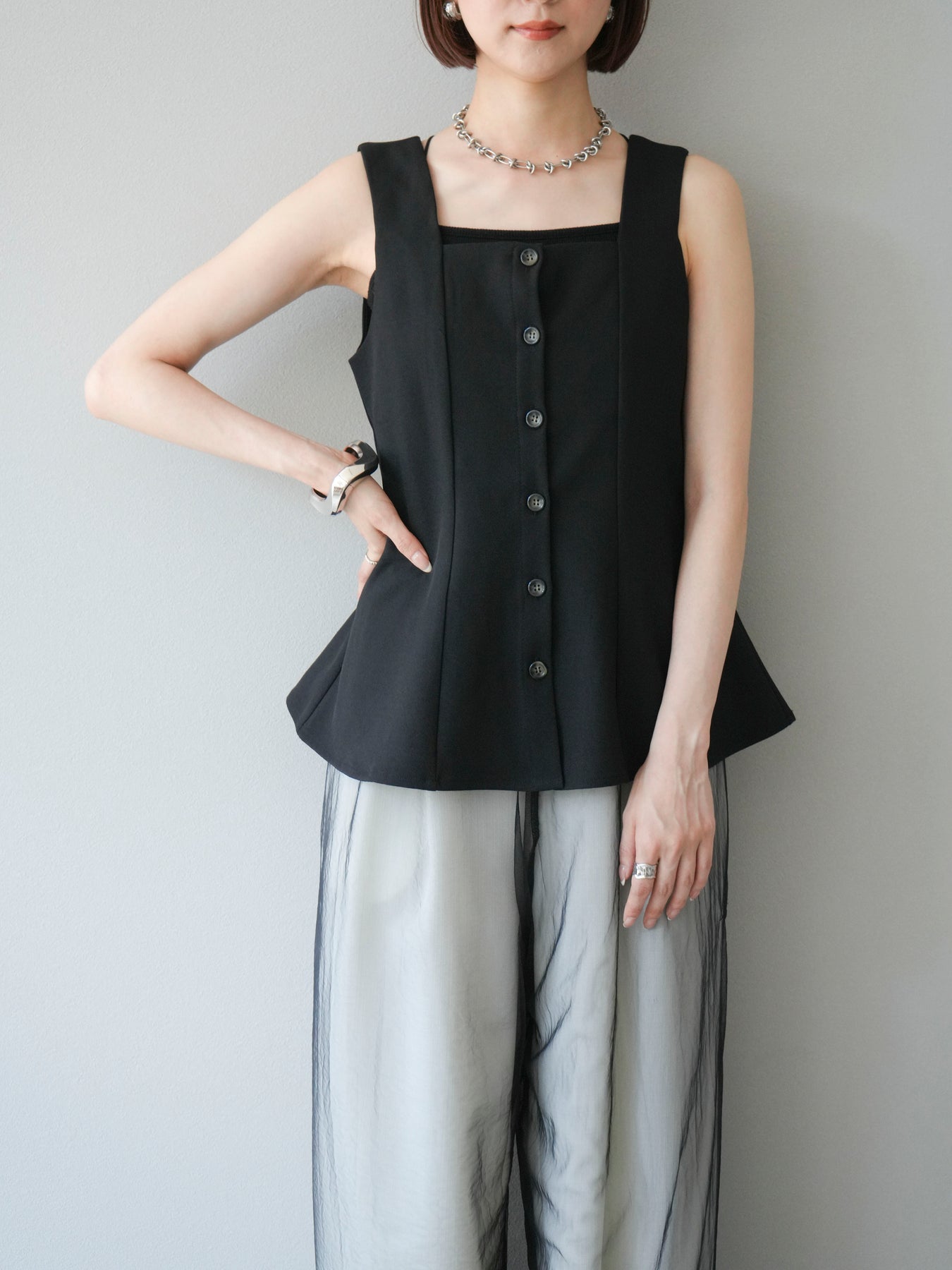 ウエストからふわりと広がるぺプラムシルエットが、スタイルアップを叶えながら上品な印象を与えてくれる一枚。スクエアネックとフロントボタンのデザインが、シンプルながらもこなれた雰囲気を演出します。Tシャツやシアートップスとのレイヤードはもちろん、同素材のボトムとセットアップ風に着るのもおすすめ。オンオフ問わず活躍する、着回し力抜群のアイテムです。 ※ボトムス、キャミソール(インナー)以外の商品は一律でインナーは付属していません。