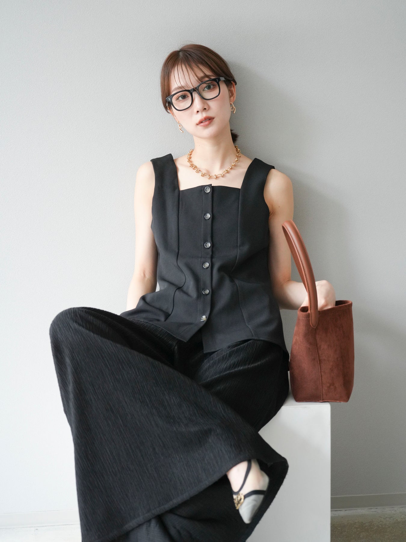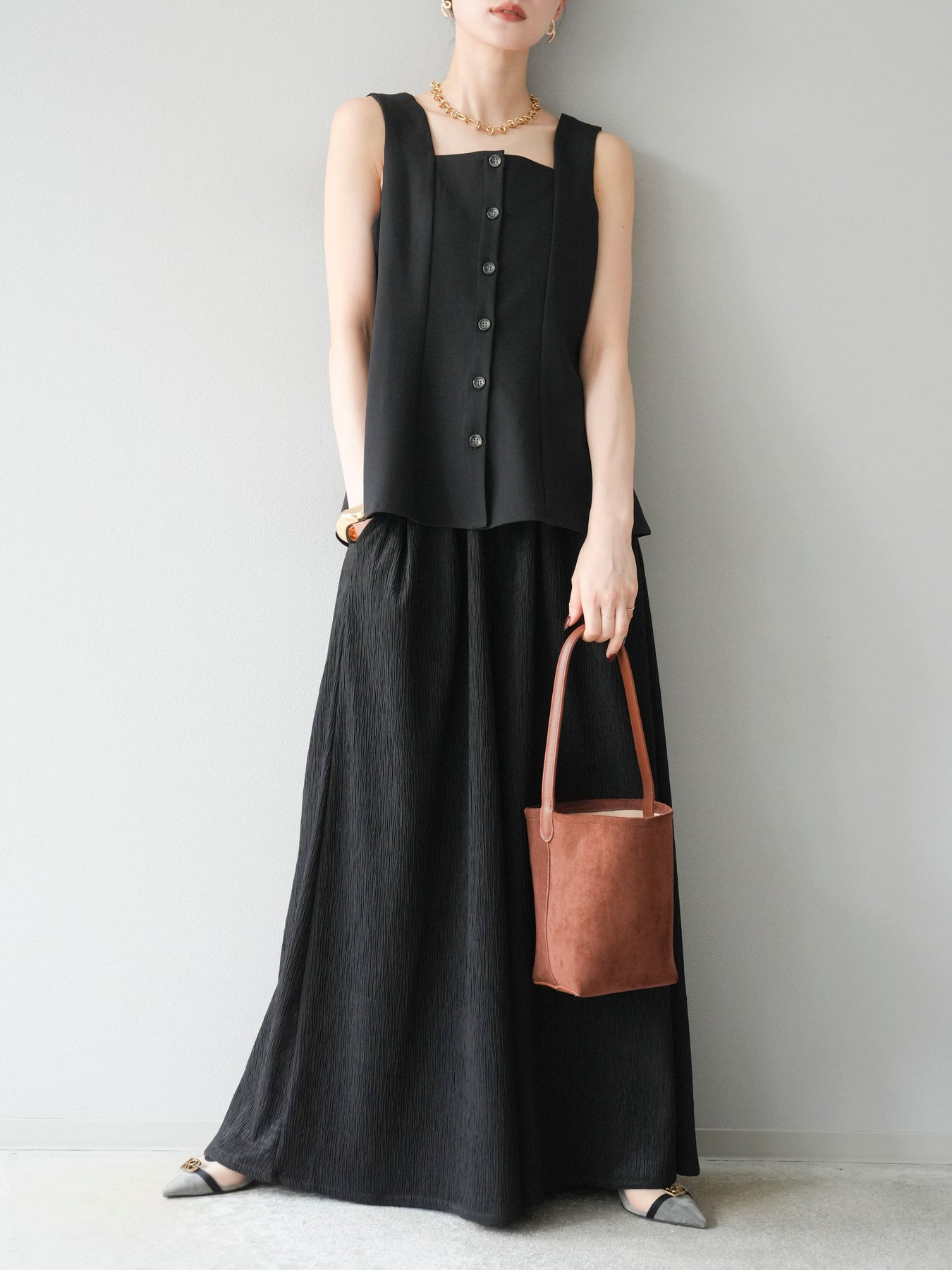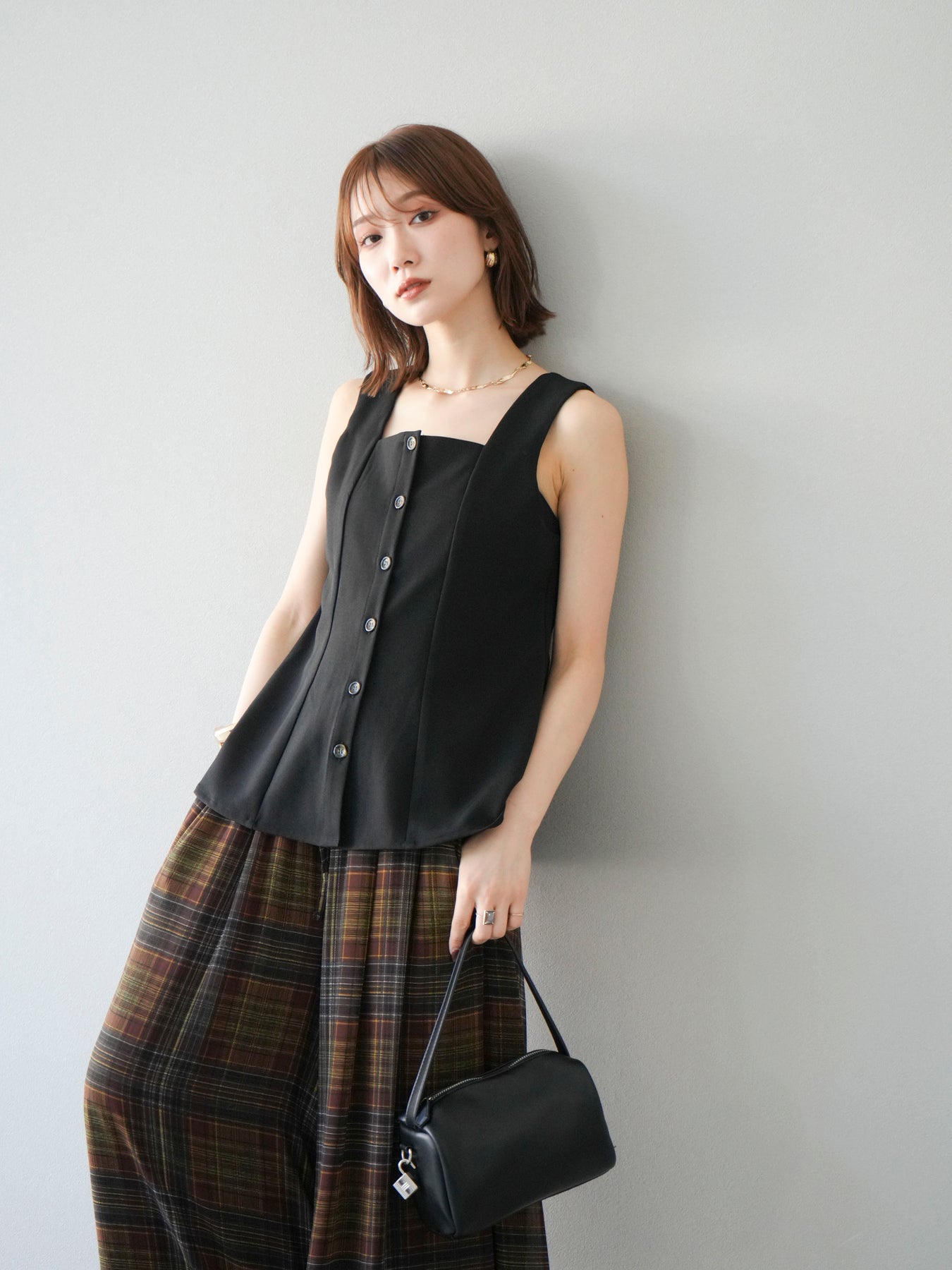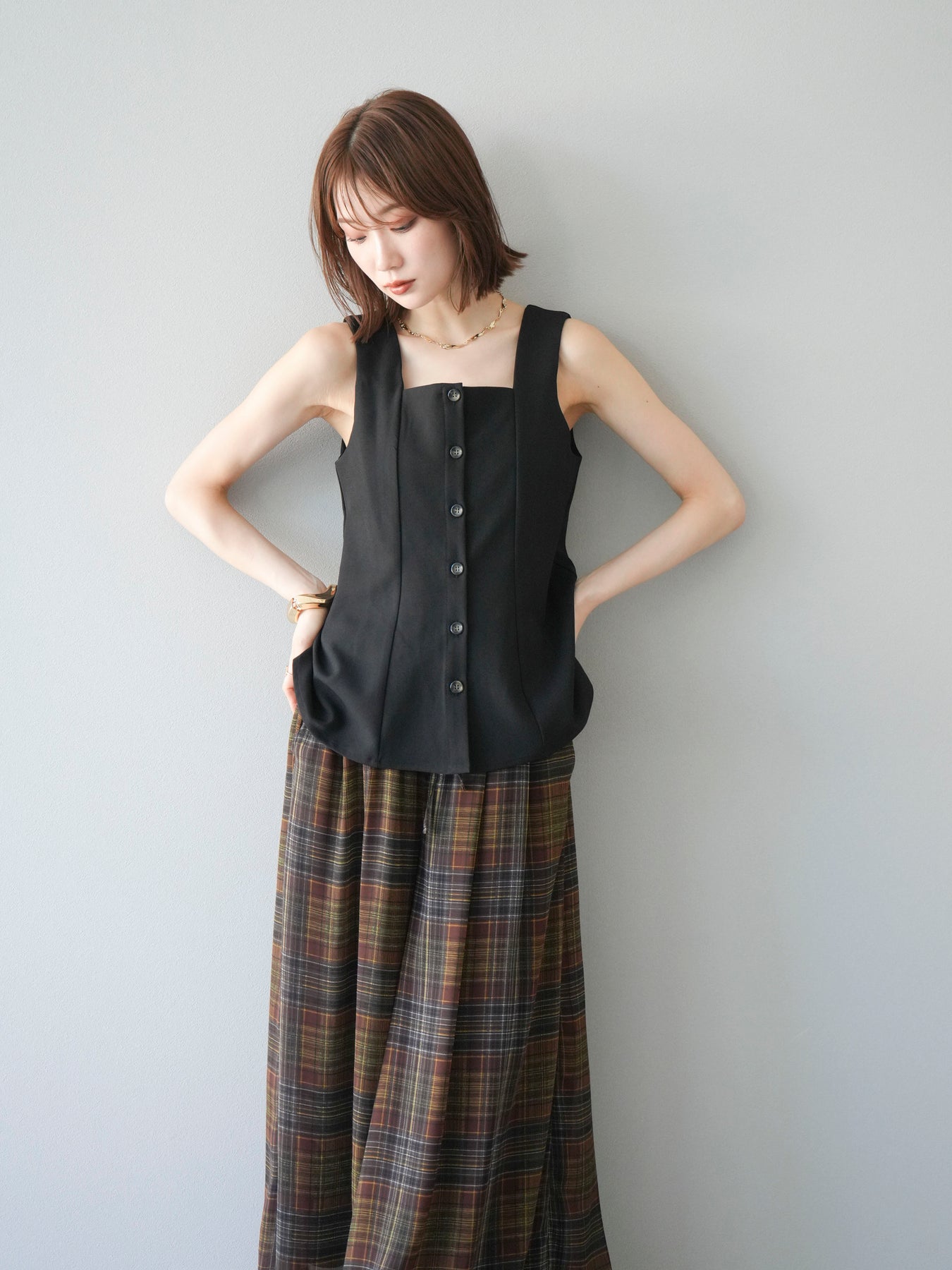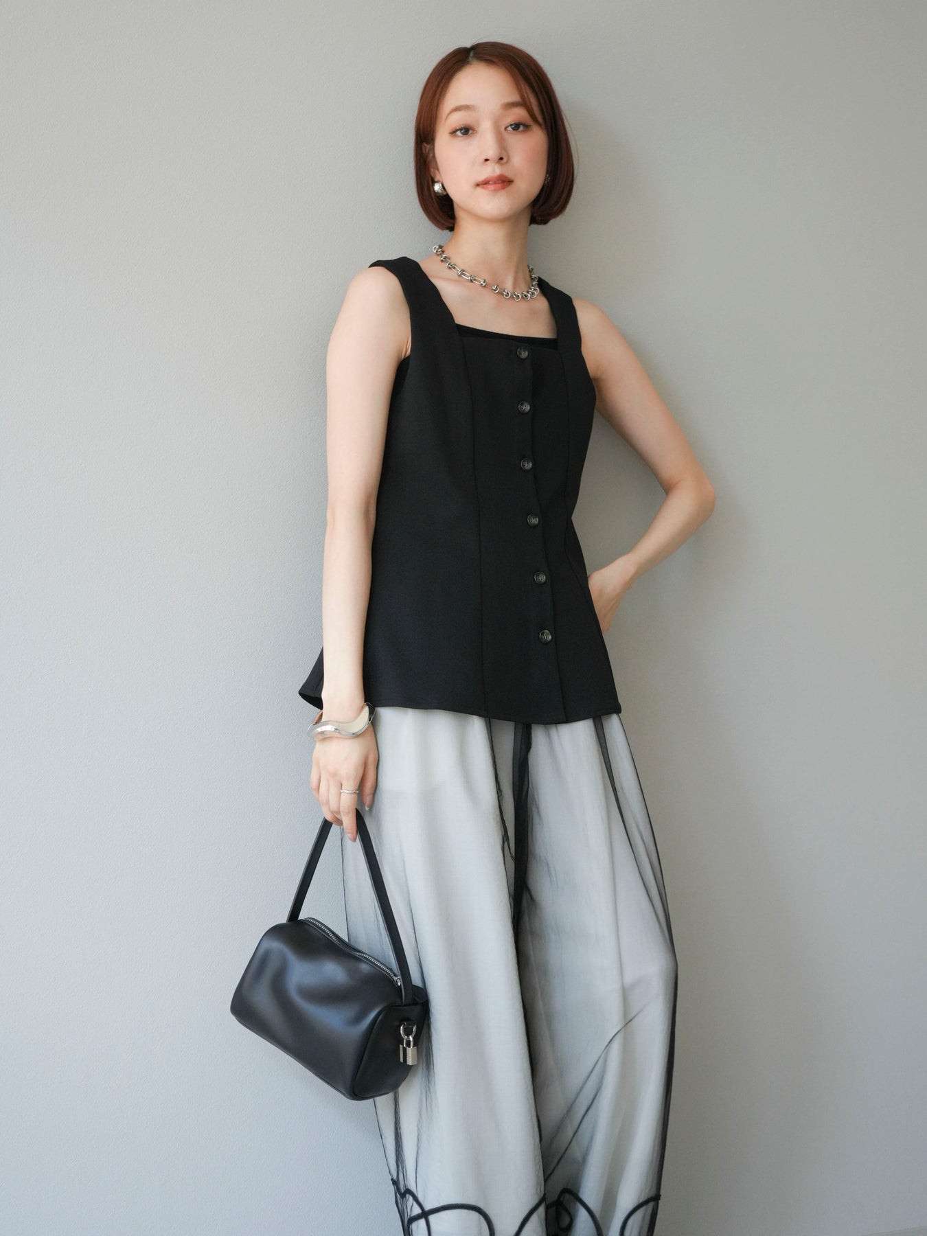ウエストからふわりと広がるぺプラムシルエットが、スタイルアップを叶えながら上品な印象を与えてくれる一枚。スクエアネックとフロントボタンのデザインが、シンプルながらもこなれた雰囲気を演出します。Tシャツやシアートップスとのレイヤードはもちろん、同素材のボトムとセットアップ風に着るのもおすすめ。オンオフ問わず活躍する、着回し力抜群のアイテムです。 ※ボトムス、キャミソール(インナー)以外の商品は一律でインナーは付属していません。