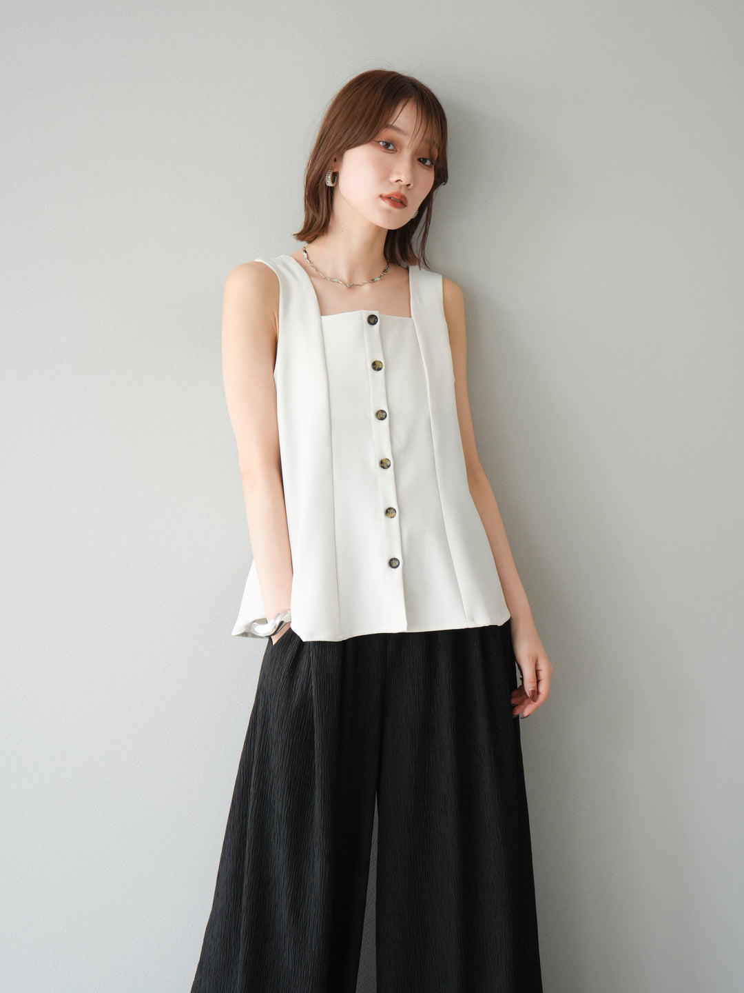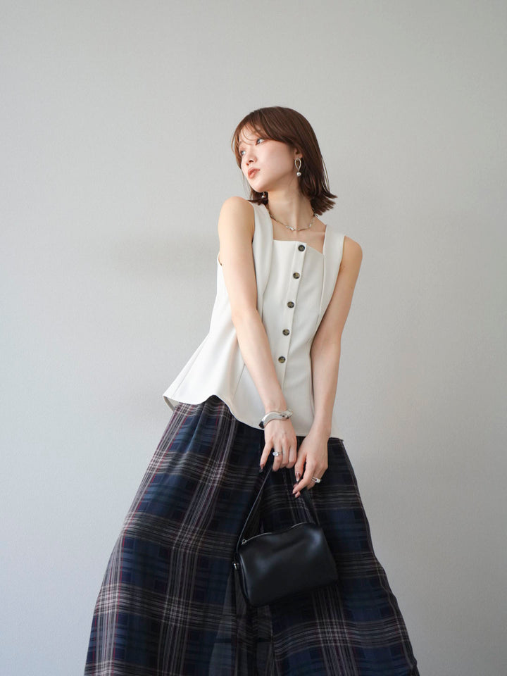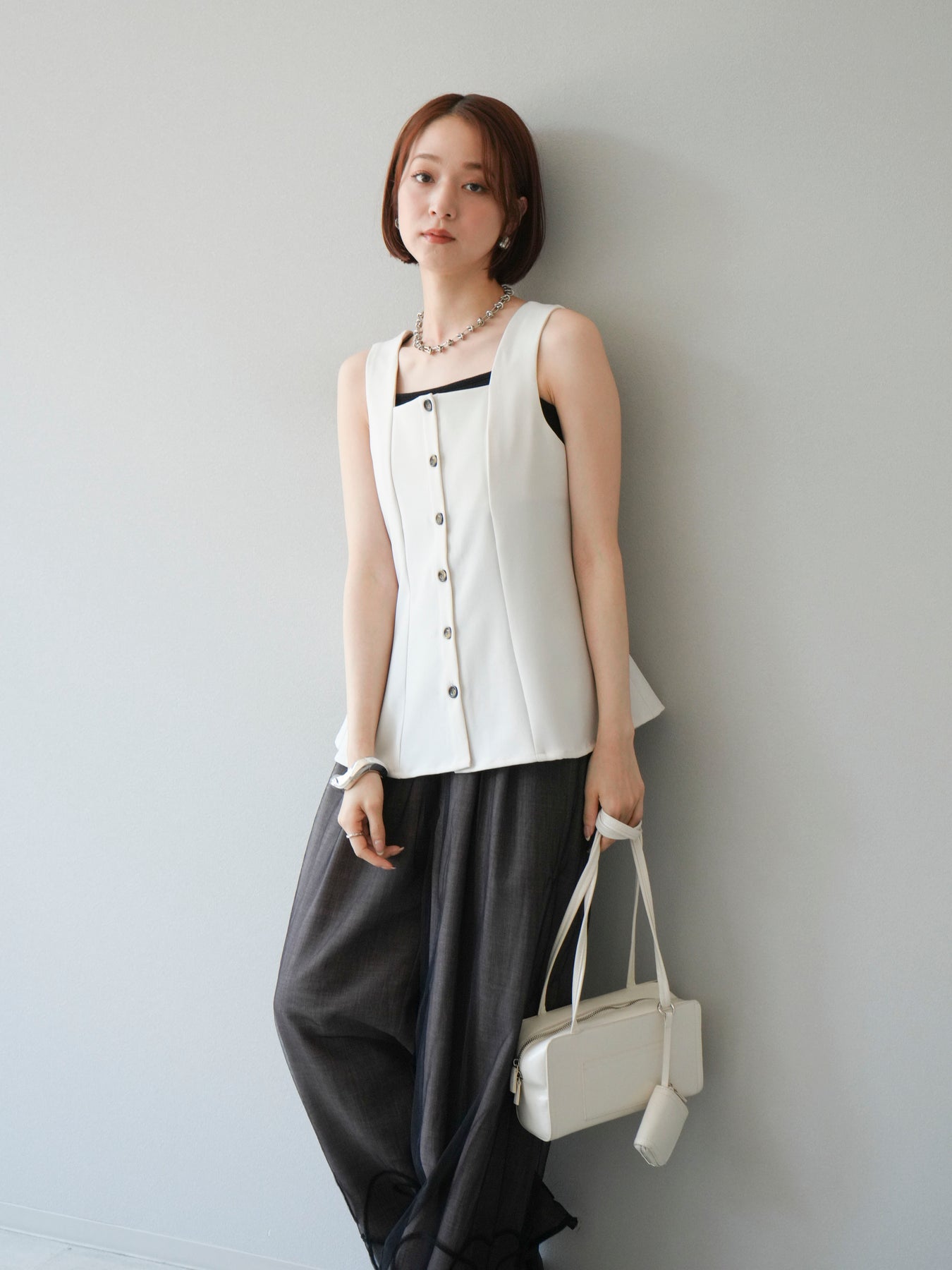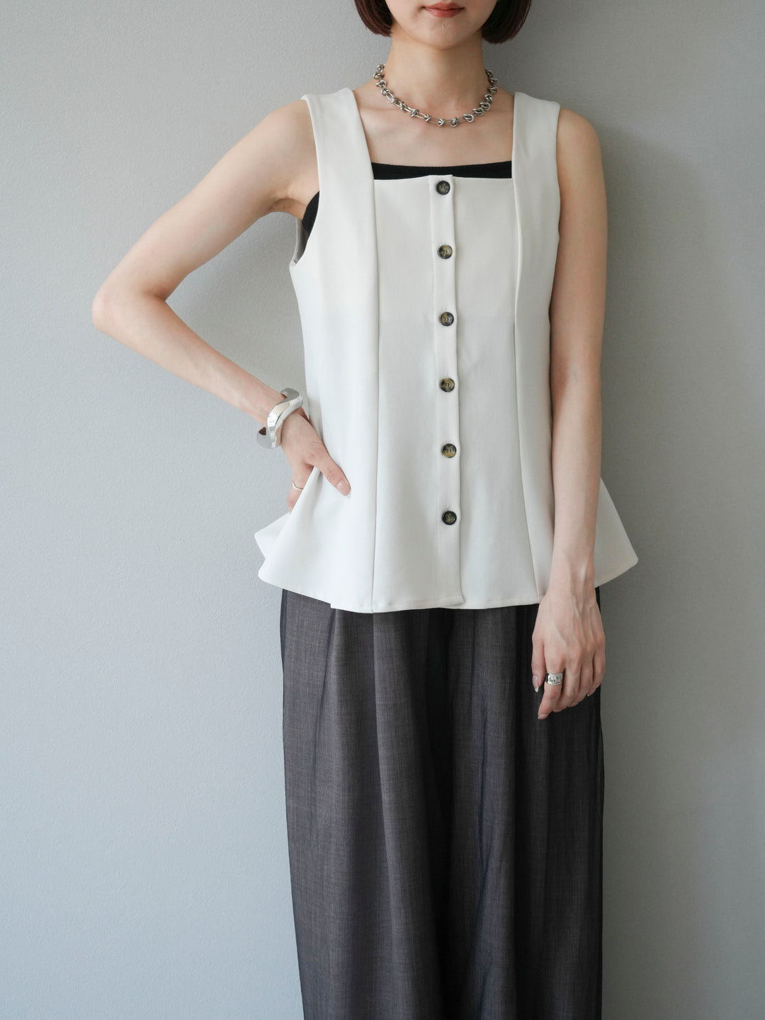 ウエストからふわりと広がるぺプラムシルエットが、スタイルアップを叶えながら上品な印象を与えてくれる一枚。スクエアネックとフロントボタンのデザインが、シンプルながらもこなれた雰囲気を演出します。Tシャツやシアートップスとのレイヤードはもちろん、同素材のボトムとセットアップ風に着るのもおすすめ。オンオフ問わず活躍する、着回し力抜群のアイテムです。 ※ボトムス、キャミソール(インナー)以外の商品は一律でインナーは付属していません。